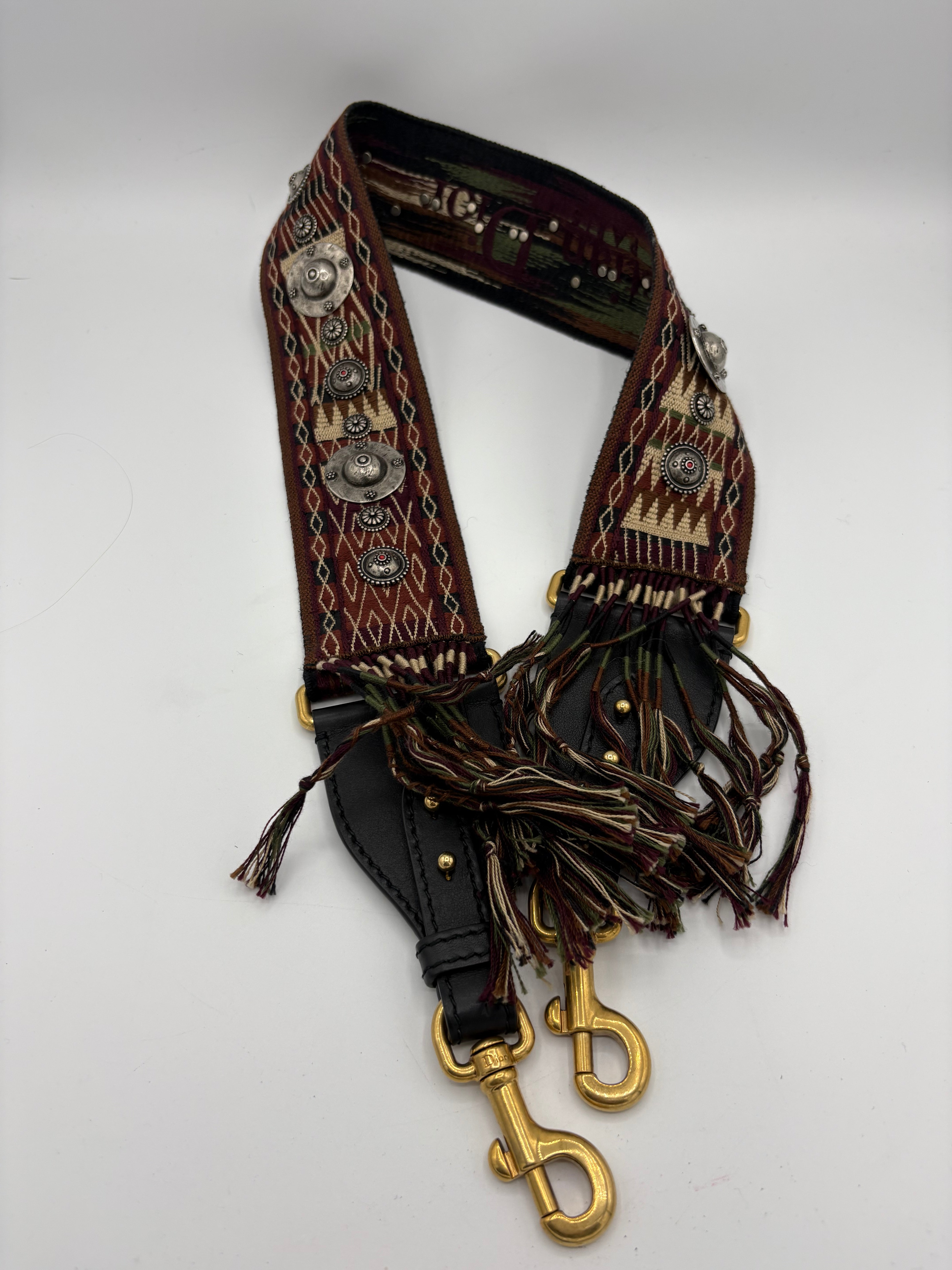 La bandoulière est en coton, cuir de veau et laiton vielli doré.