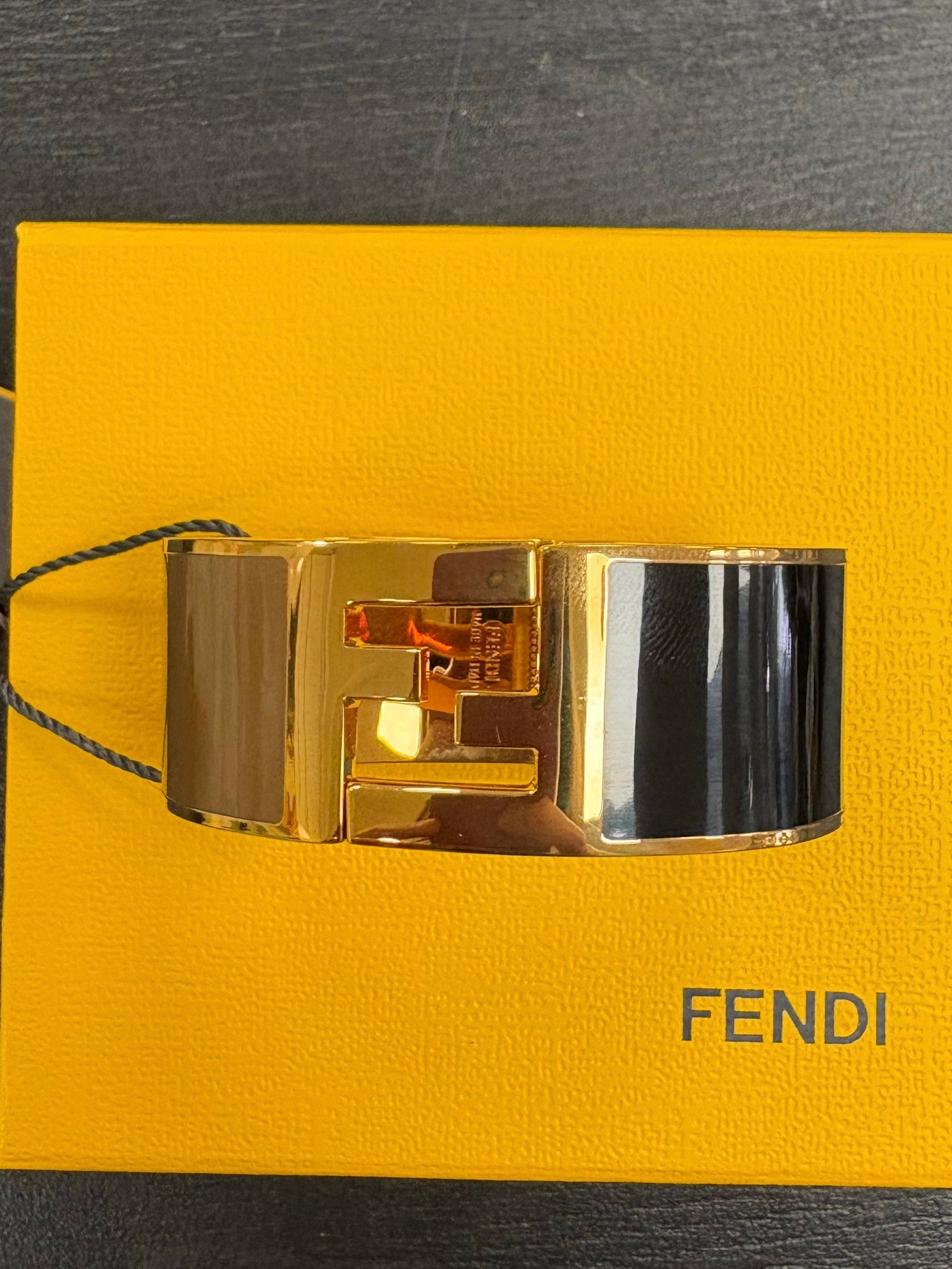 Bracelet Fendi dorée avec un côté camel et un côté noir, il est en très bon état. Une très légère rayure visible en photo.
