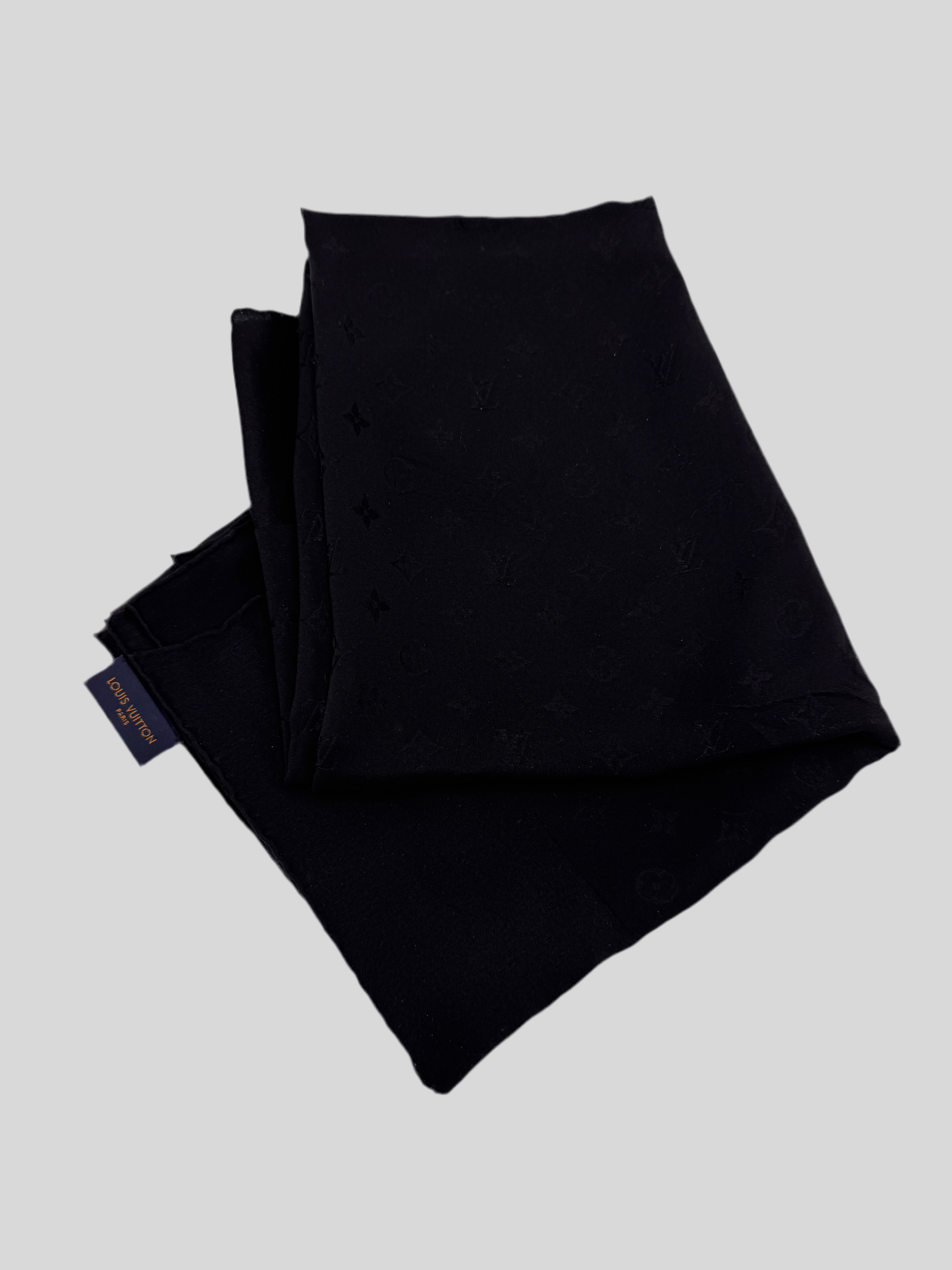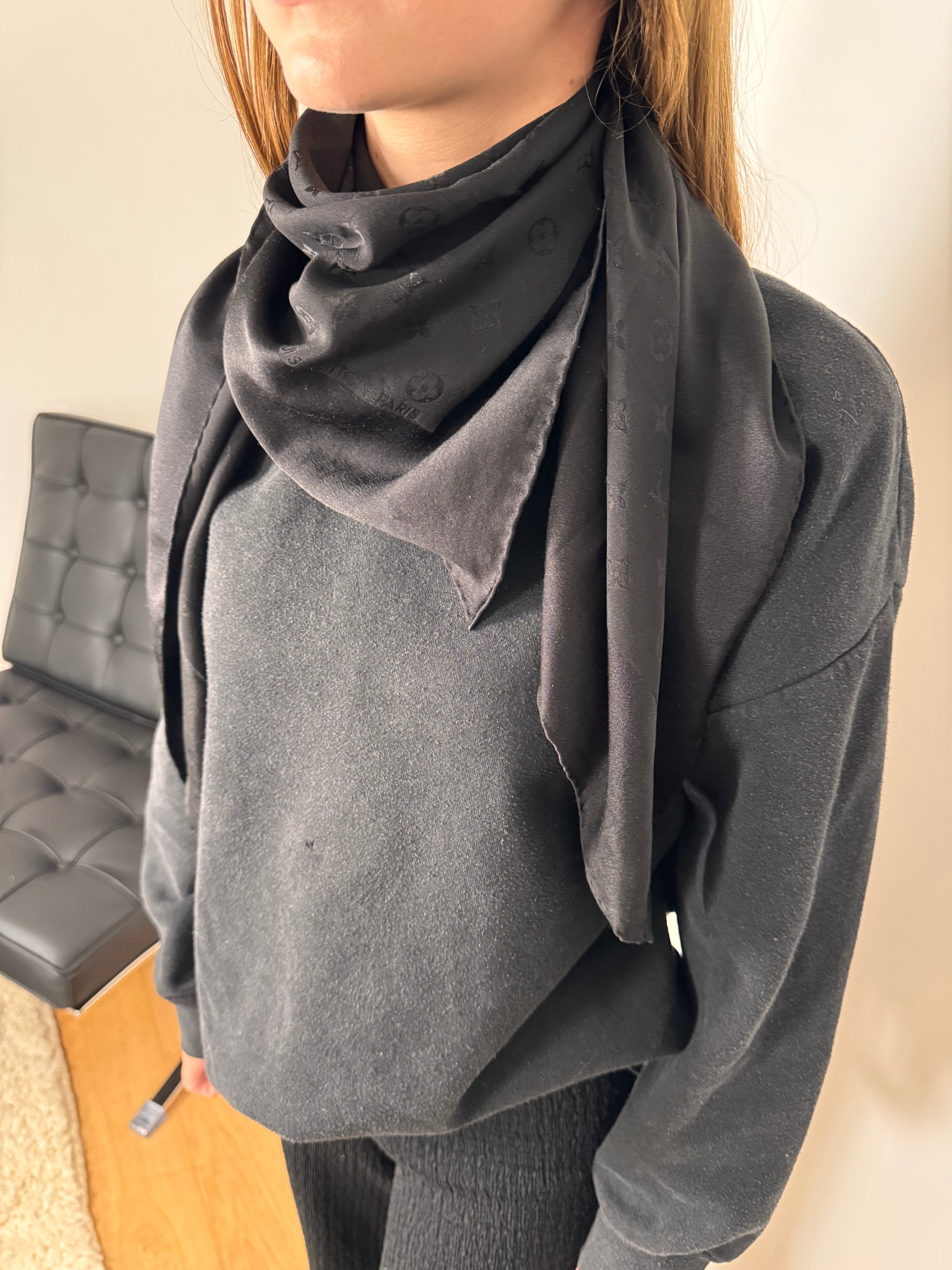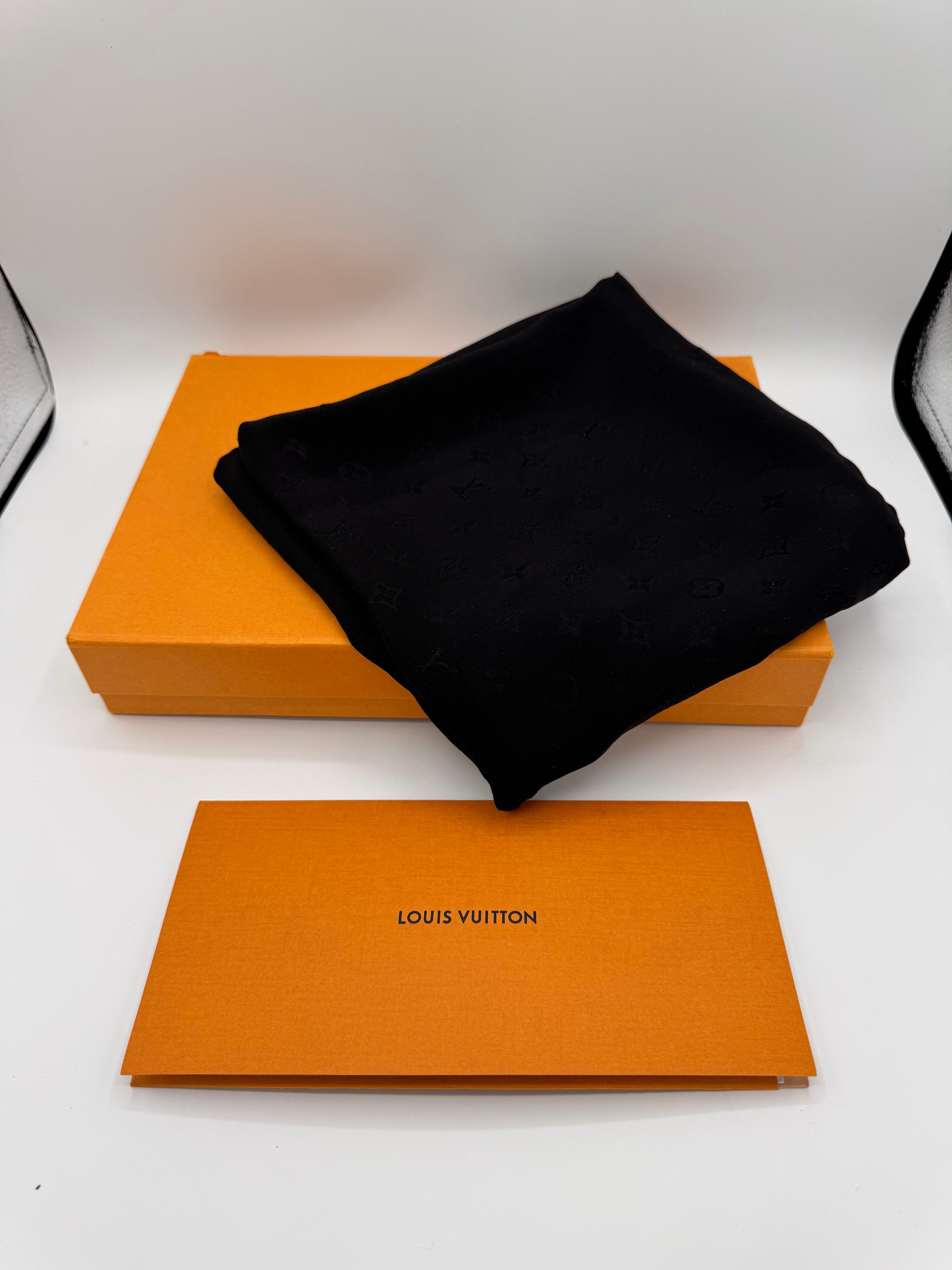 Ce Carré de soie de 90 cm monogram de chez Louis Vuitton, coloris noir est en excellent état.
