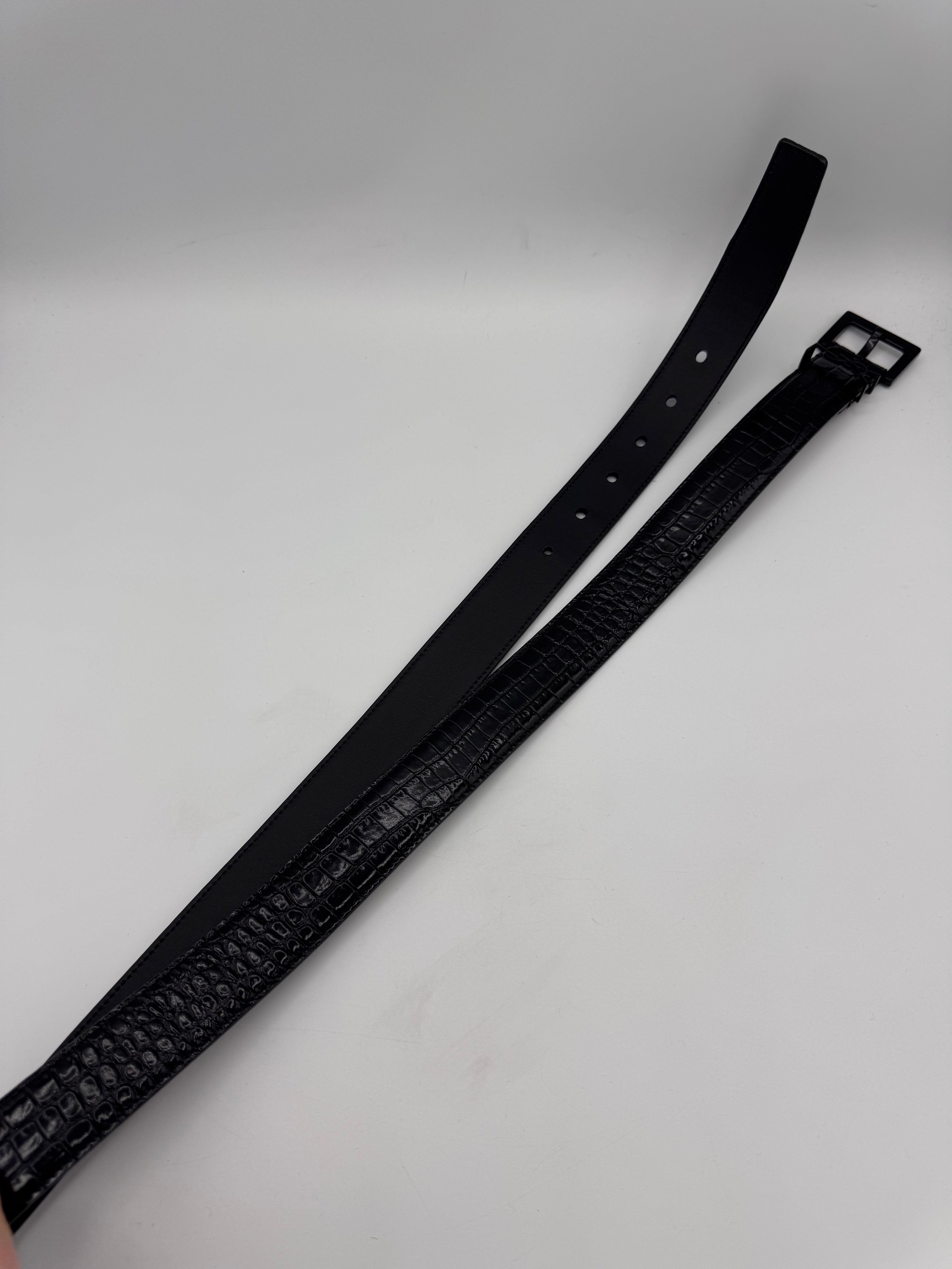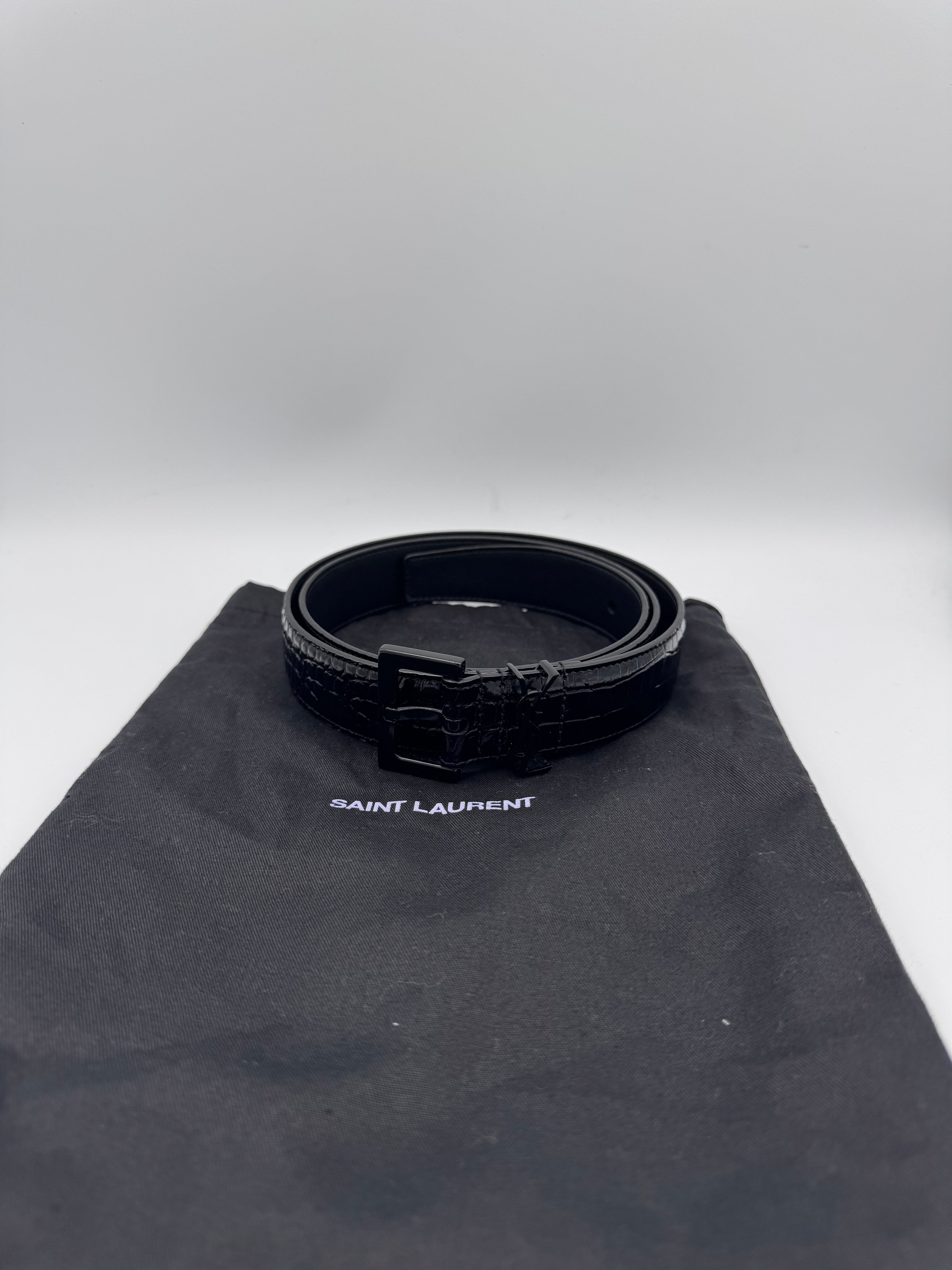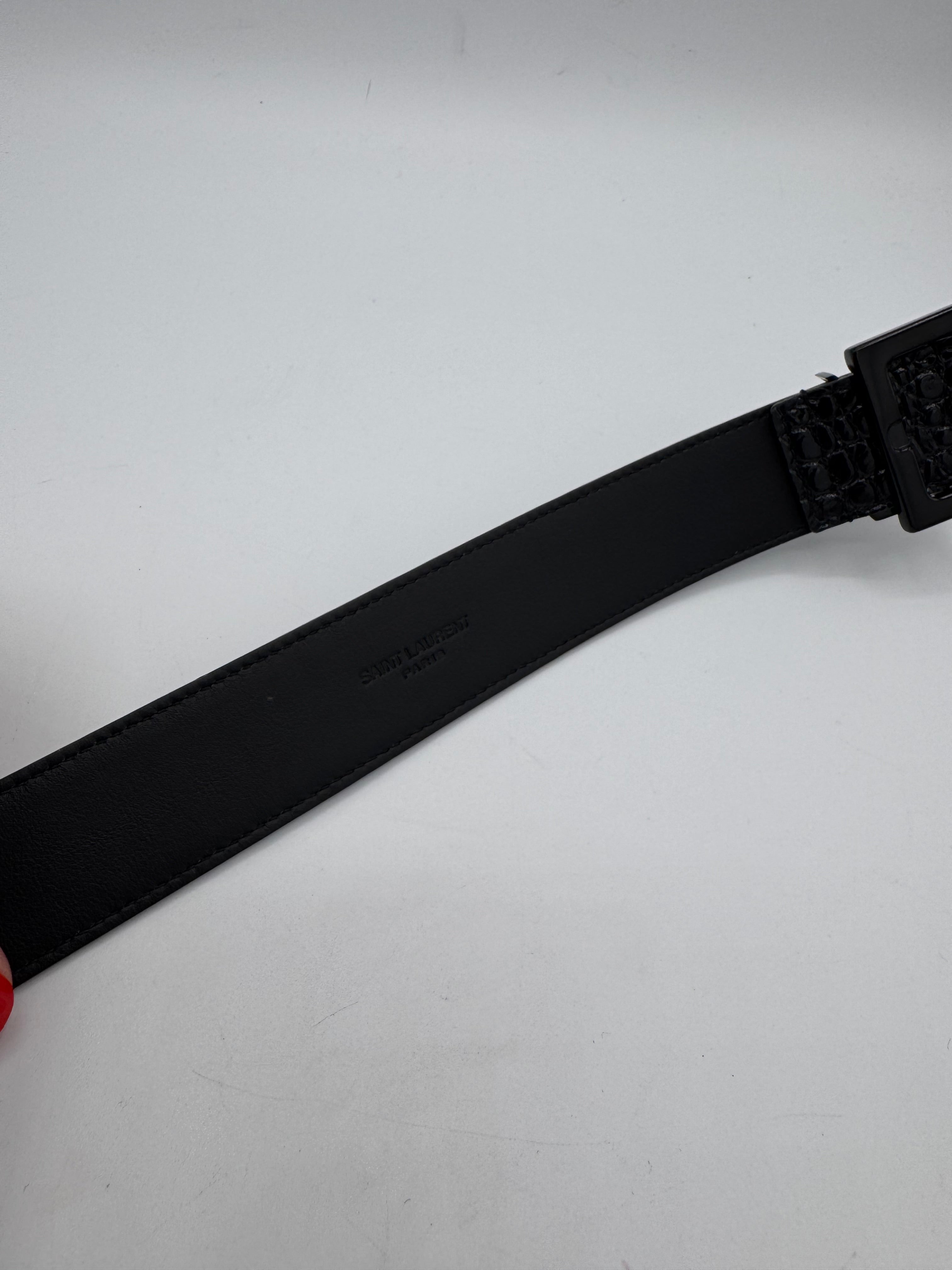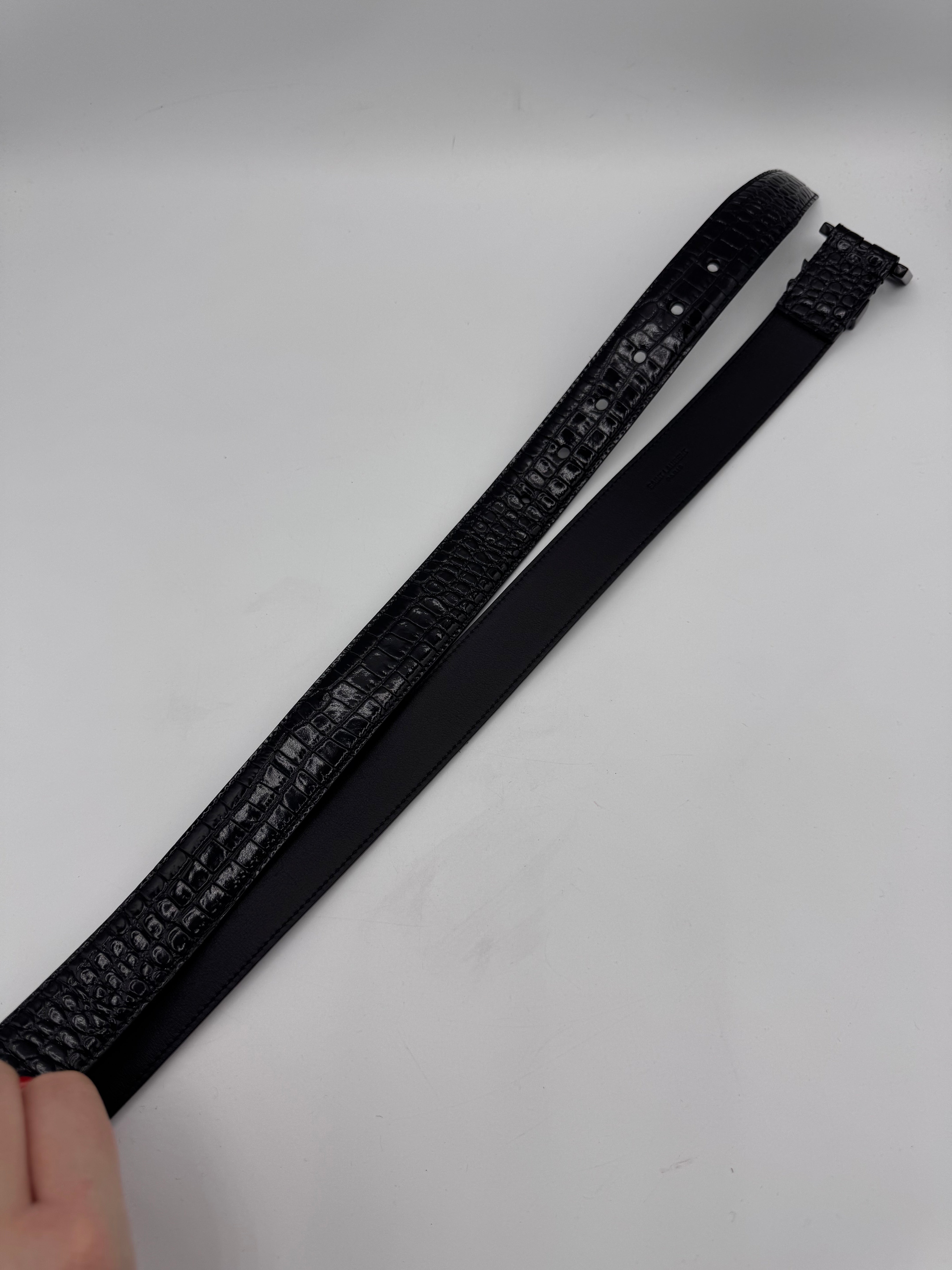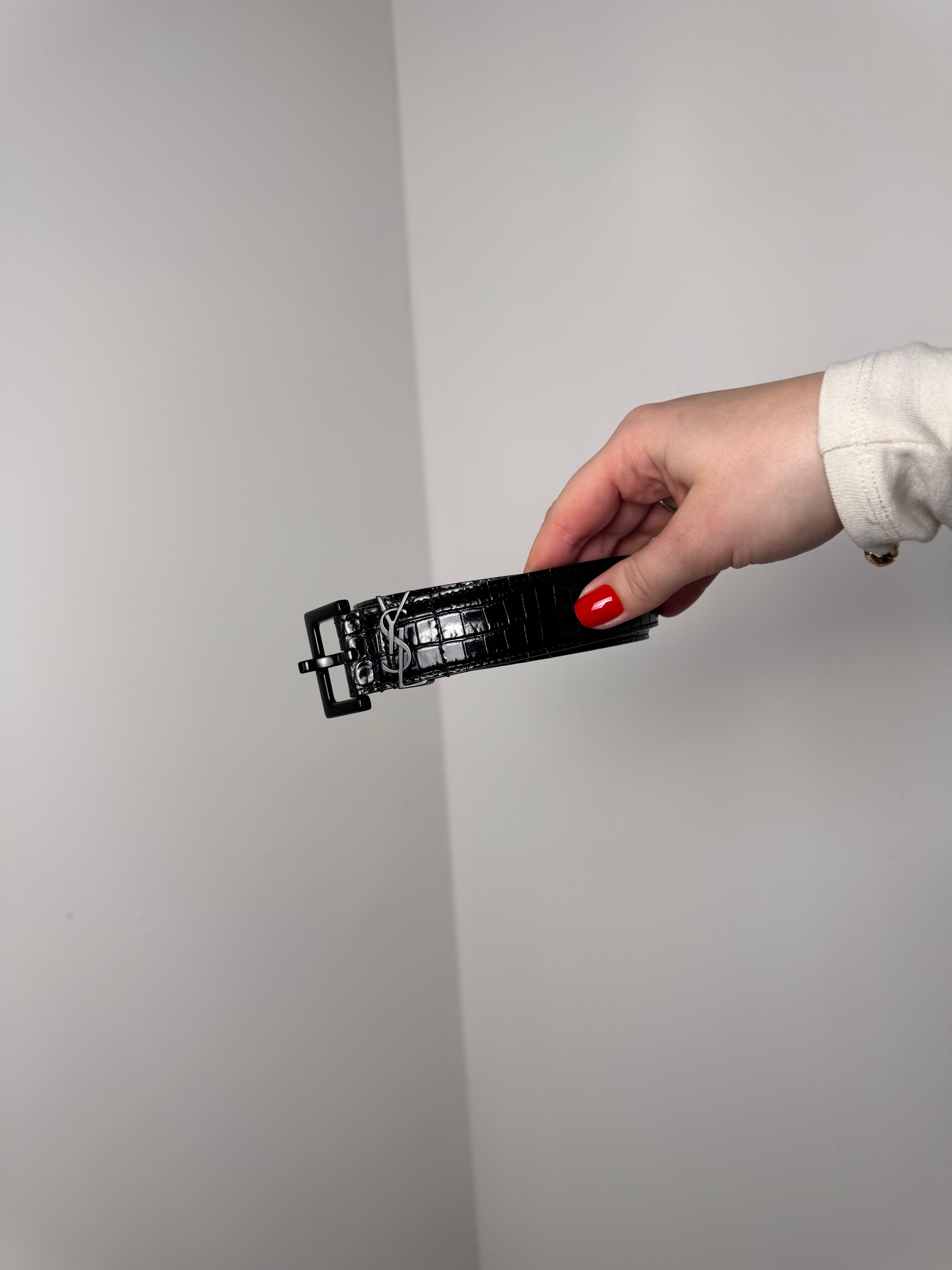Ceinture Cassandre Saint Laurent en cuir noir embossé façon crocodile en etat proche du neuf.