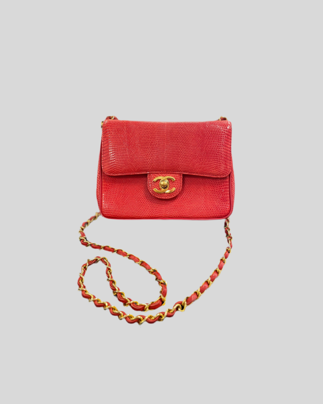 Sac Chanel Mini Square Lézard en très bon état général, des traces légères sur la tranche en cuir des angles, facilement recolorables.