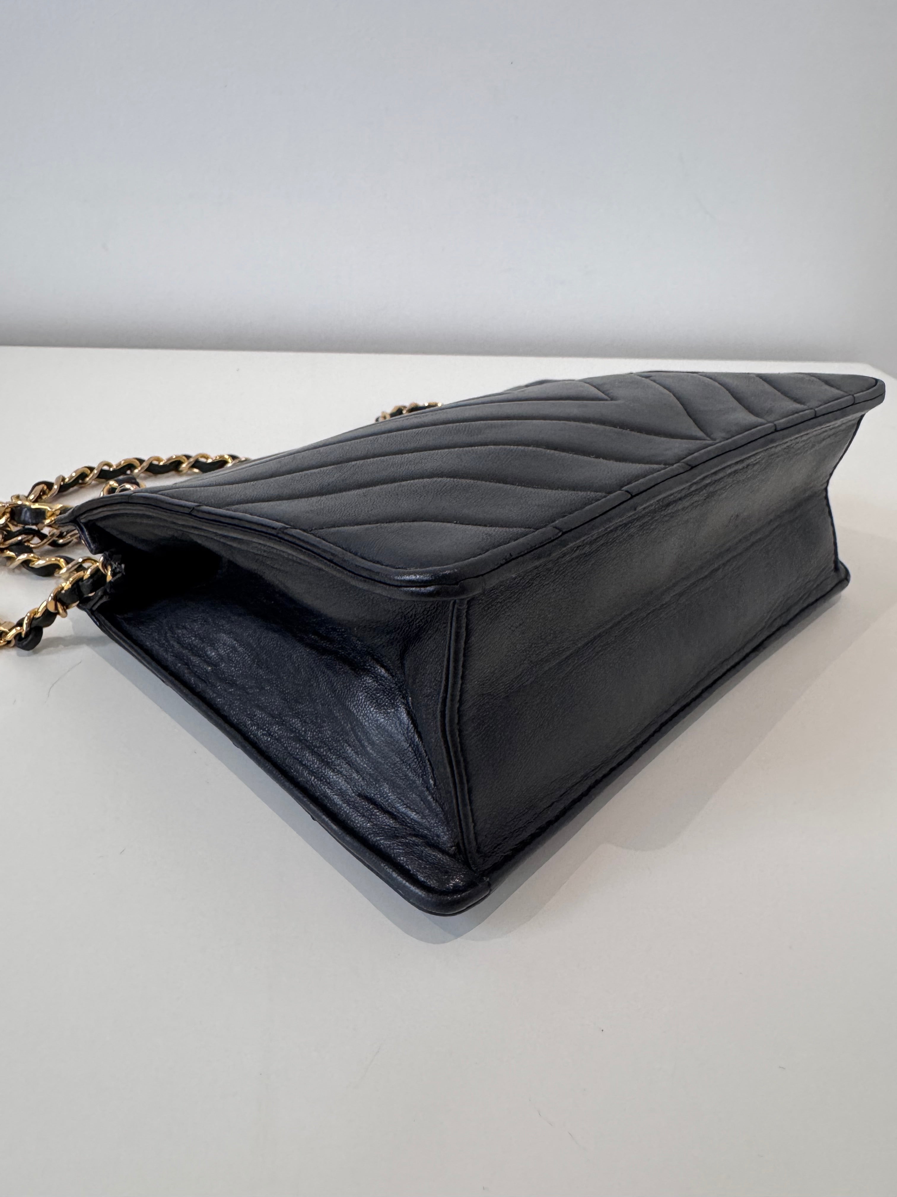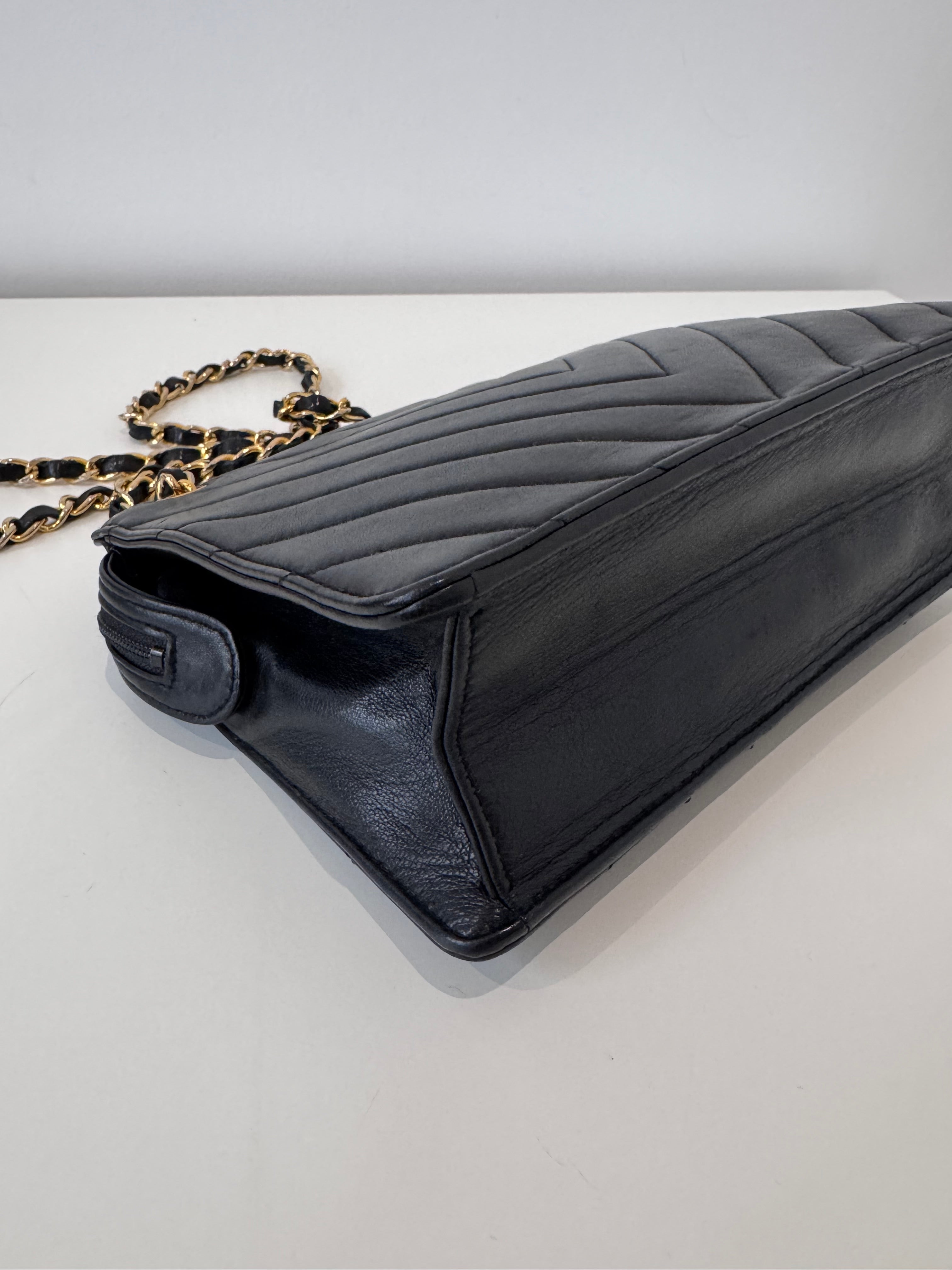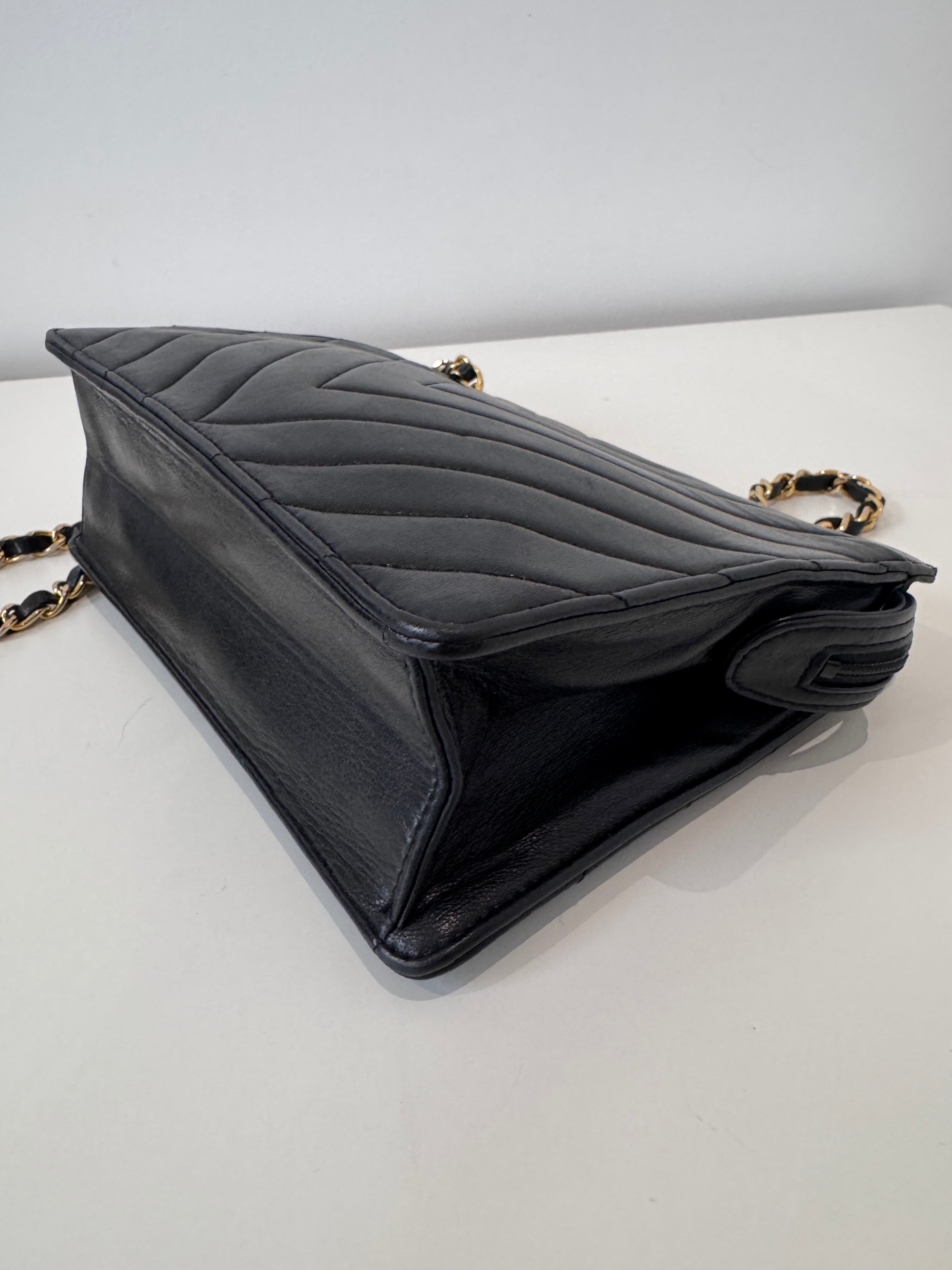 Sac caméra à motifs chevrons en cuir de veau noir en très bon état.