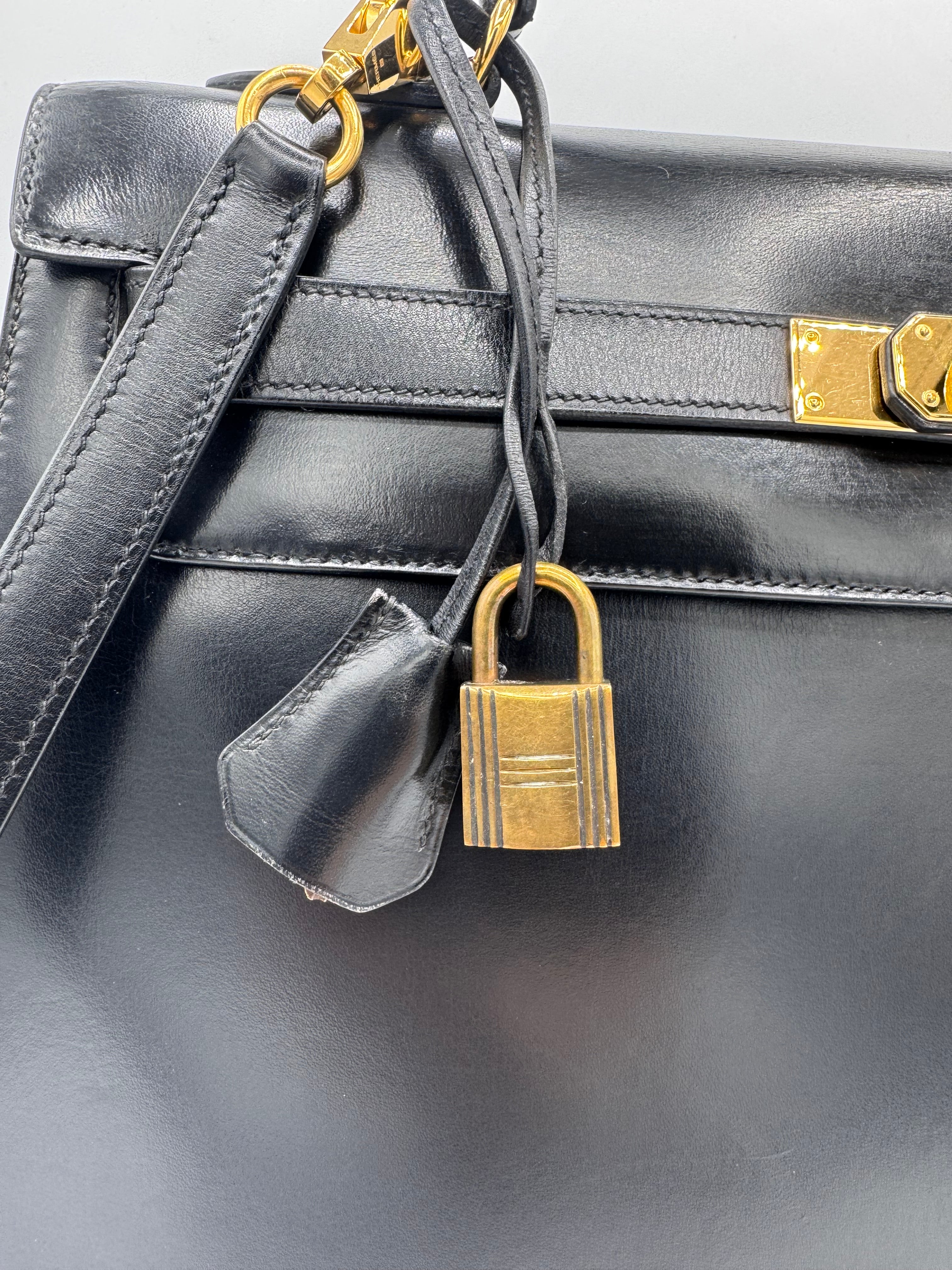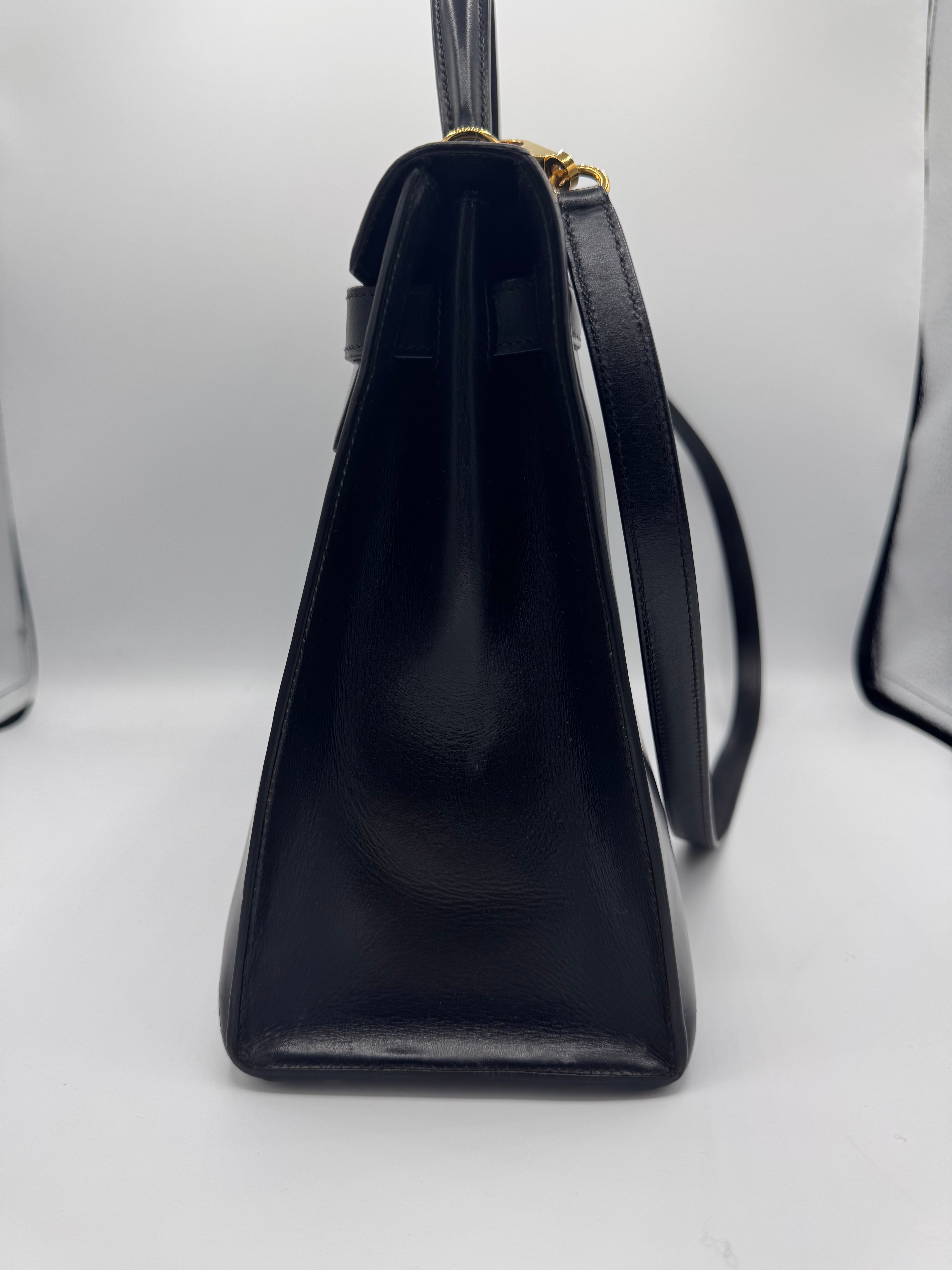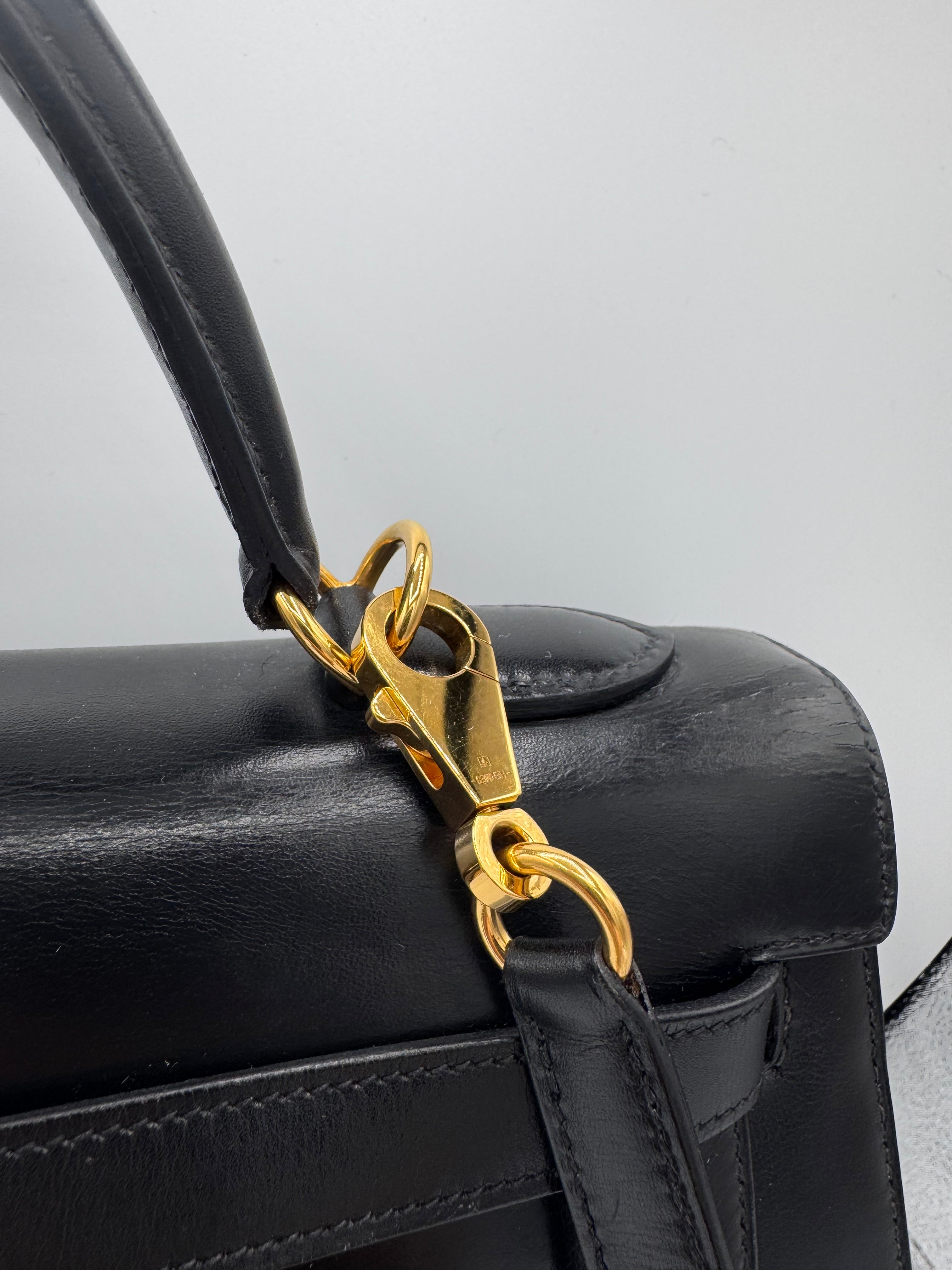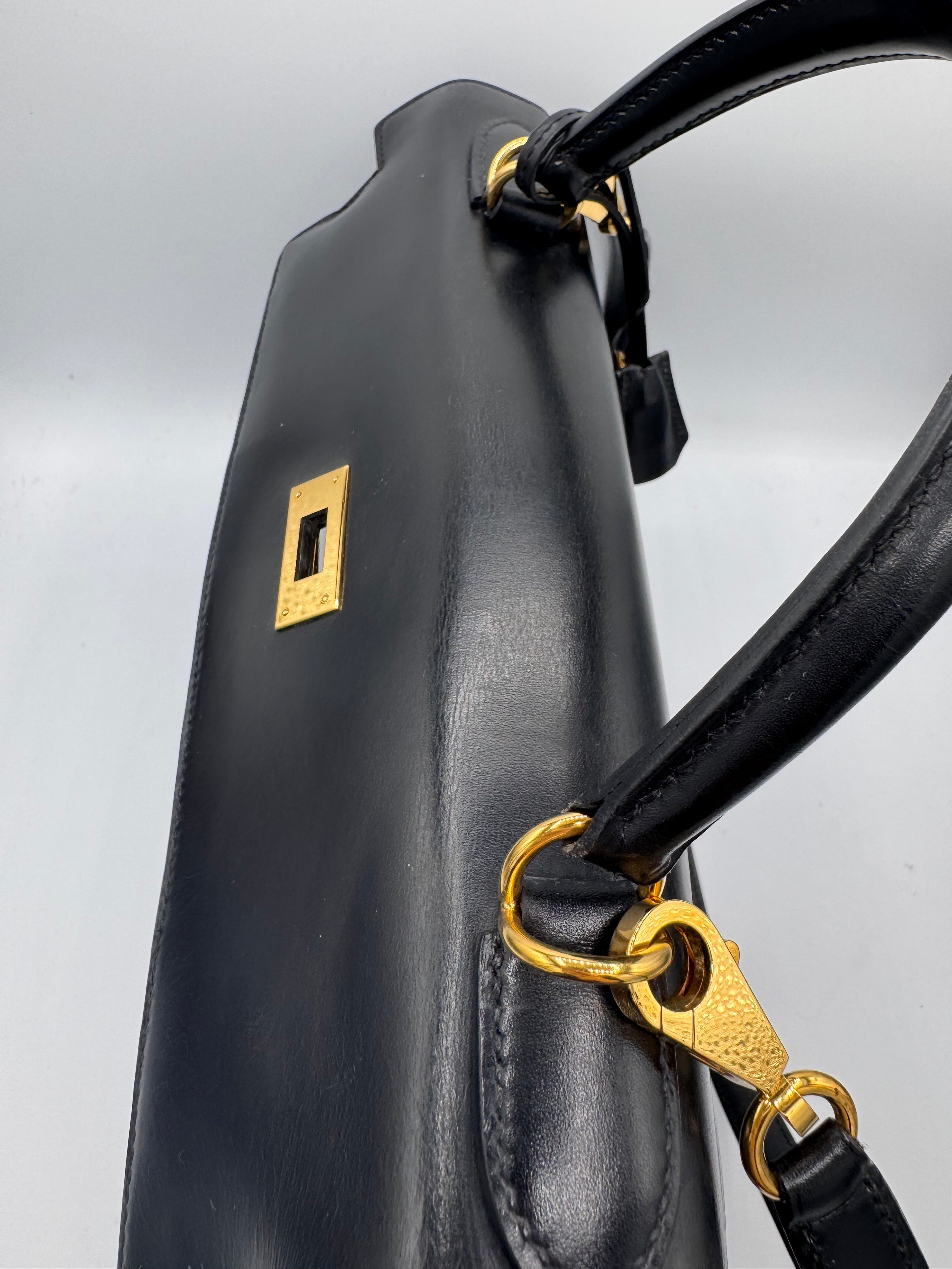 Sac Kelly taille 32 Hermès, en cuir box, couleur noir, finition sellier et bijouterie dorée.