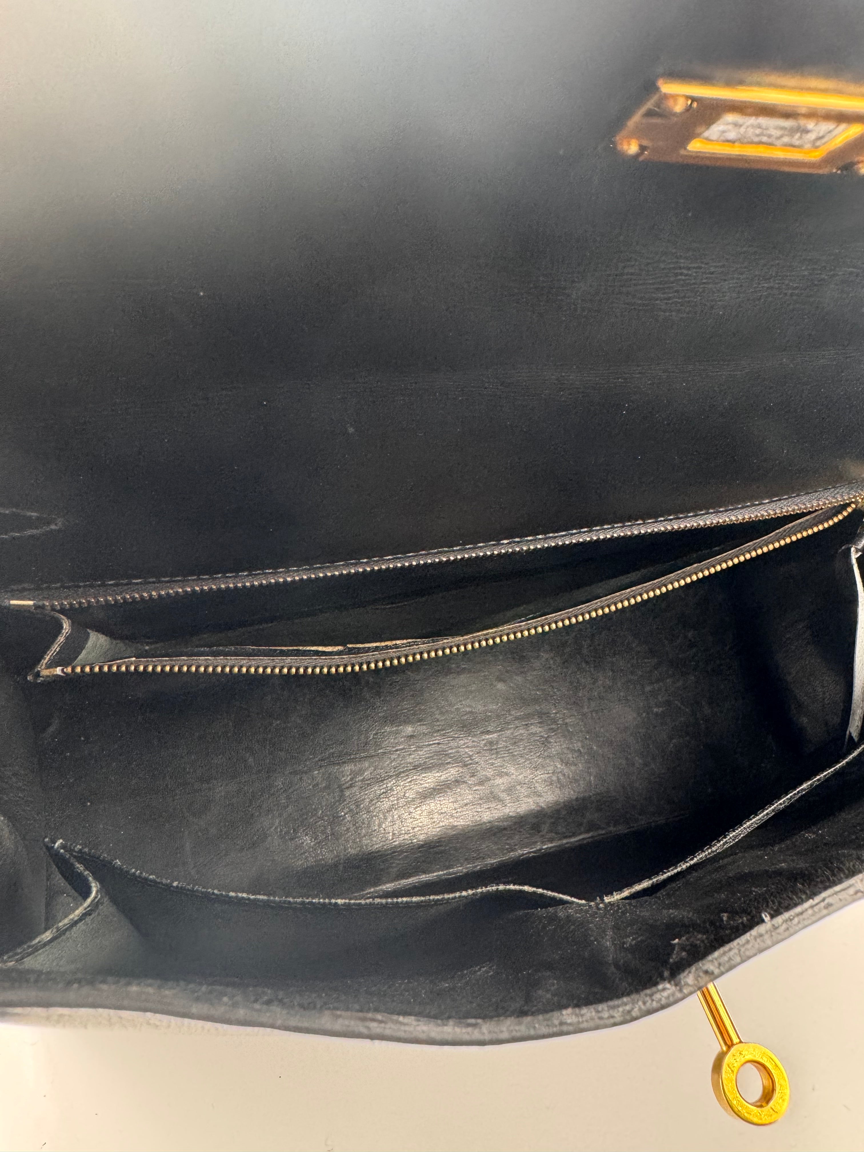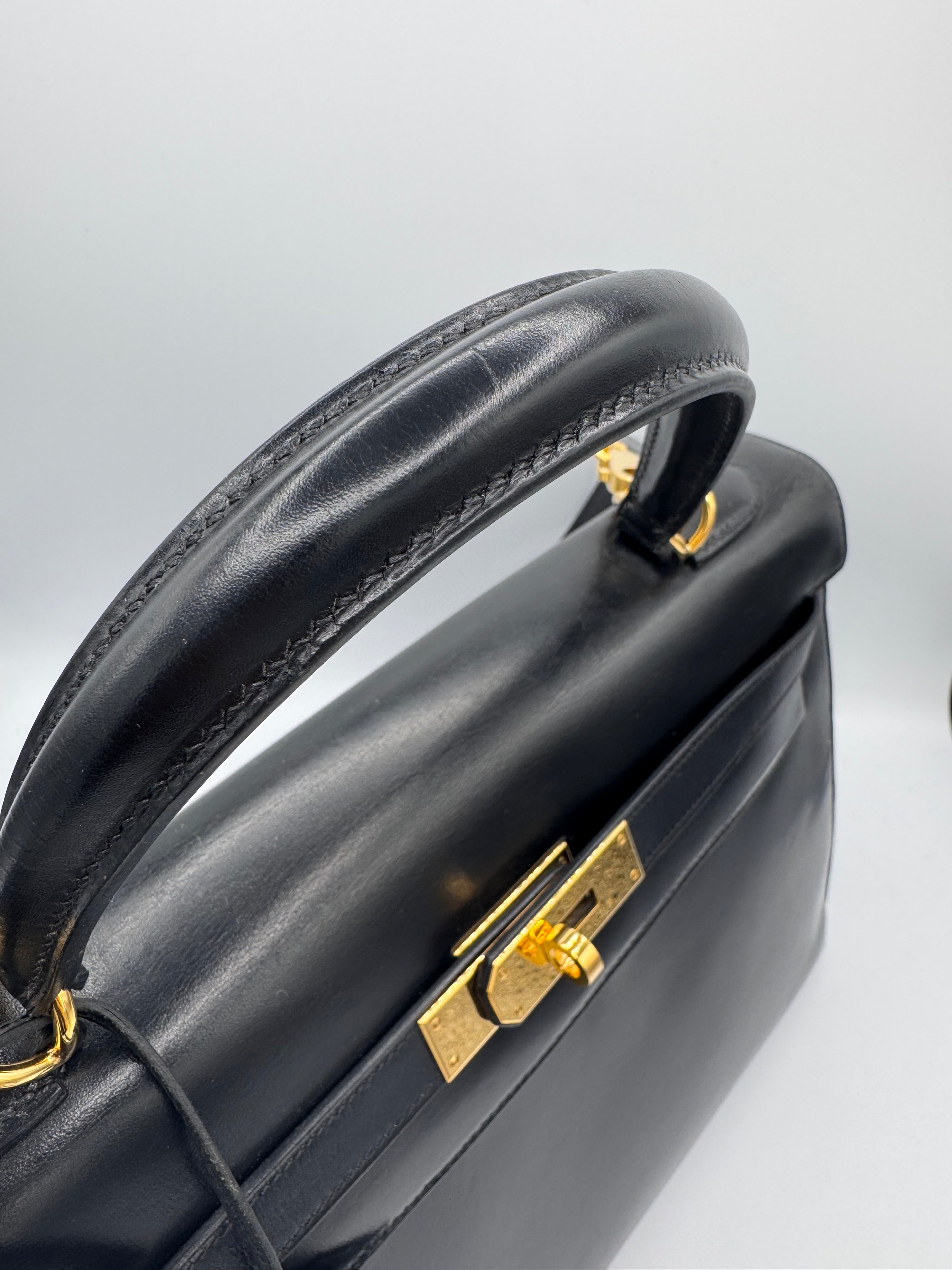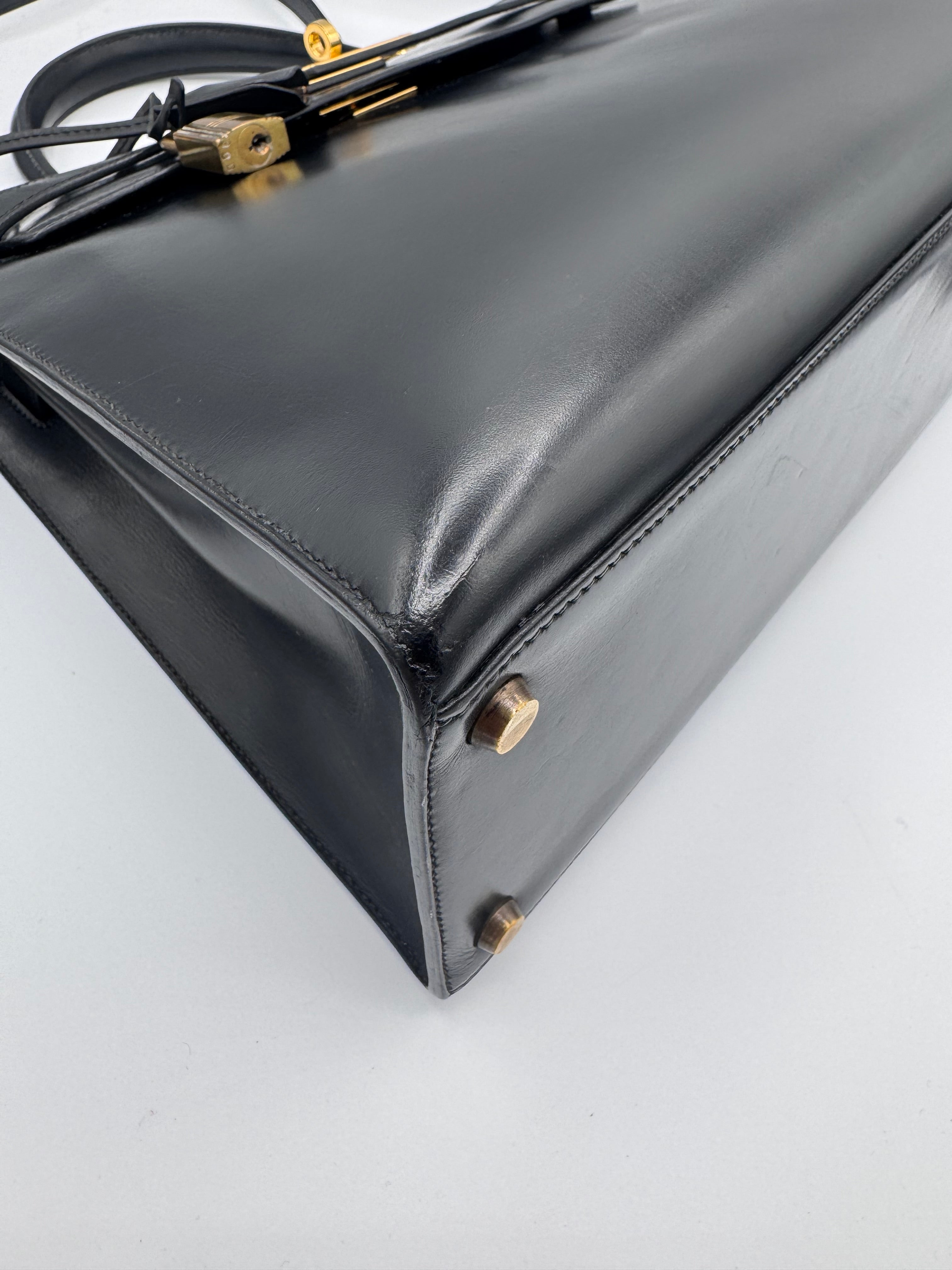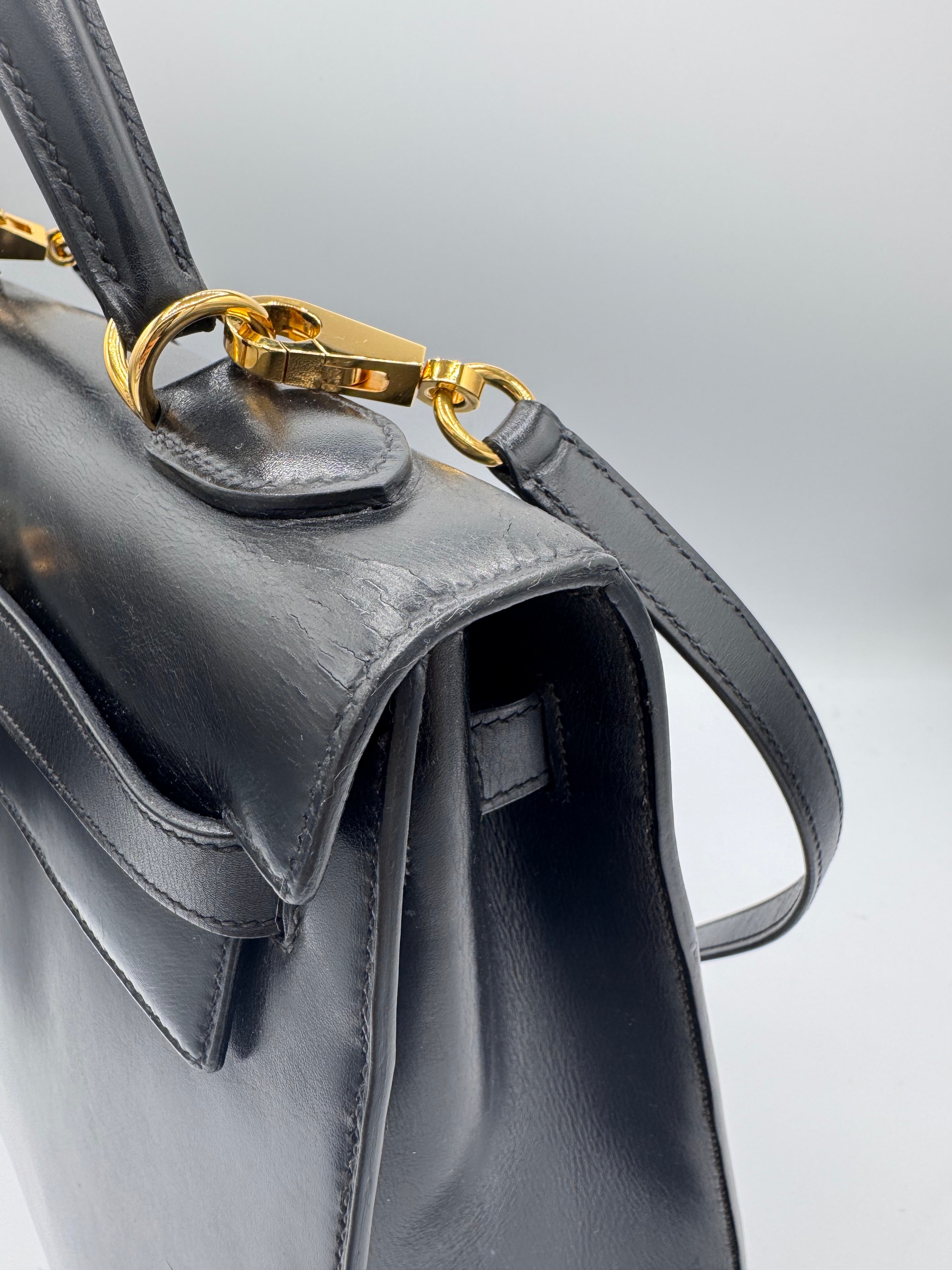 Sac Kelly taille 32 Hermès, en cuir box, couleur noir, finition sellier et bijouterie dorée.