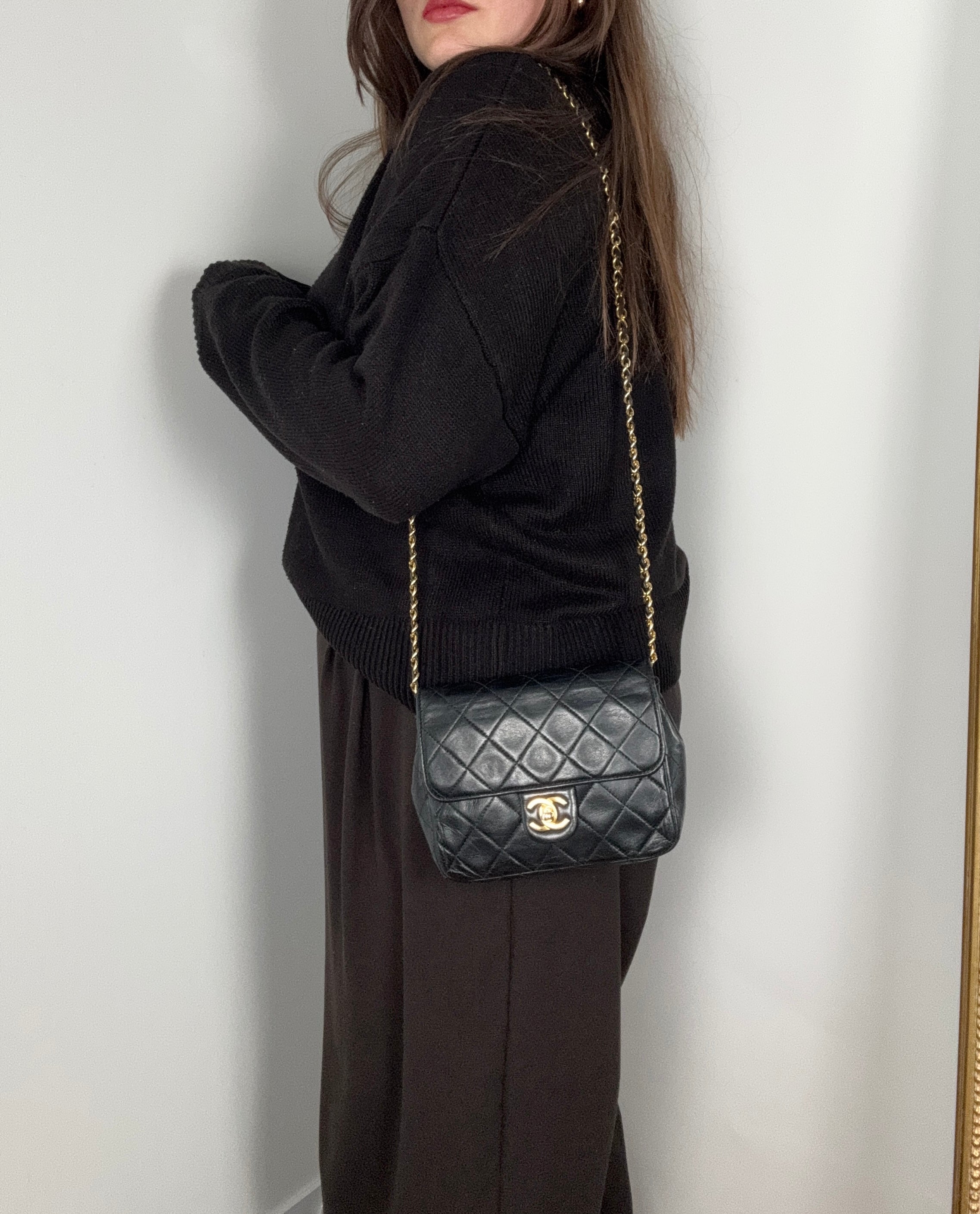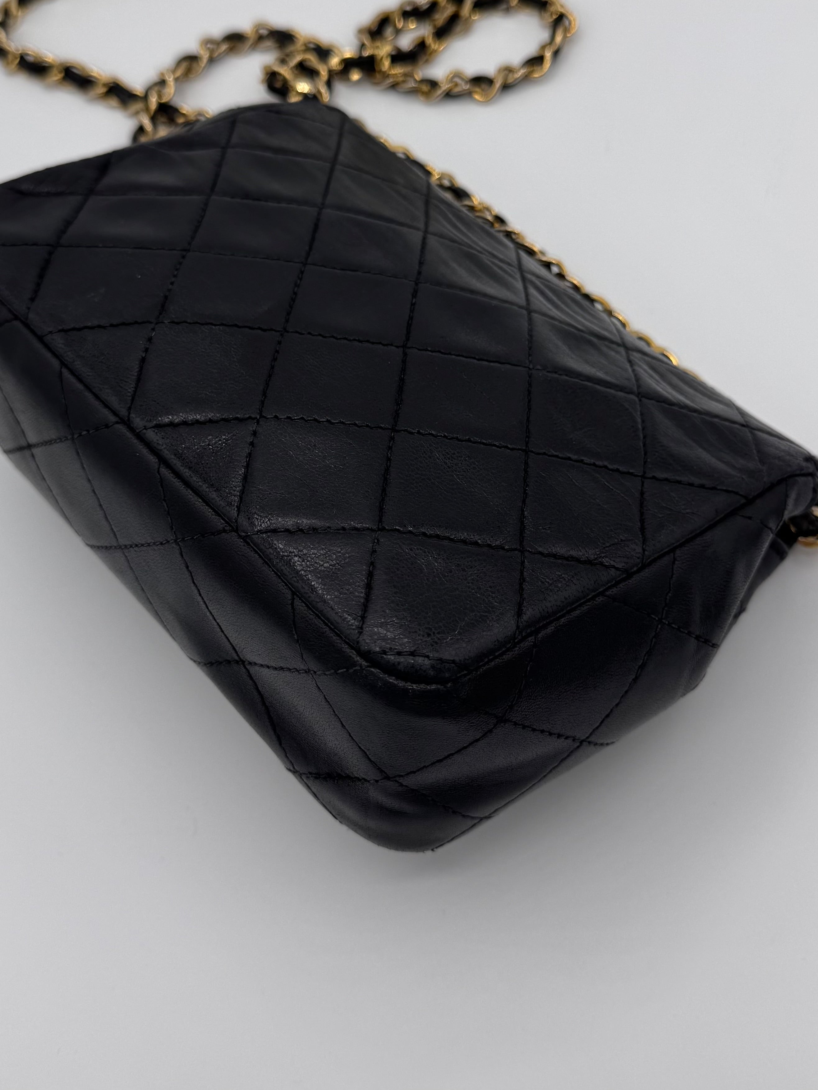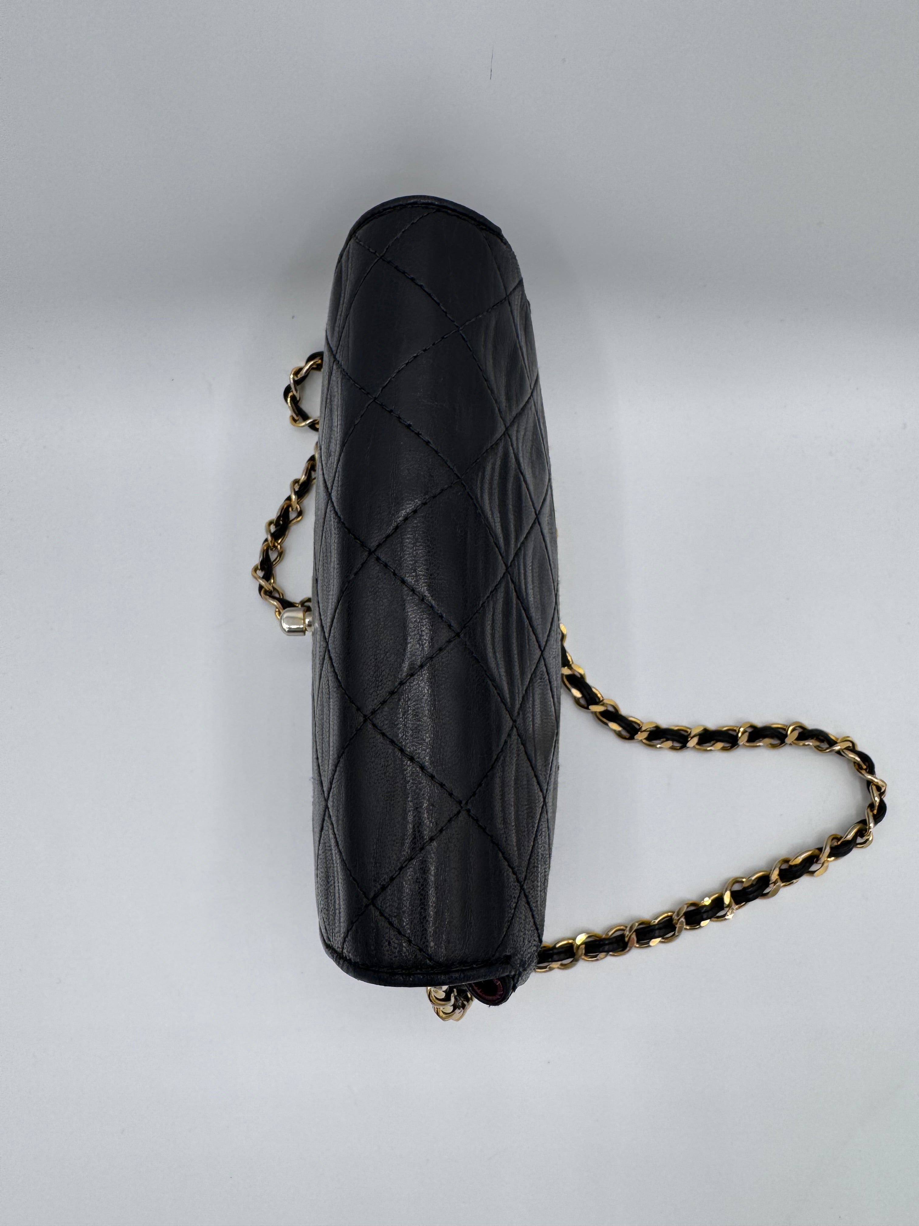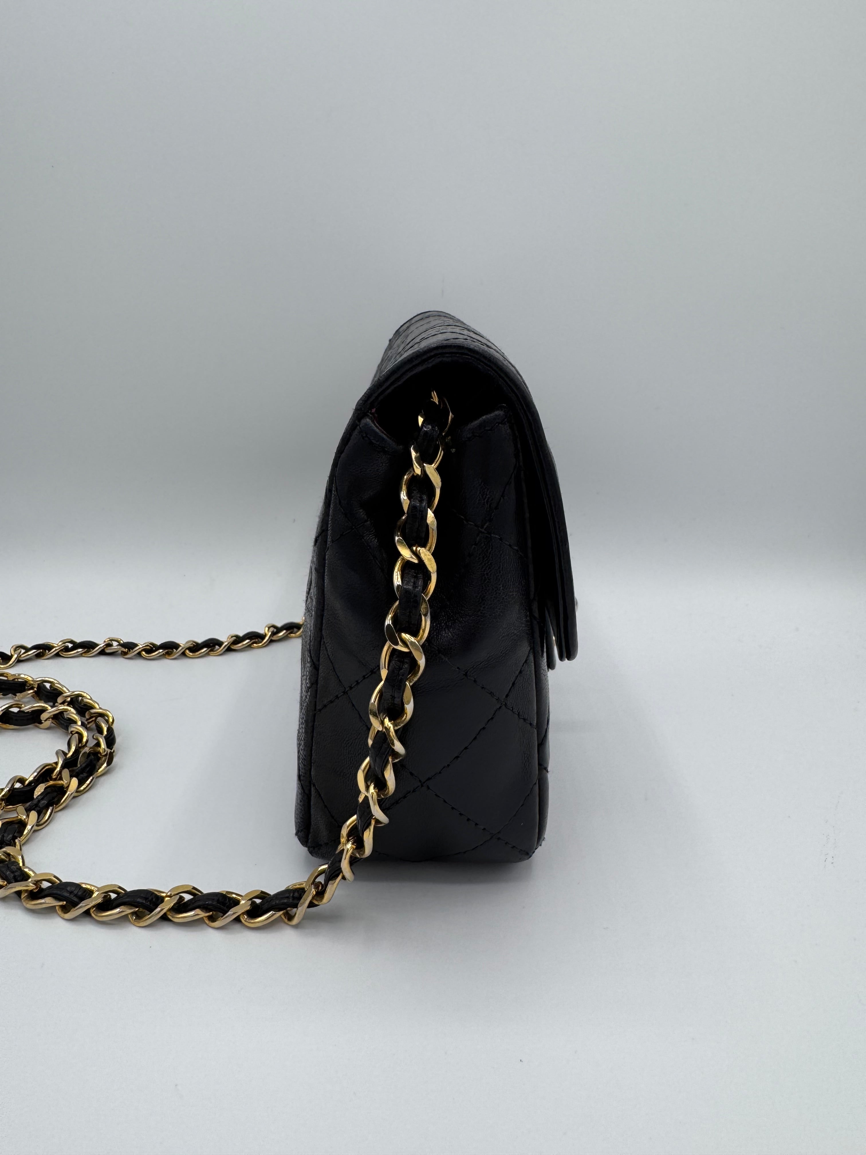 Mini Sac Classique de chez Chanel, en cuir d'agneau noir et bijouterie plaquée or 24 carats, en très bon état.