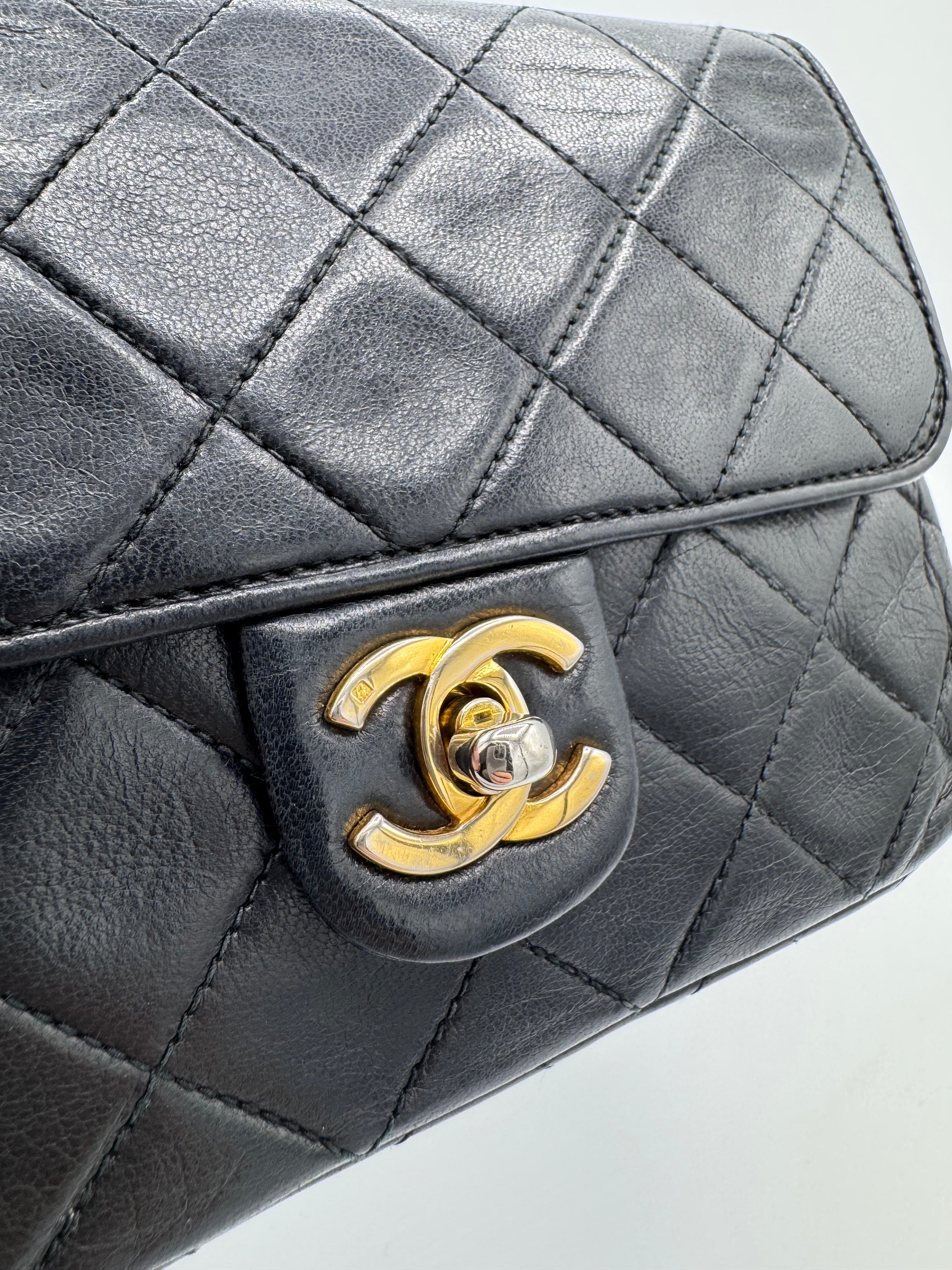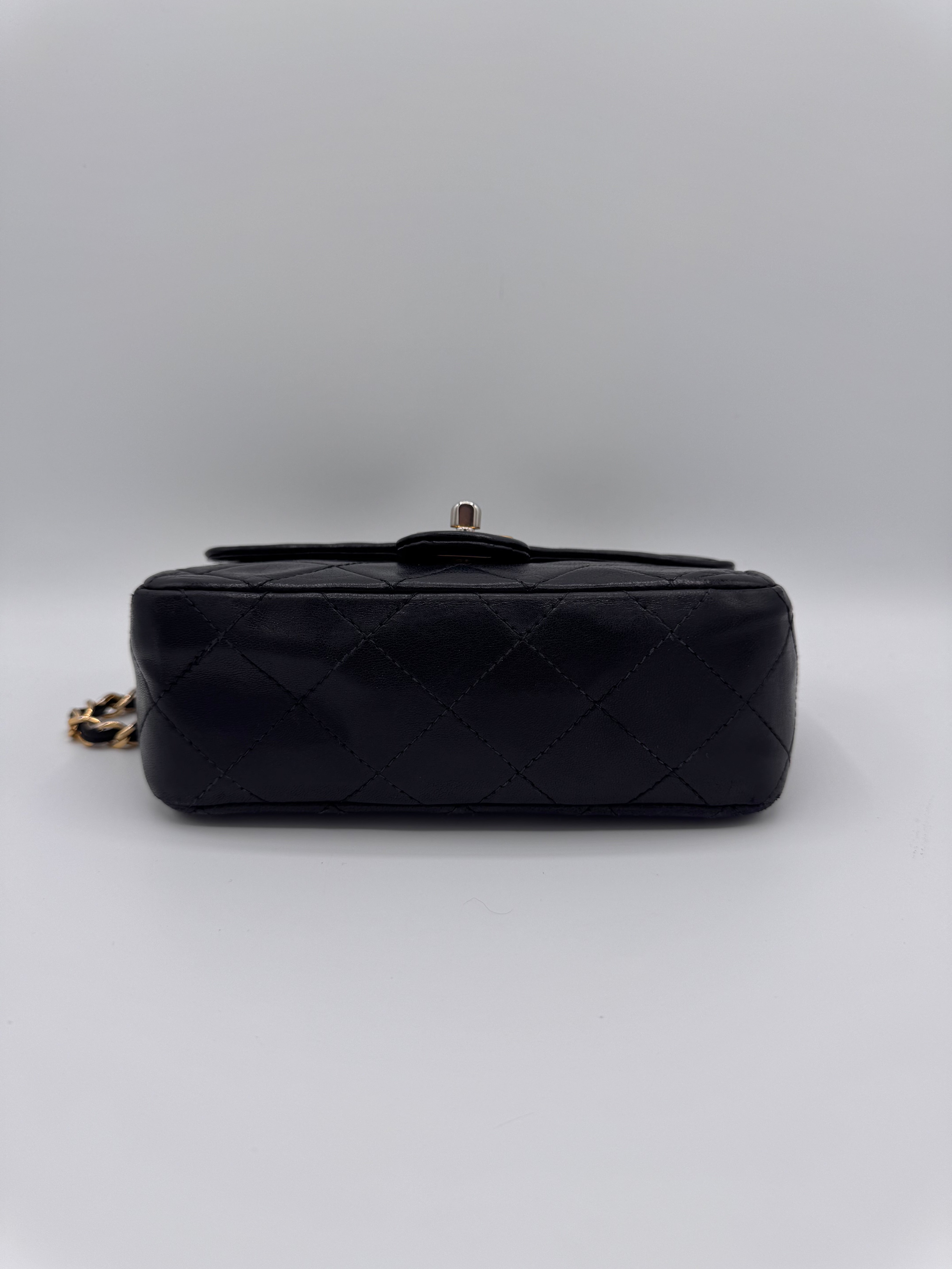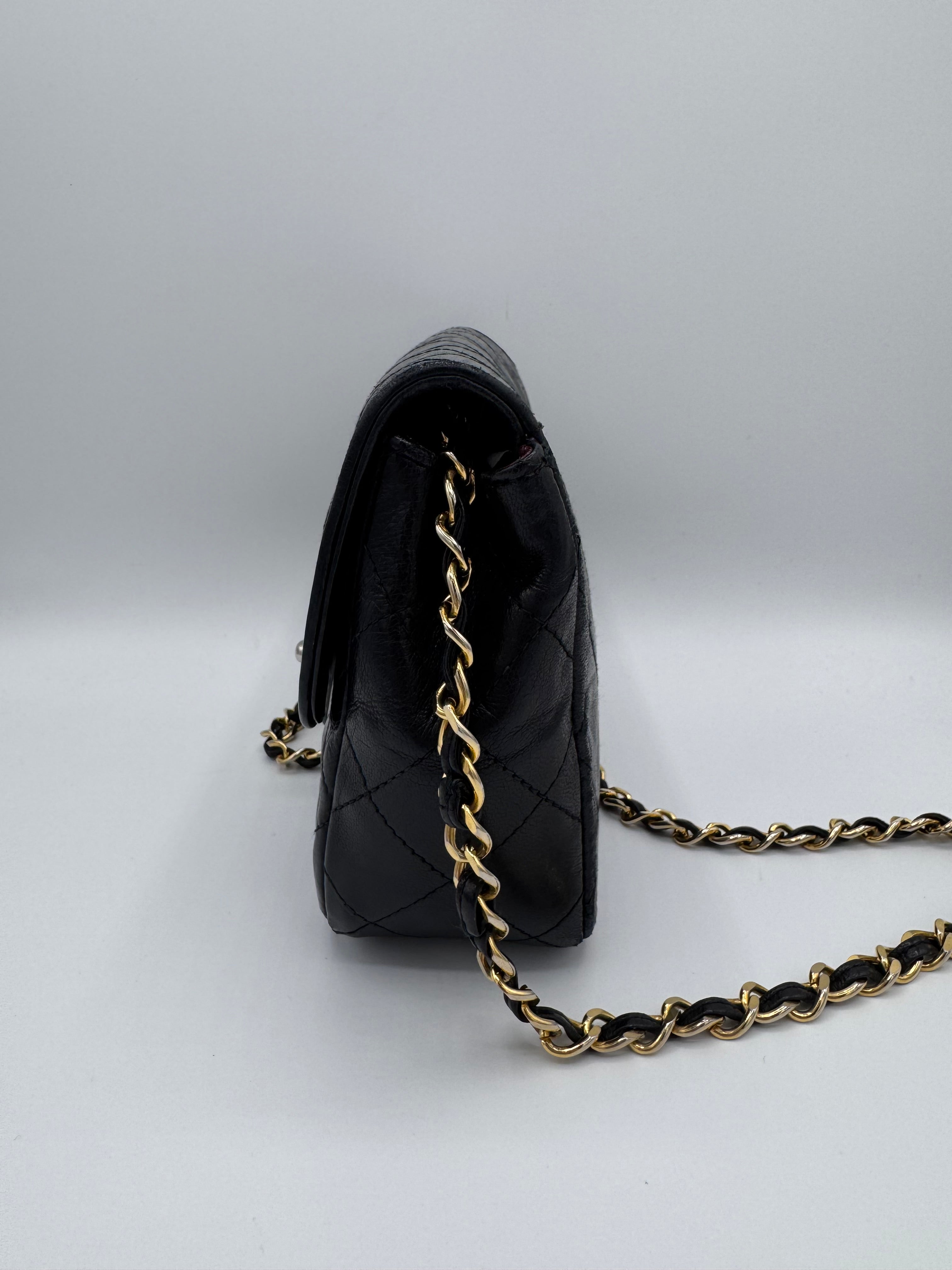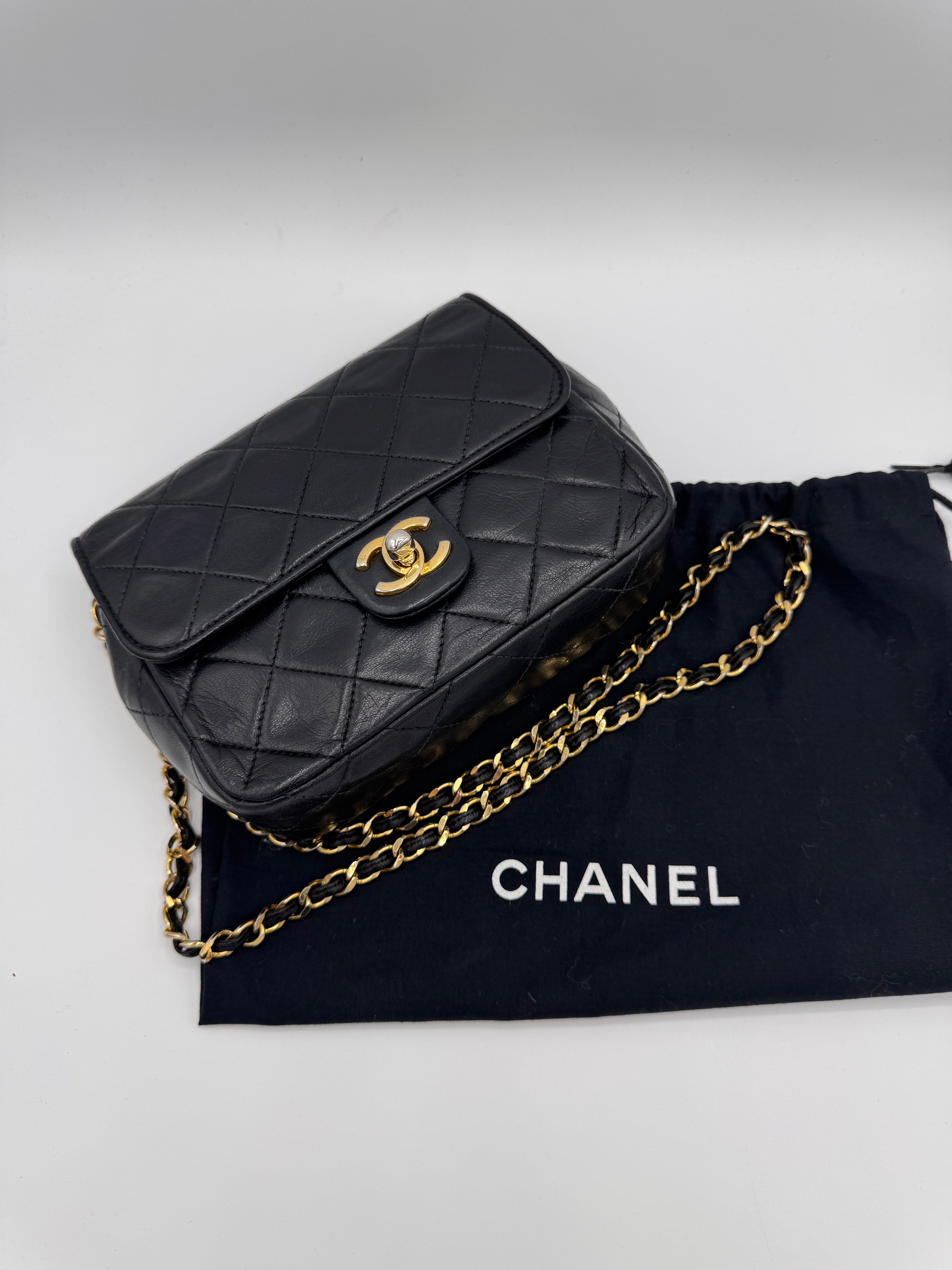 Mini Sac Classique de chez Chanel, en cuir d'agneau noir et bijouterie plaquée or 24 carats, en très bon état.