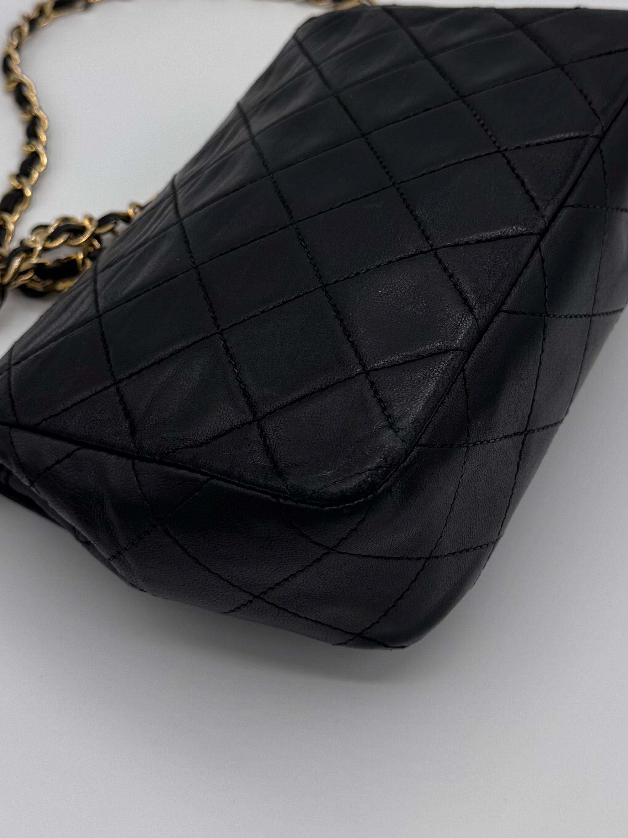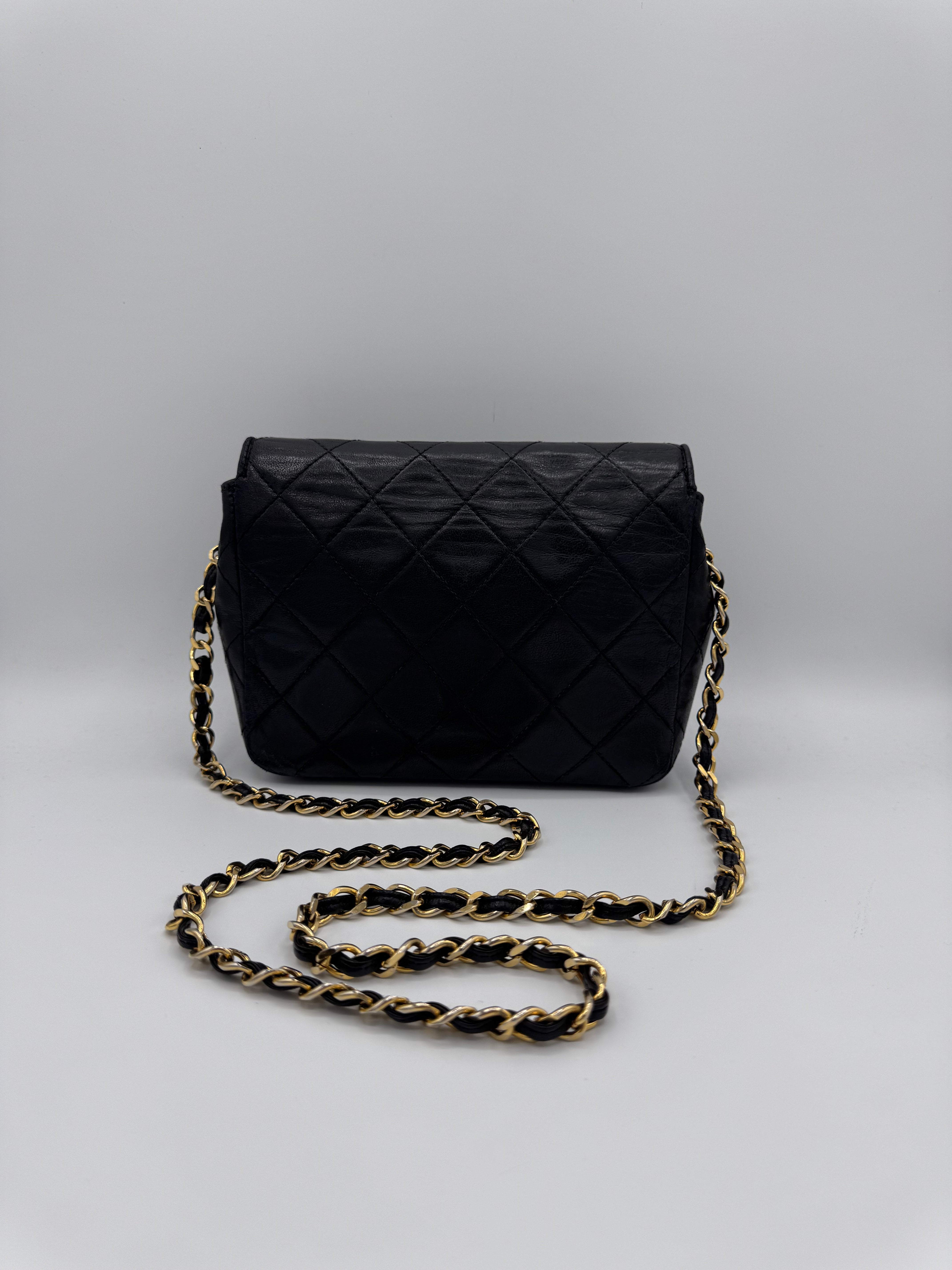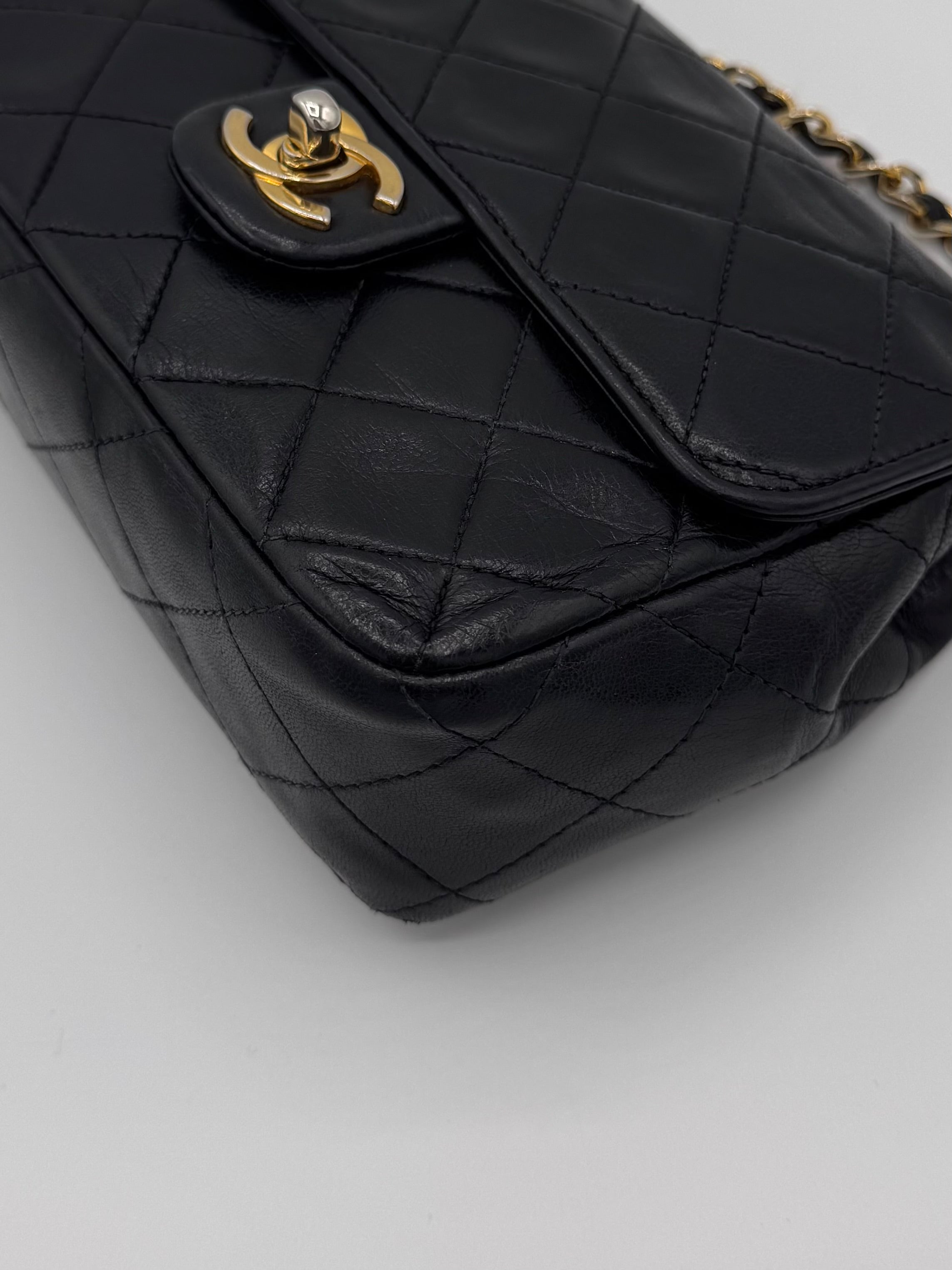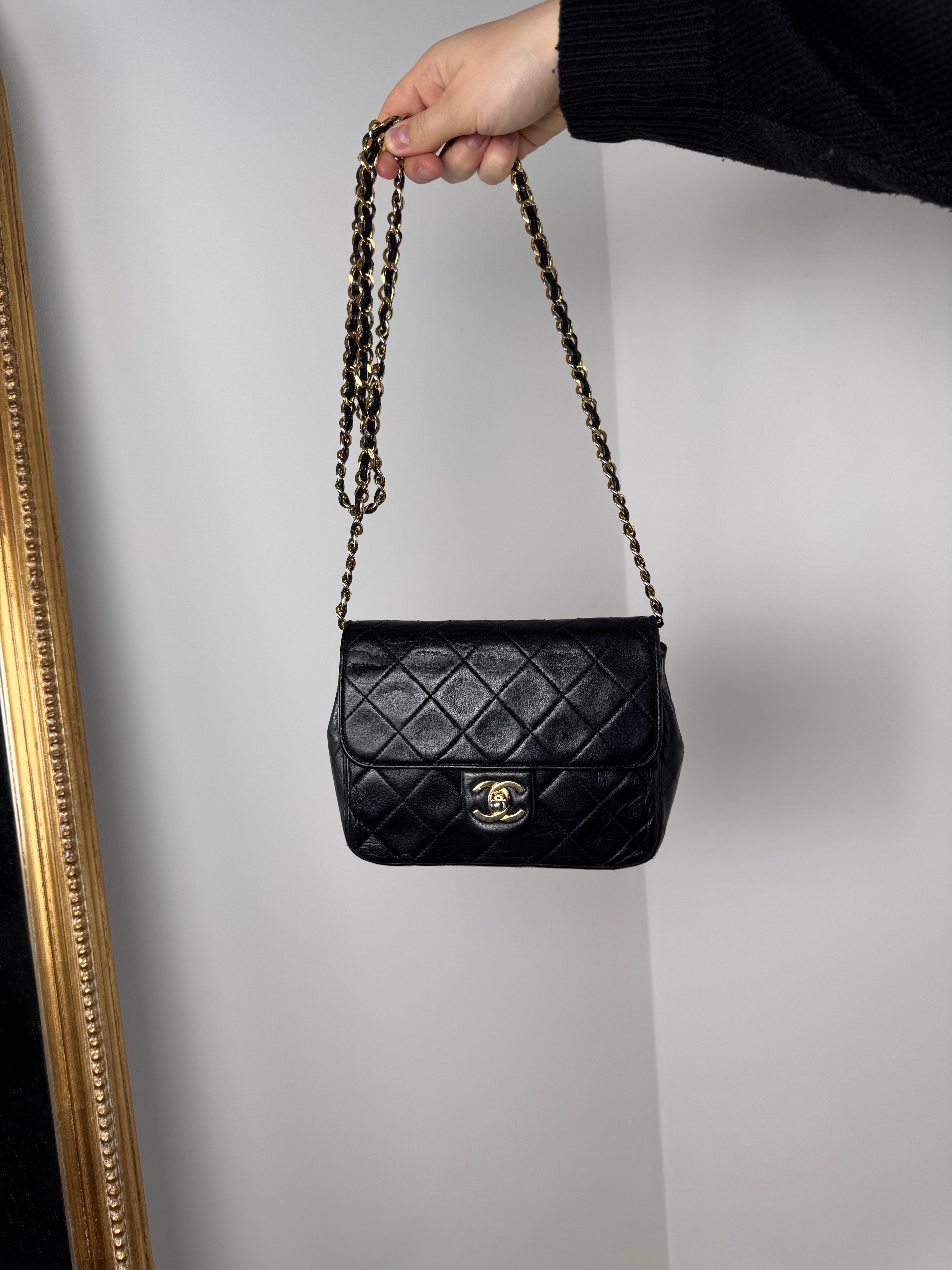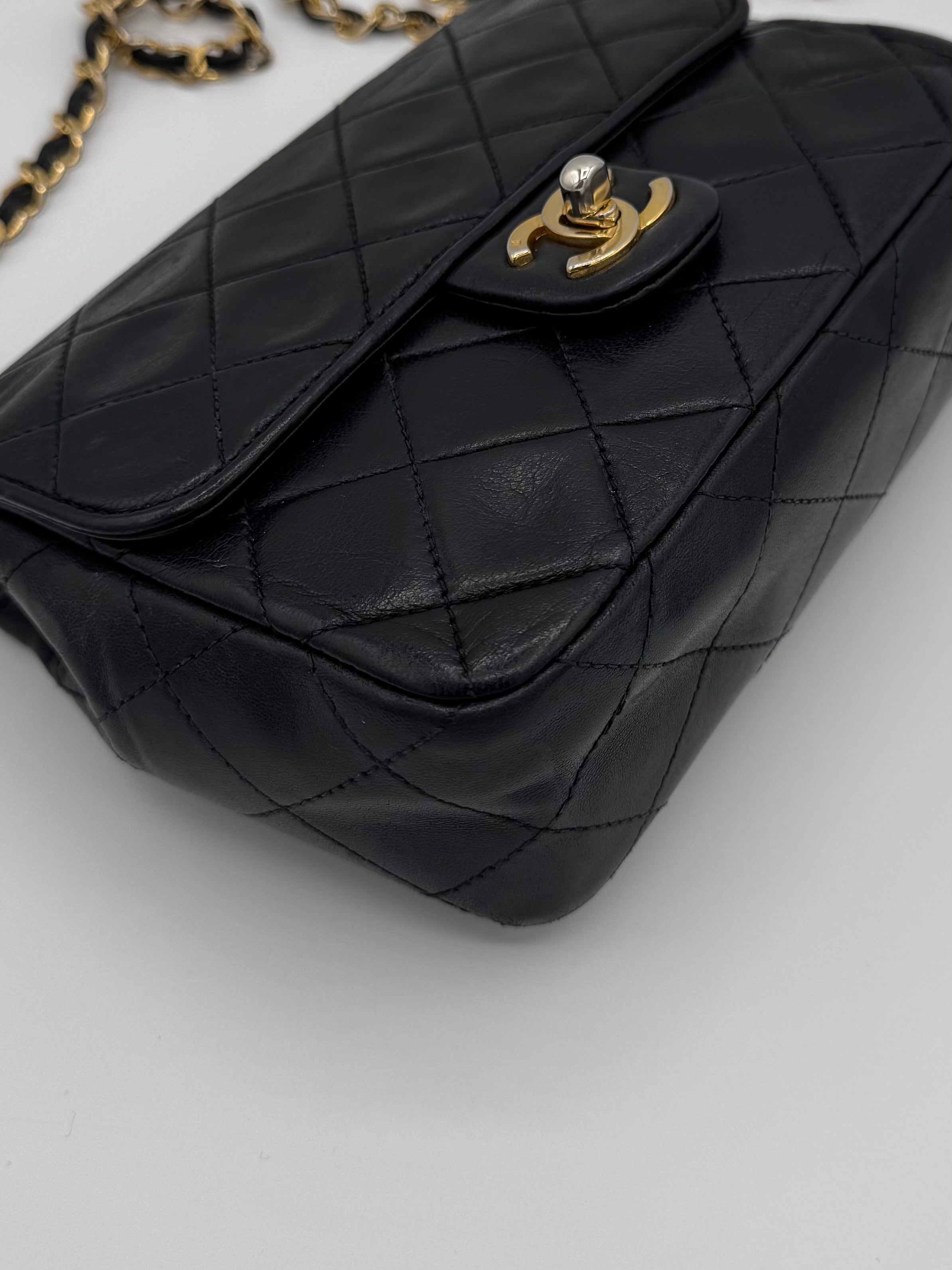 Mini Sac Classique de chez Chanel, en cuir d'agneau noir et bijouterie plaquée or 24 carats, en très bon état.