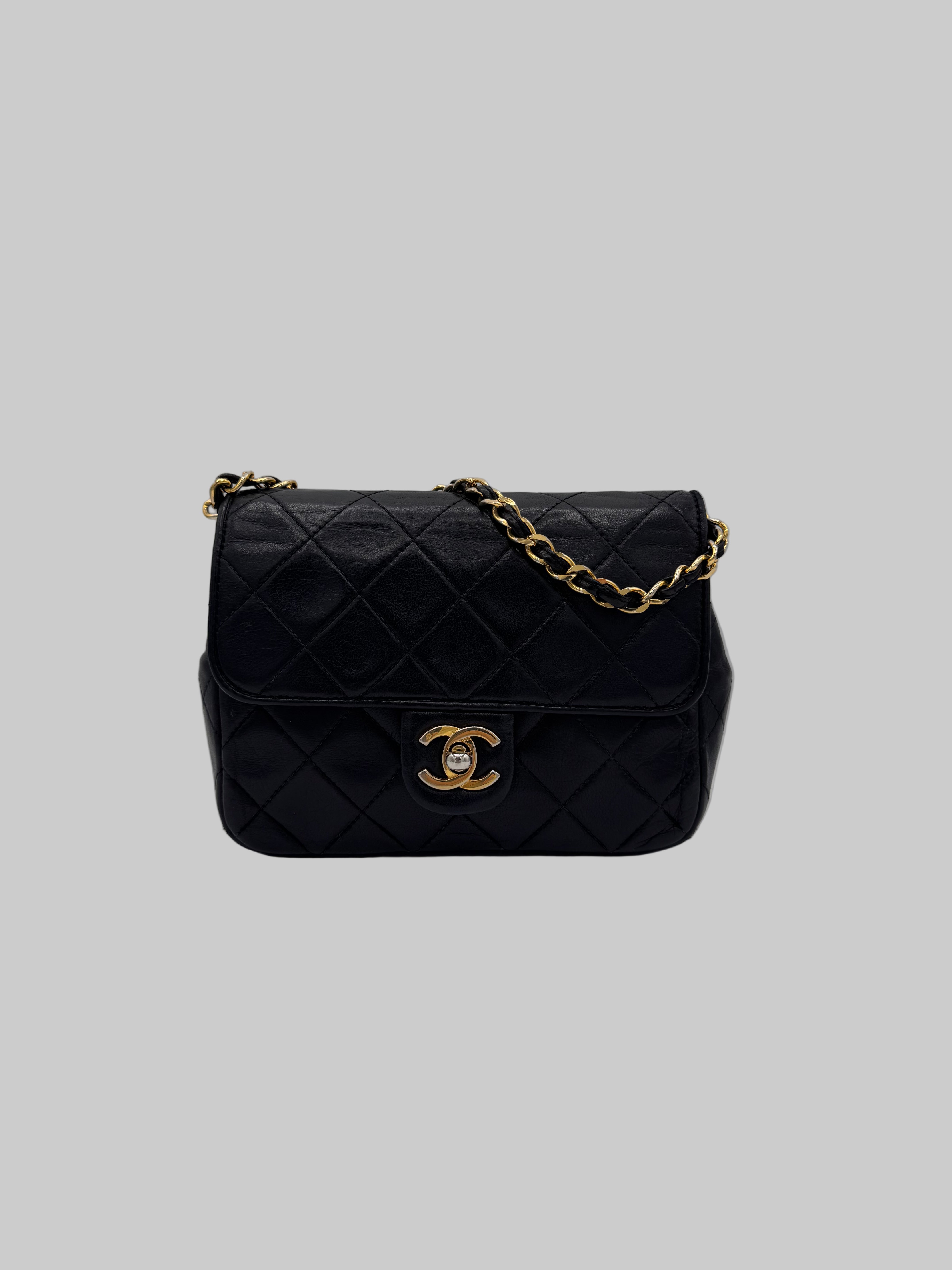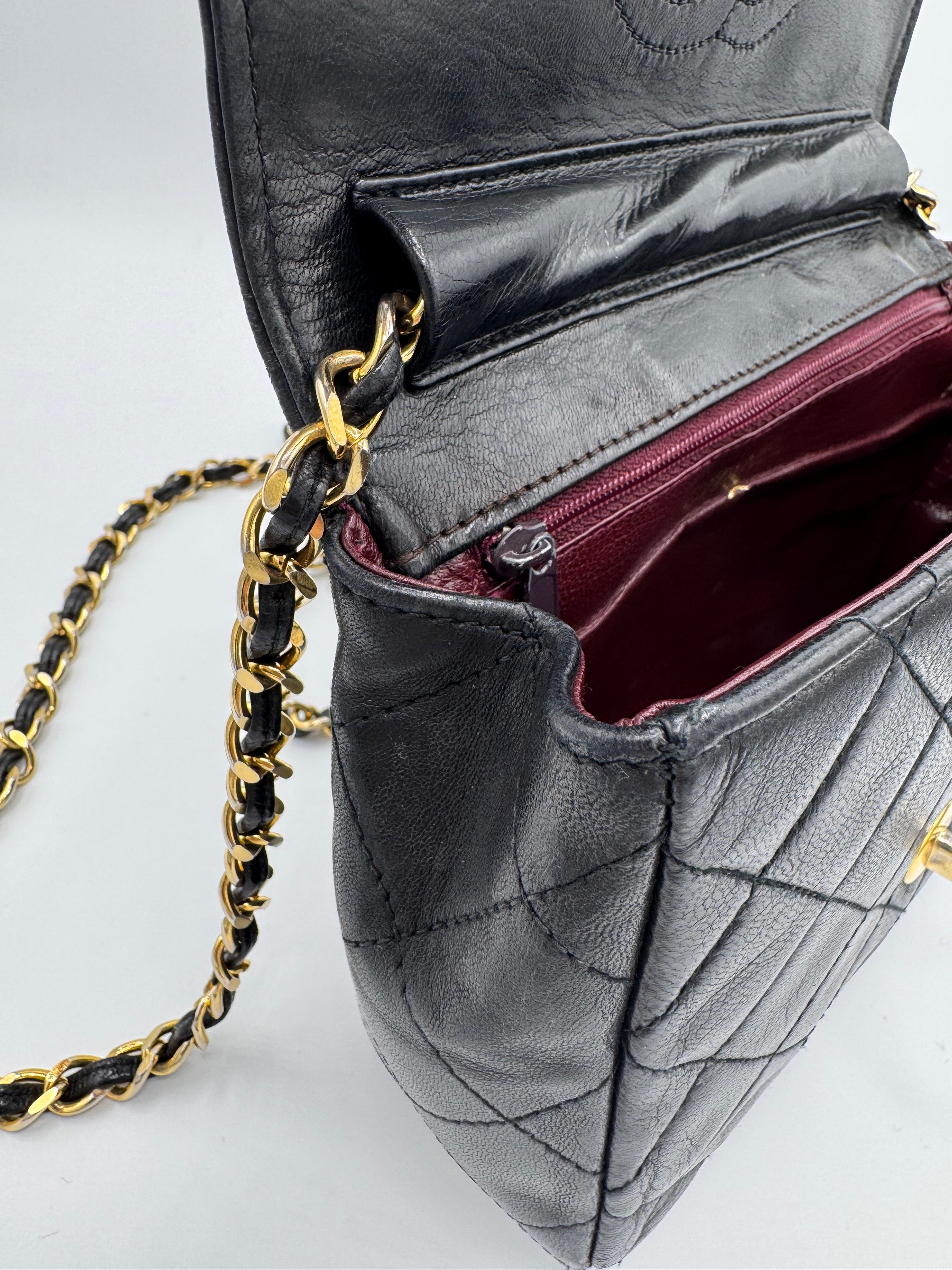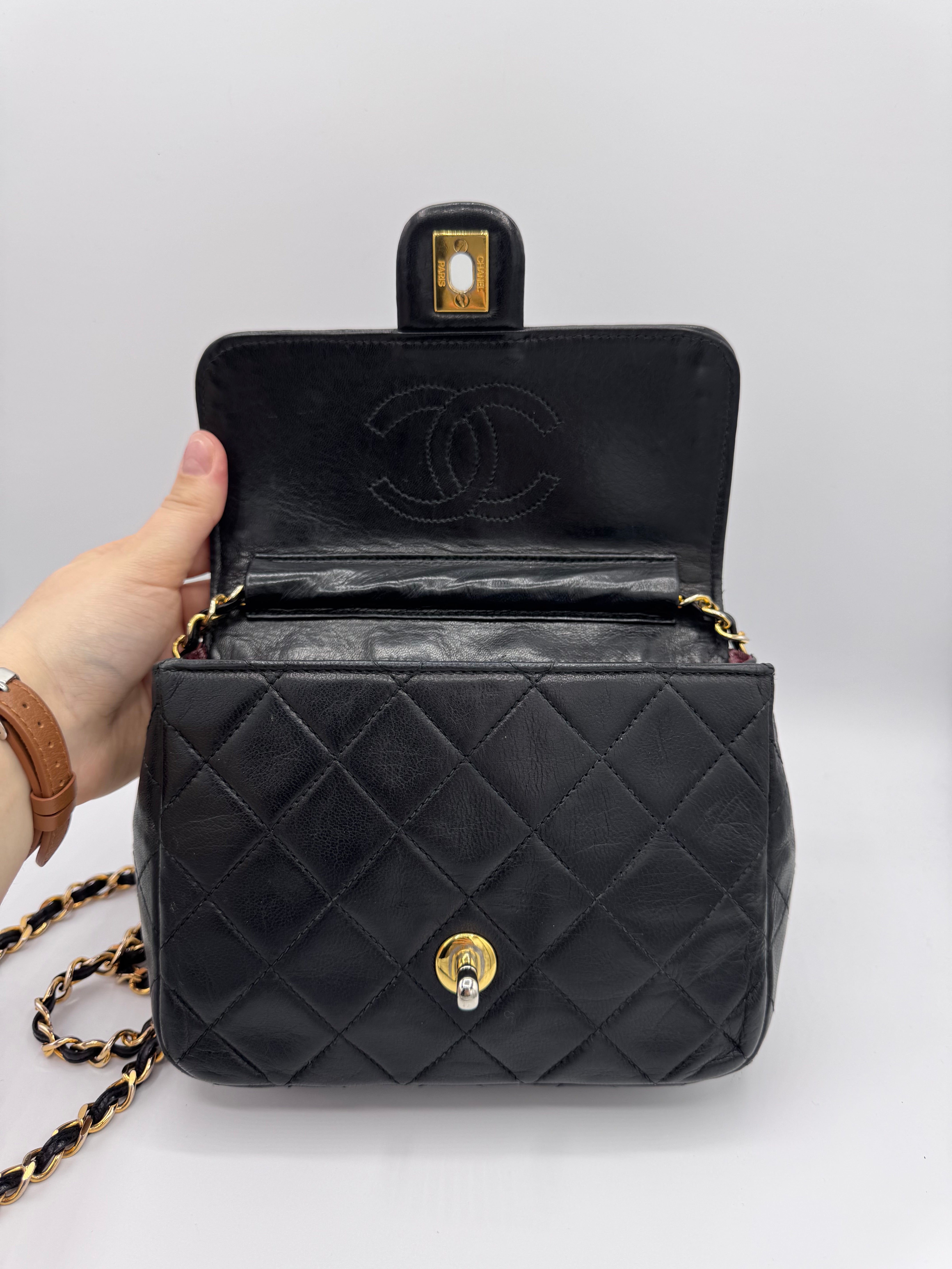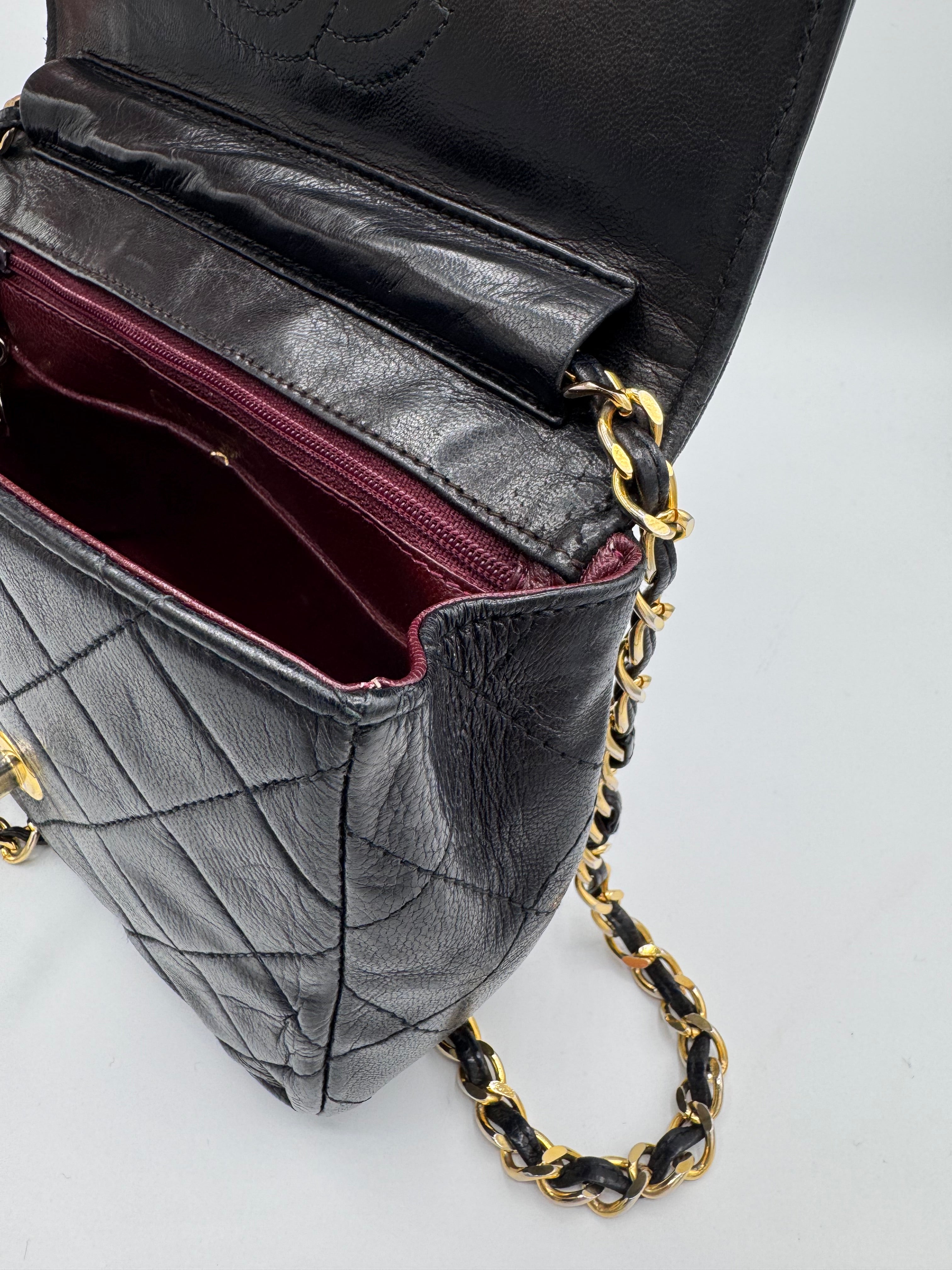 Mini Sac Classique de chez Chanel, en cuir d'agneau noir et bijouterie plaquée or 24 carats, en très bon état.