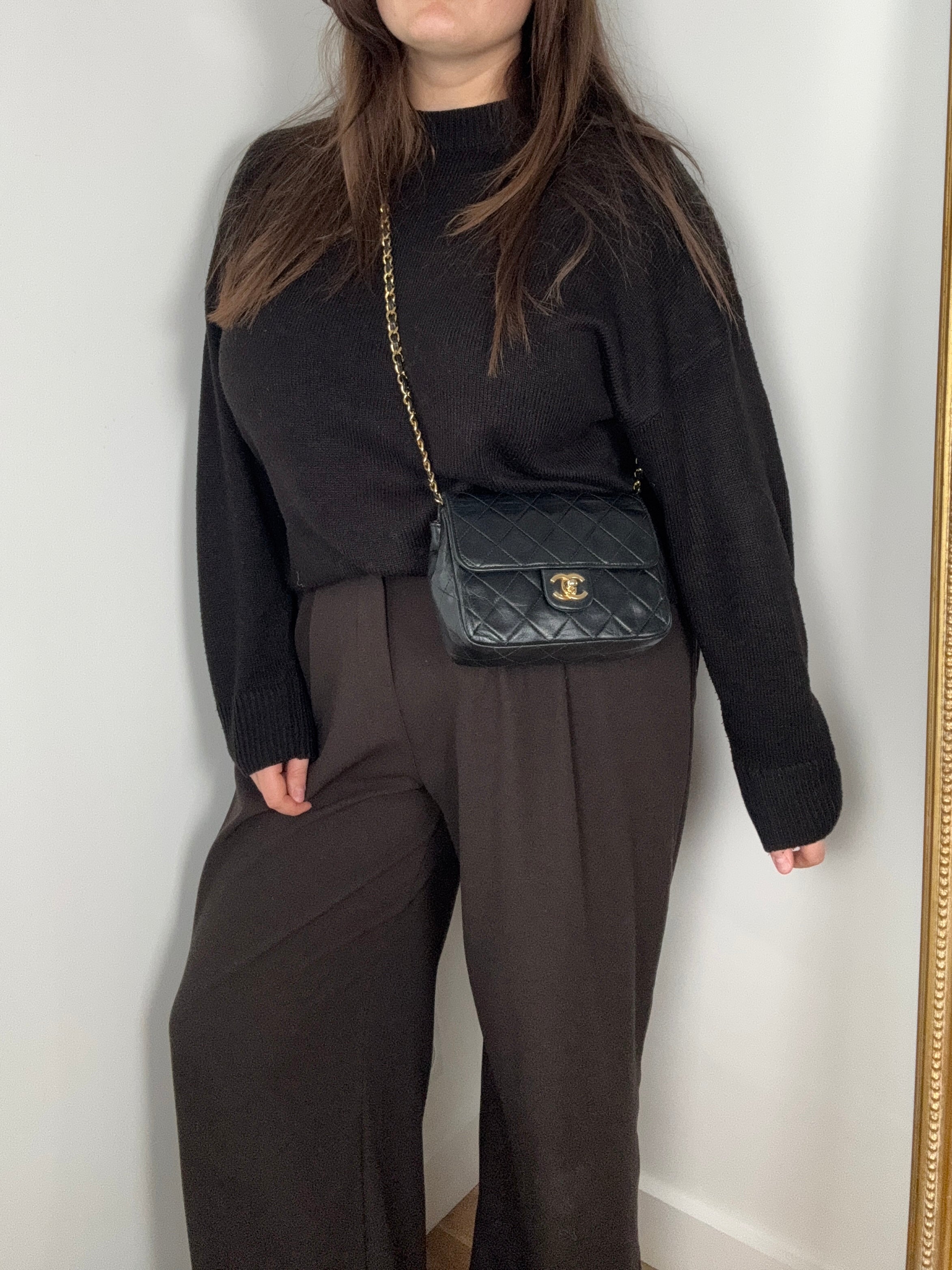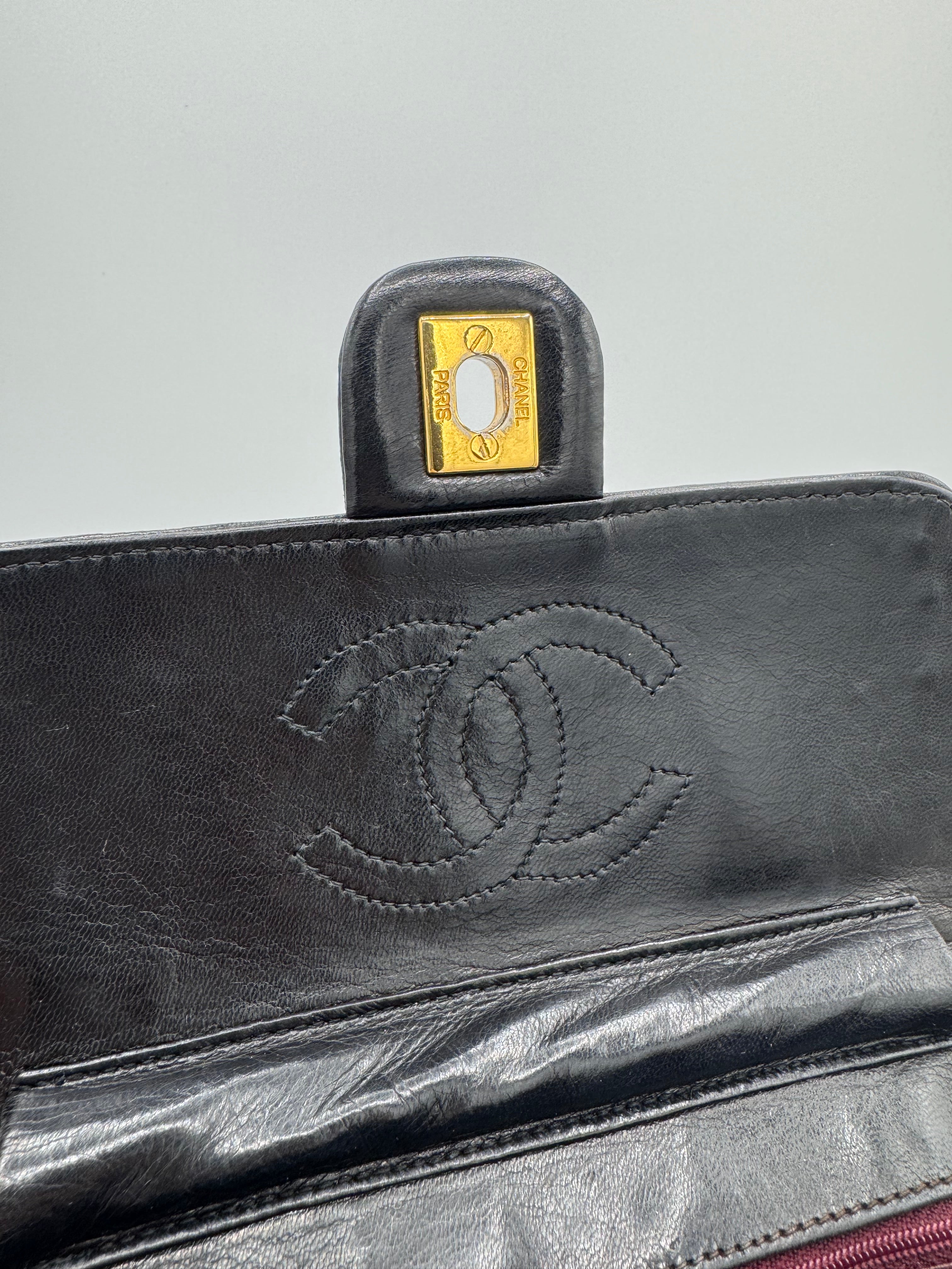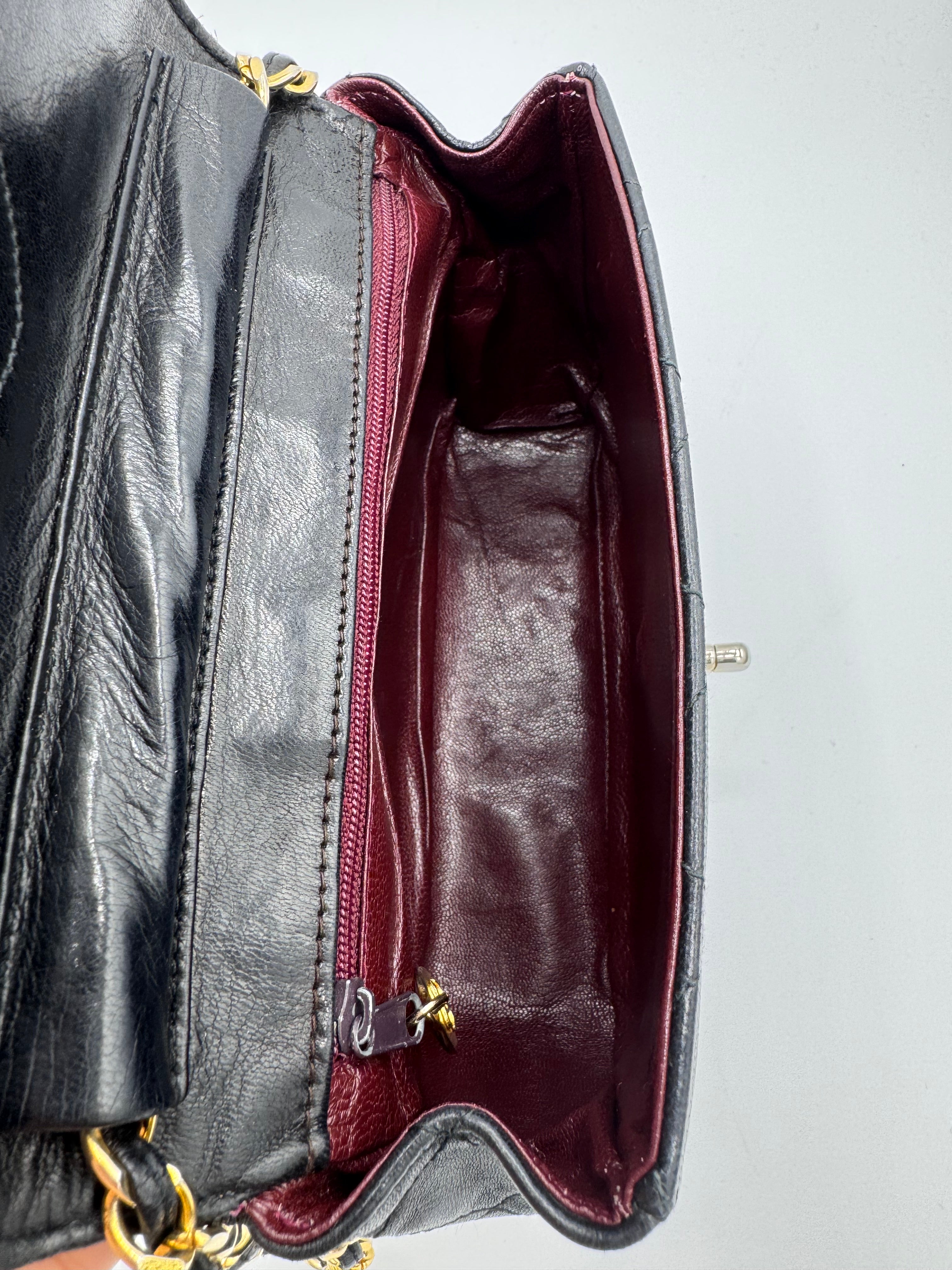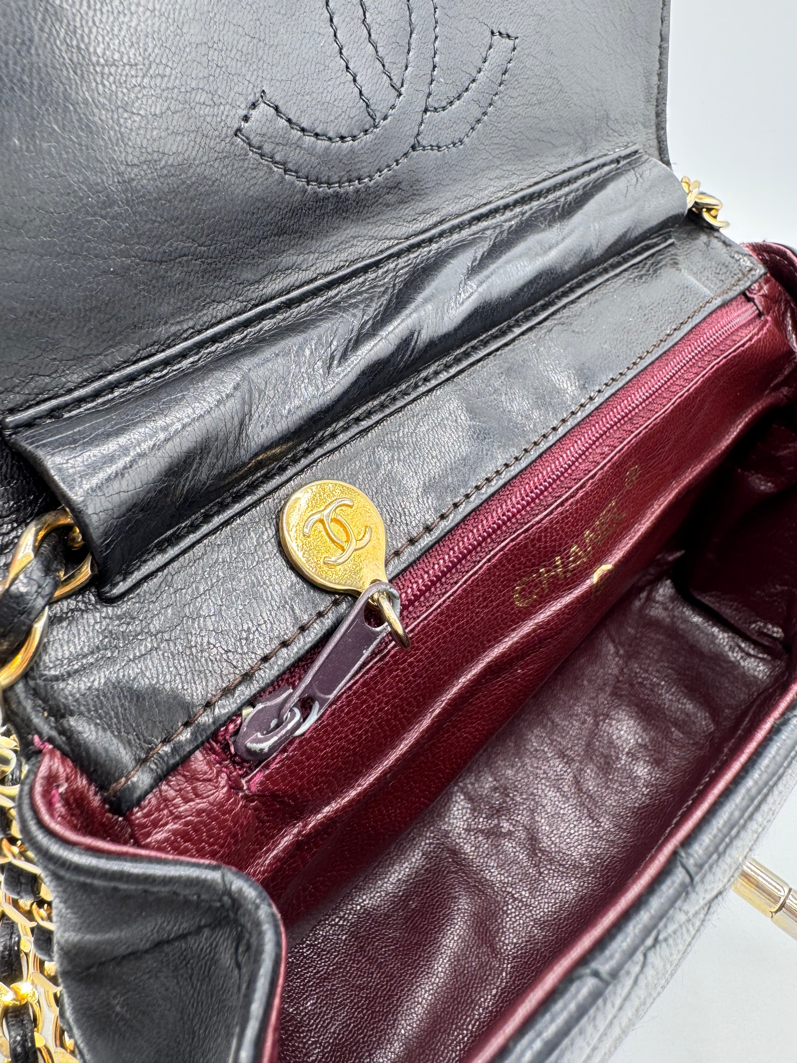 Mini Sac Classique de chez Chanel, en cuir d'agneau noir et bijouterie plaquée or 24 carats, en très bon état.