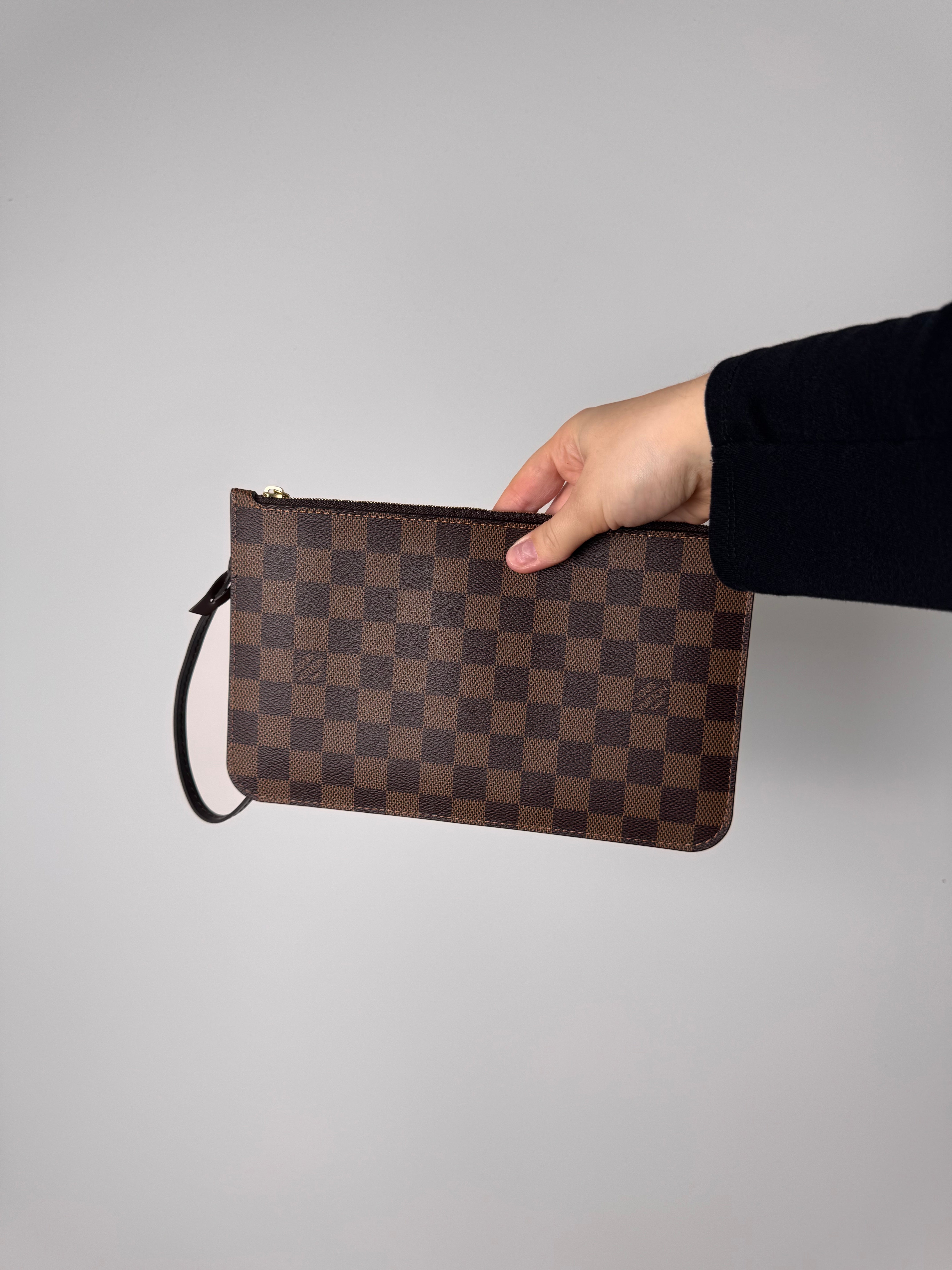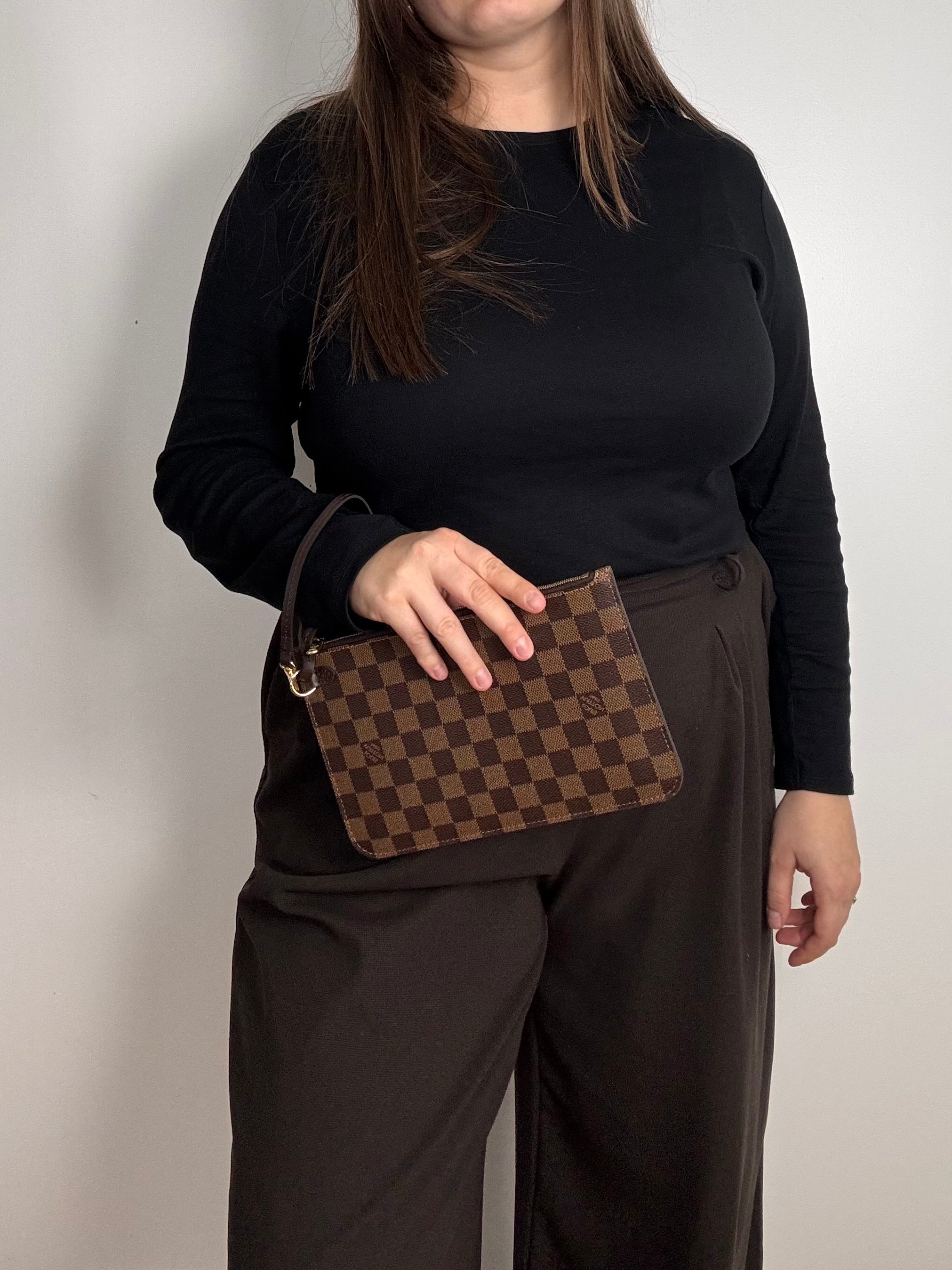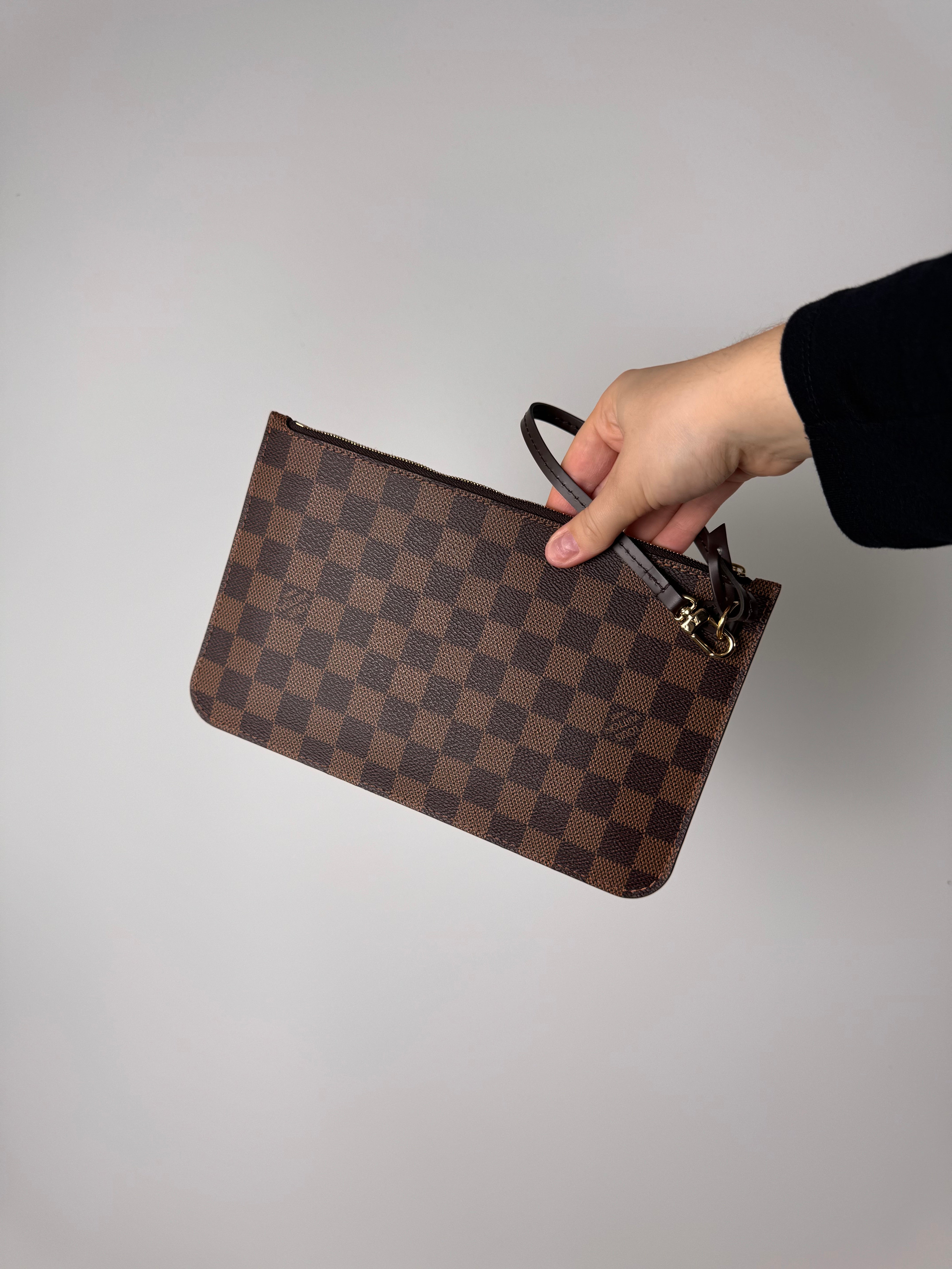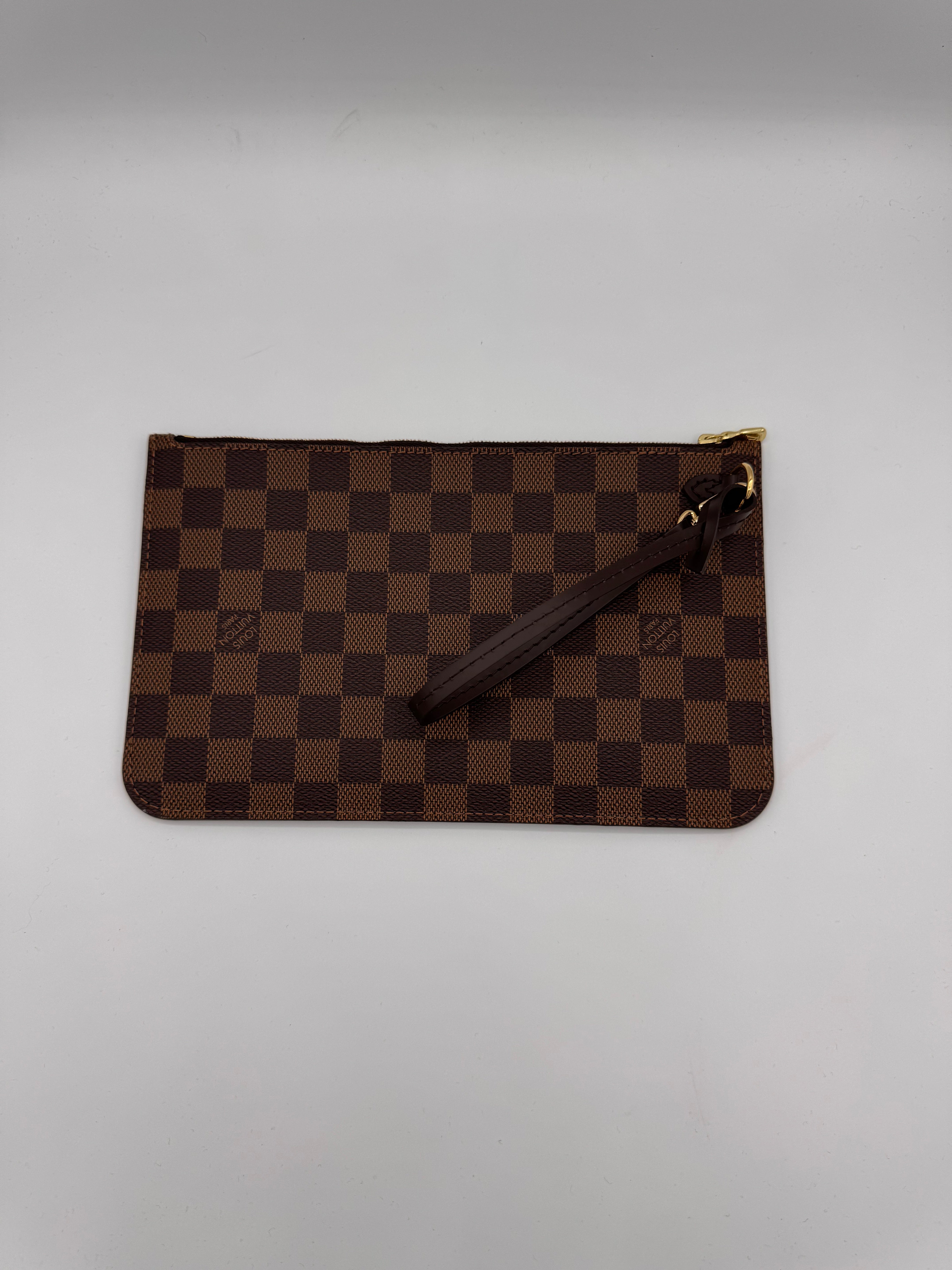 Pochette Louis Vuitton en damier ébène, en état neuf, initialement prévue pour le sac Neverfull.