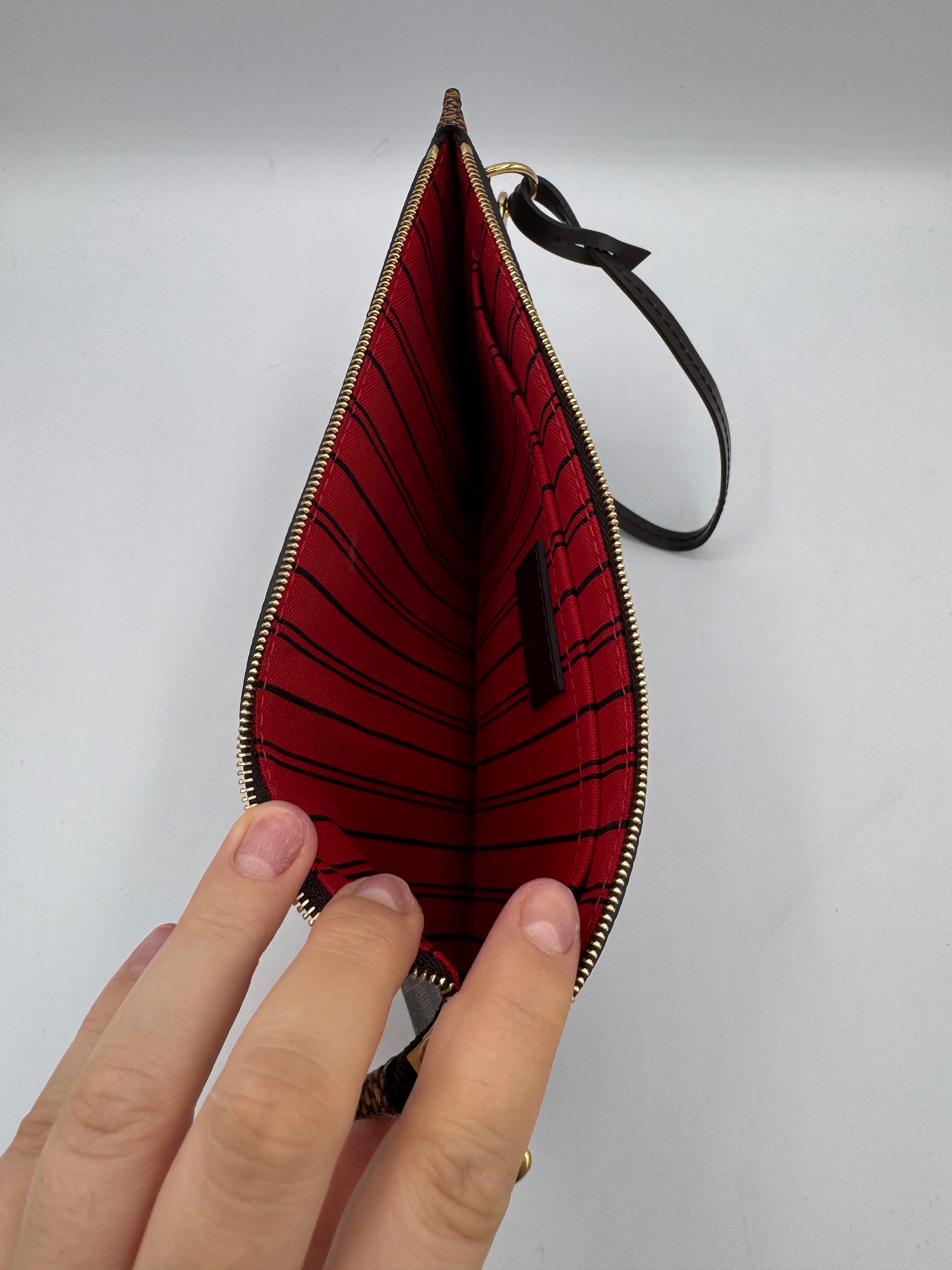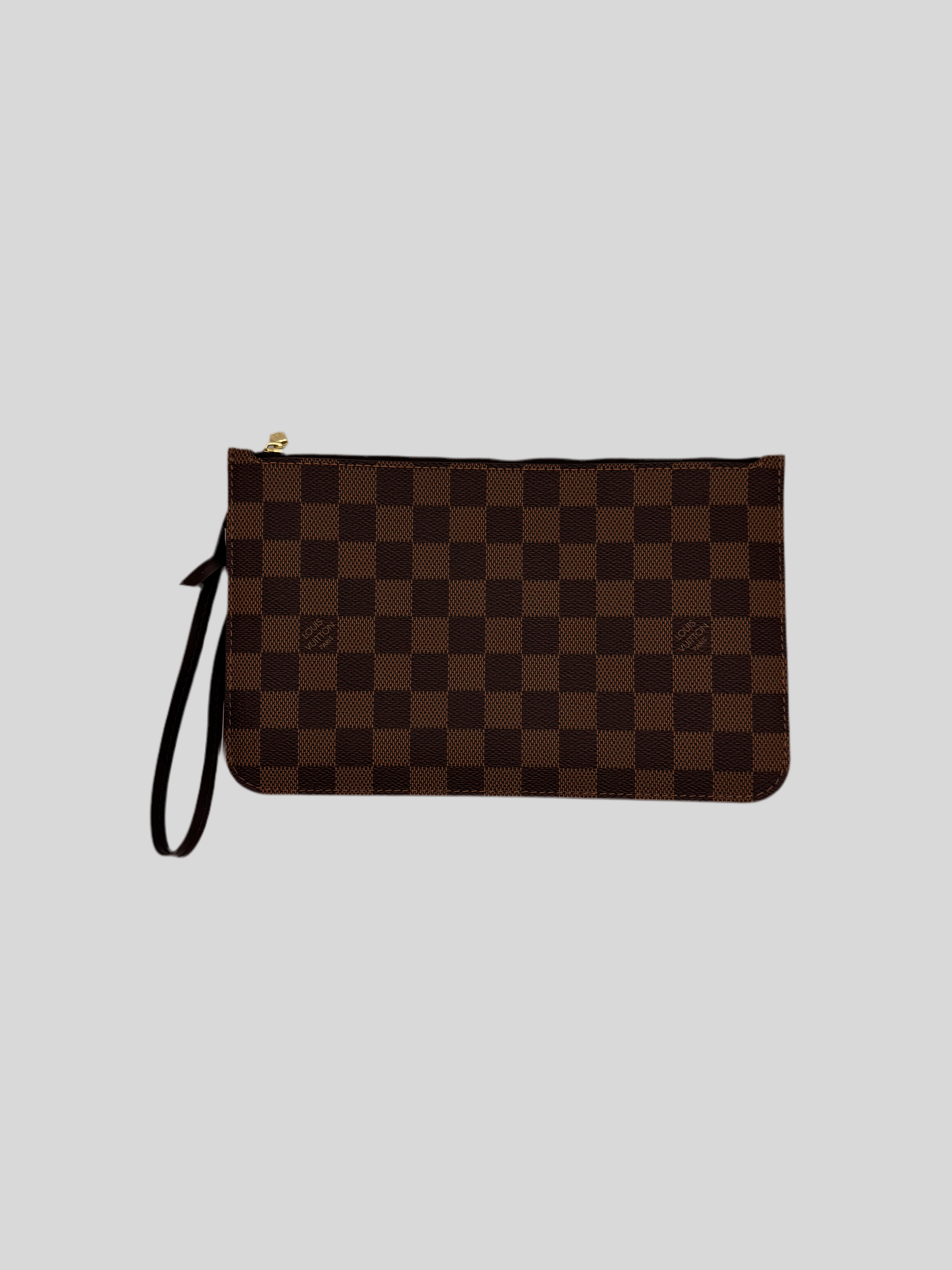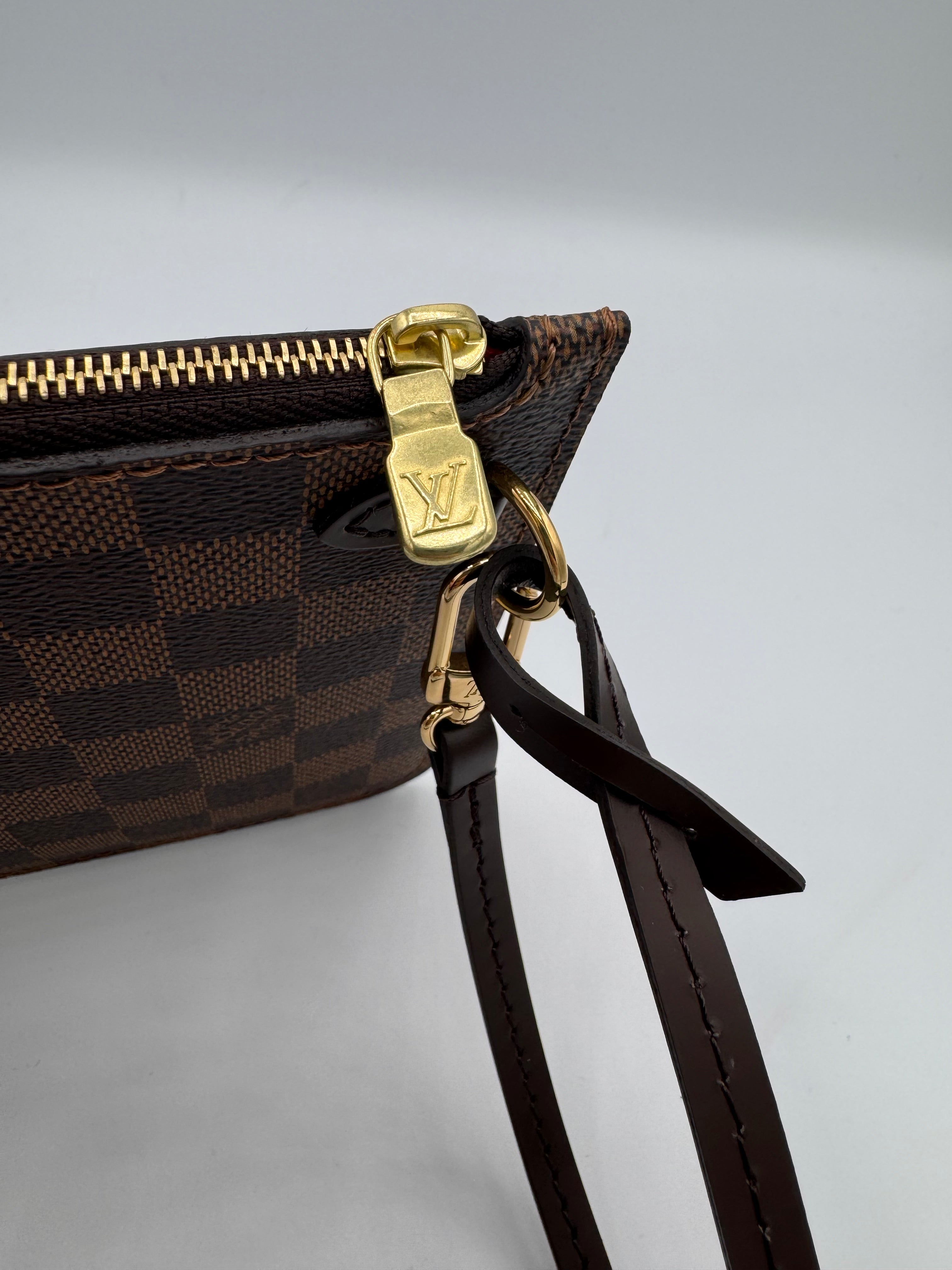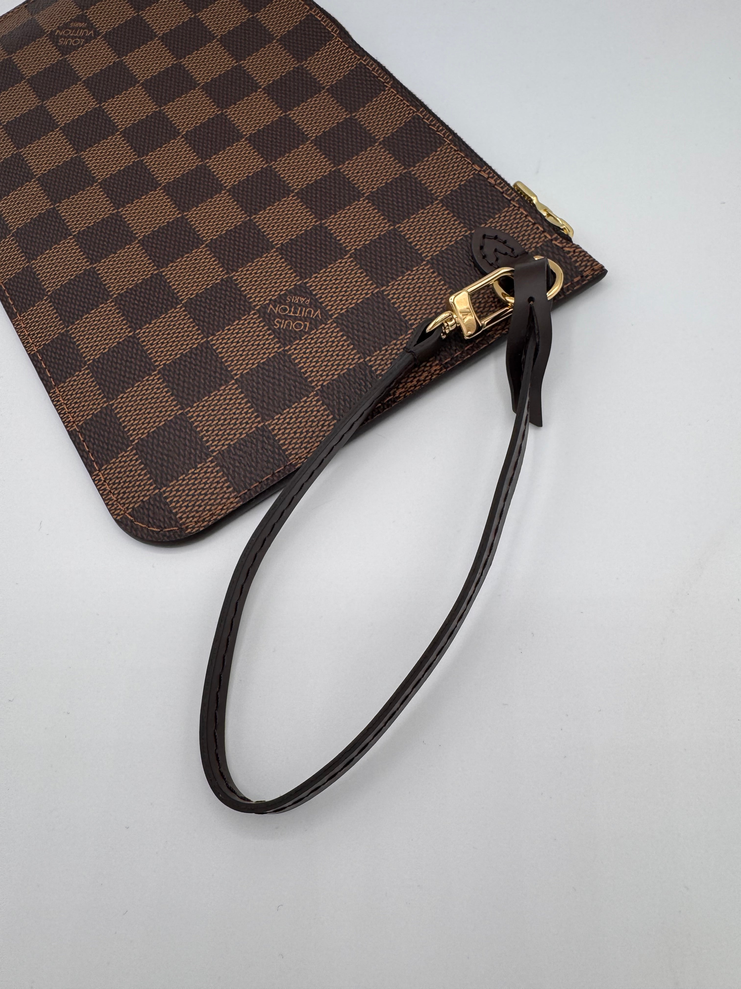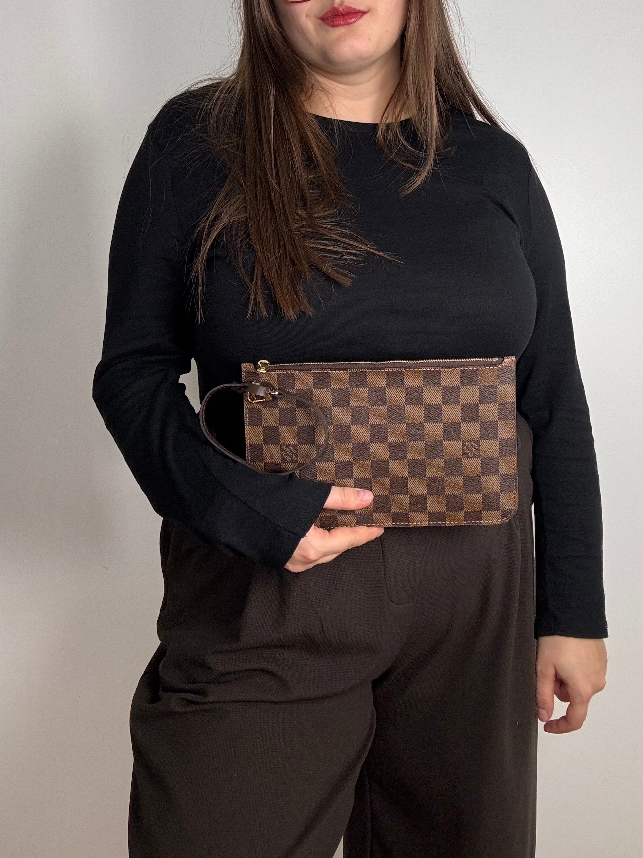 Pochette Louis Vuitton en damier ébène, en état neuf, initialement prévue pour le sac Neverfull.