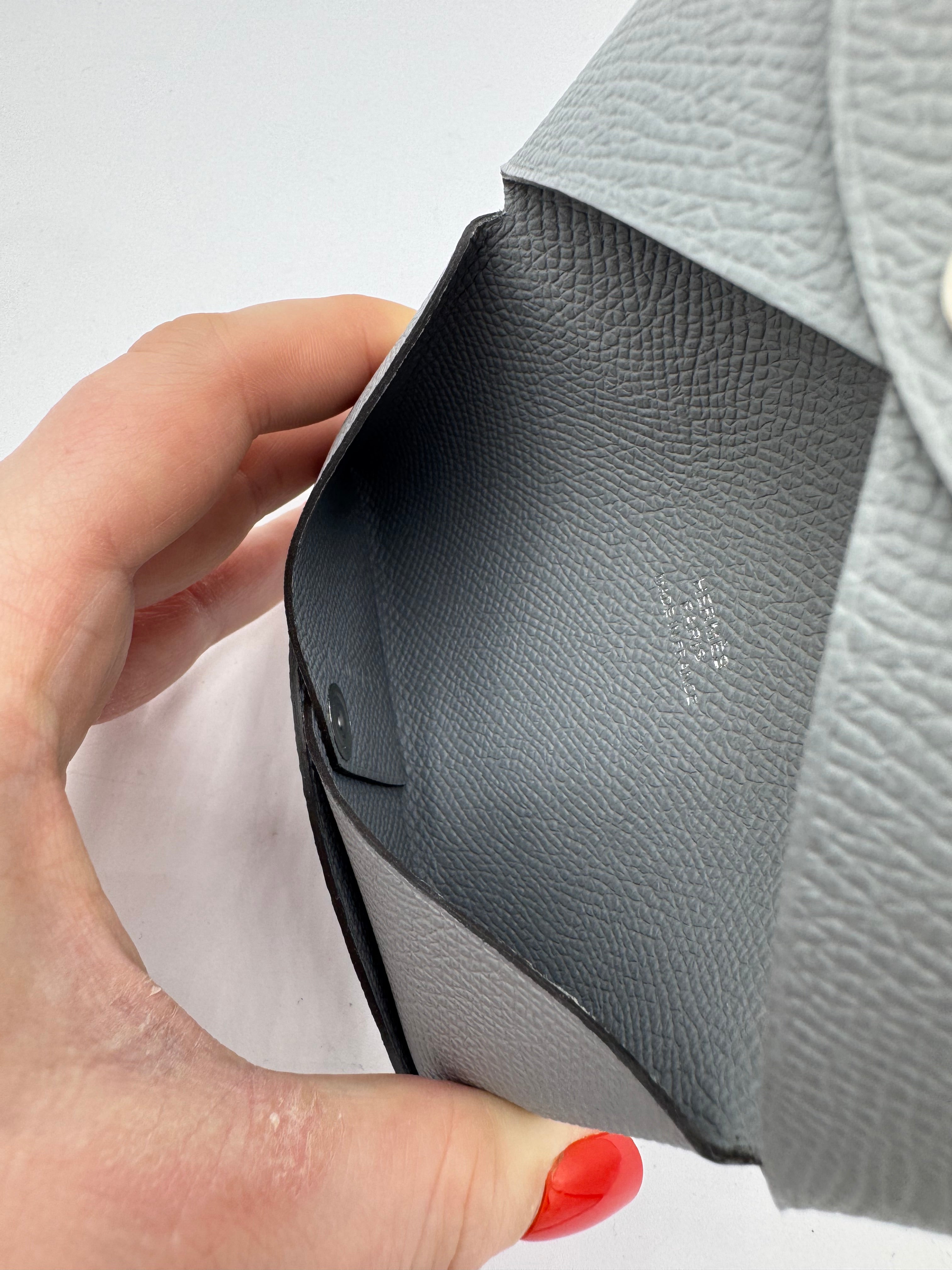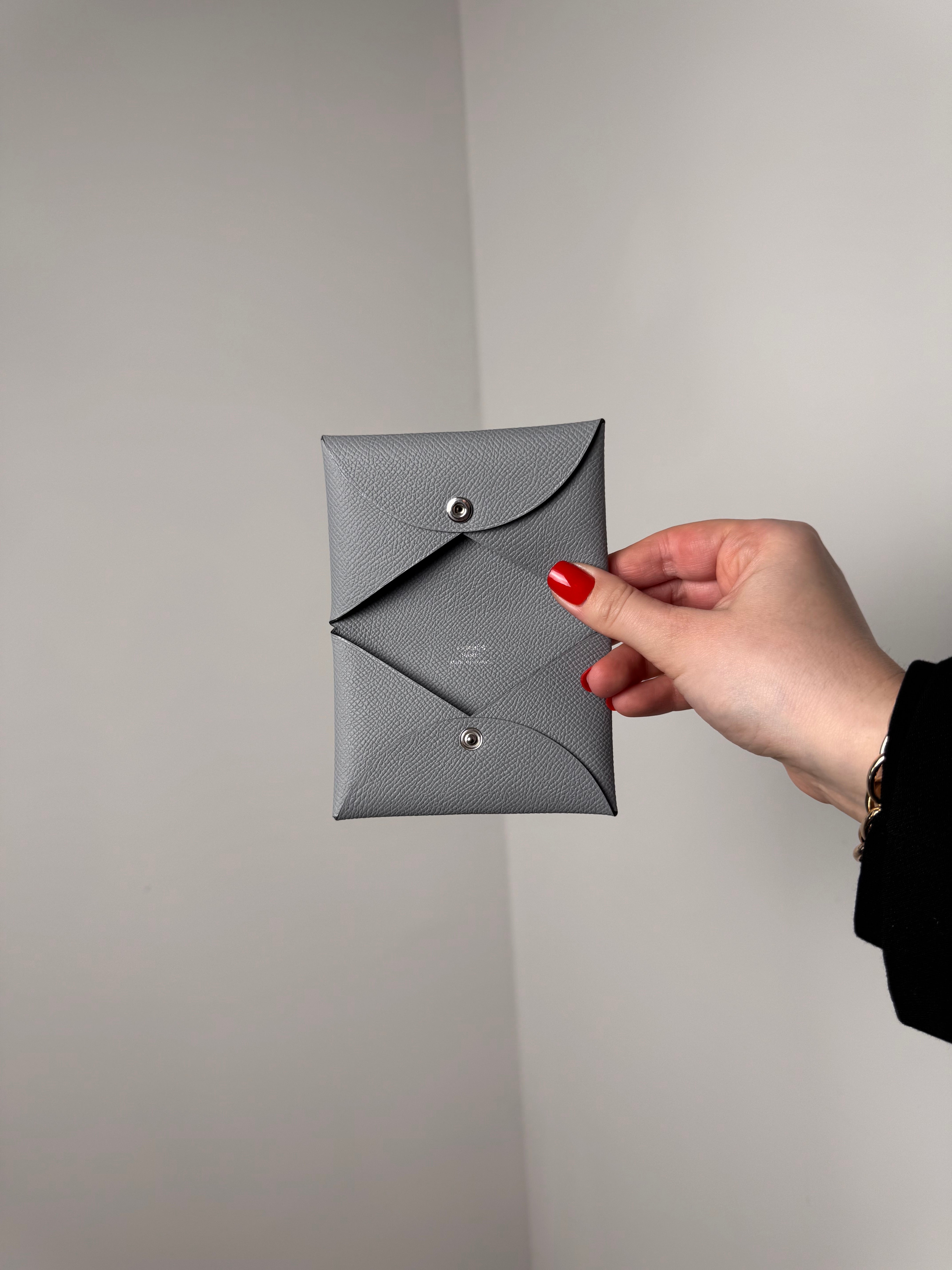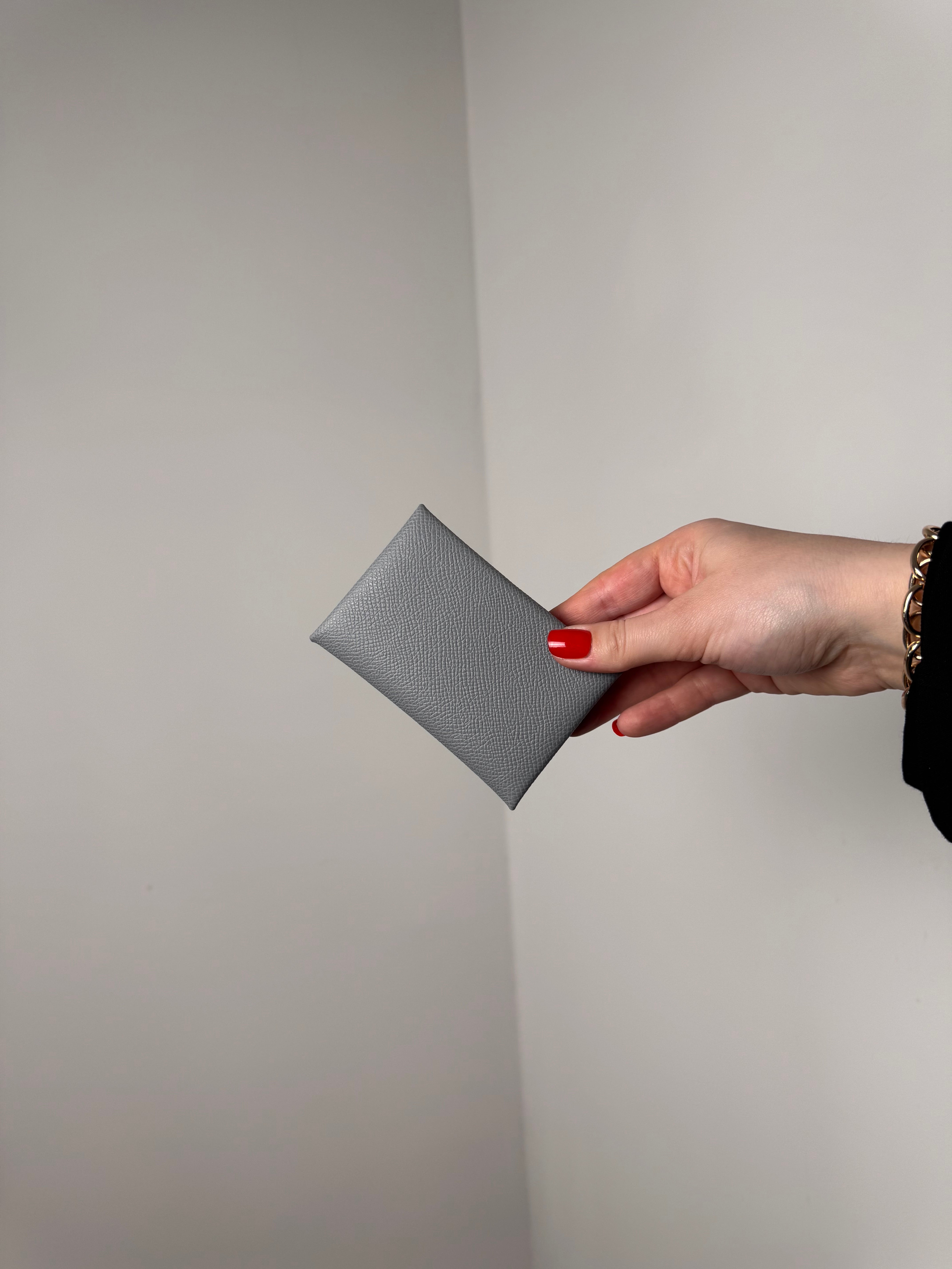 Porte-cartes Calvi de chez Hermès, en cuir de veau epsom, coloris gris pantin.