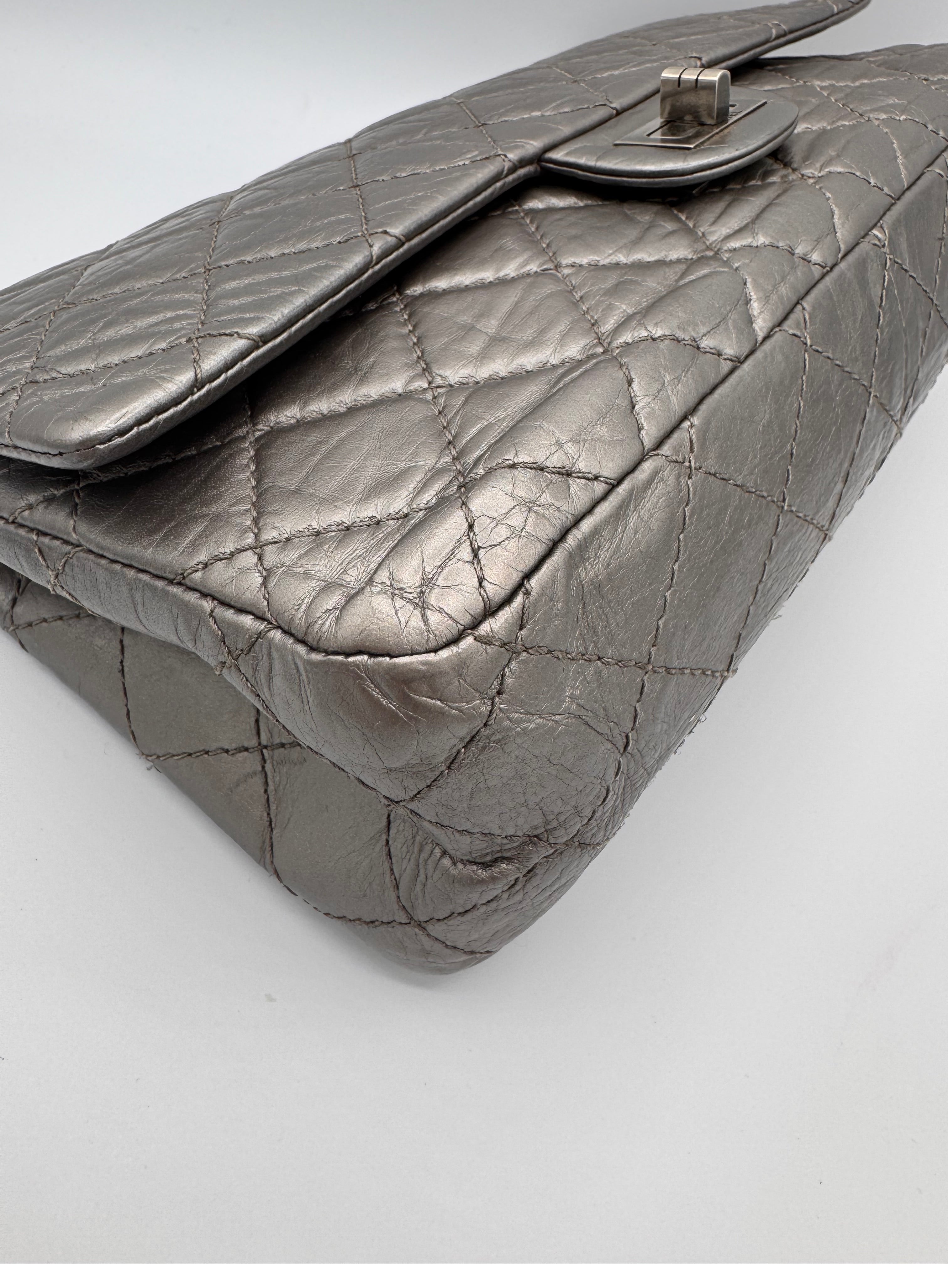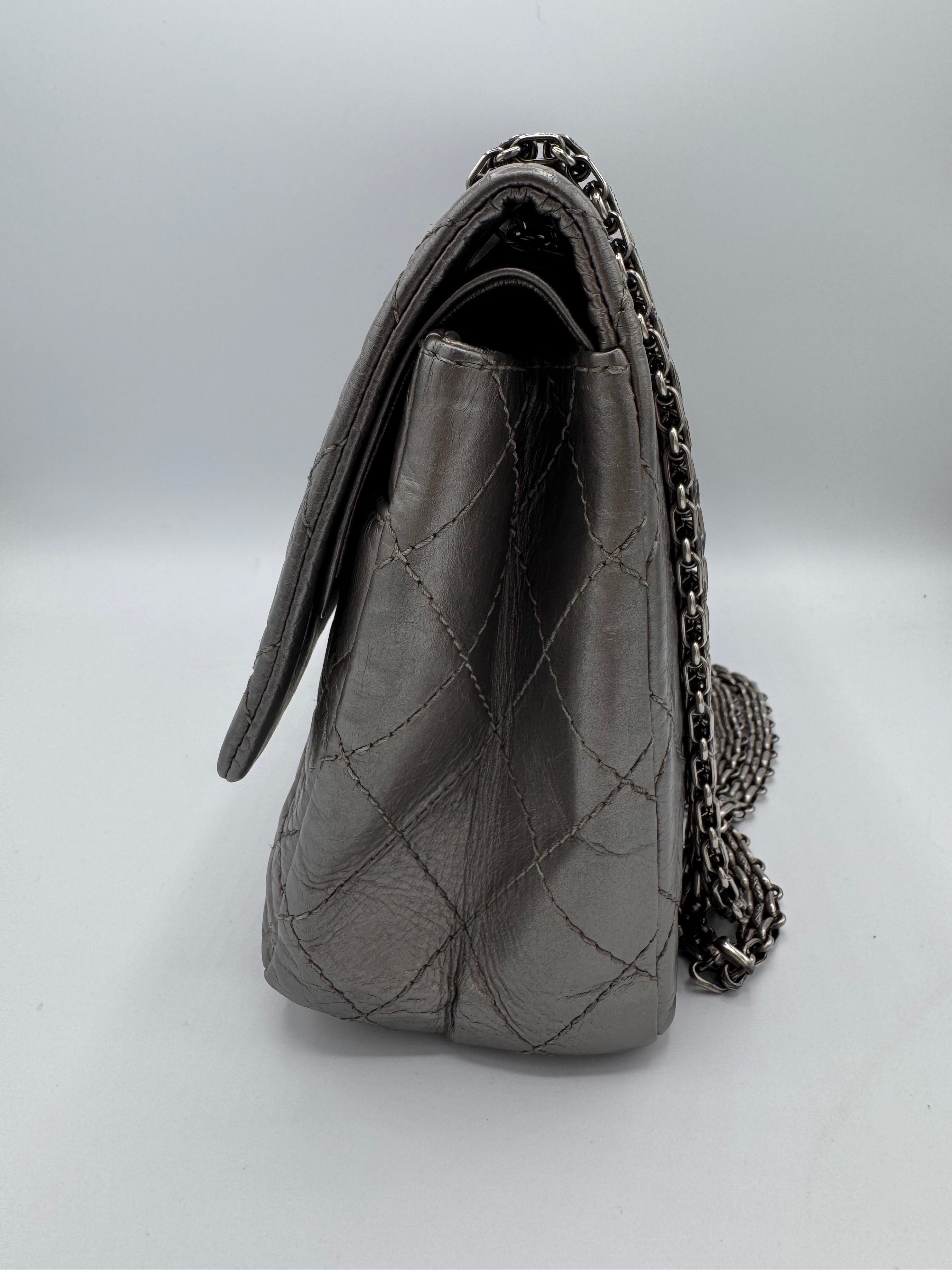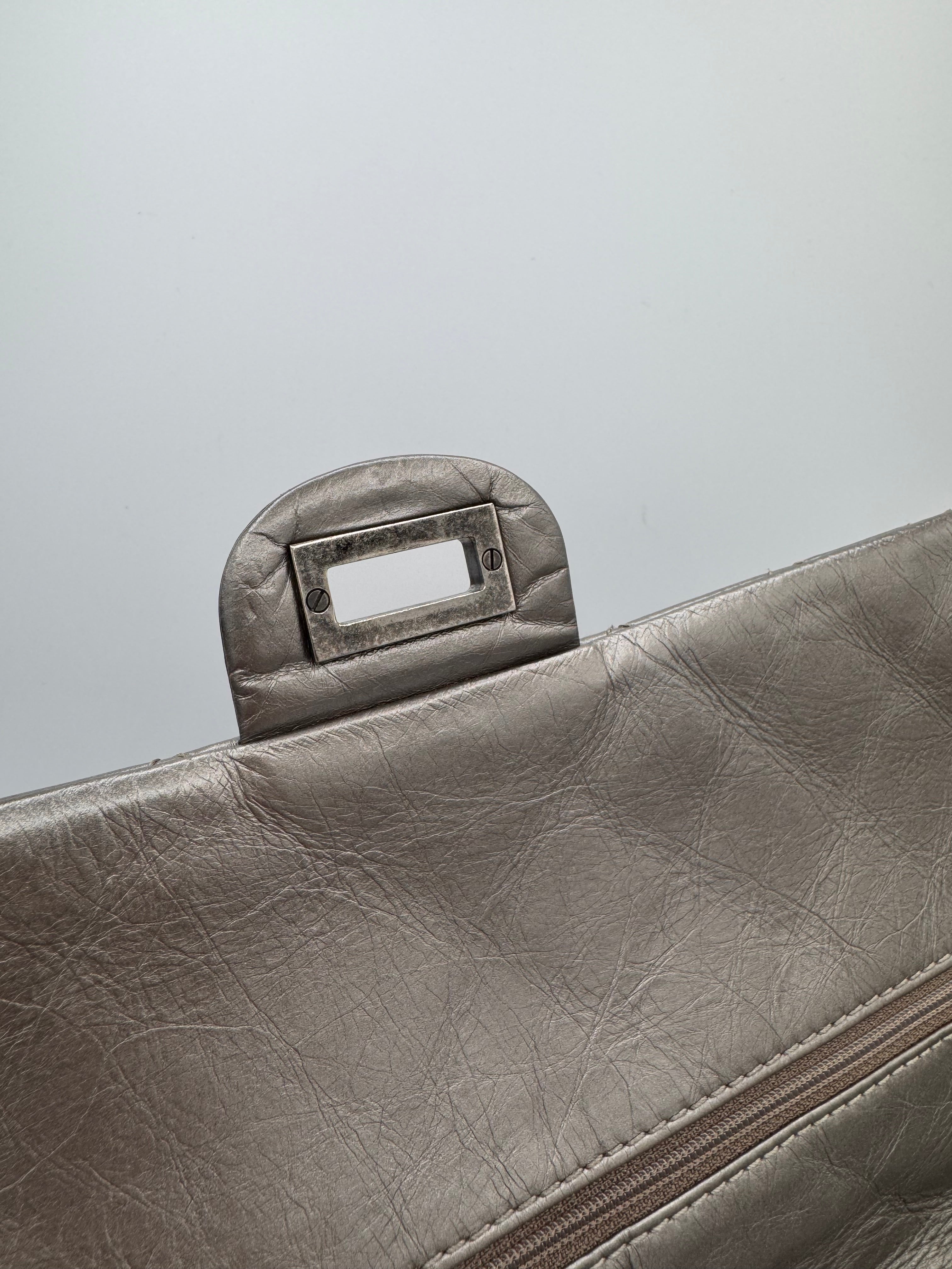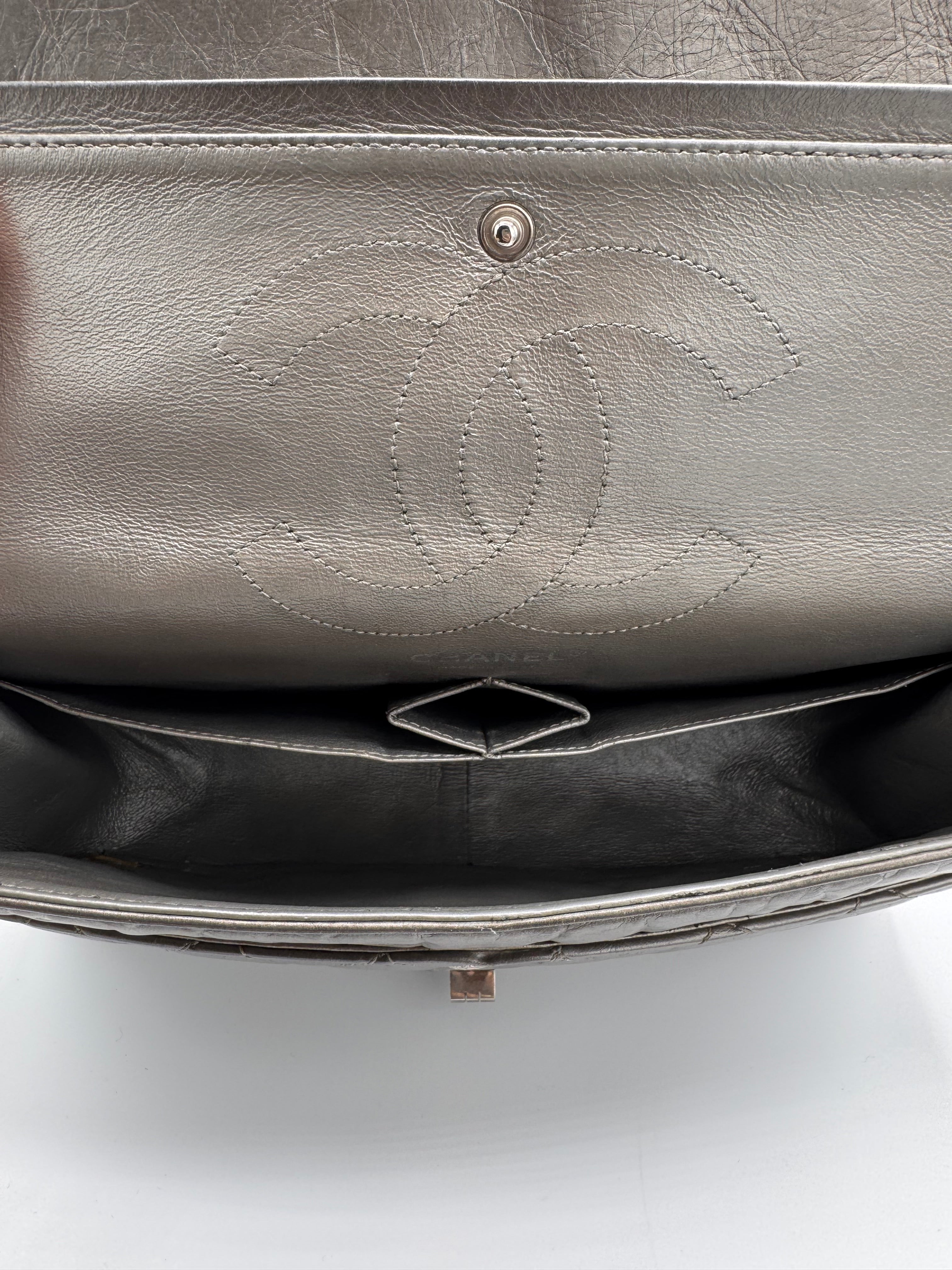 Ce Sac 2.55 double rabat Chanel, Grand en cuir de veau vielli argent et bijouterie argent vielli est en très bon état.