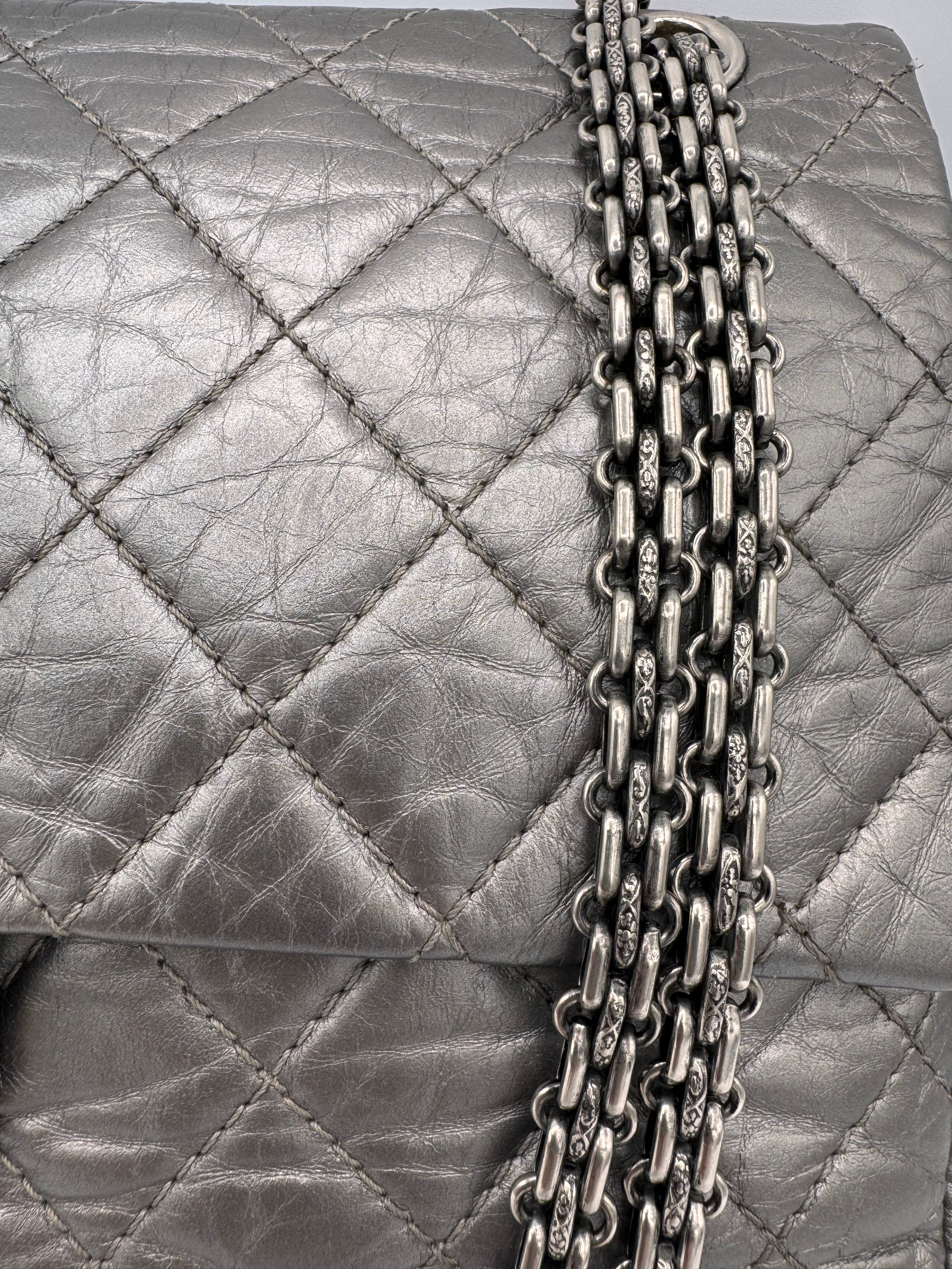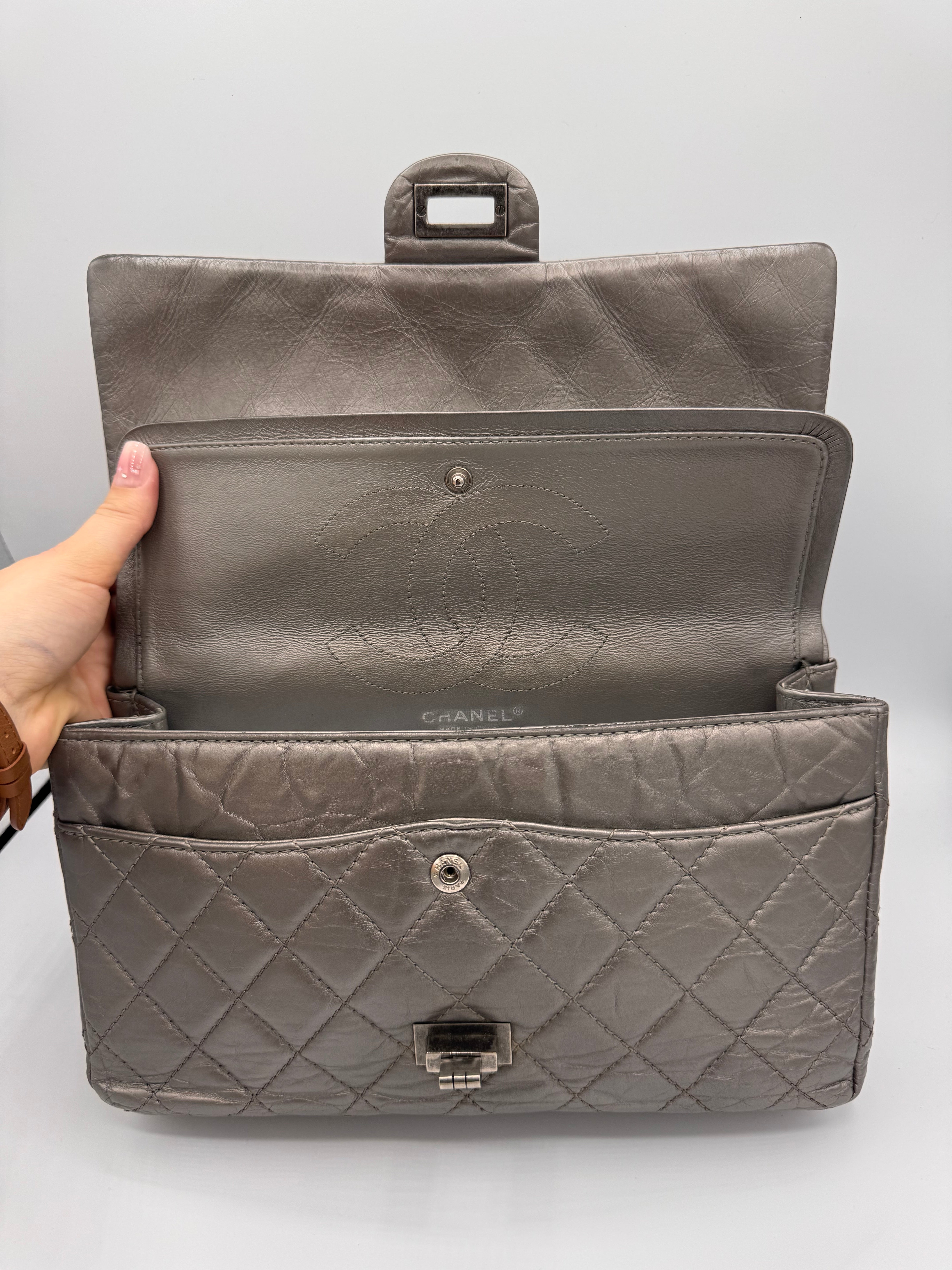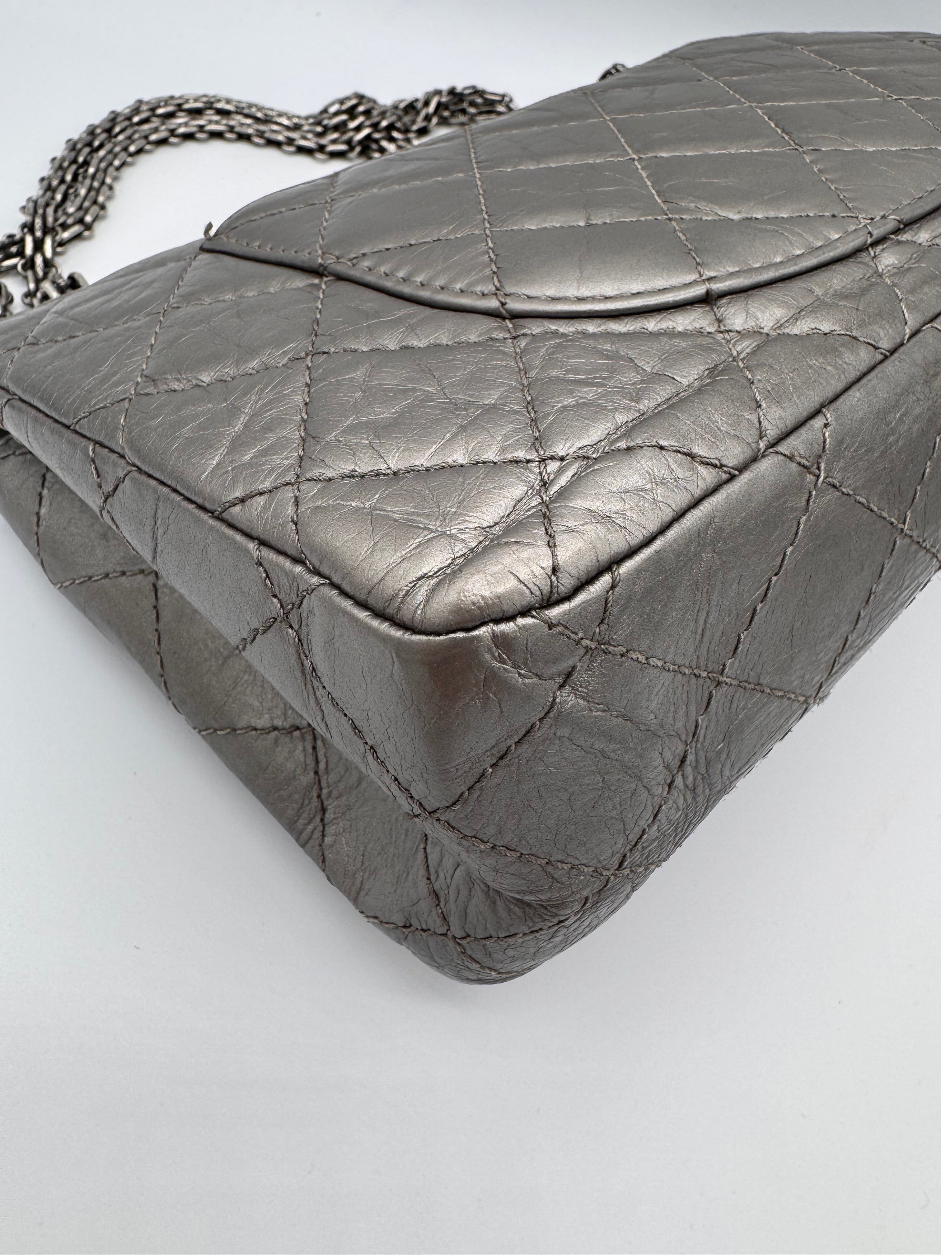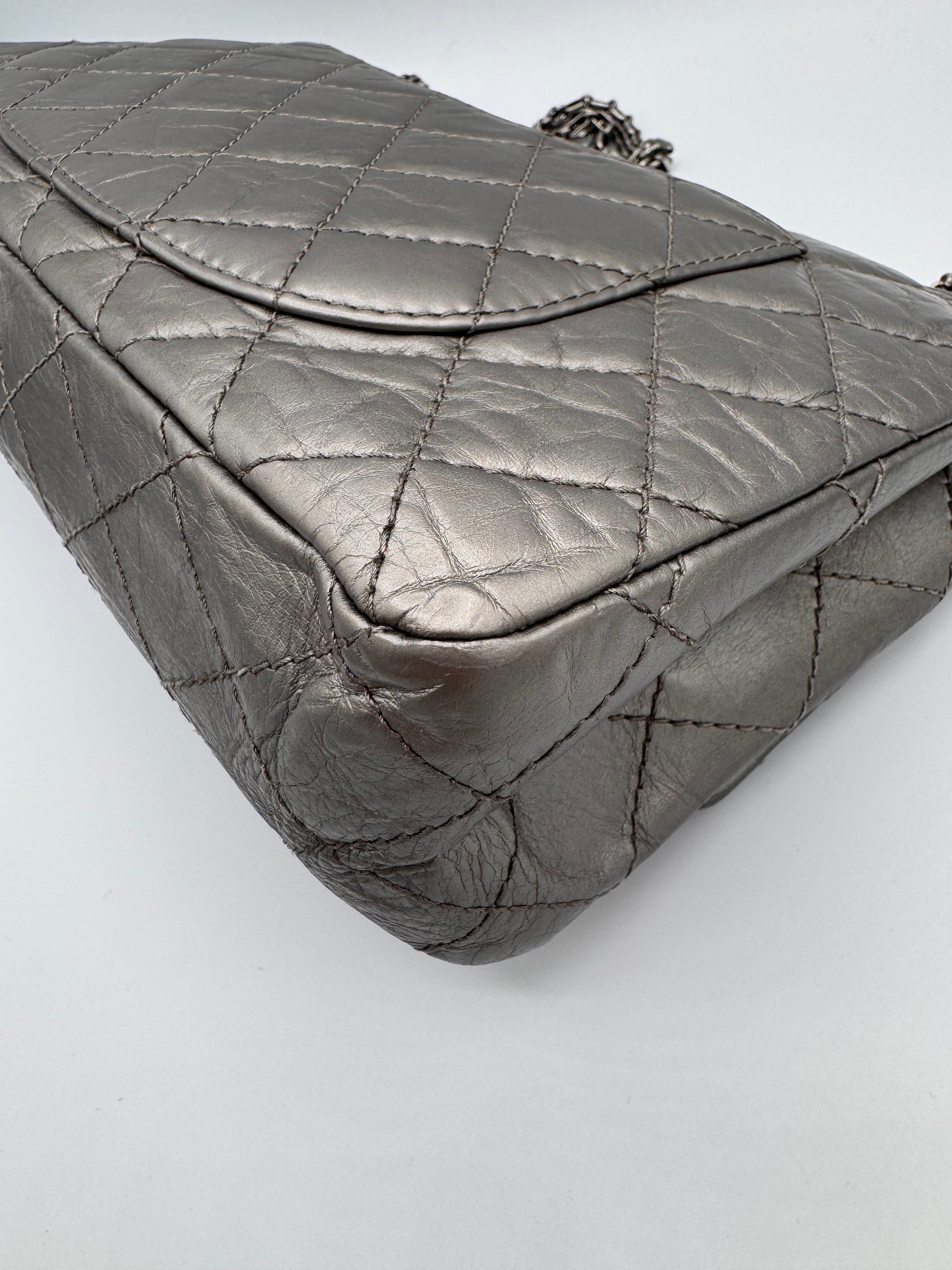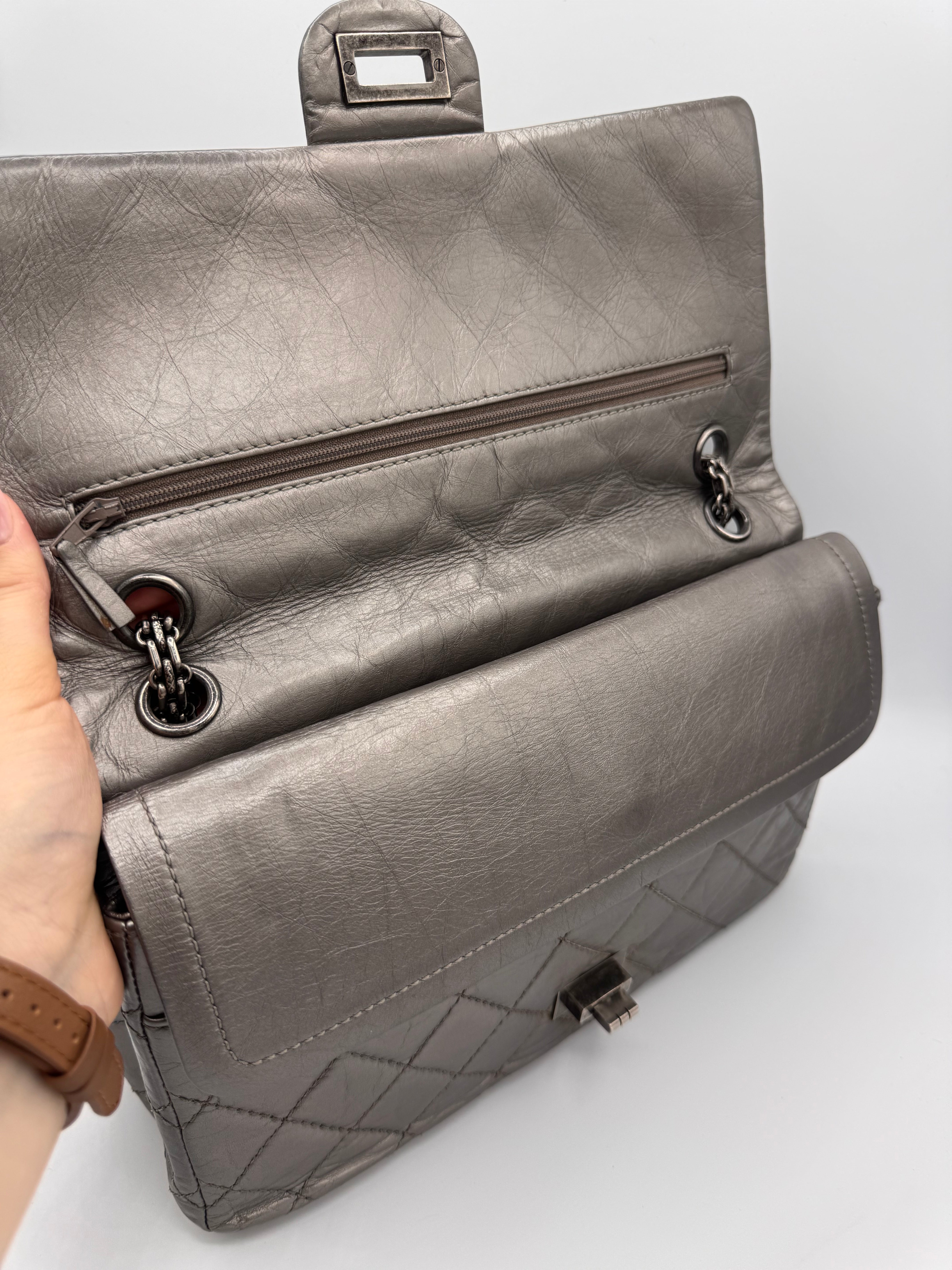 Ce Sac 2.55 double rabat Chanel, Grand en cuir de veau vielli argent et bijouterie argent vielli est en très bon état.