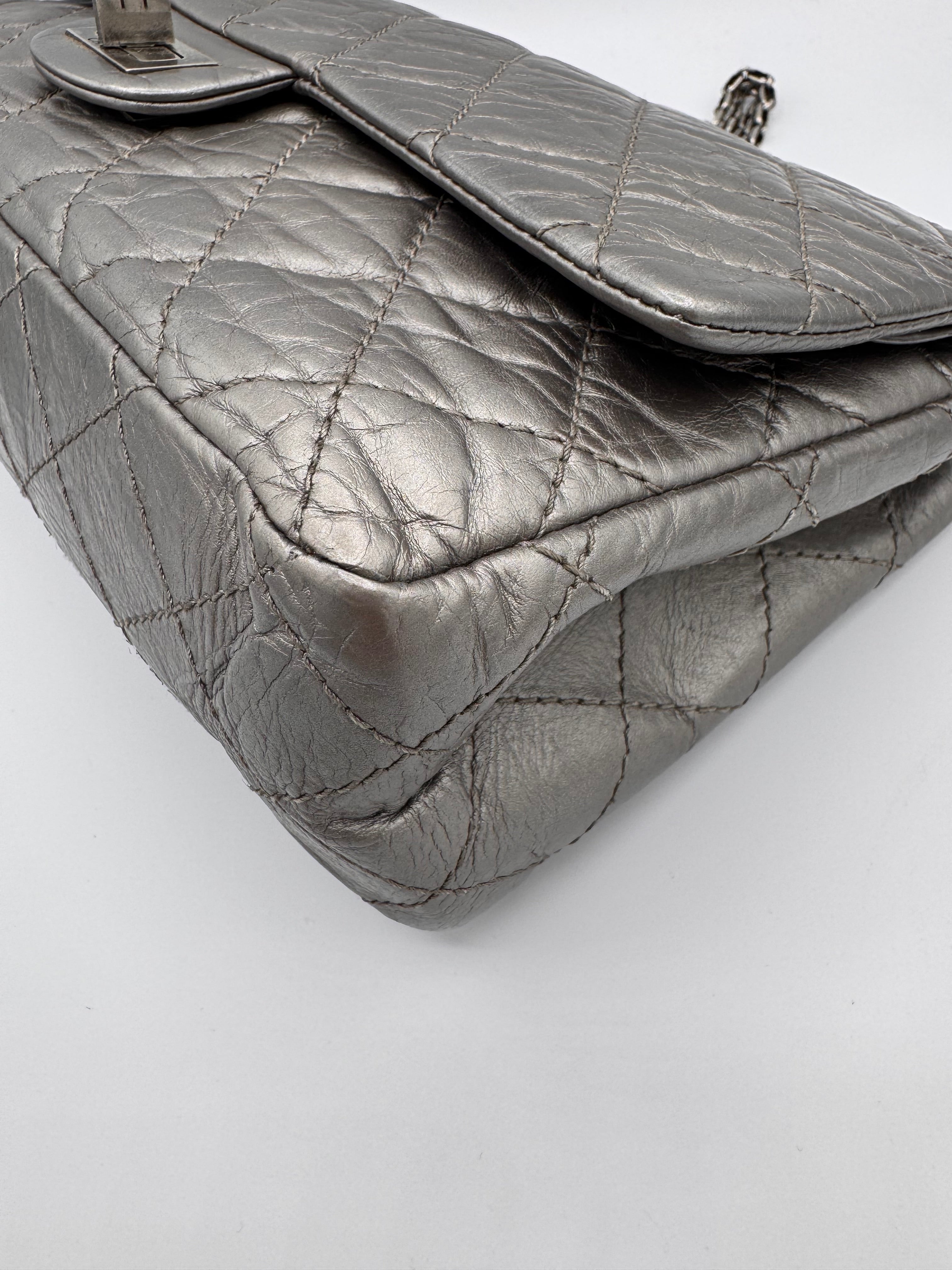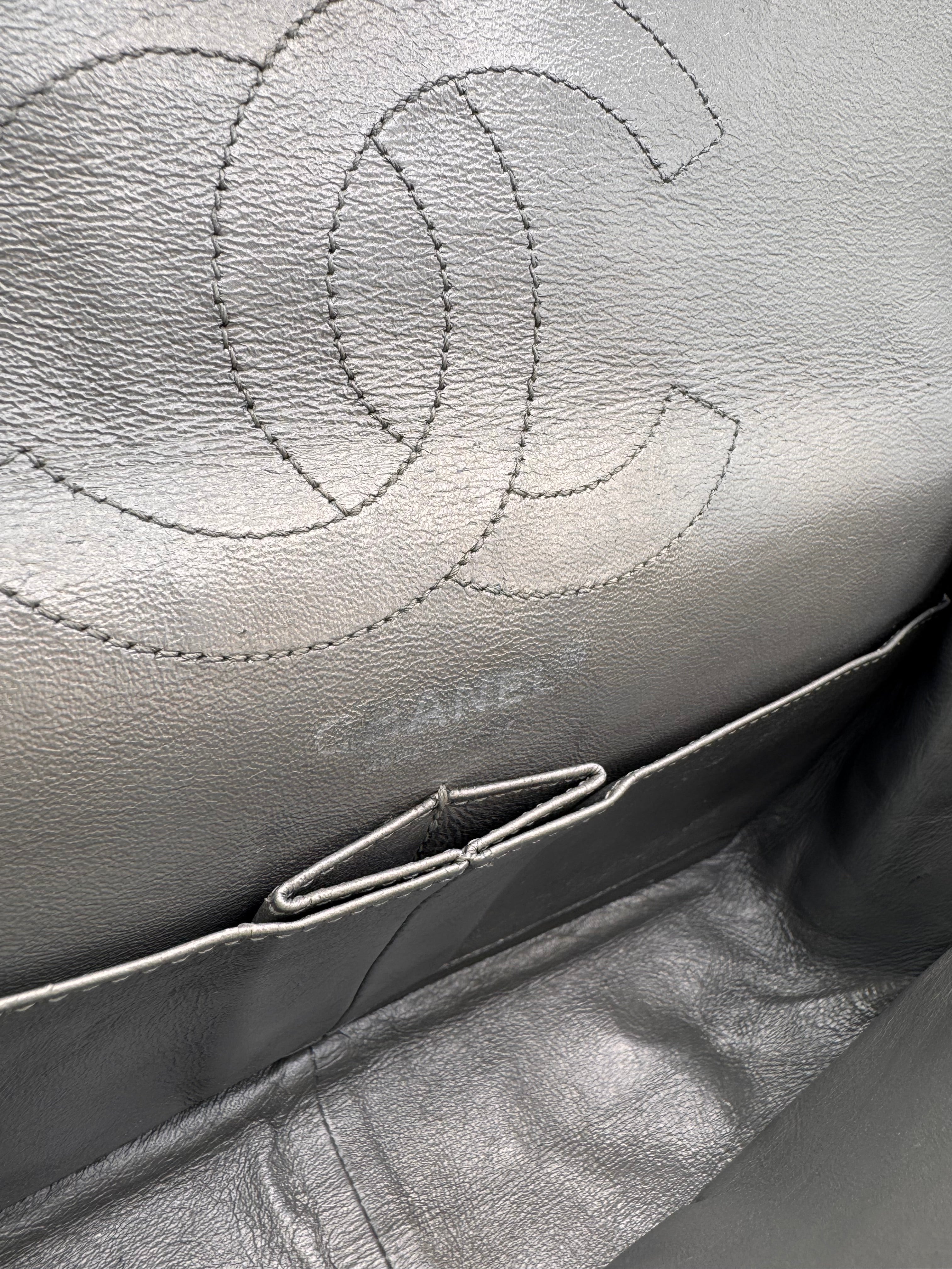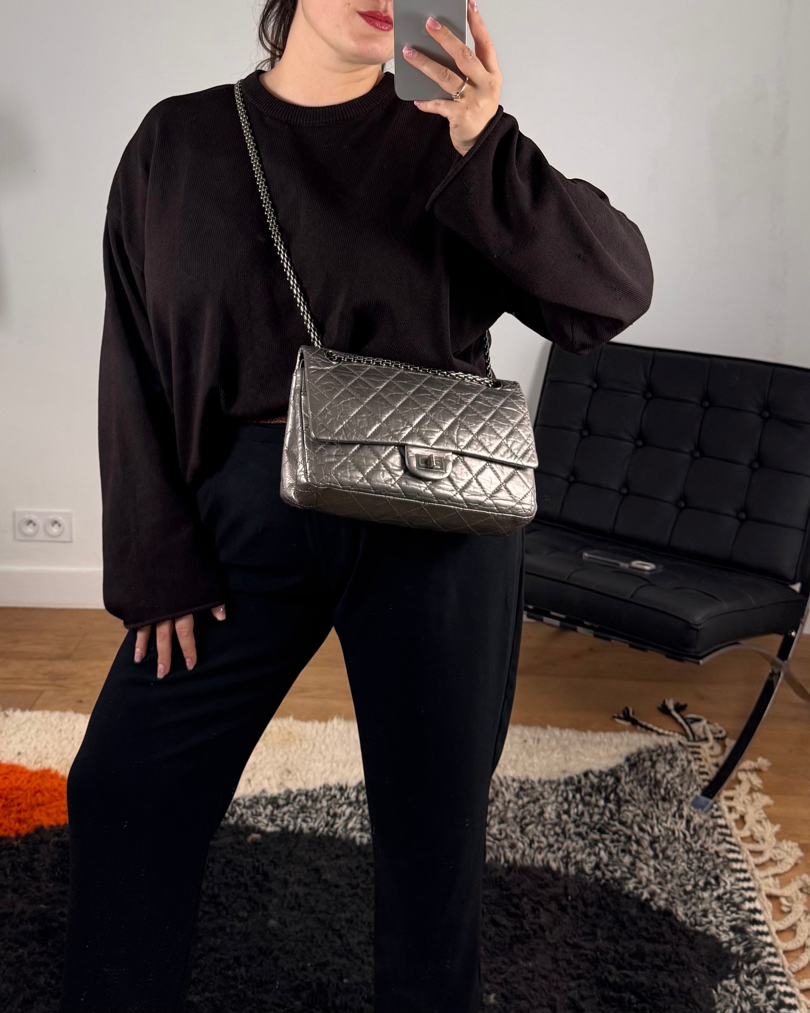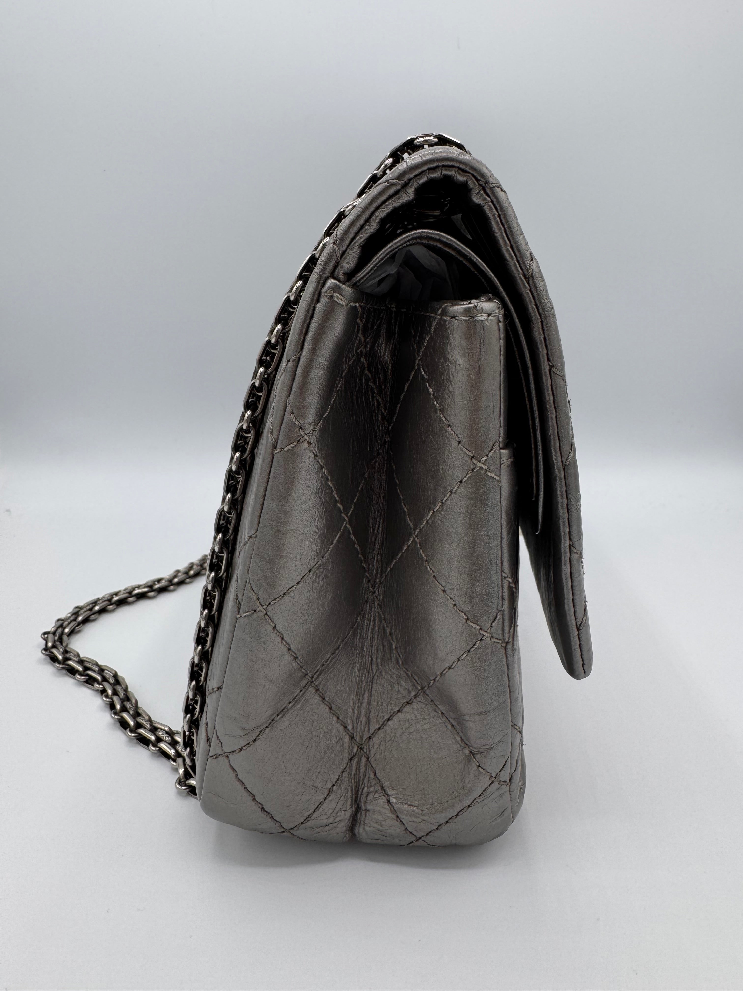 Ce Sac 2.55 double rabat Chanel, Grand en cuir de veau vielli argent et bijouterie argent vielli est en très bon état.
