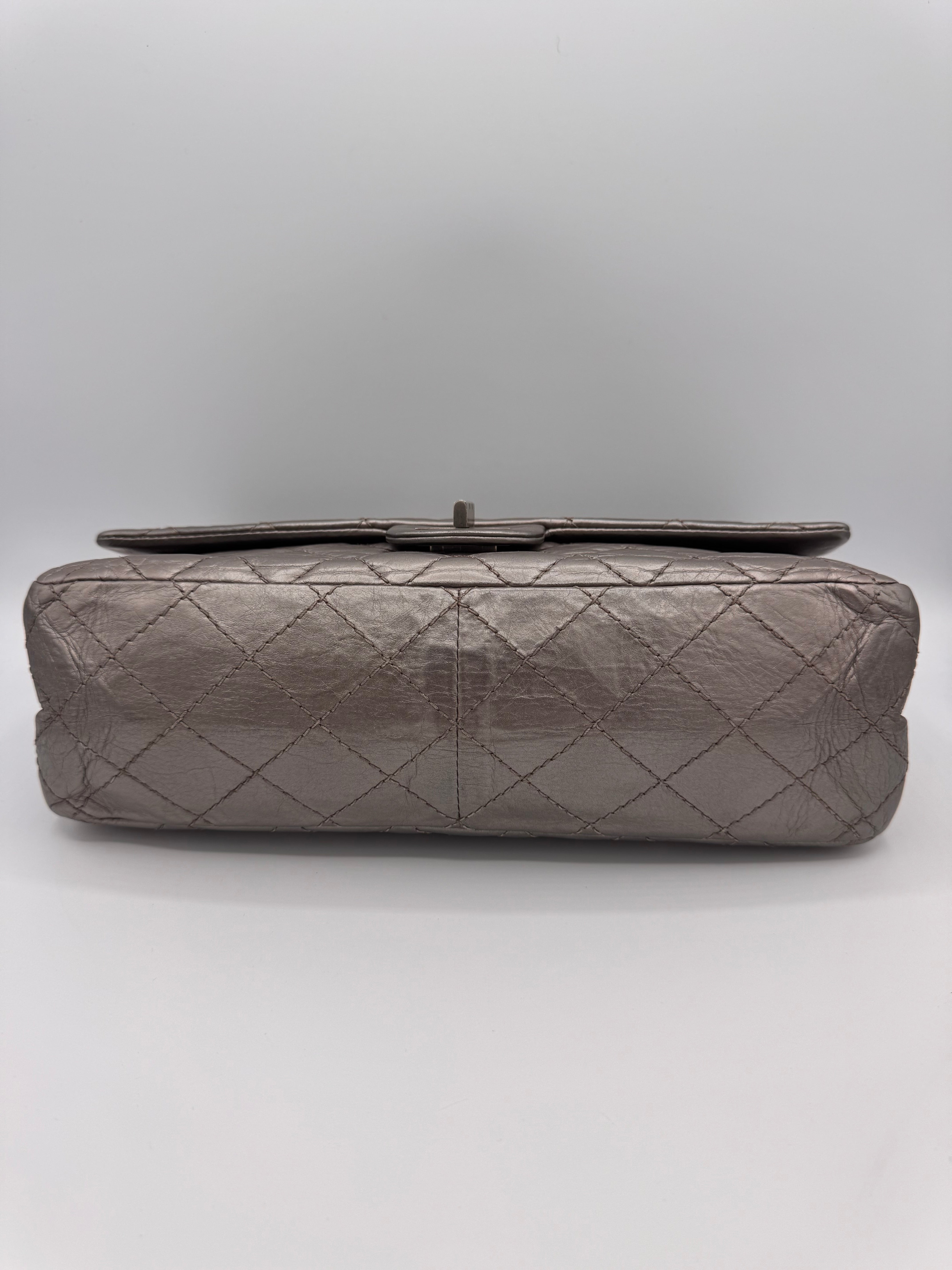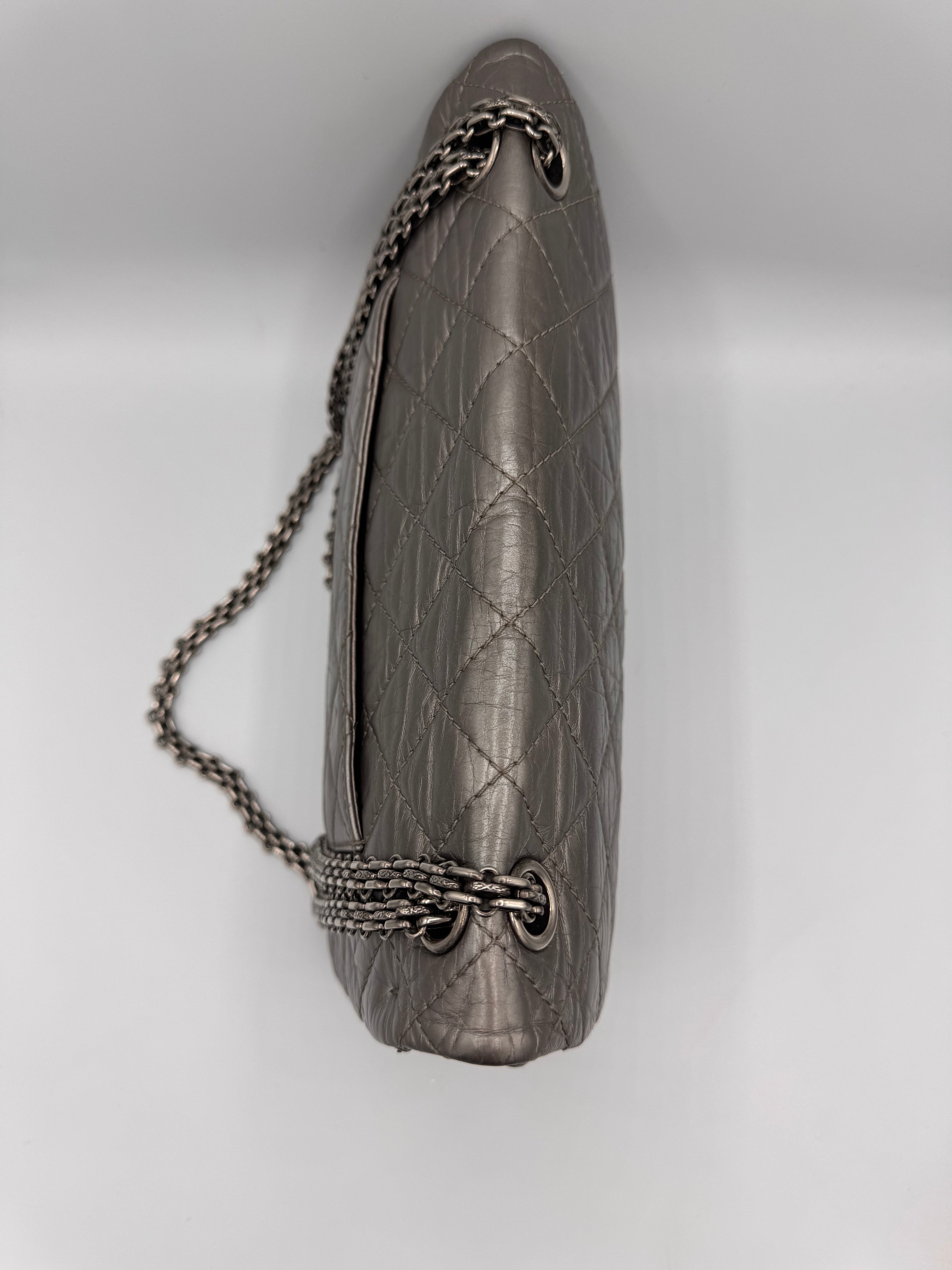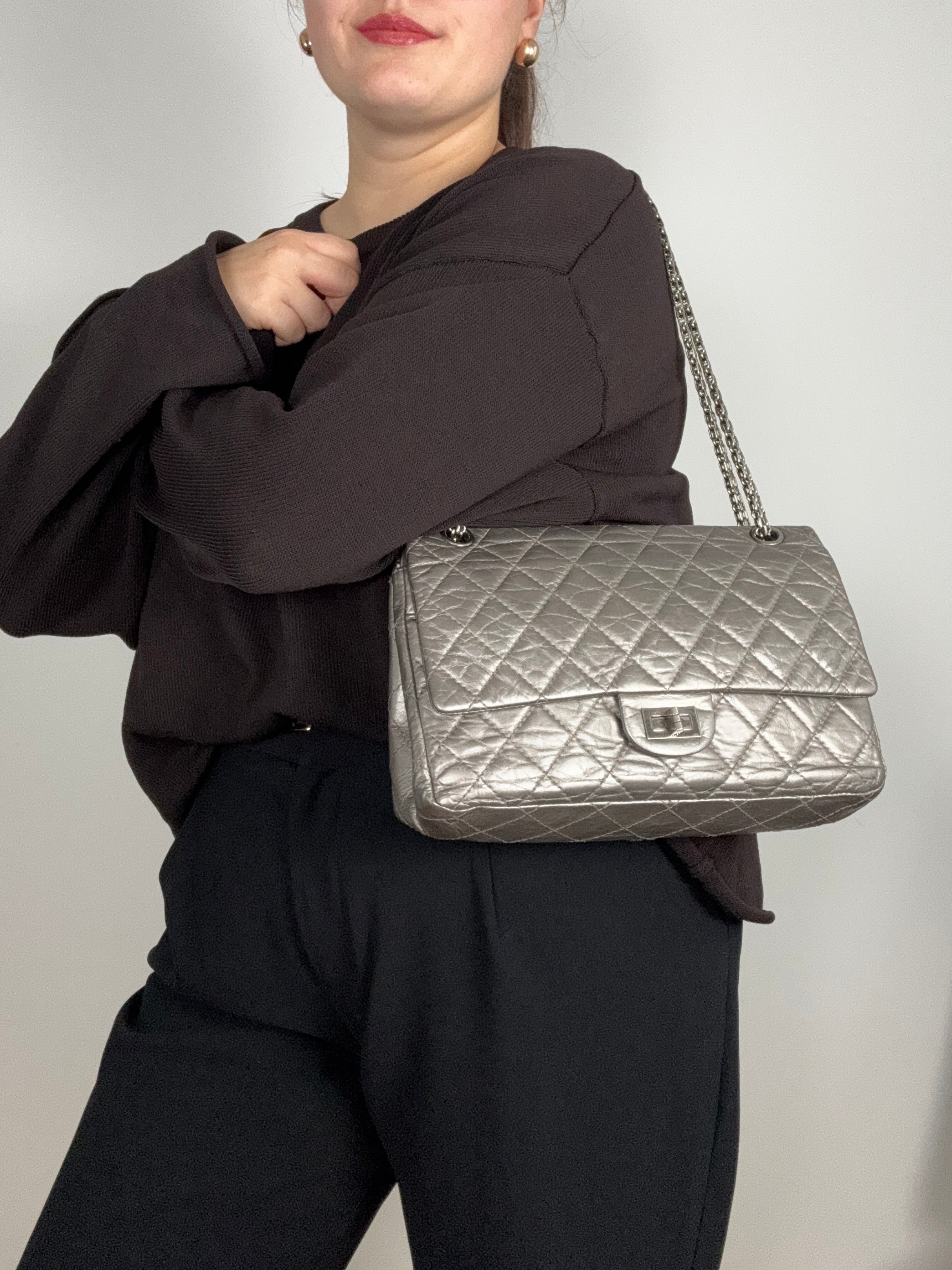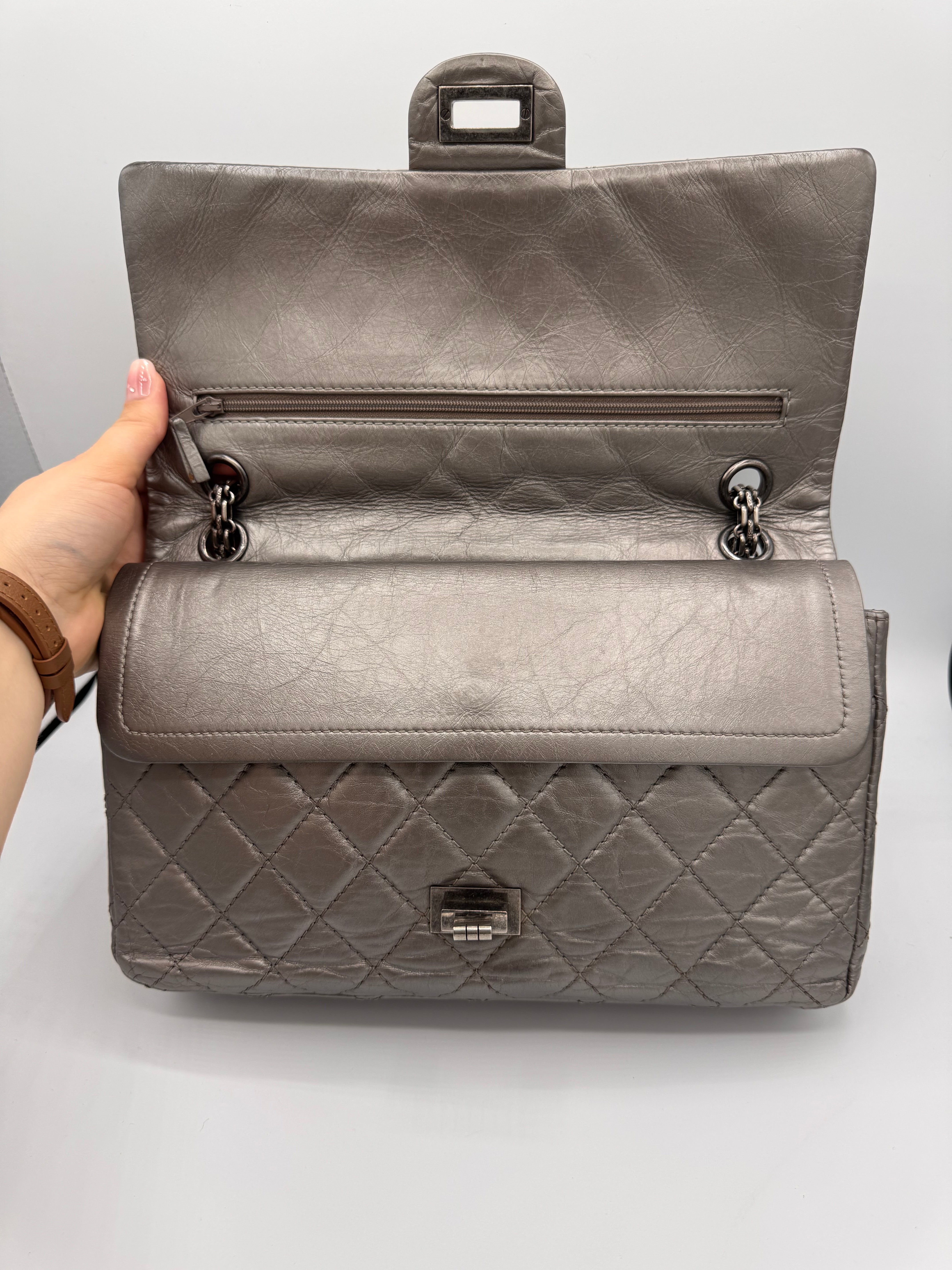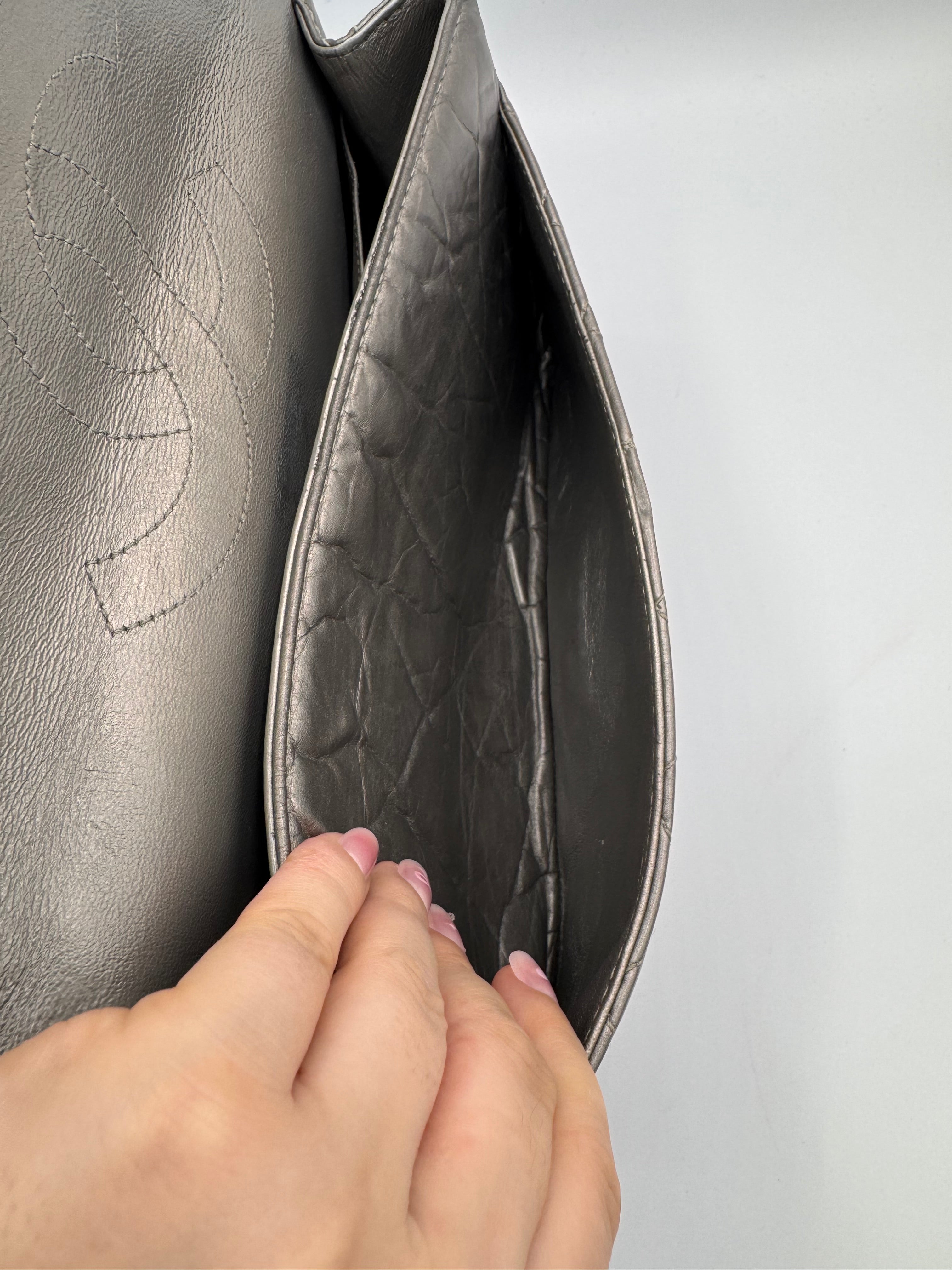 Ce Sac 2.55 double rabat Chanel, Grand en cuir de veau vielli argent et bijouterie argent vielli est en très bon état.