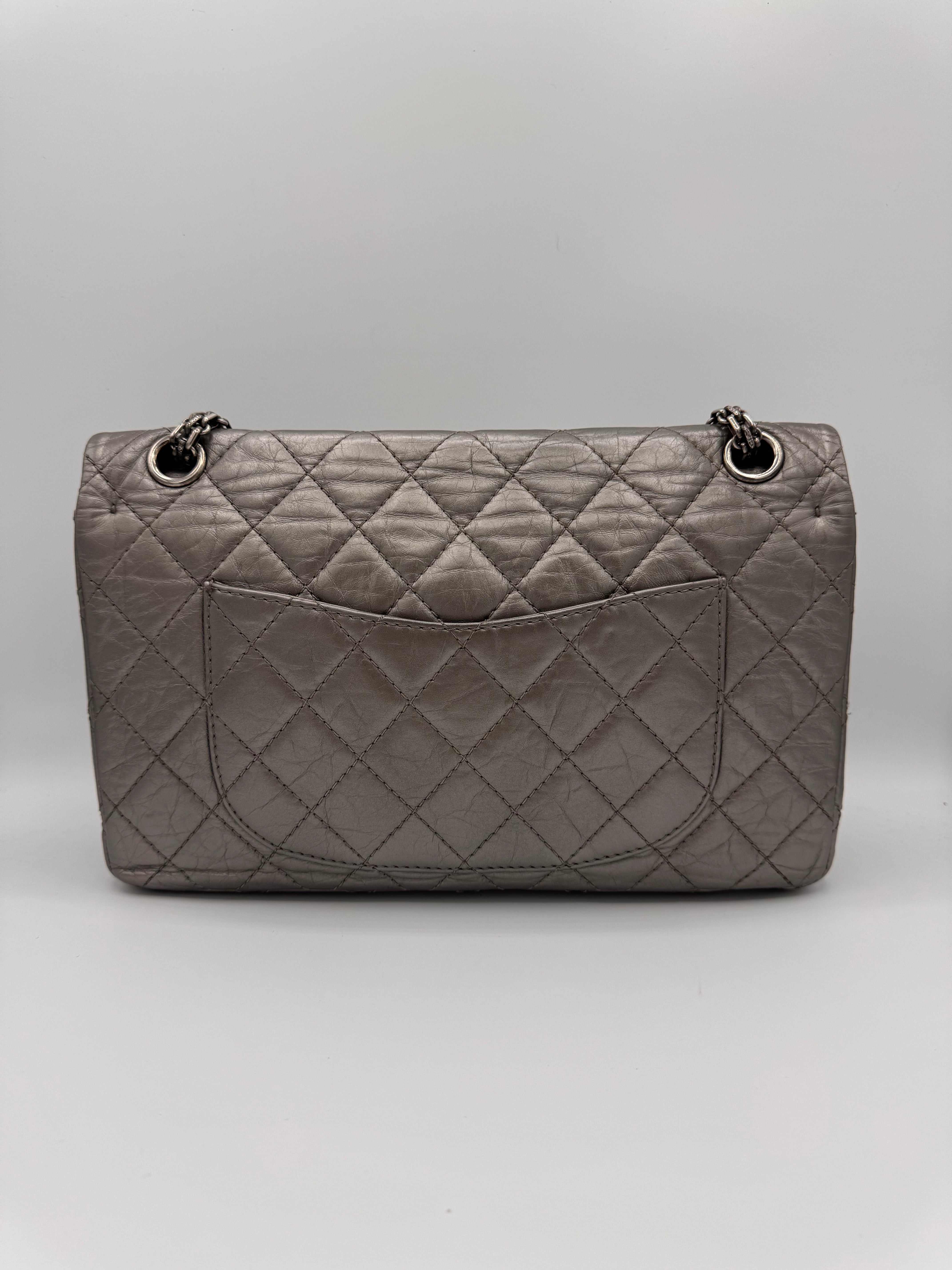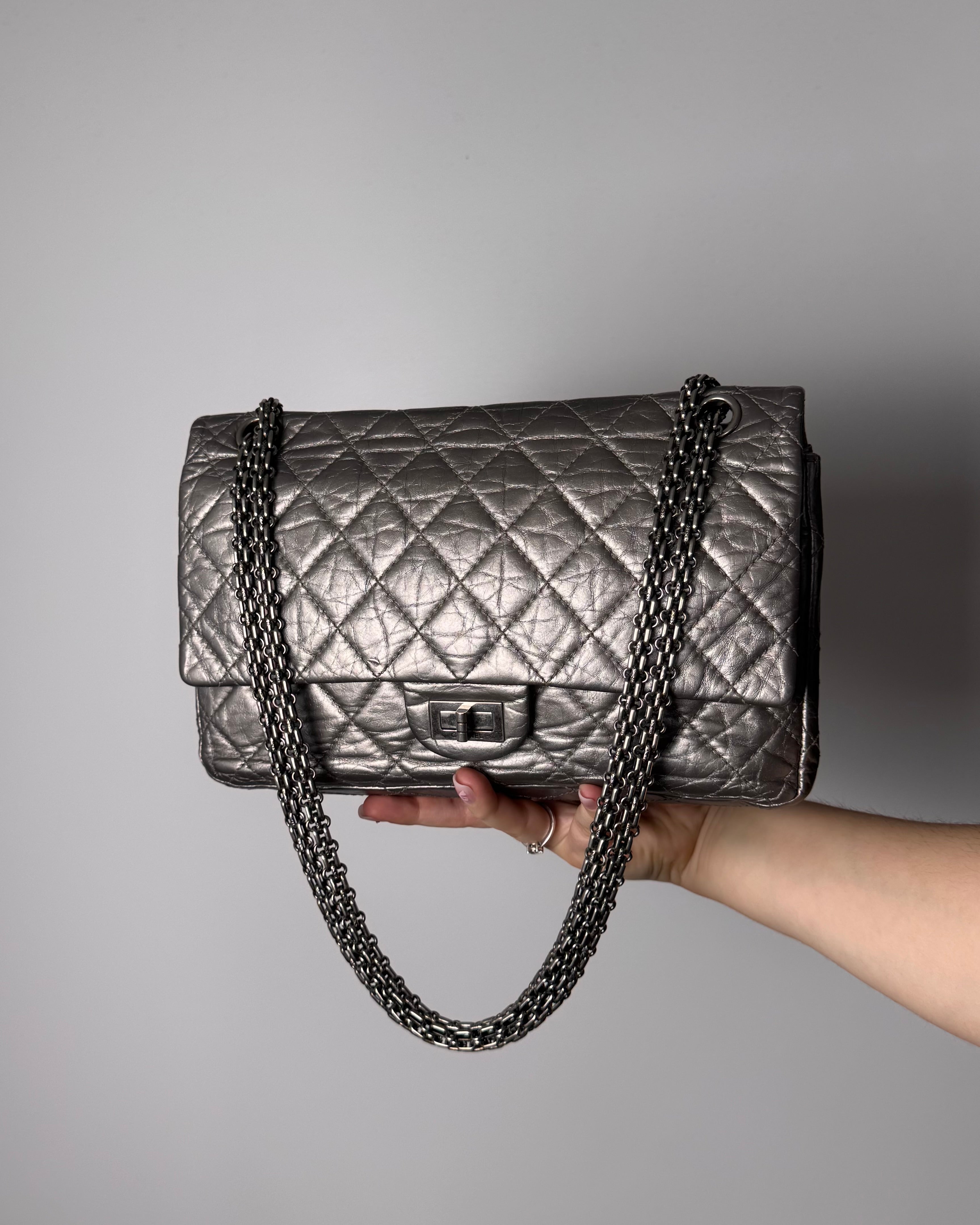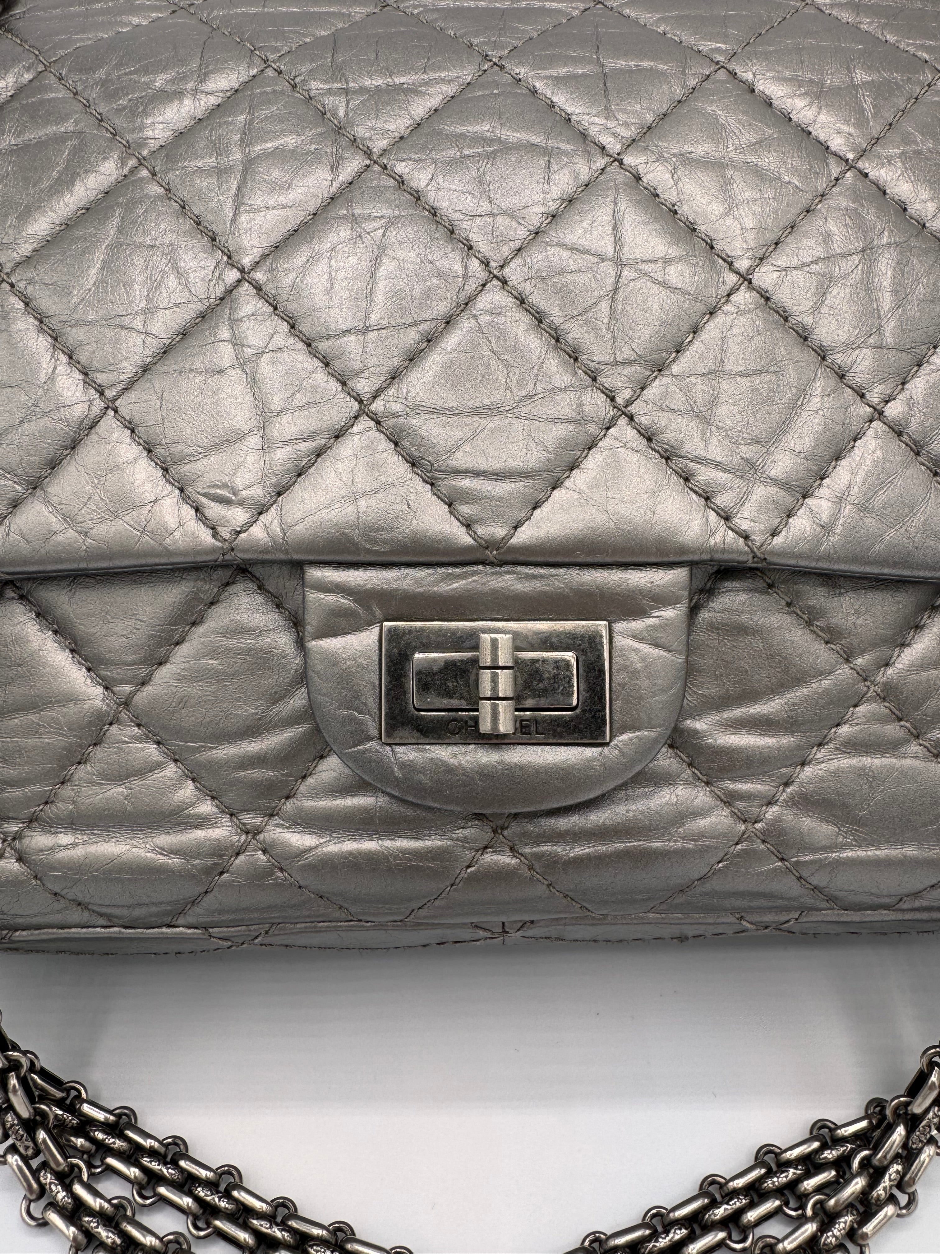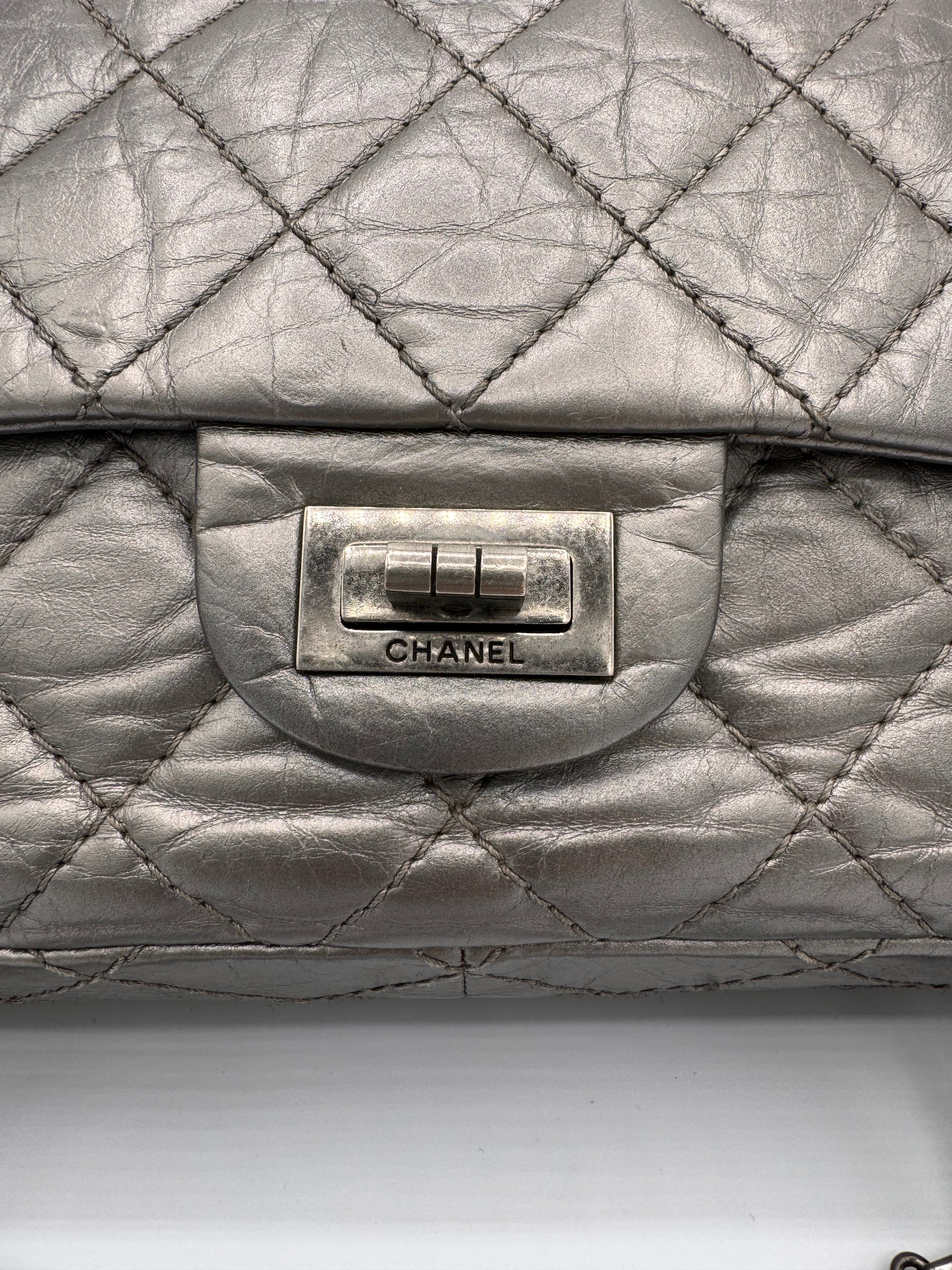Ce Sac 2.55 double rabat Chanel, Grand en cuir de veau vielli argent et bijouterie argent vielli est en très bon état.