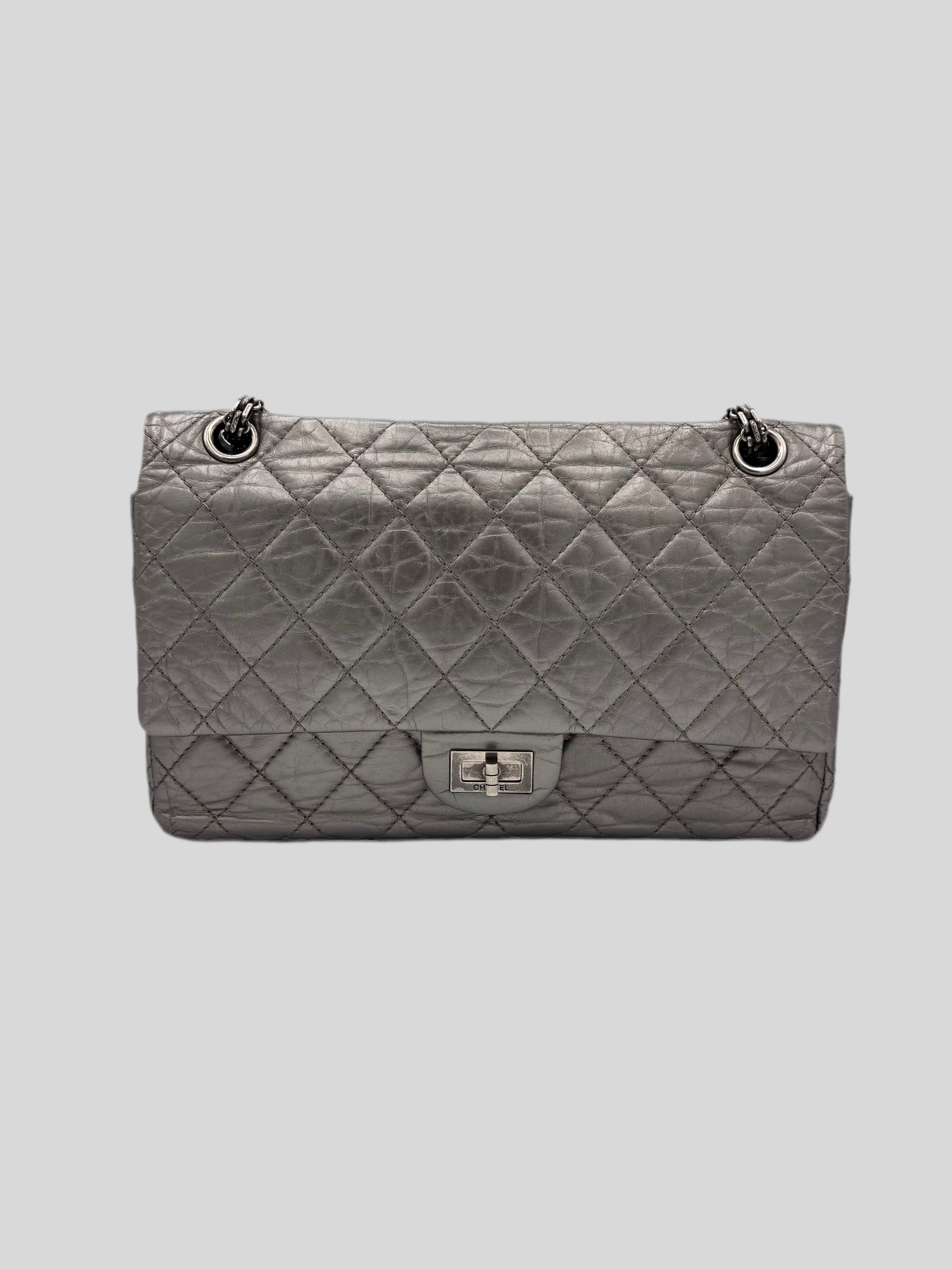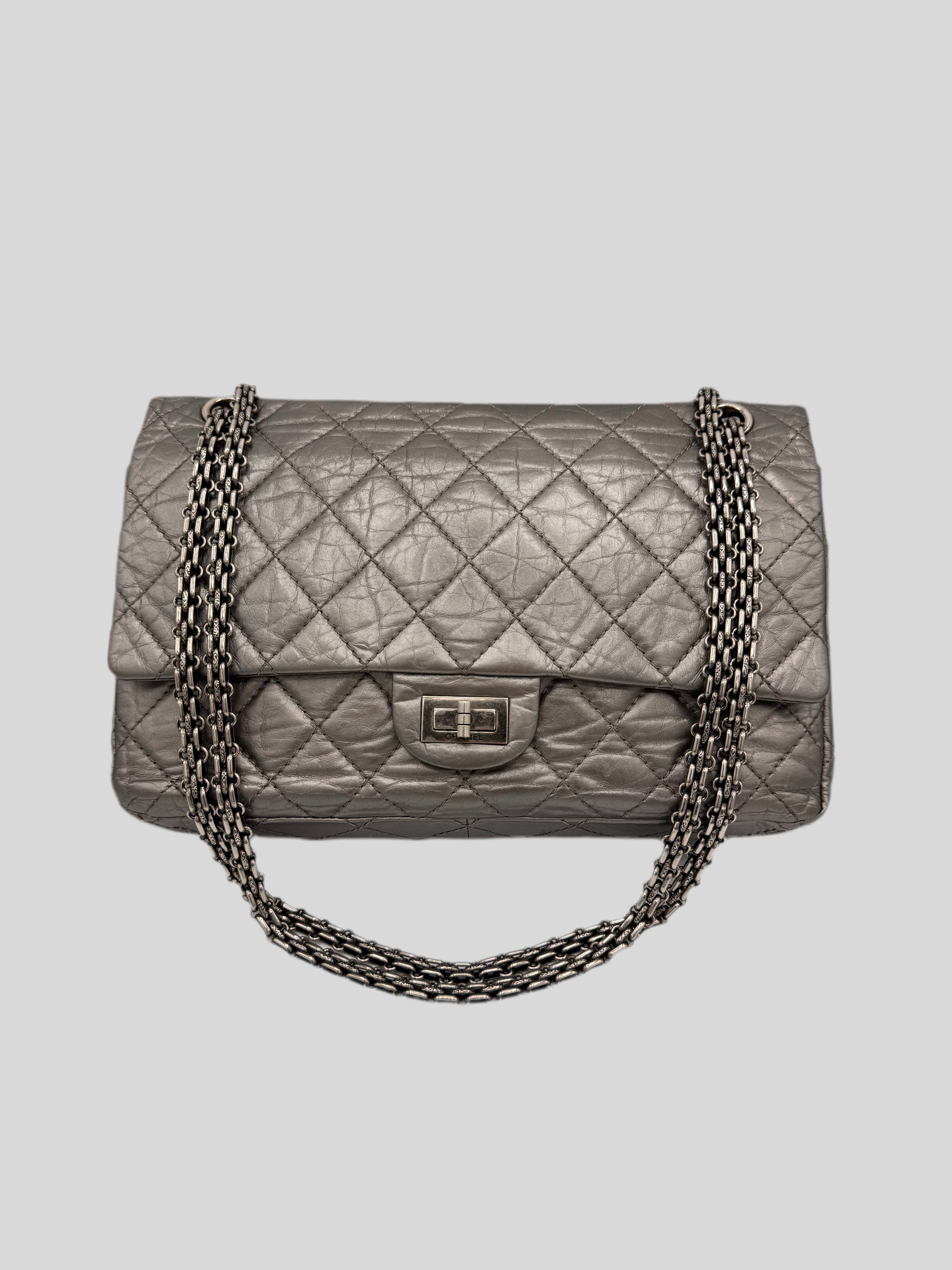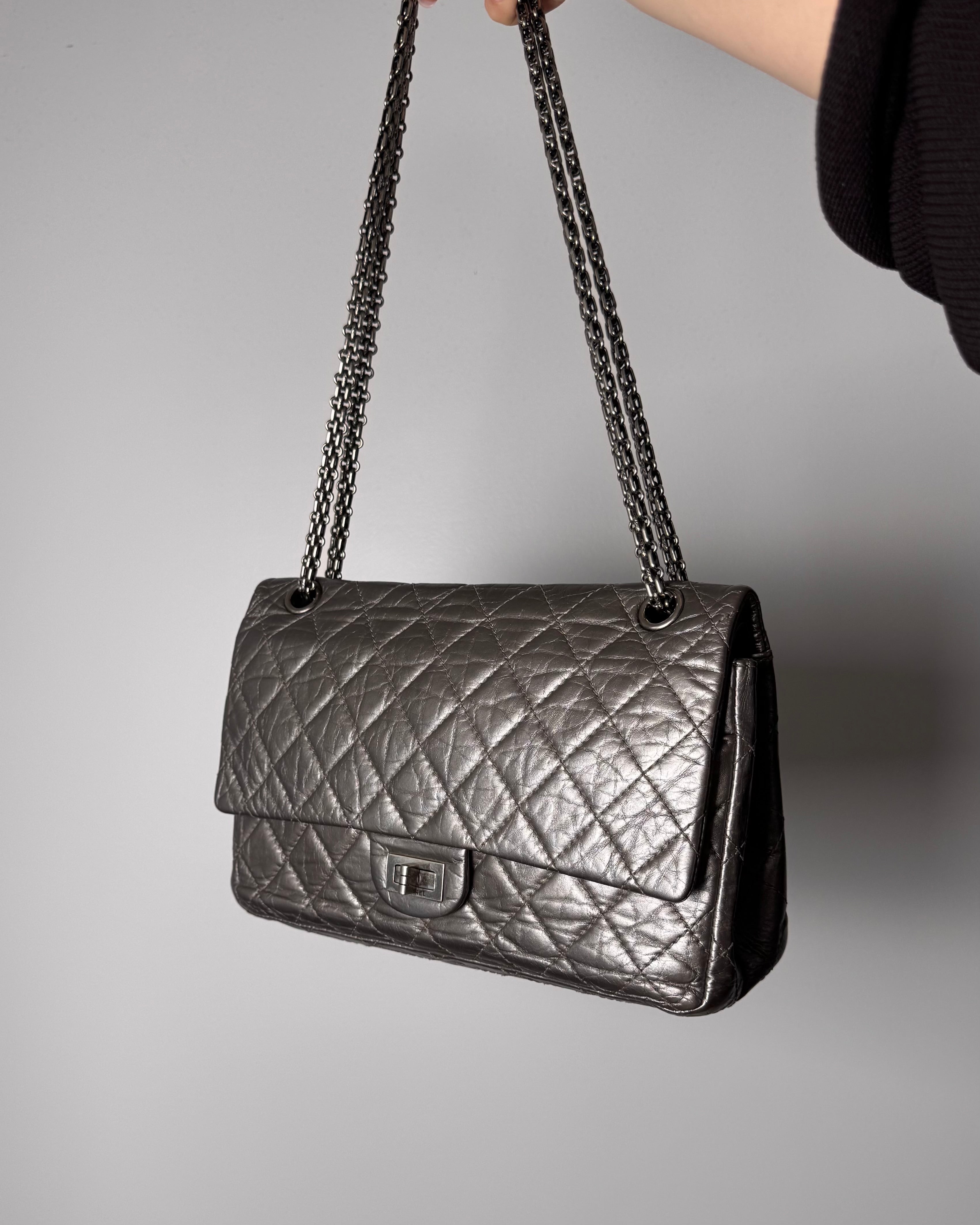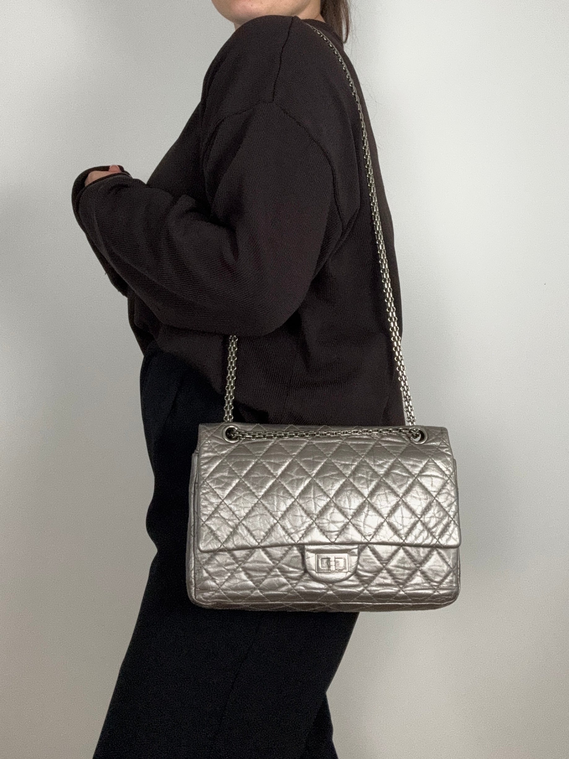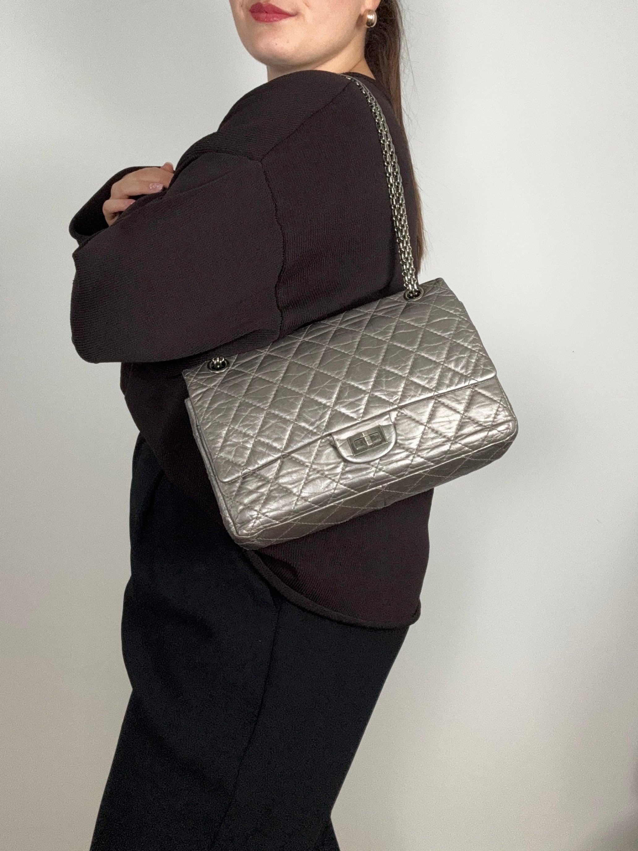 Ce Sac 2.55 double rabat Chanel, Grand en cuir de veau vielli argent et bijouterie argent vielli est en très bon état.