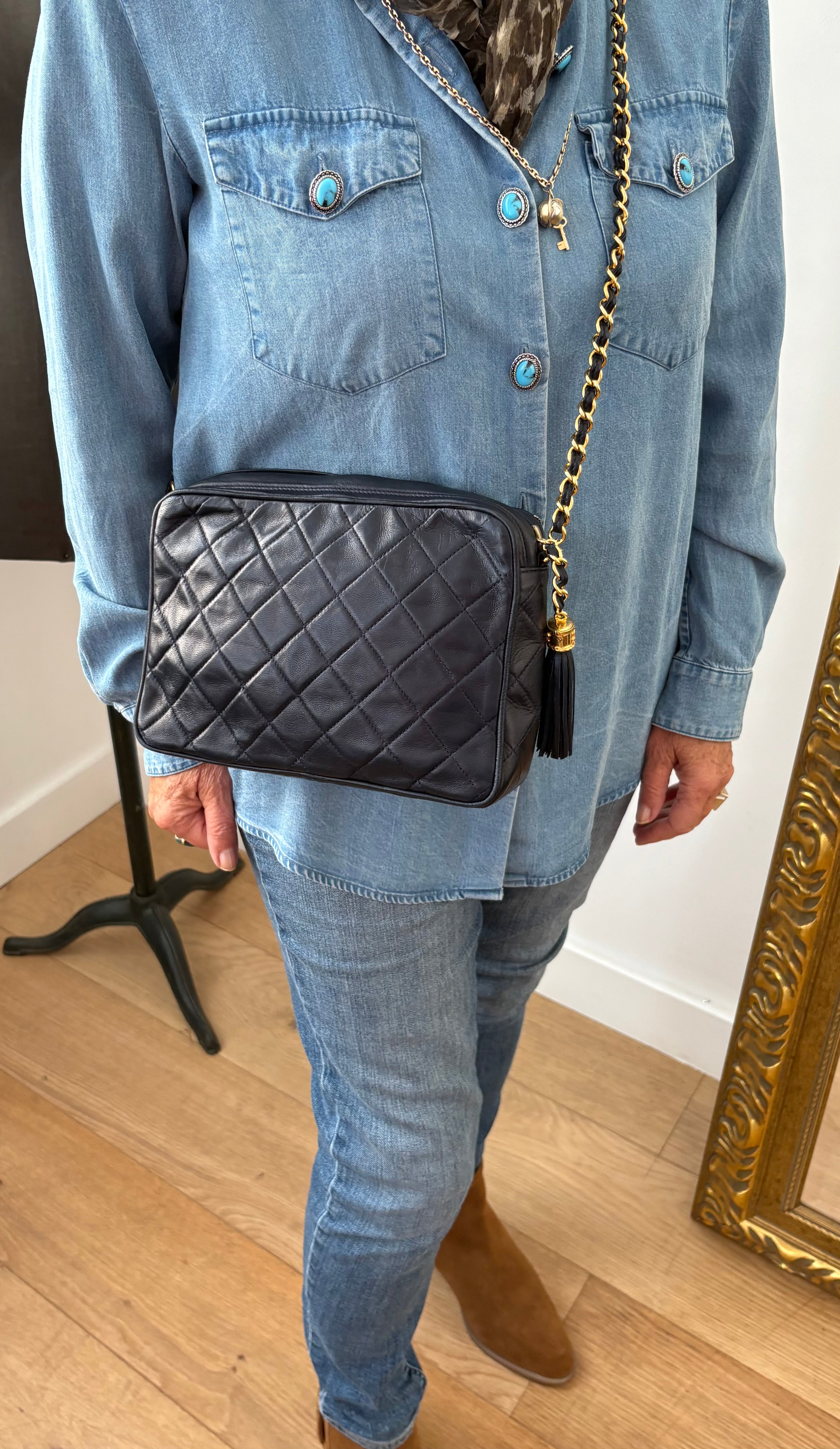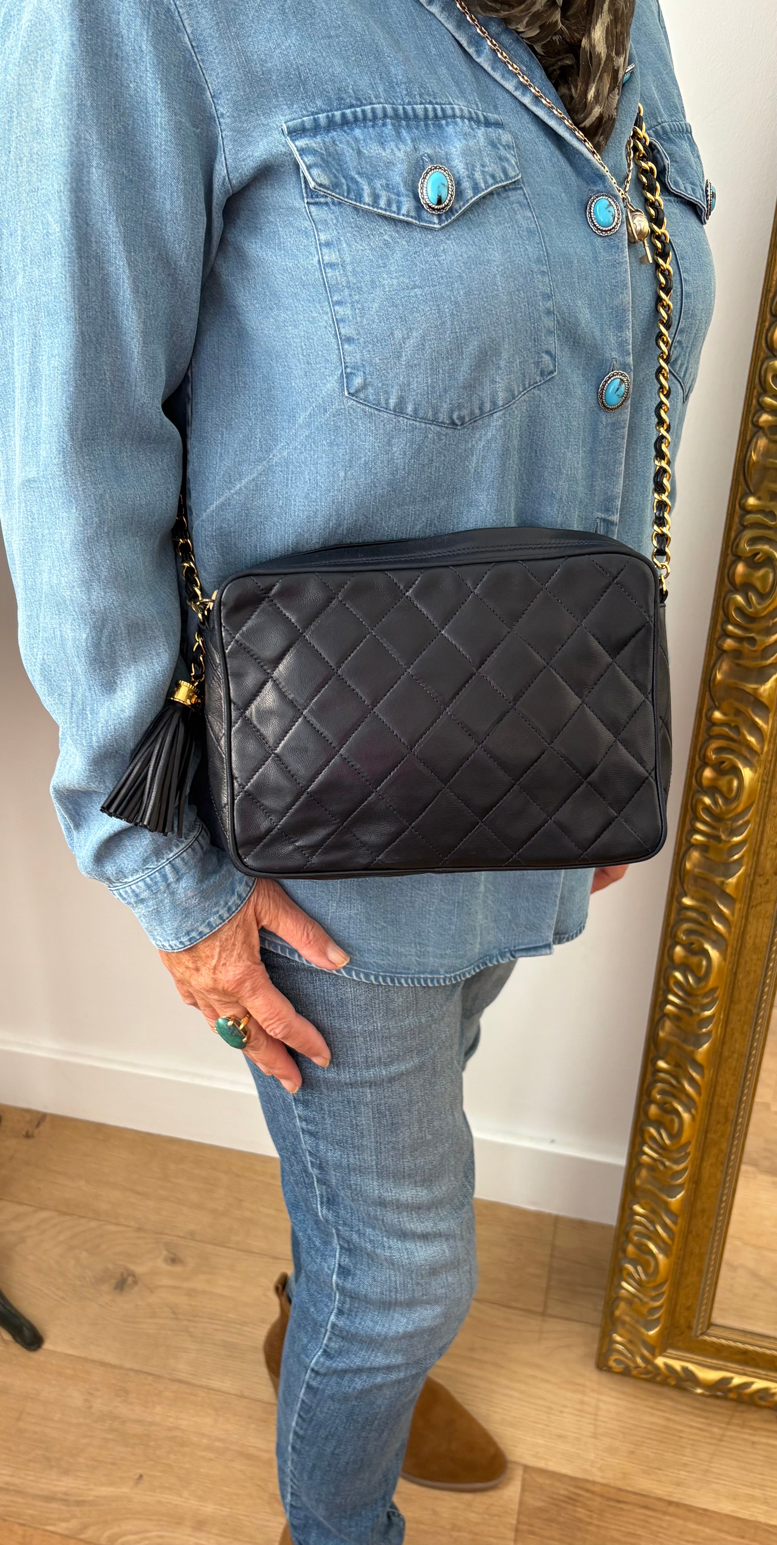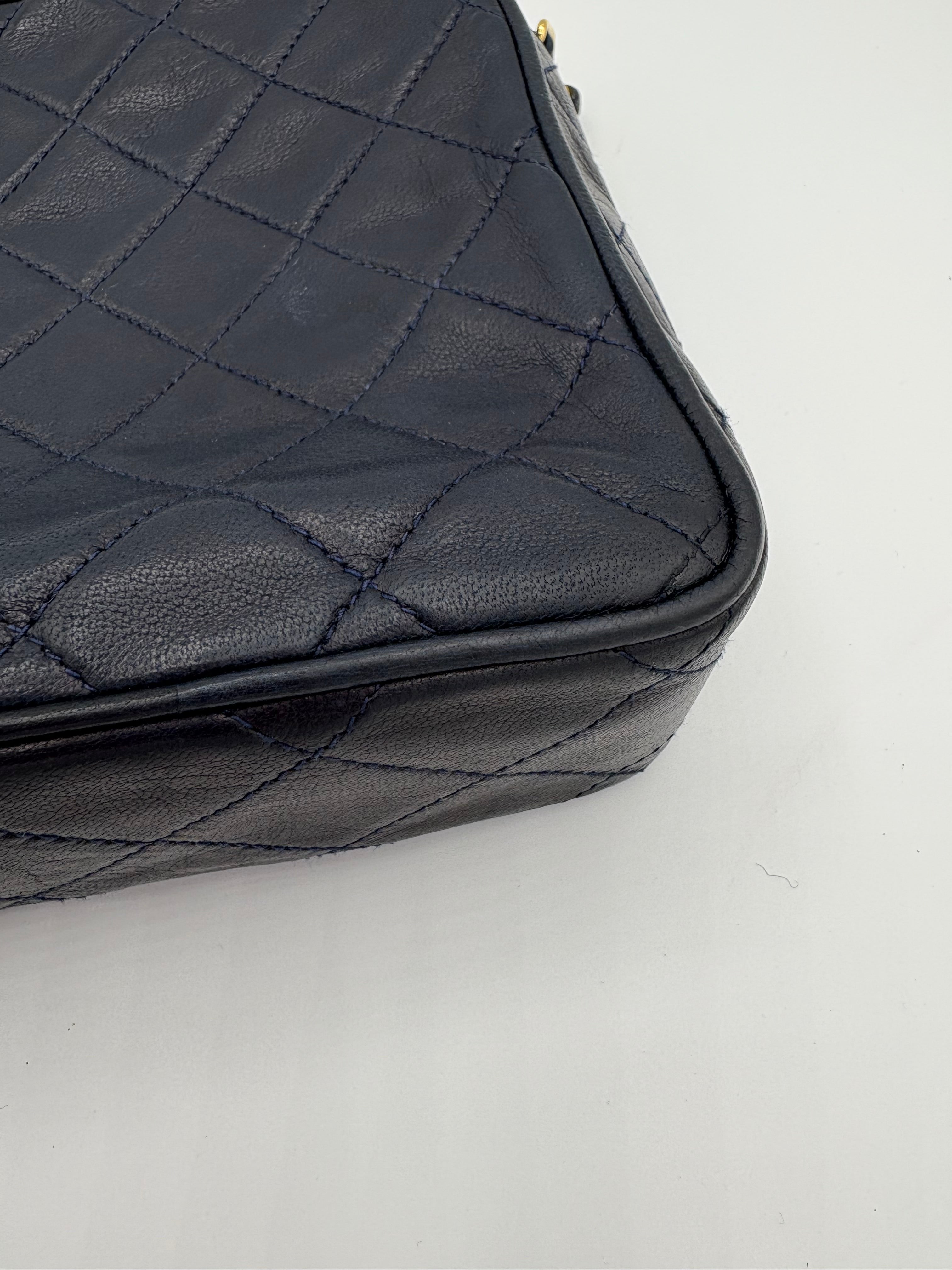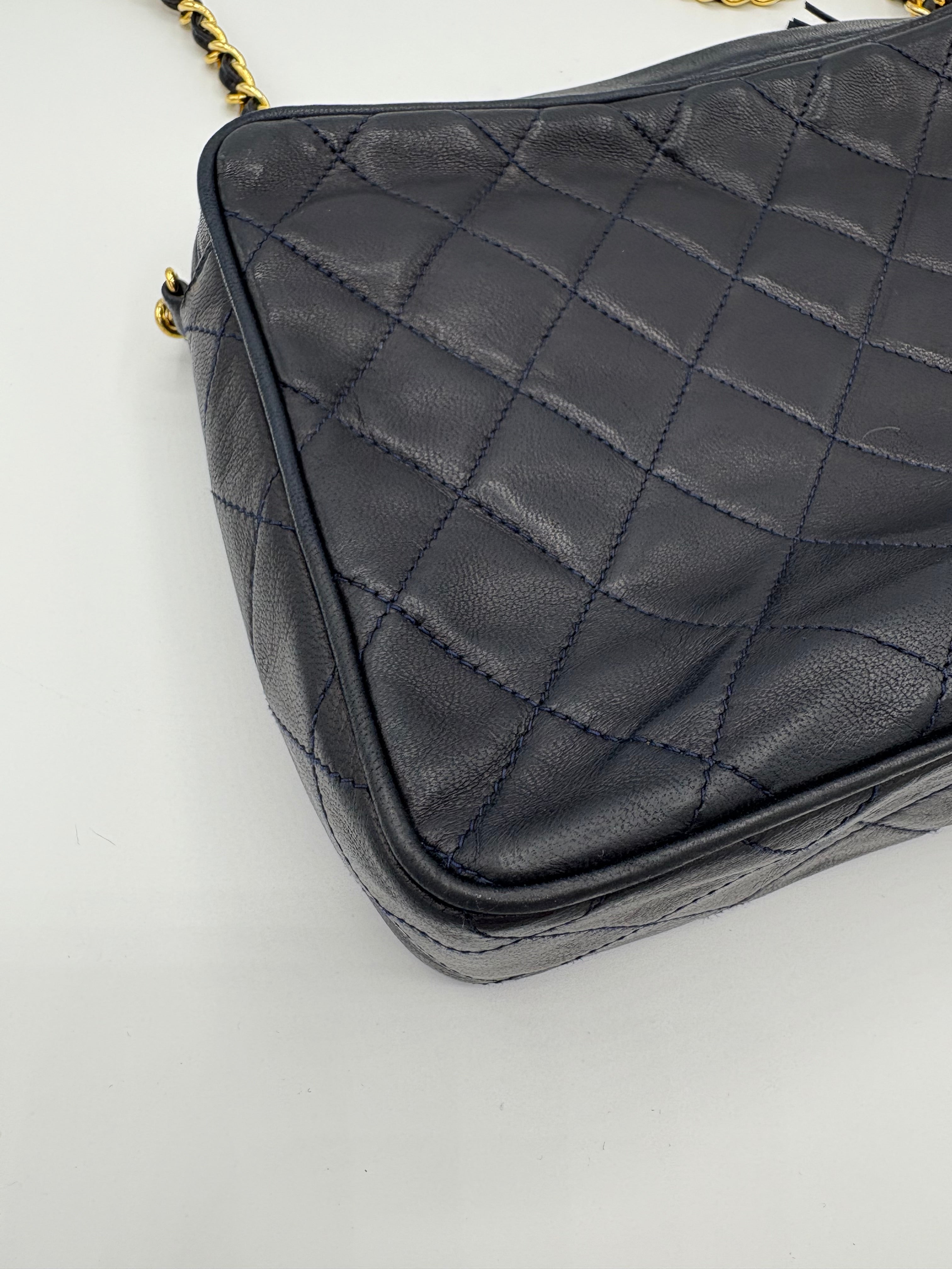 Sac caméra vintage marine très foncé en très bon état général. Présence du pompon Chanel.