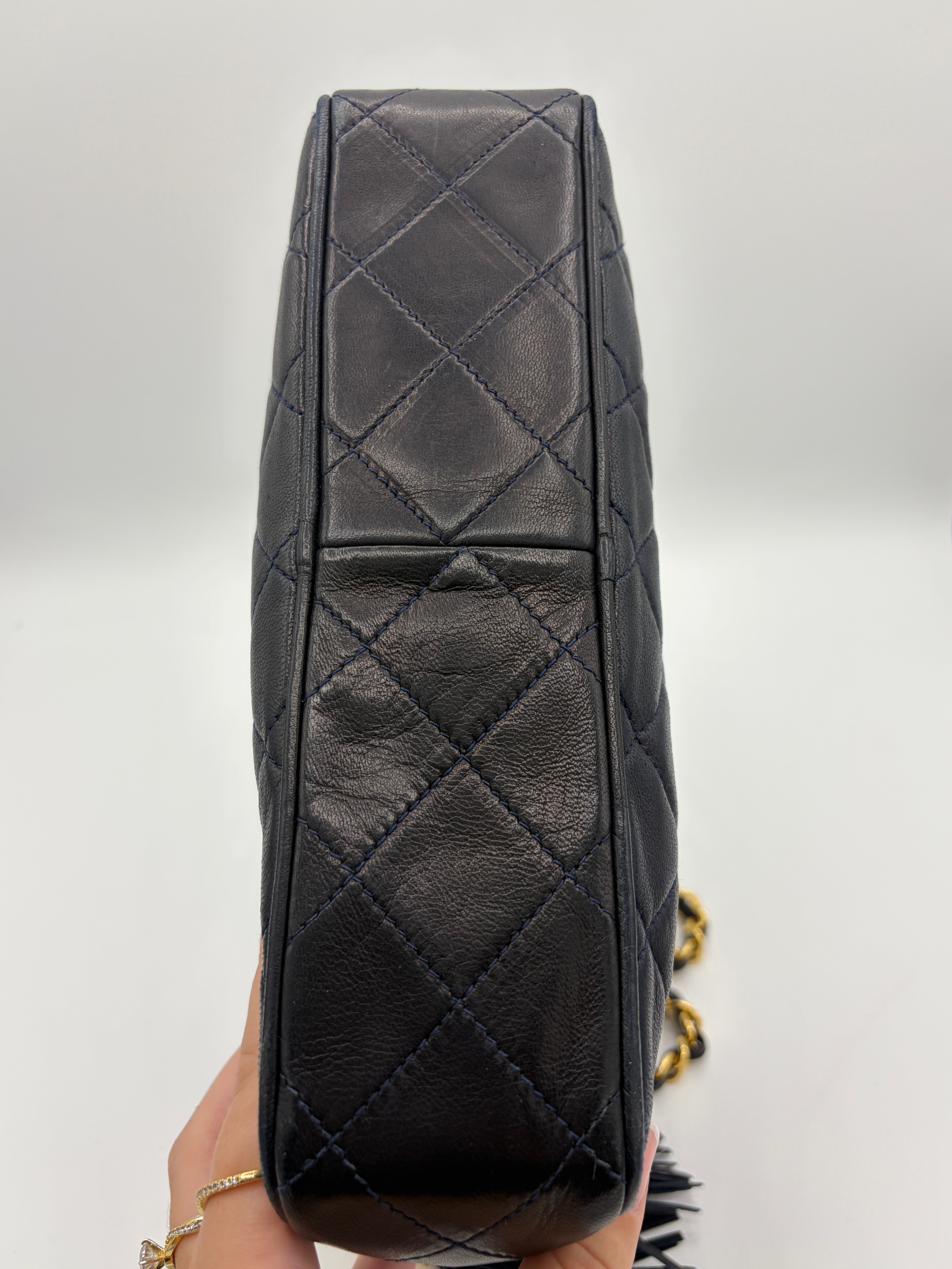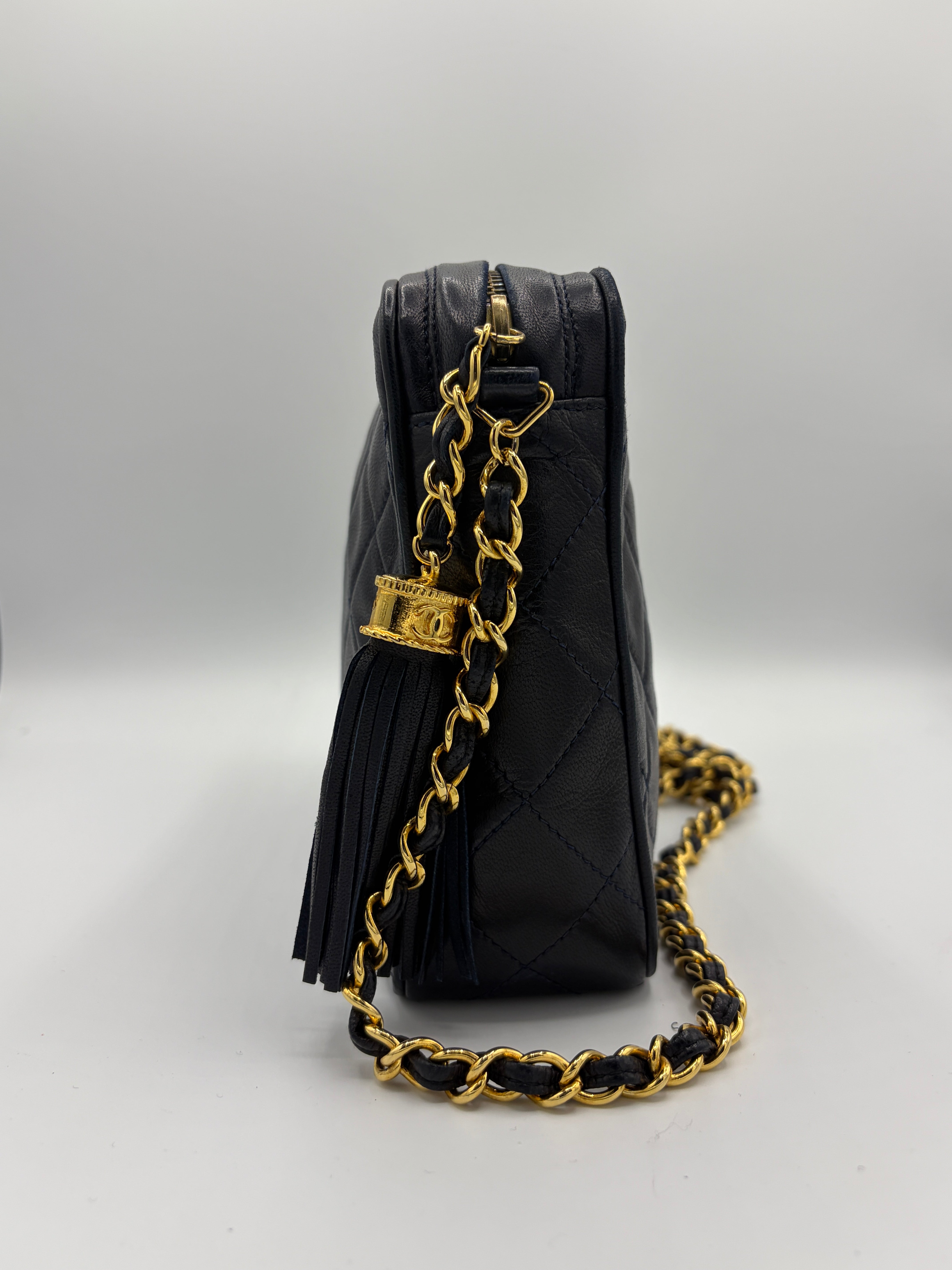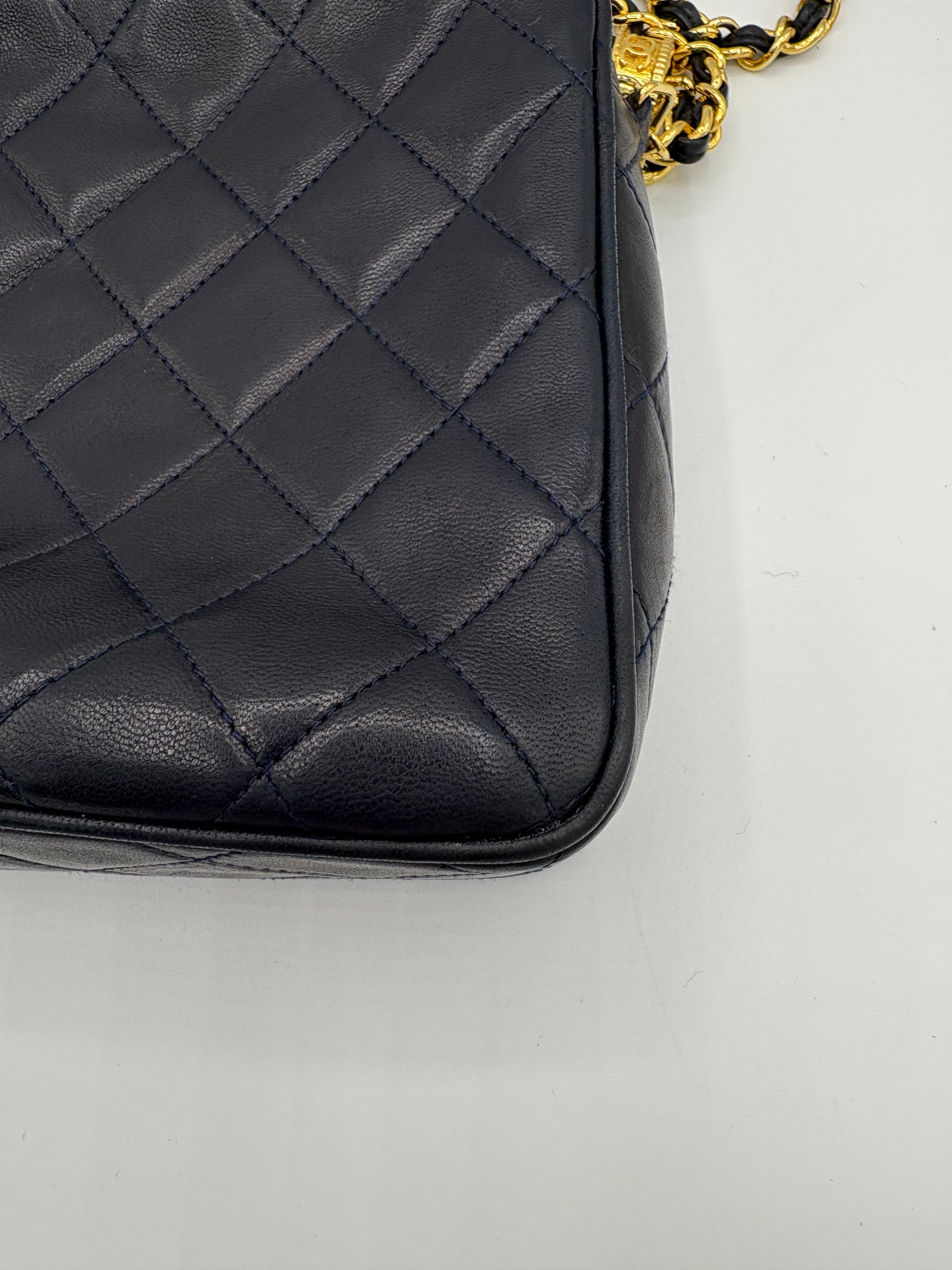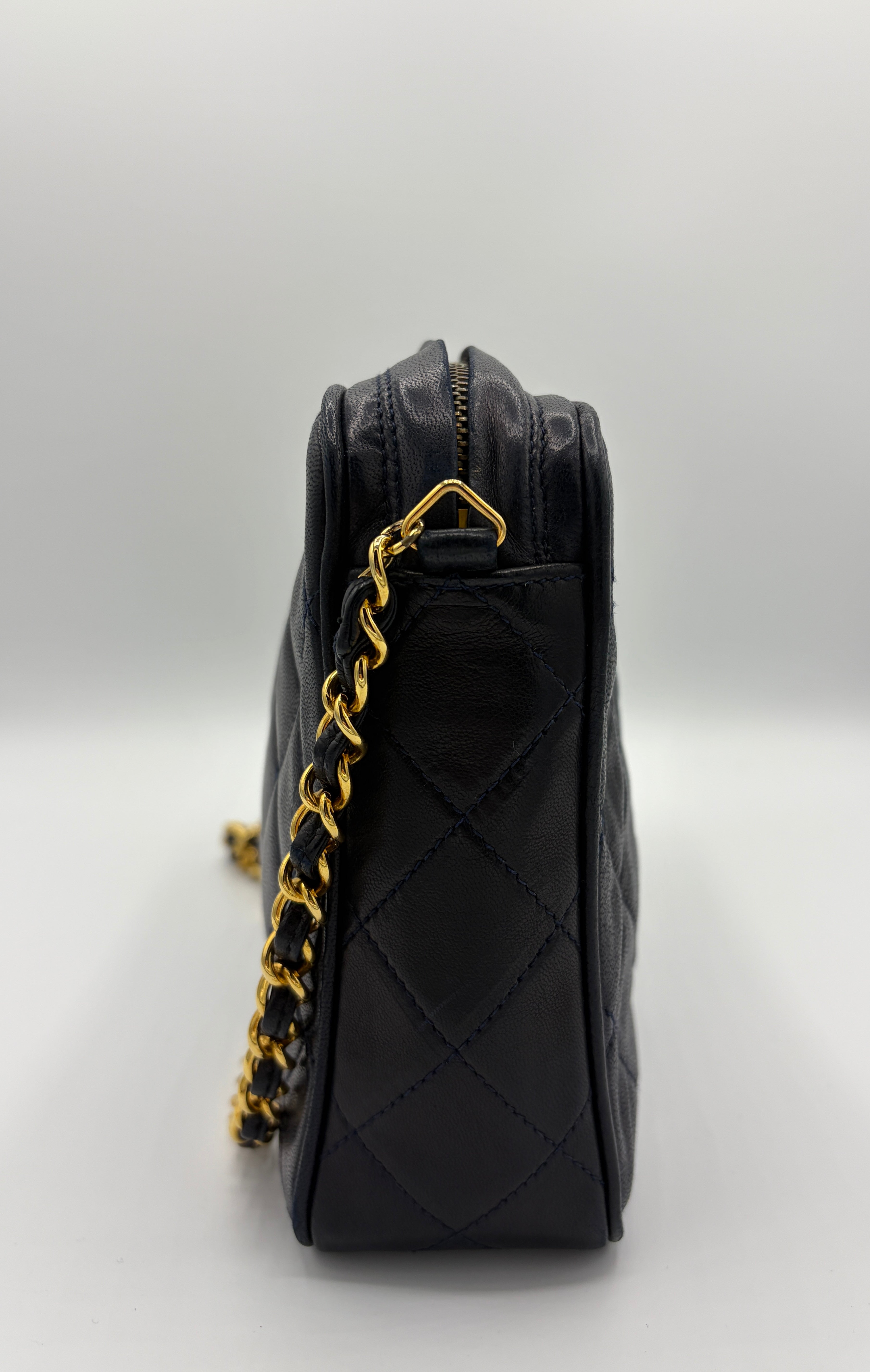 Sac caméra vintage marine très foncé en très bon état général. Présence du pompon Chanel.