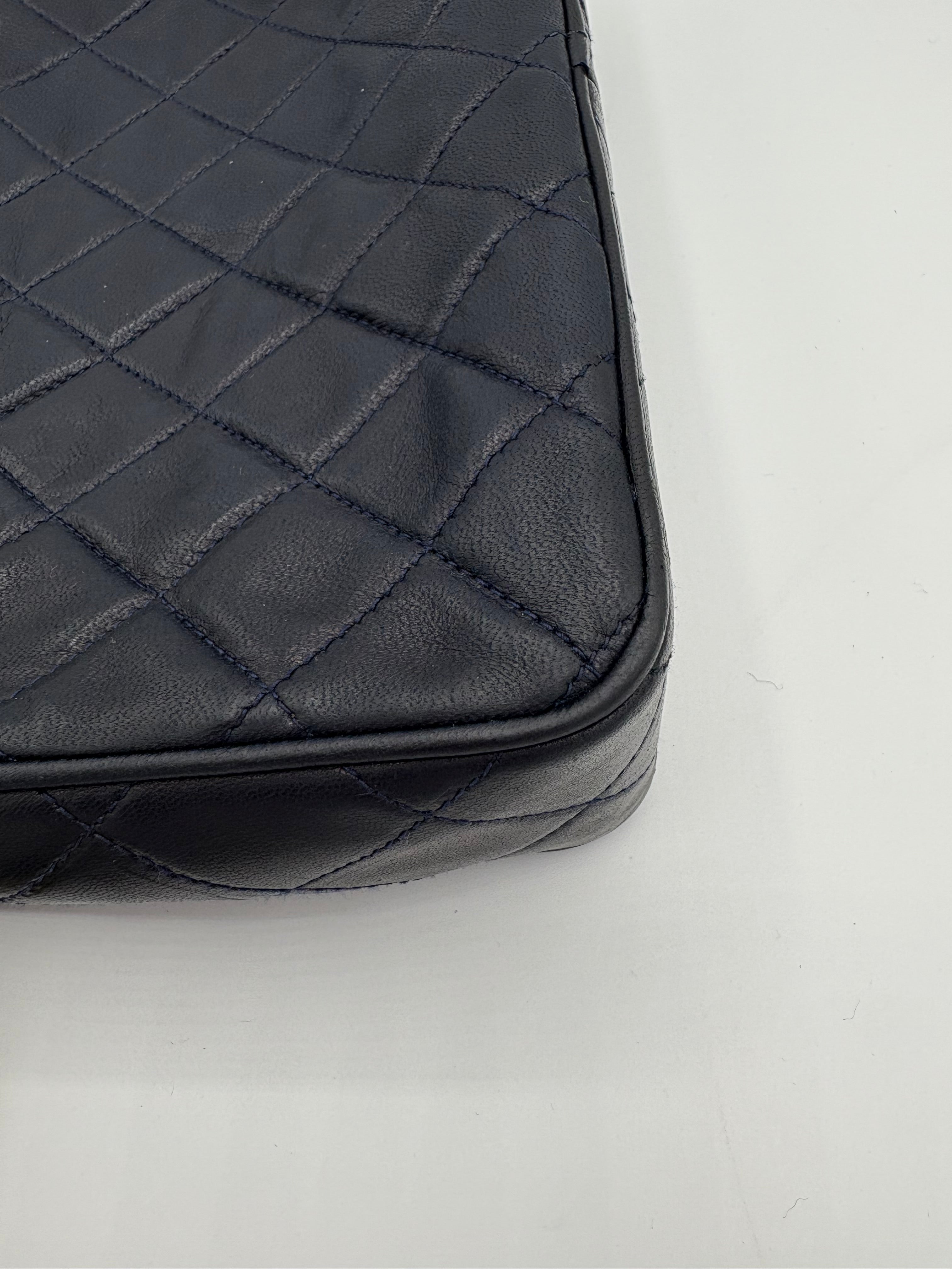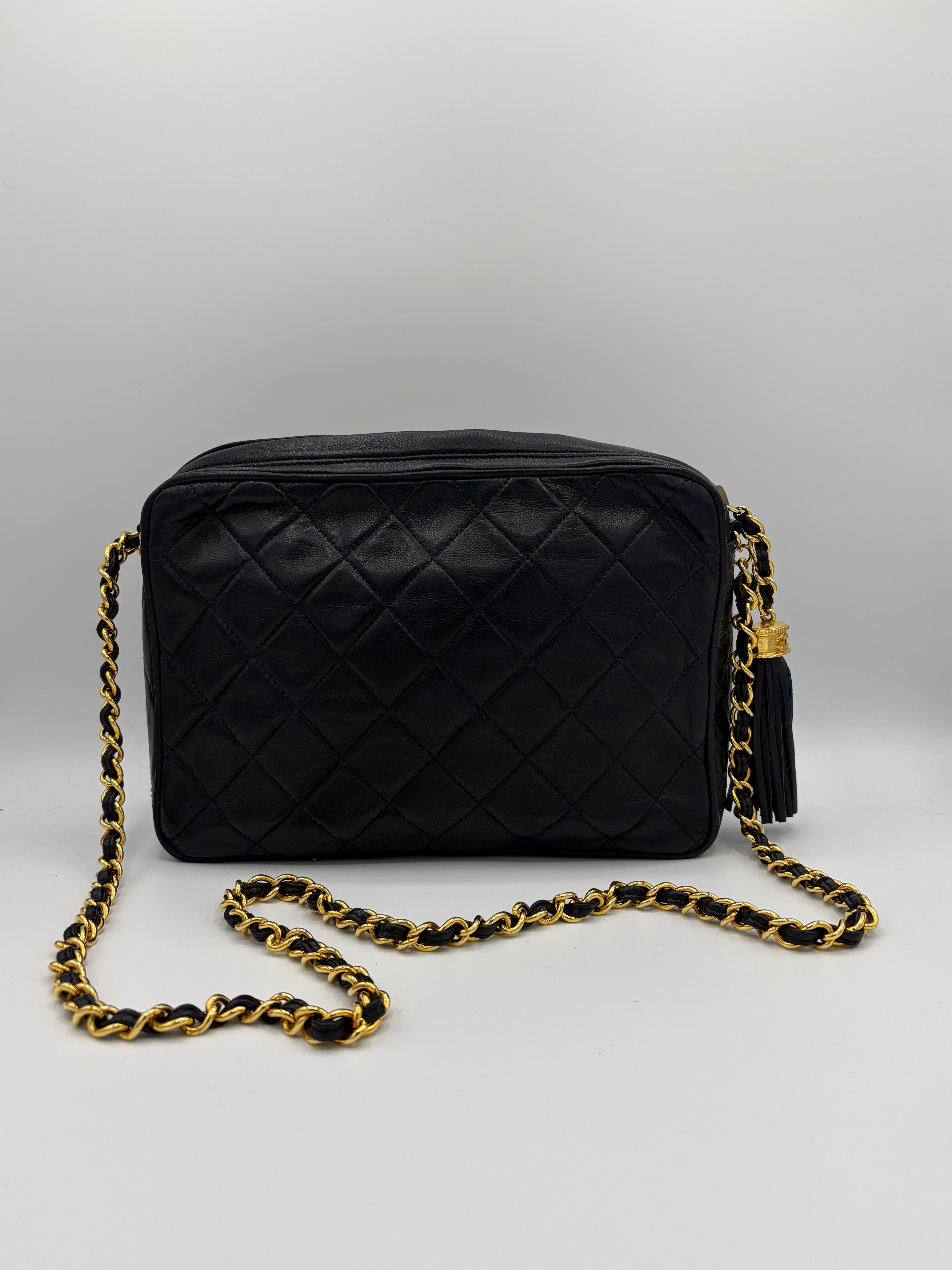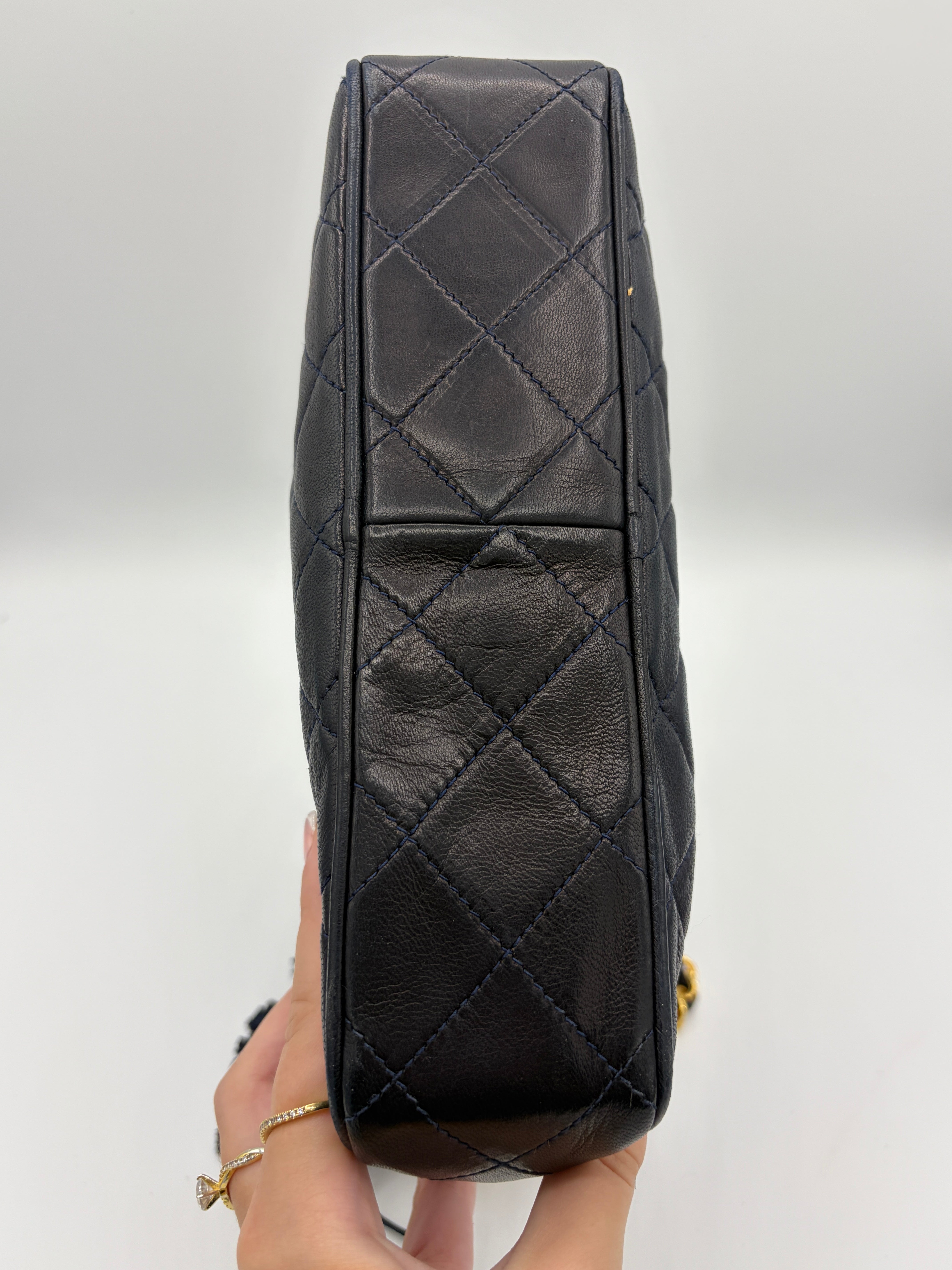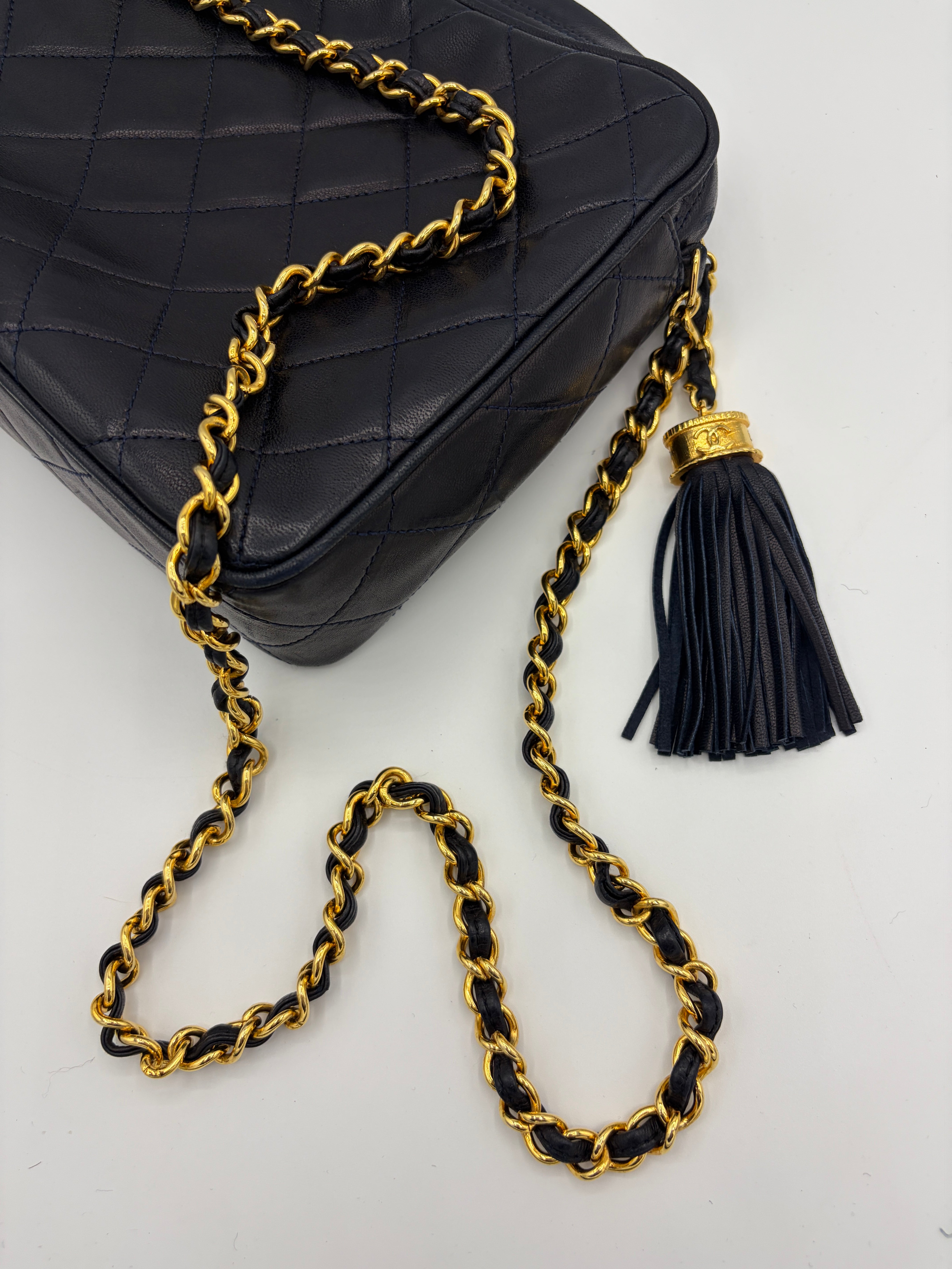 Sac caméra vintage marine très foncé en très bon état général. Présence du pompon Chanel.