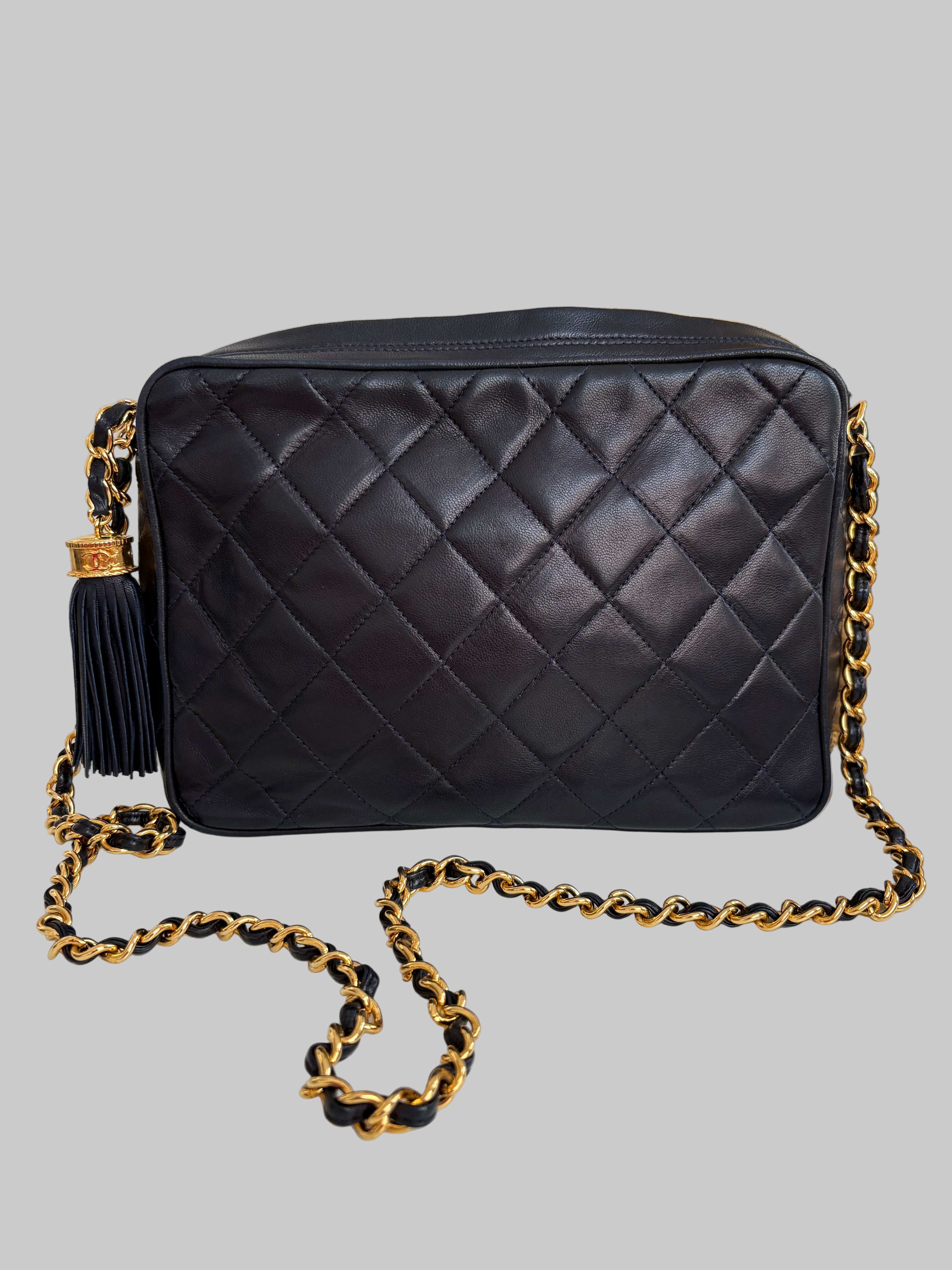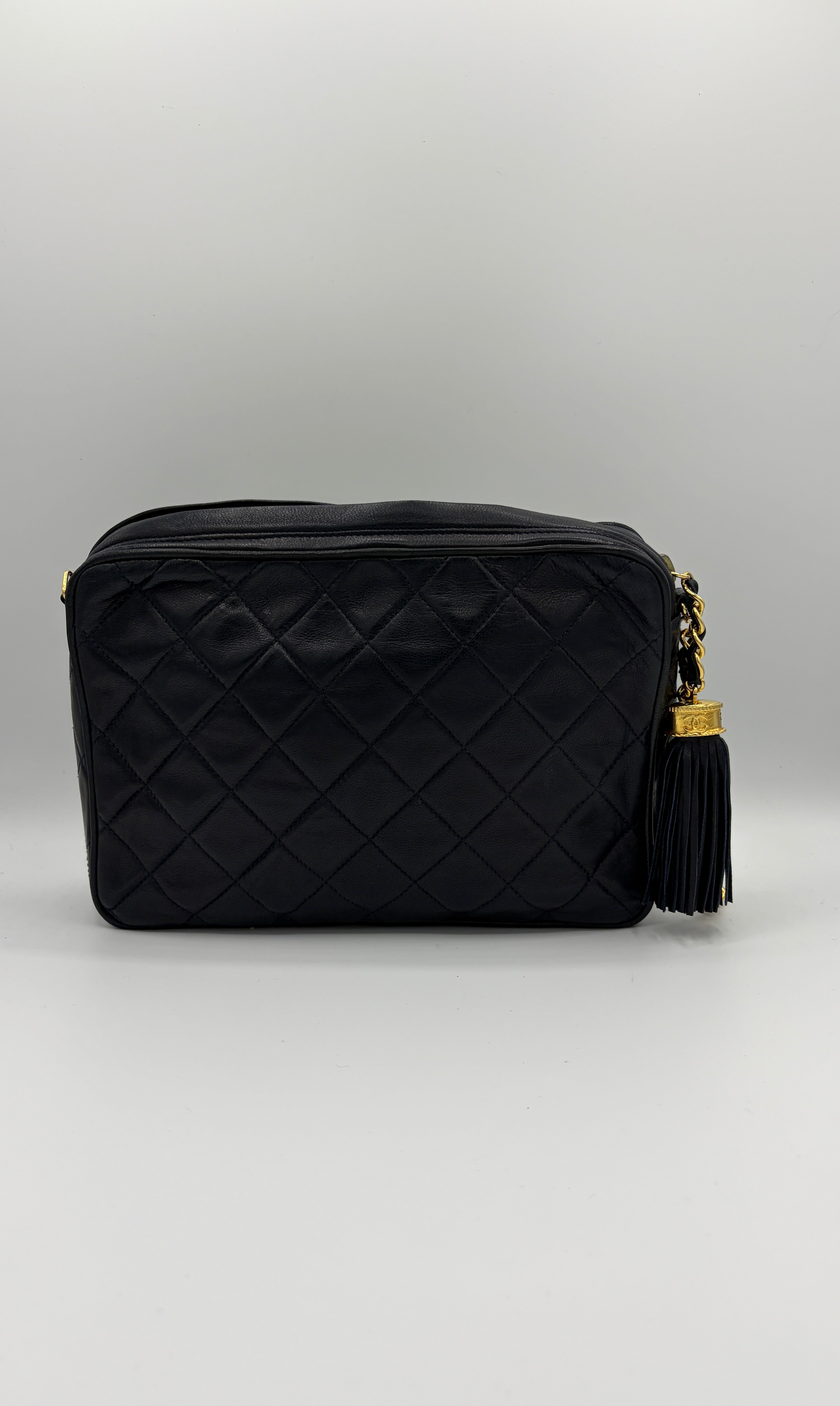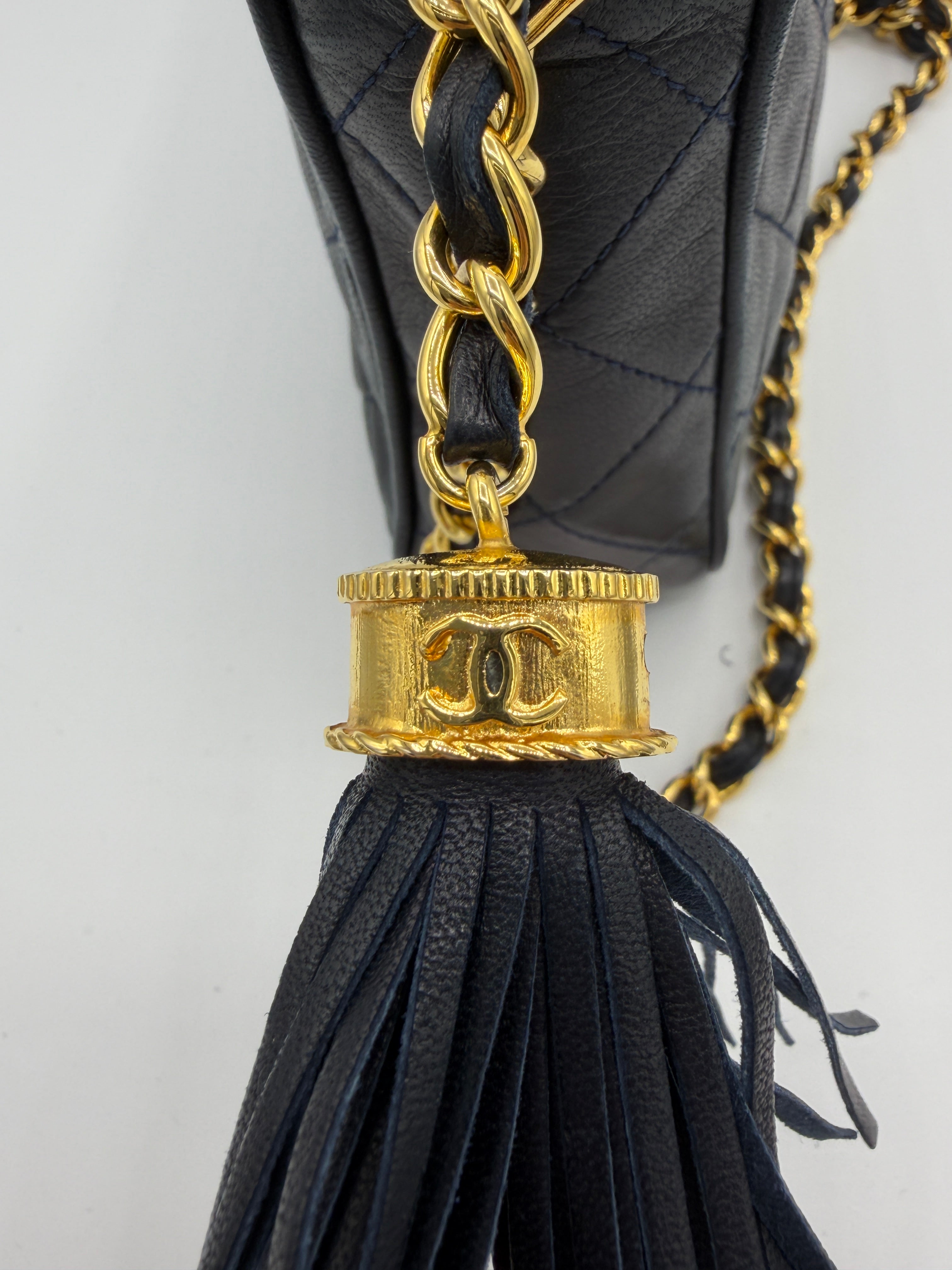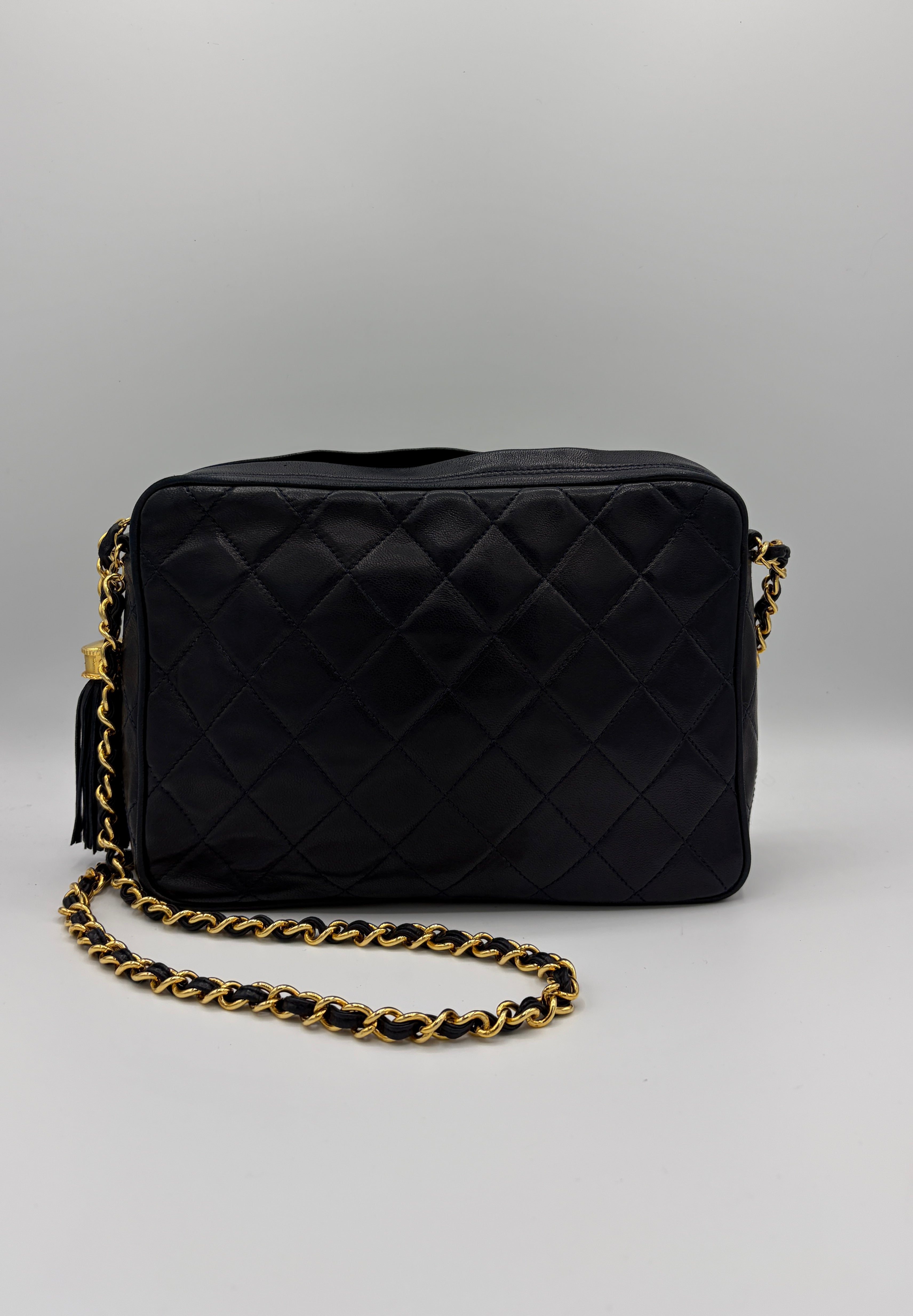 Sac caméra vintage marine très foncé en très bon état général. Présence du pompon Chanel.