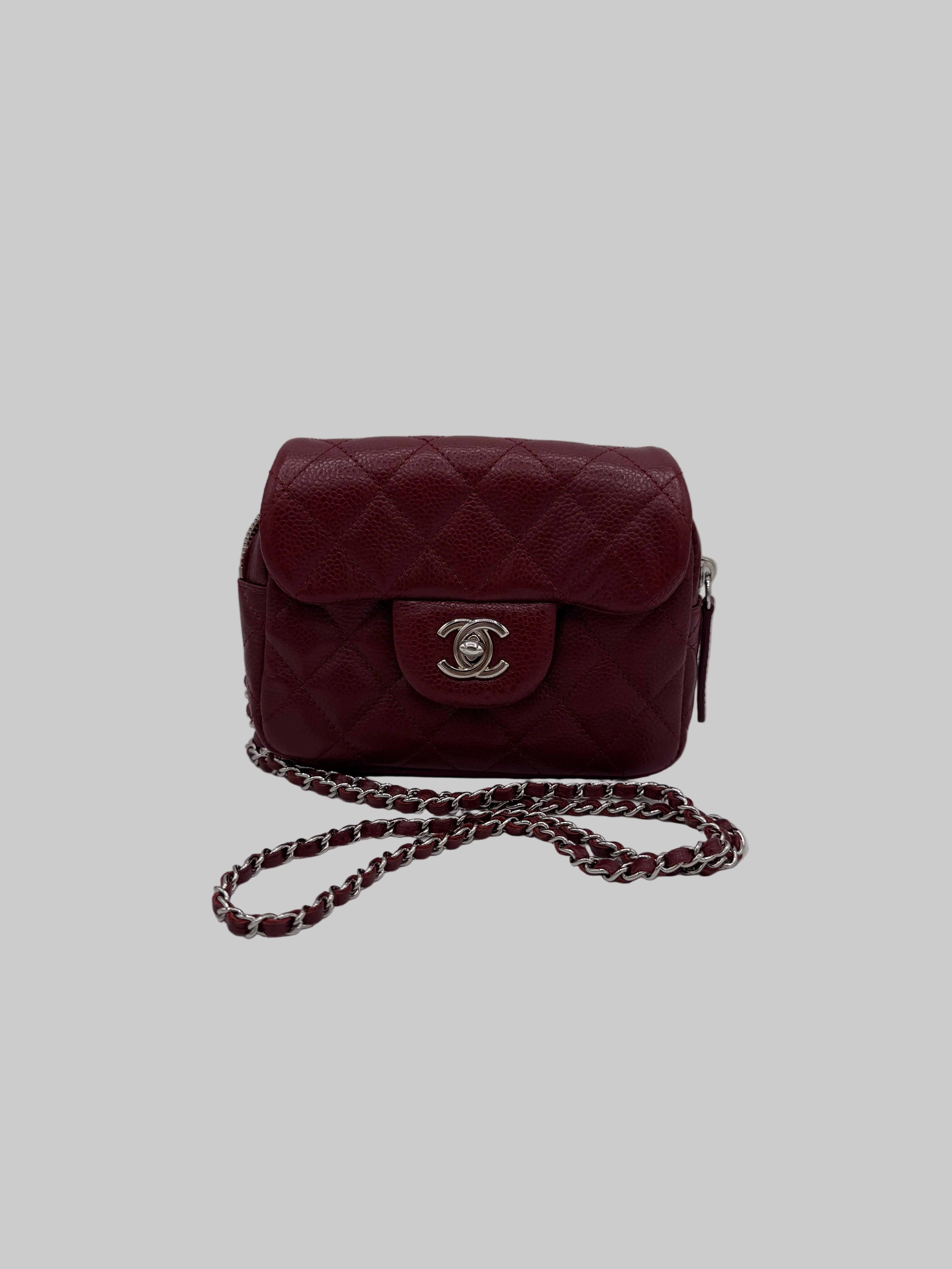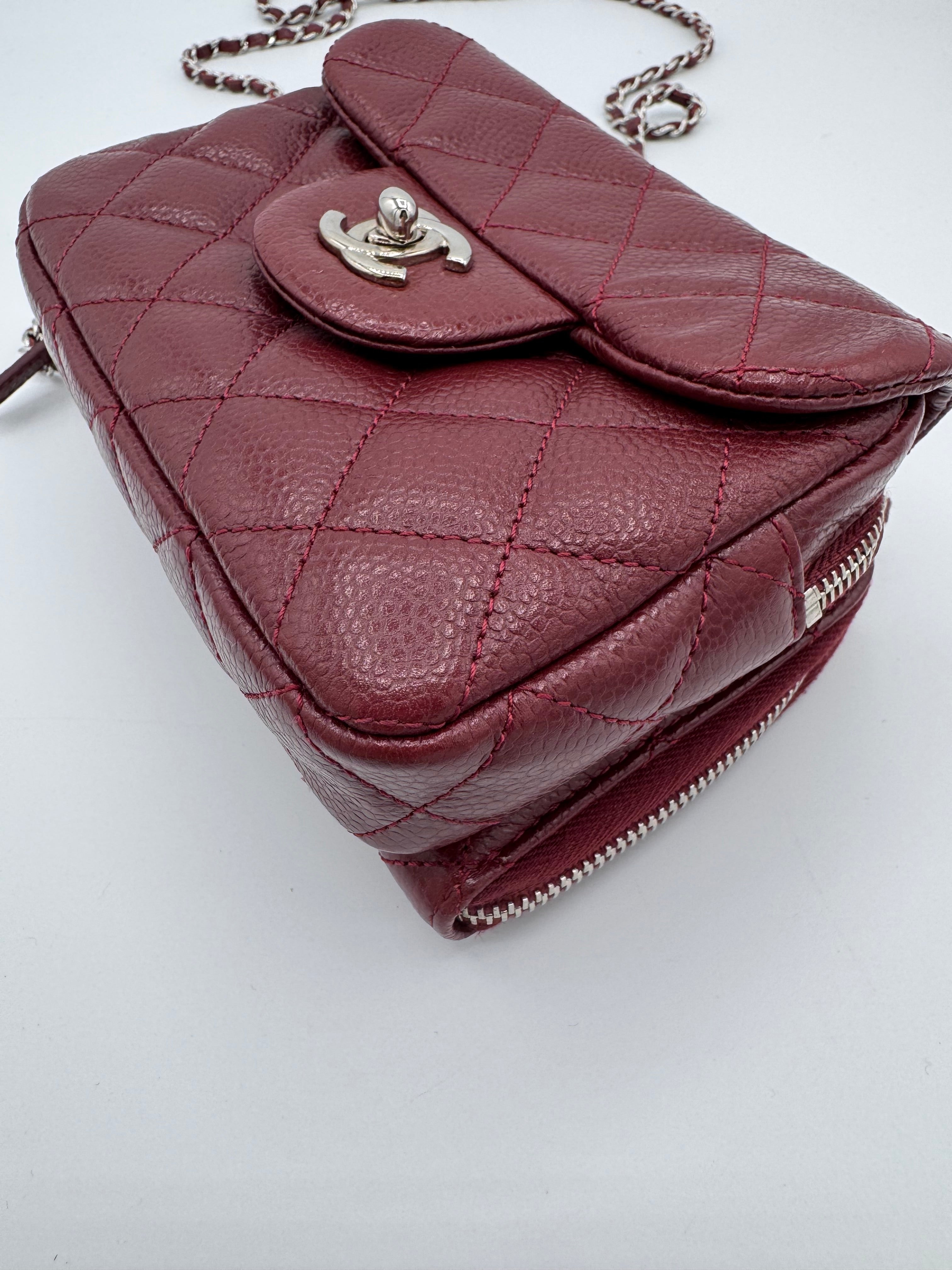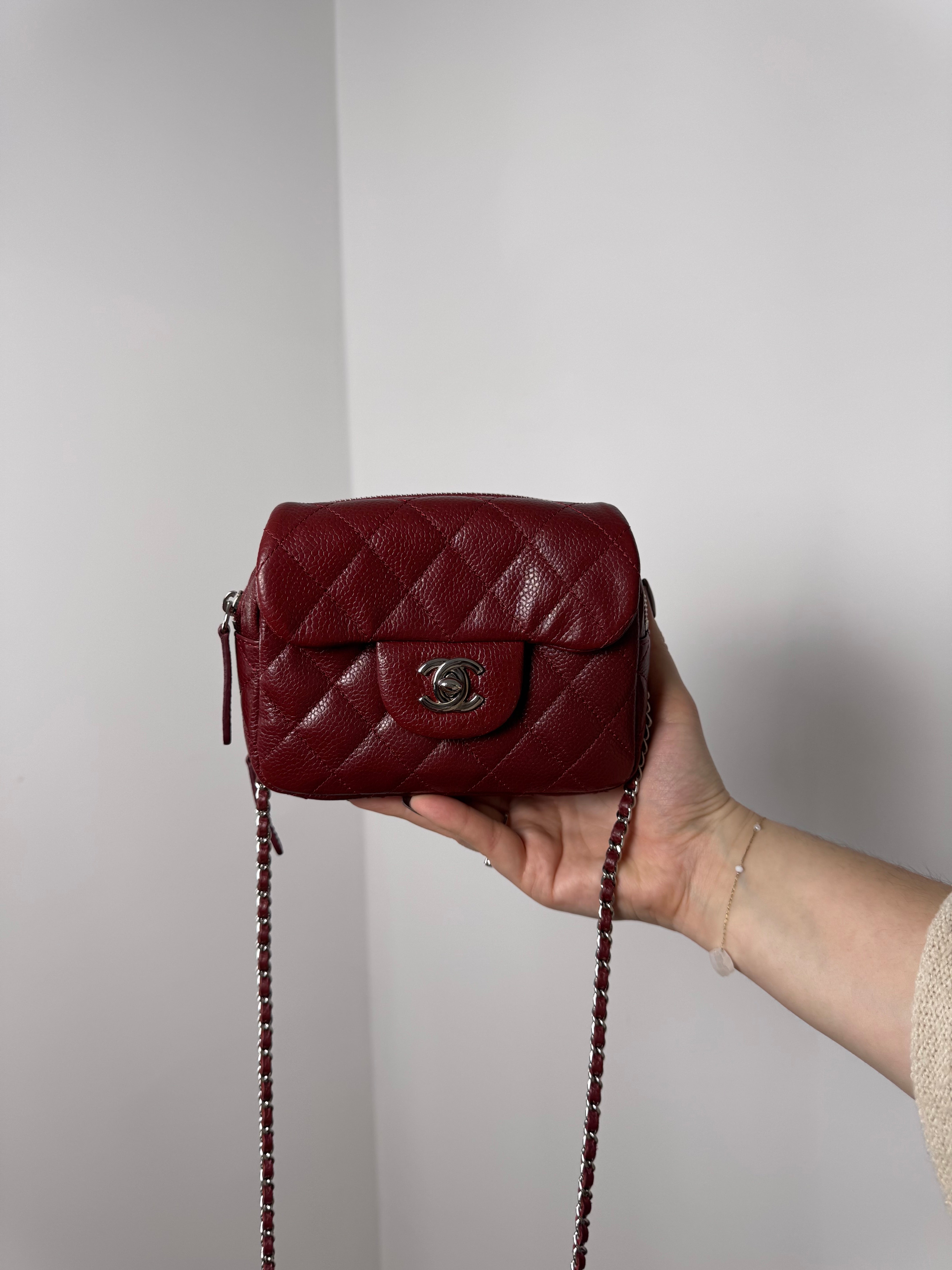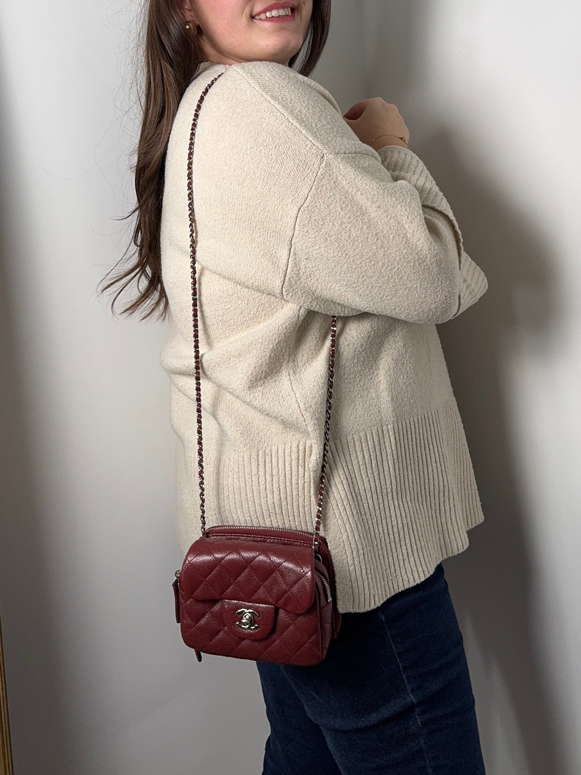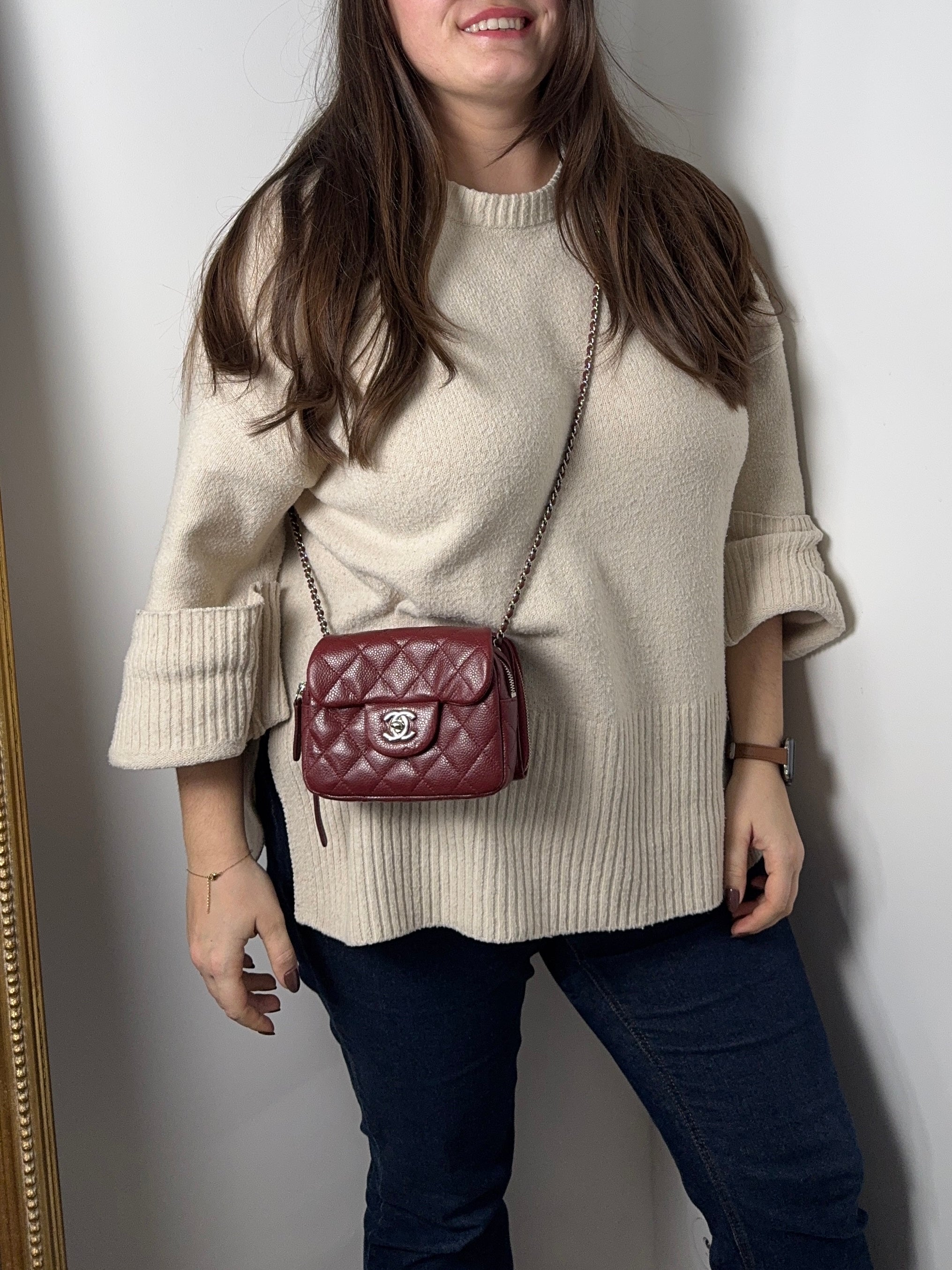 Sac chanel mini comportant deux côtés, un sur le devant qui s’ouvre par le fermoir Chanel classique et fermeture à glissière, l’autre par fermeture à glissière permettant d’y loger des cartes.