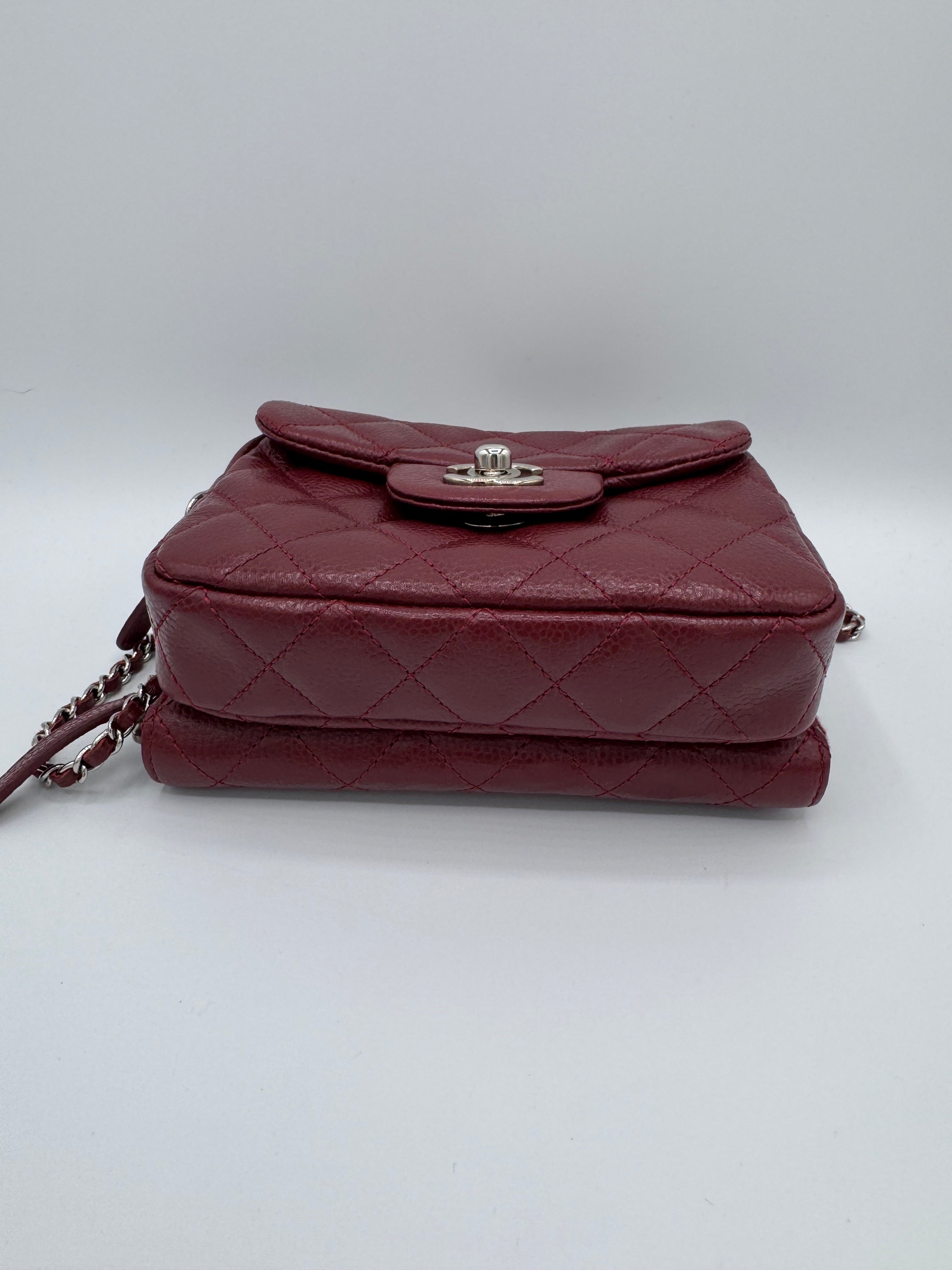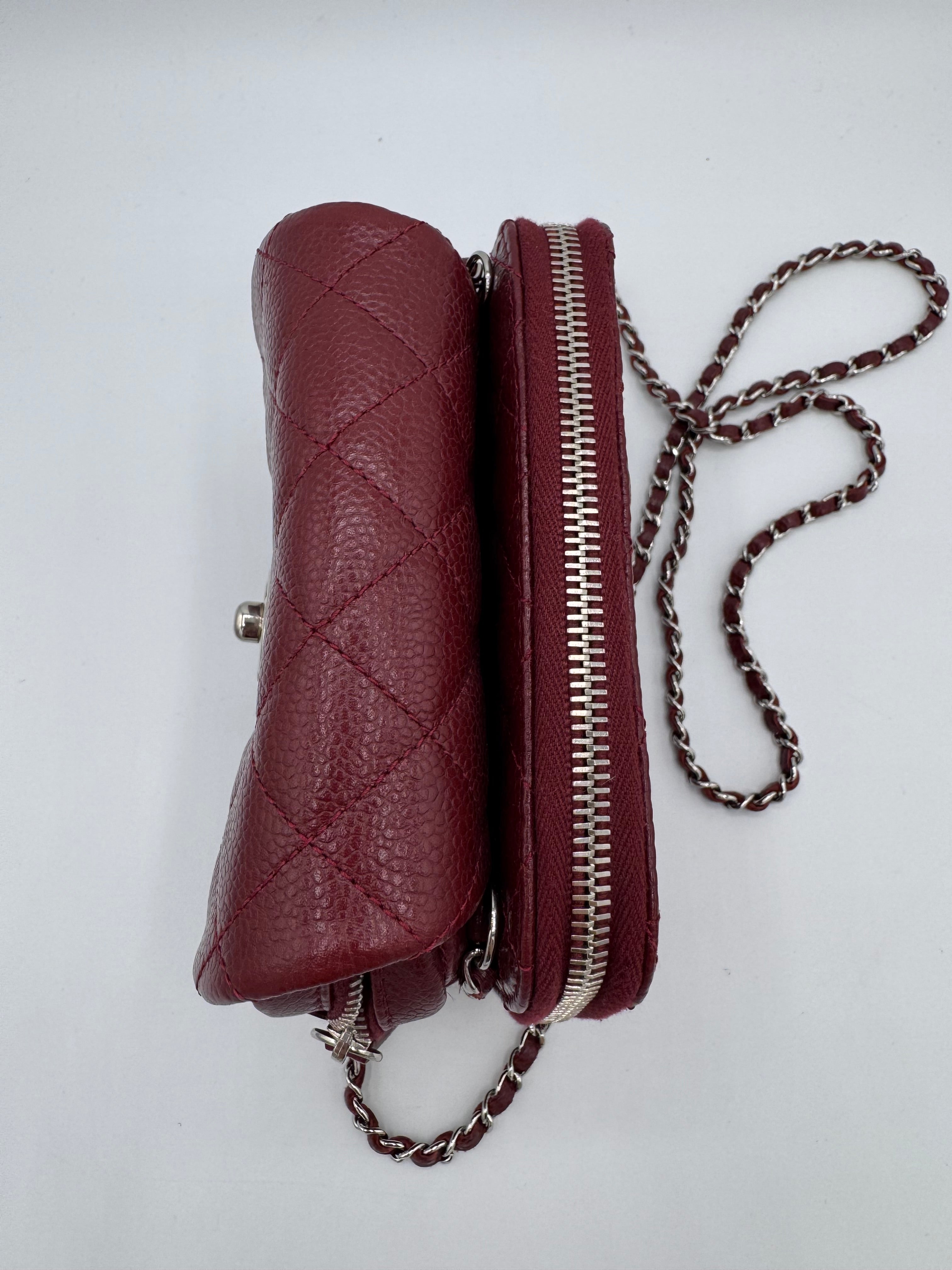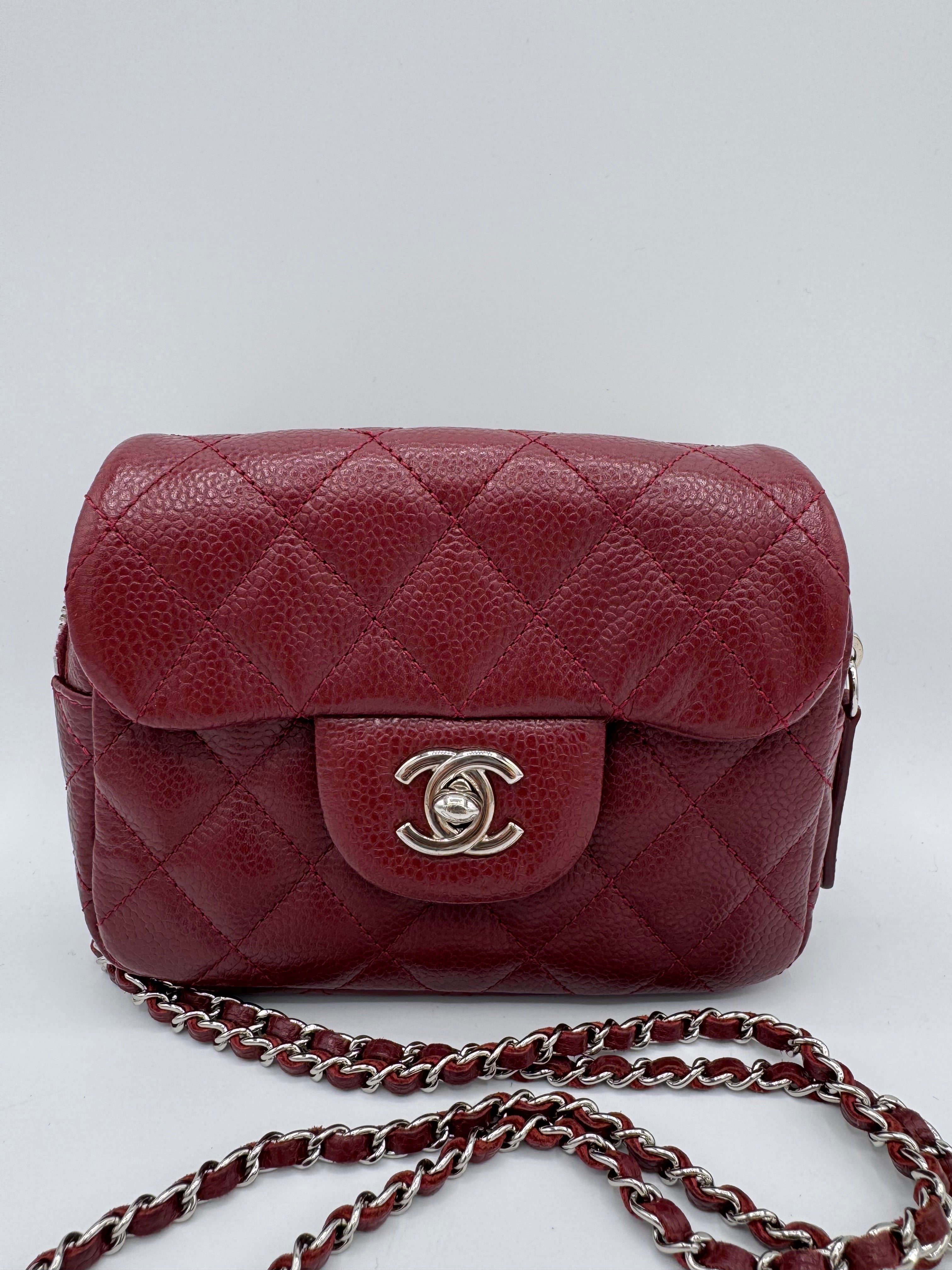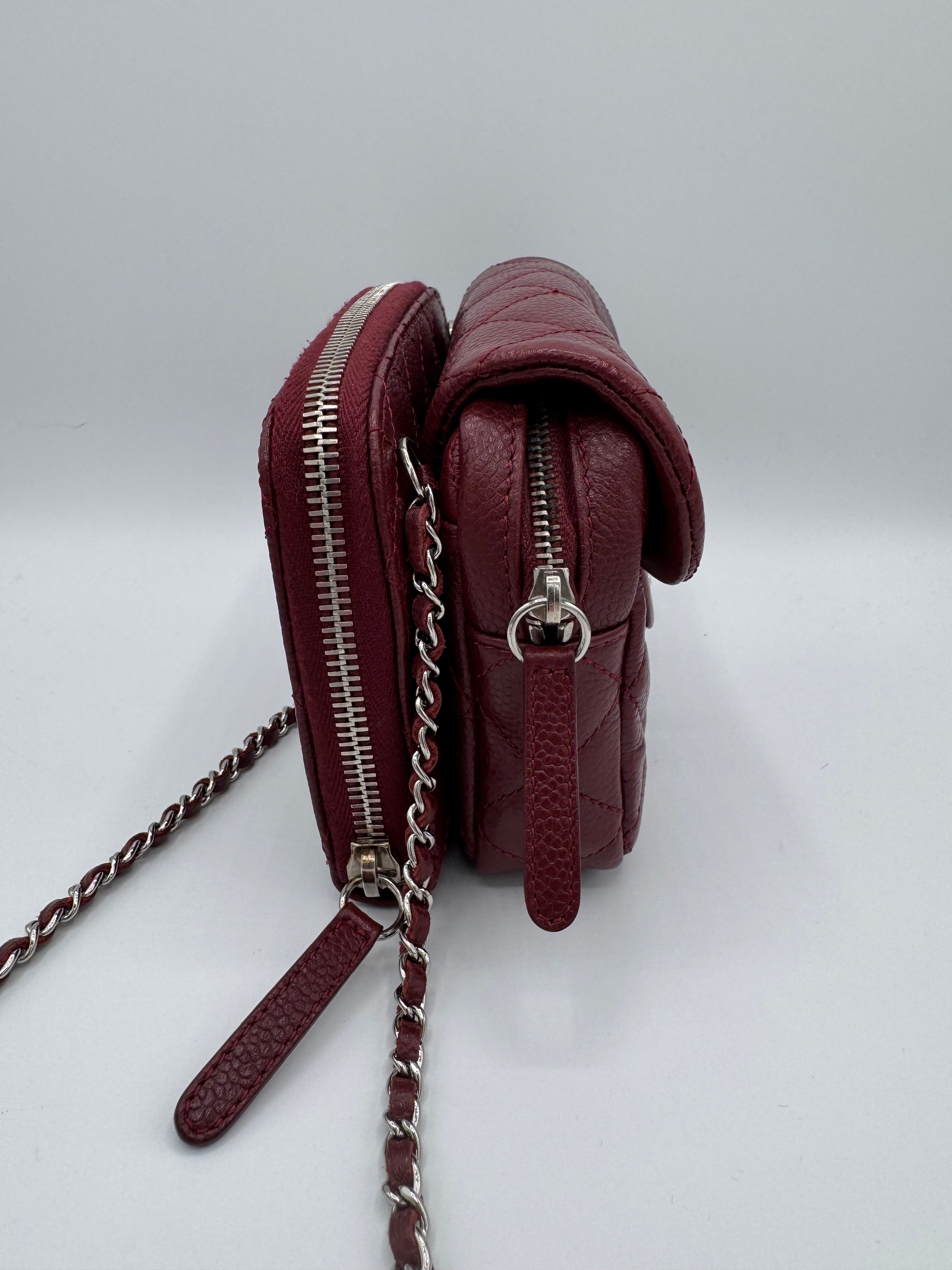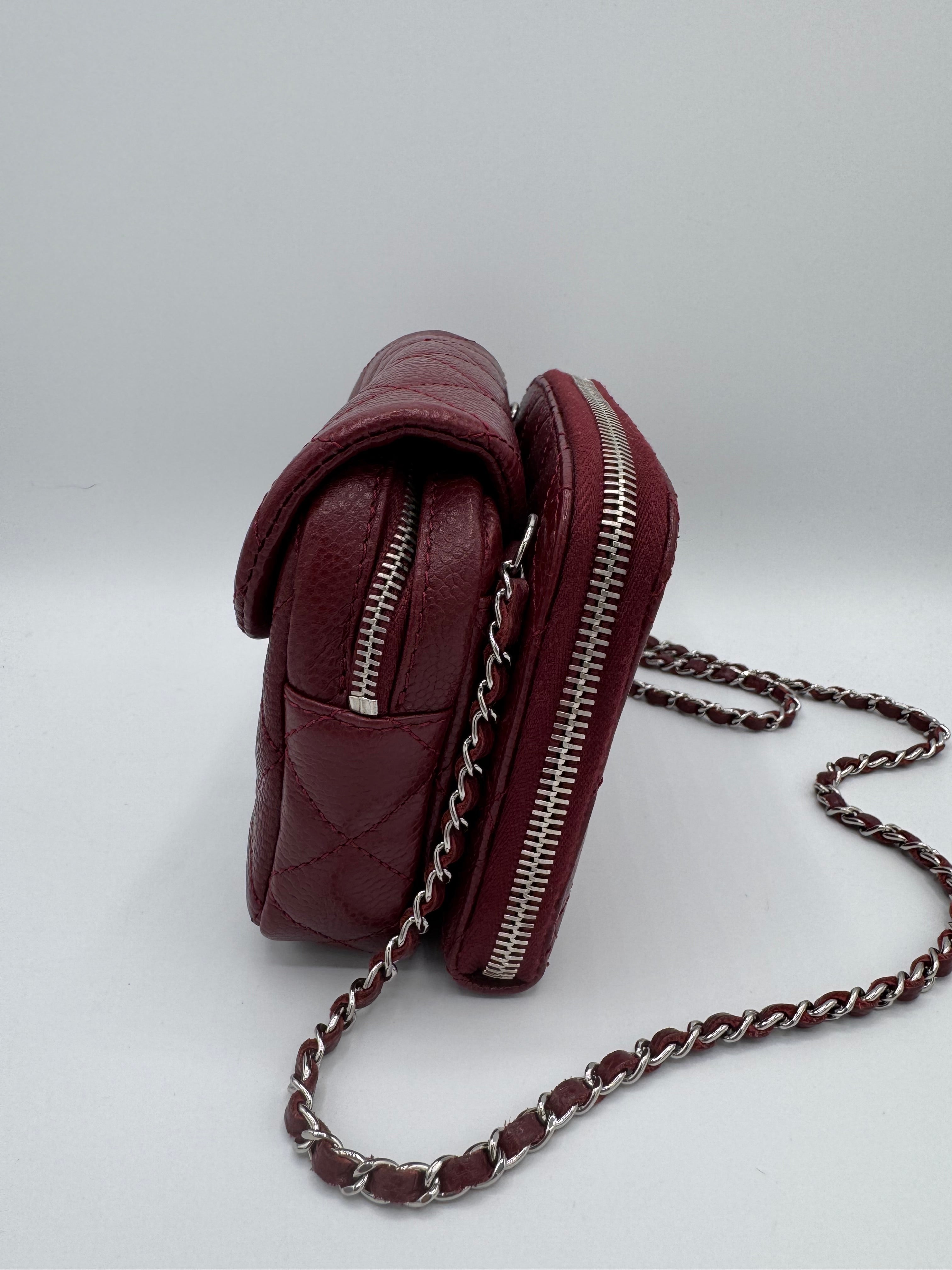 Sac chanel mini comportant deux côtés, un sur le devant qui s’ouvre par le fermoir Chanel classique et fermeture à glissière, l’autre par fermeture à glissière permettant d’y loger des cartes.