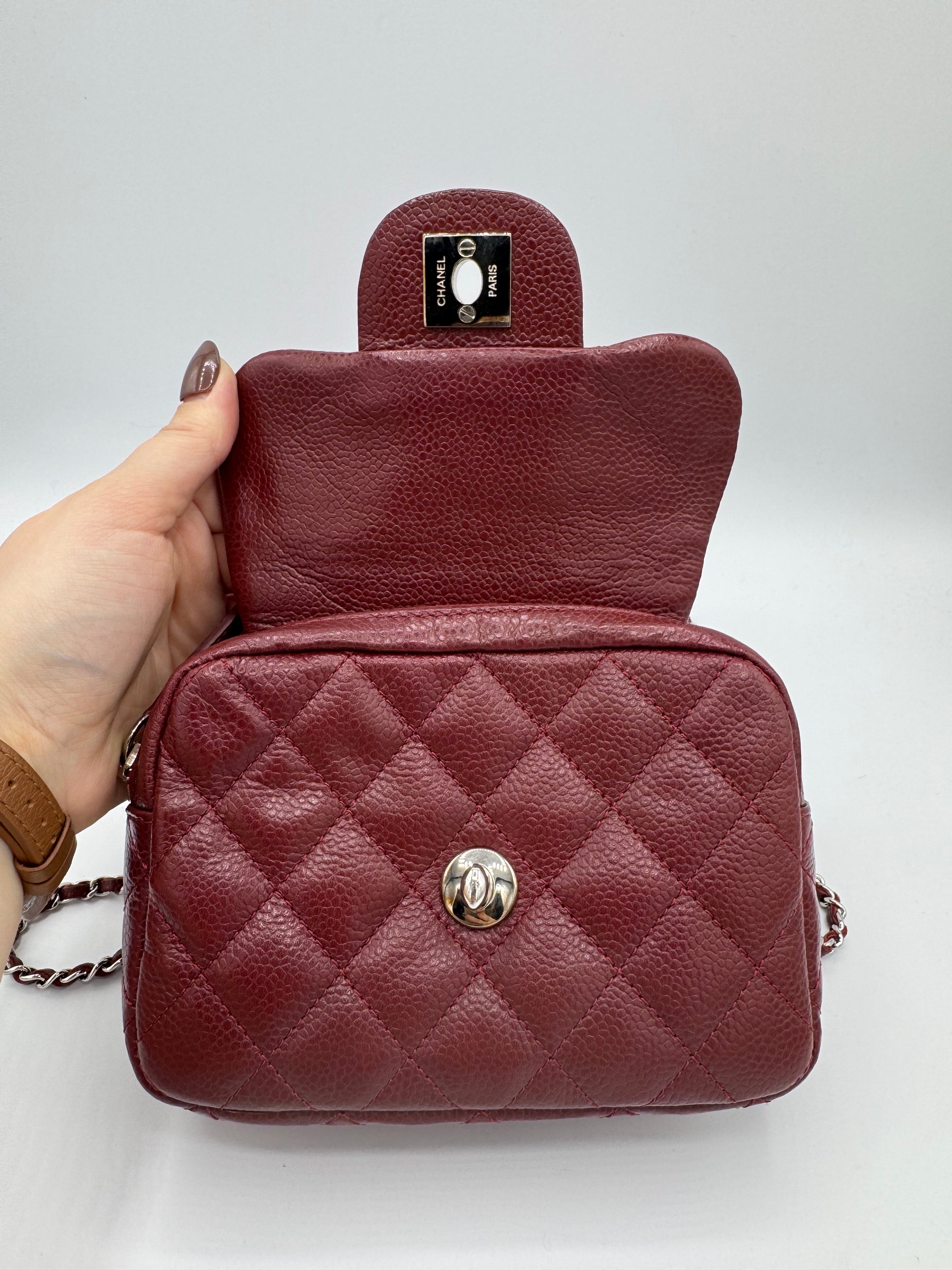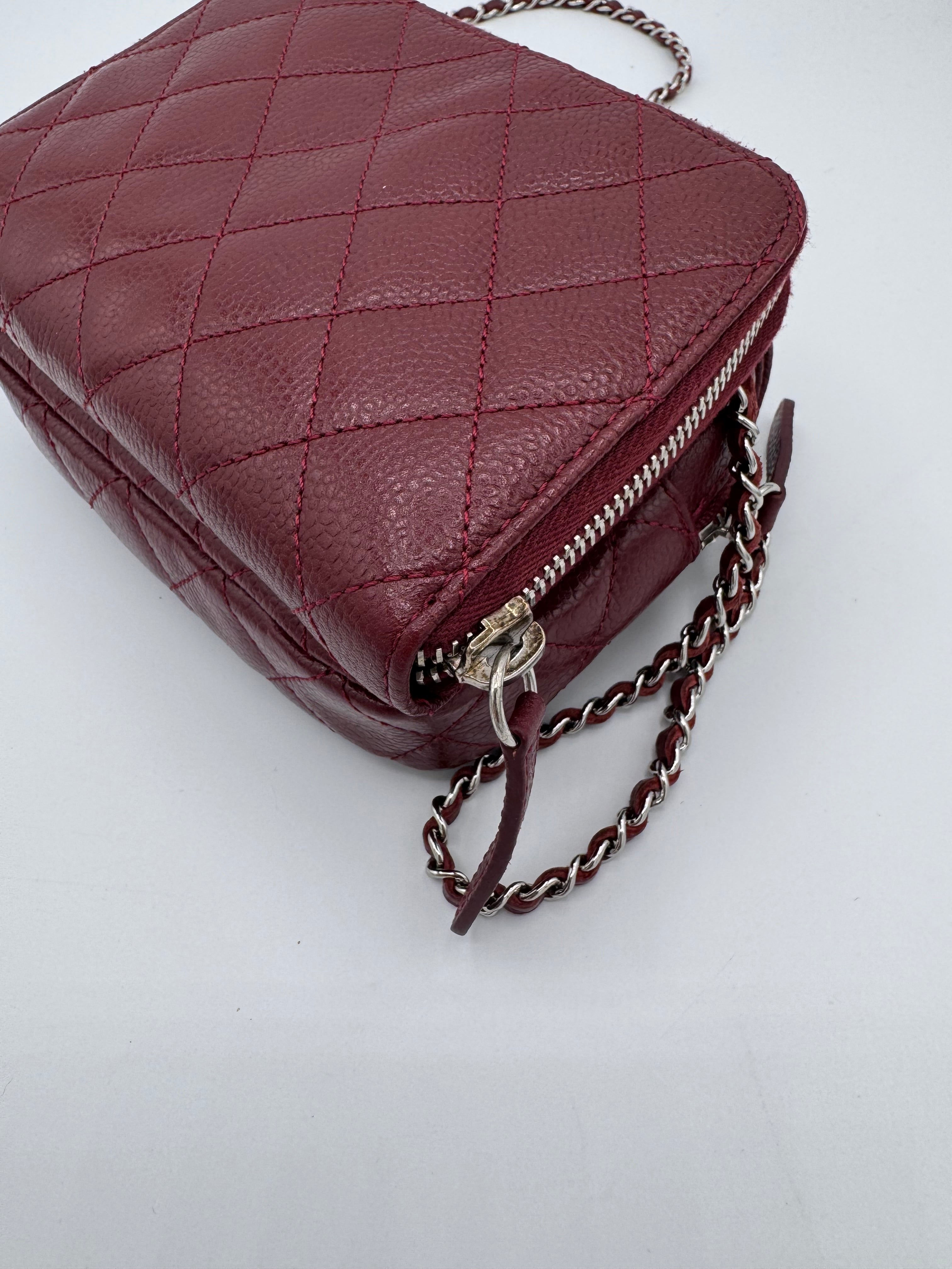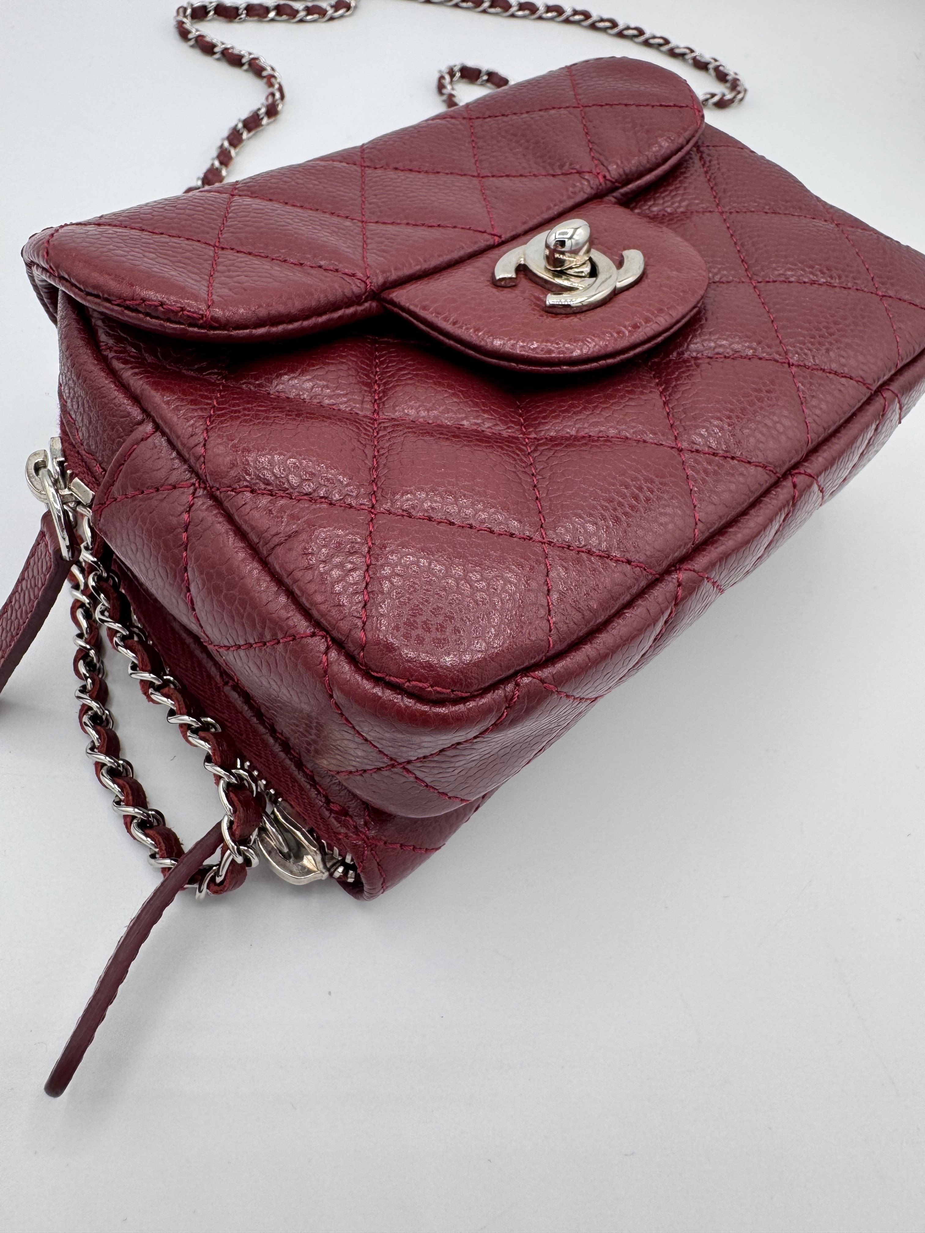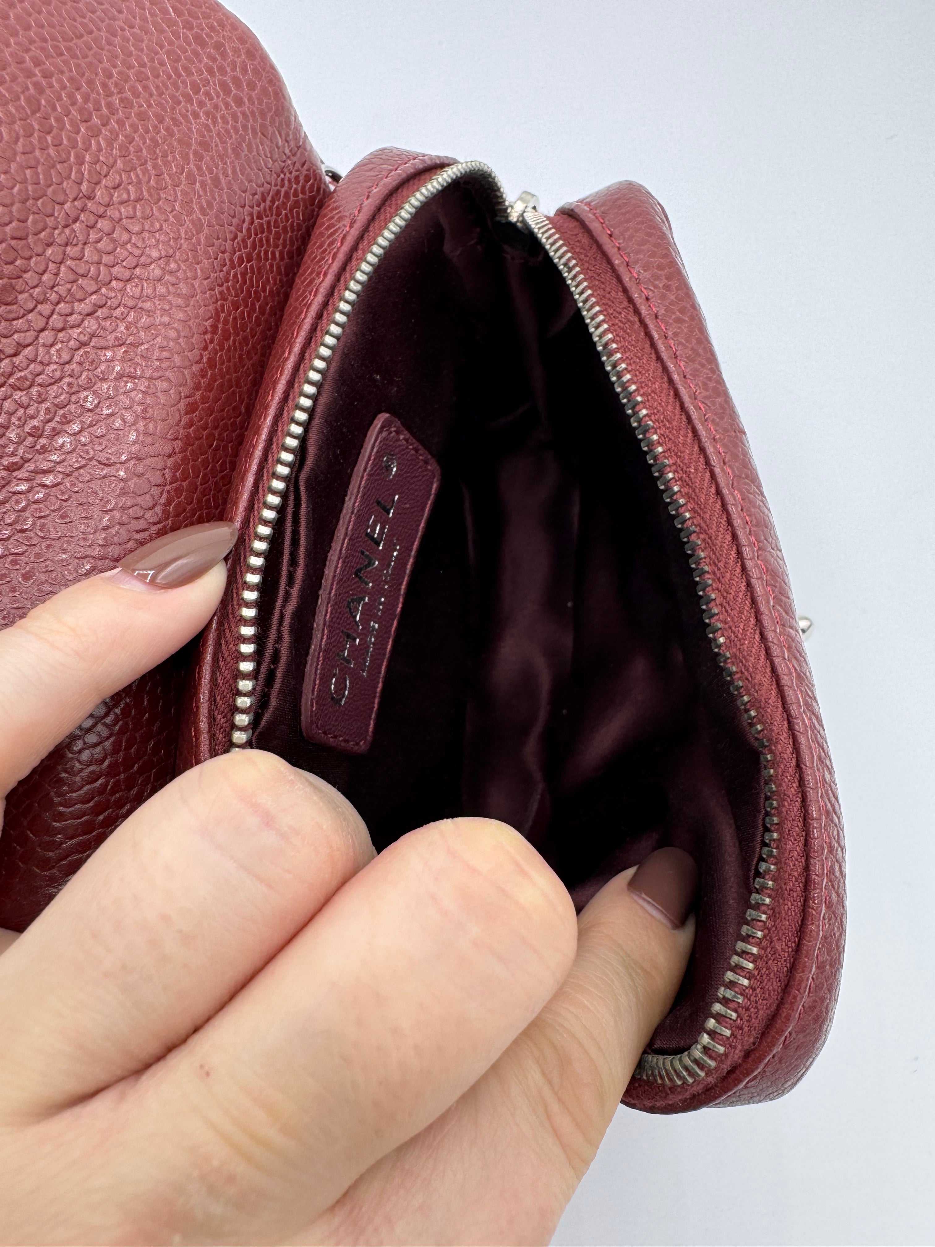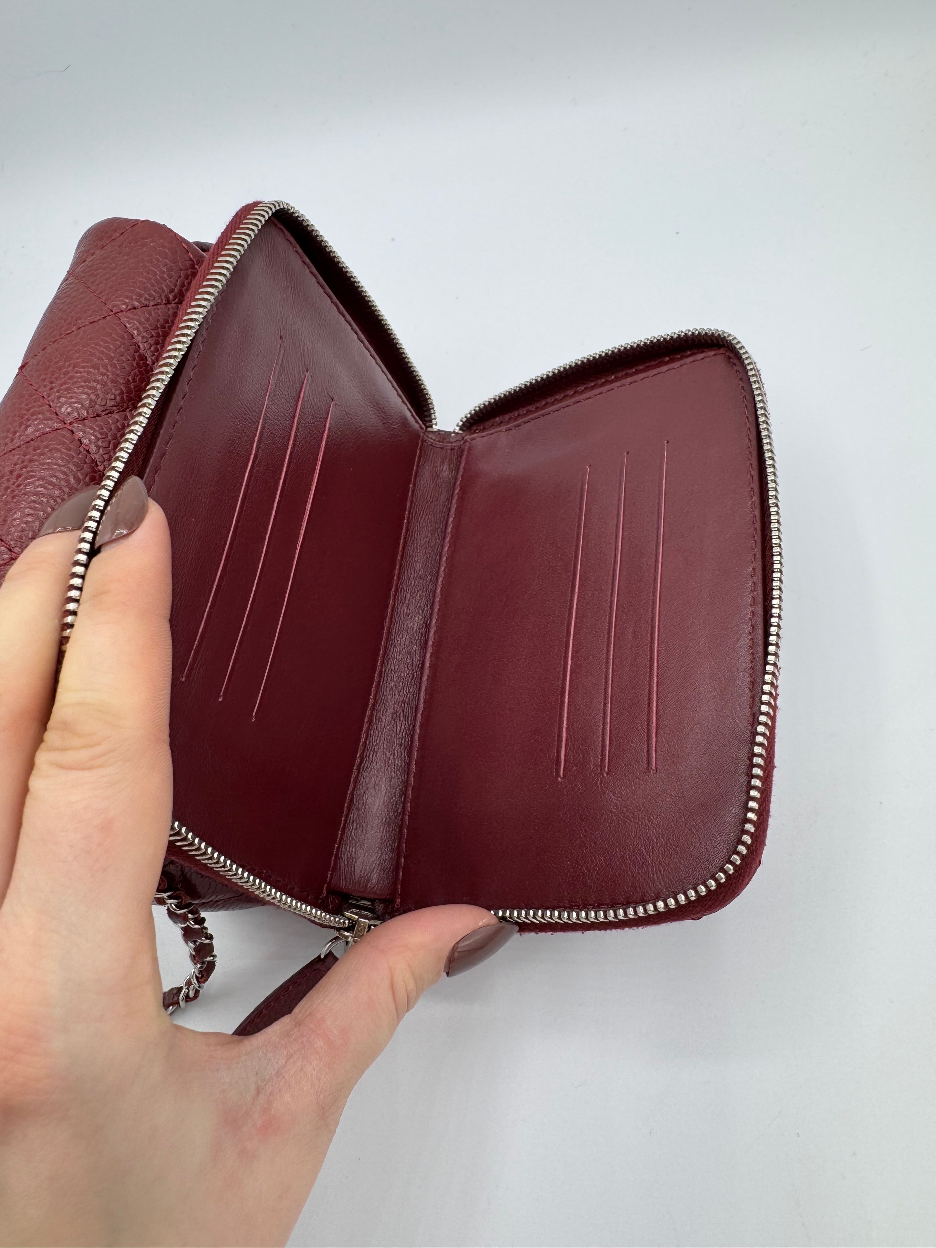 Sac chanel mini comportant deux côtés, un sur le devant qui s’ouvre par le fermoir Chanel classique et fermeture à glissière, l’autre par fermeture à glissière permettant d’y loger des cartes.