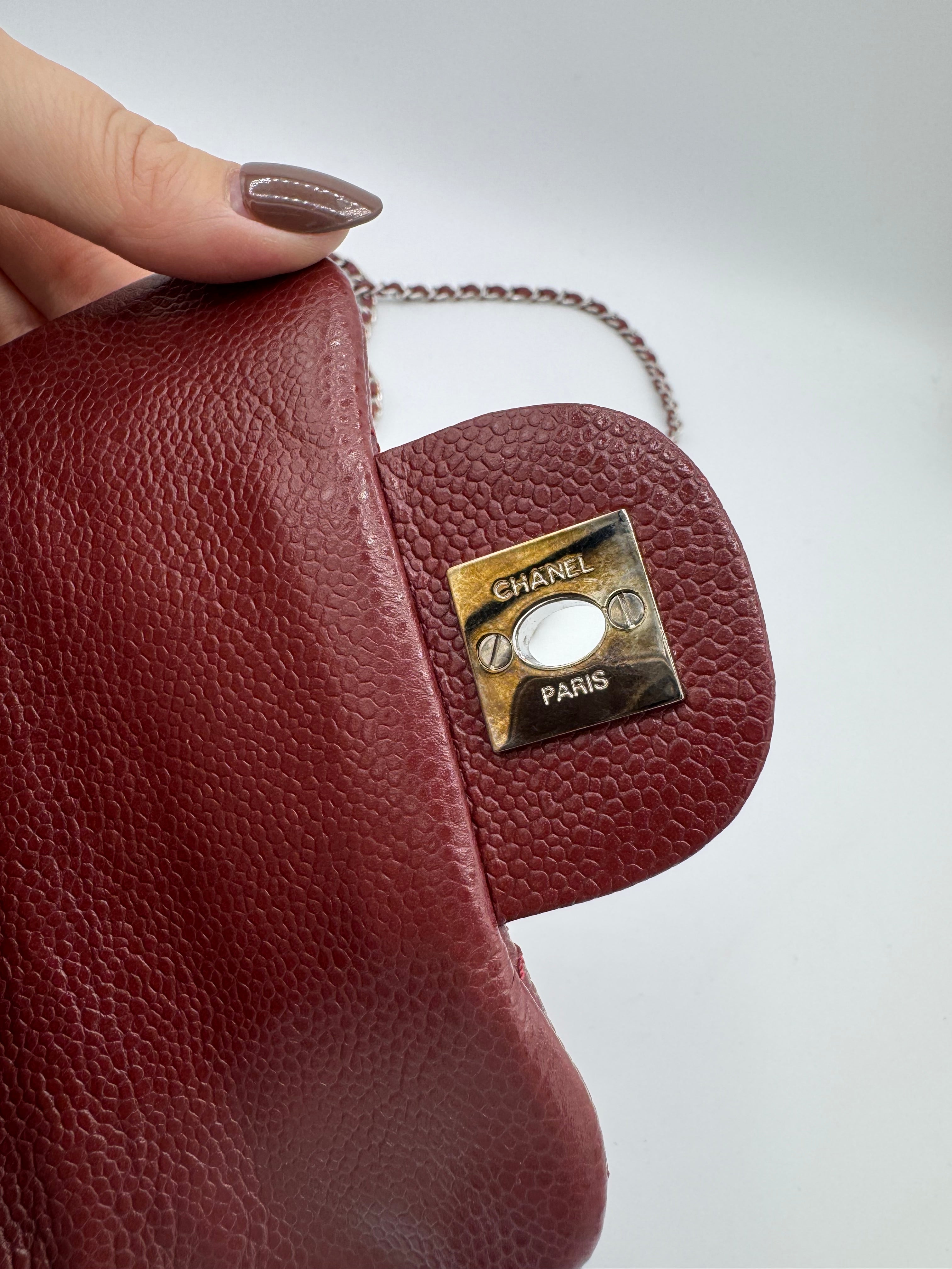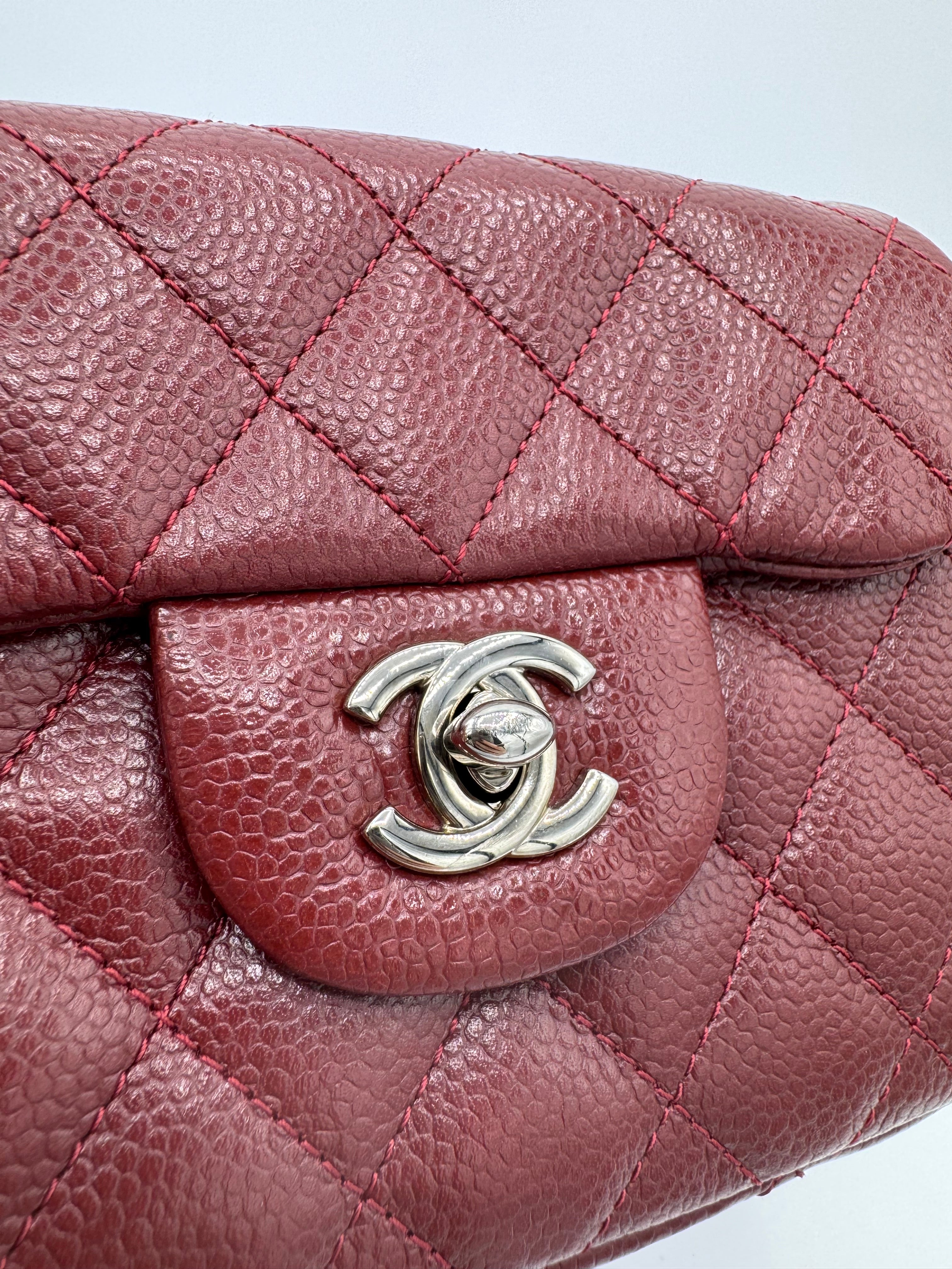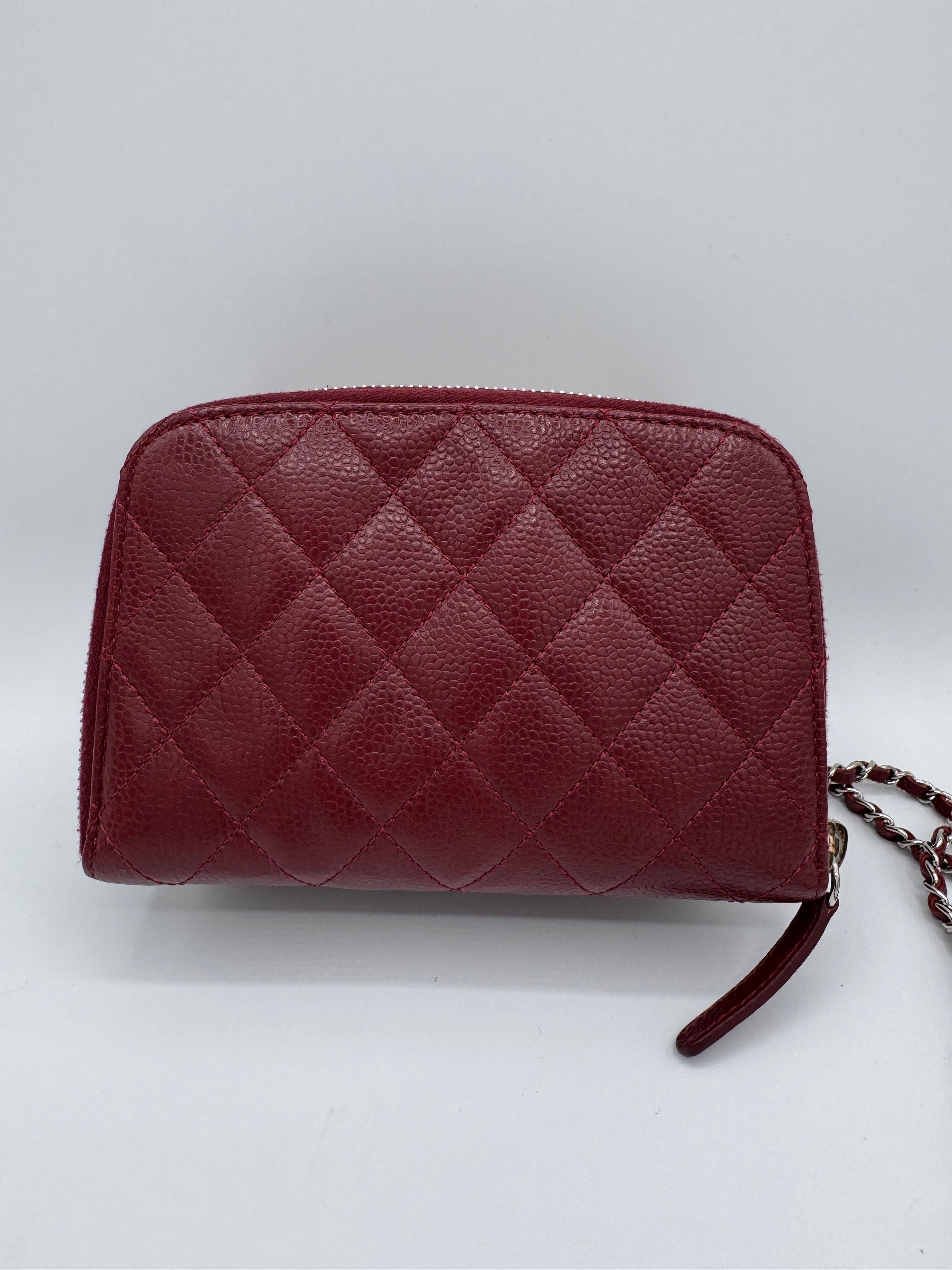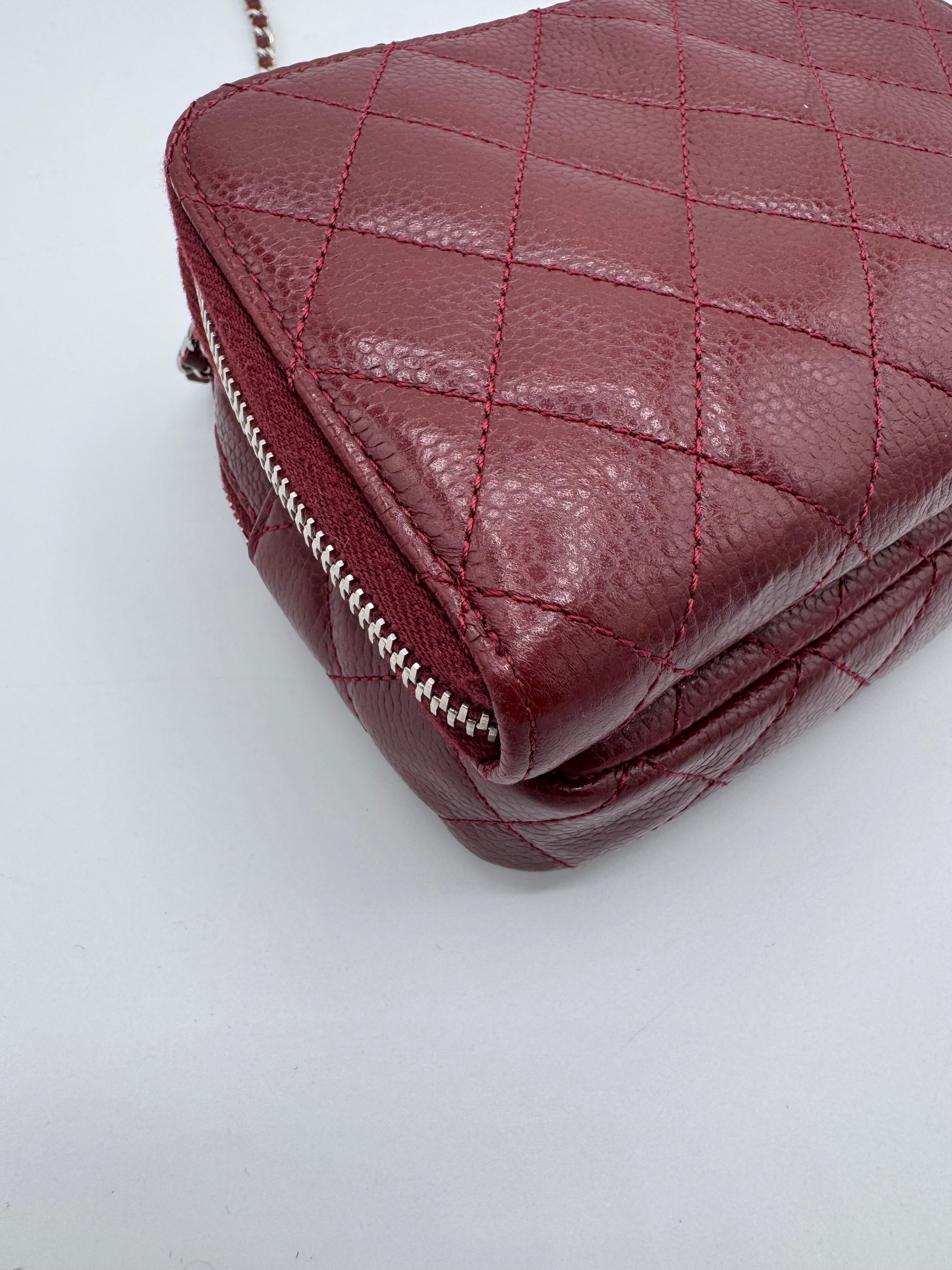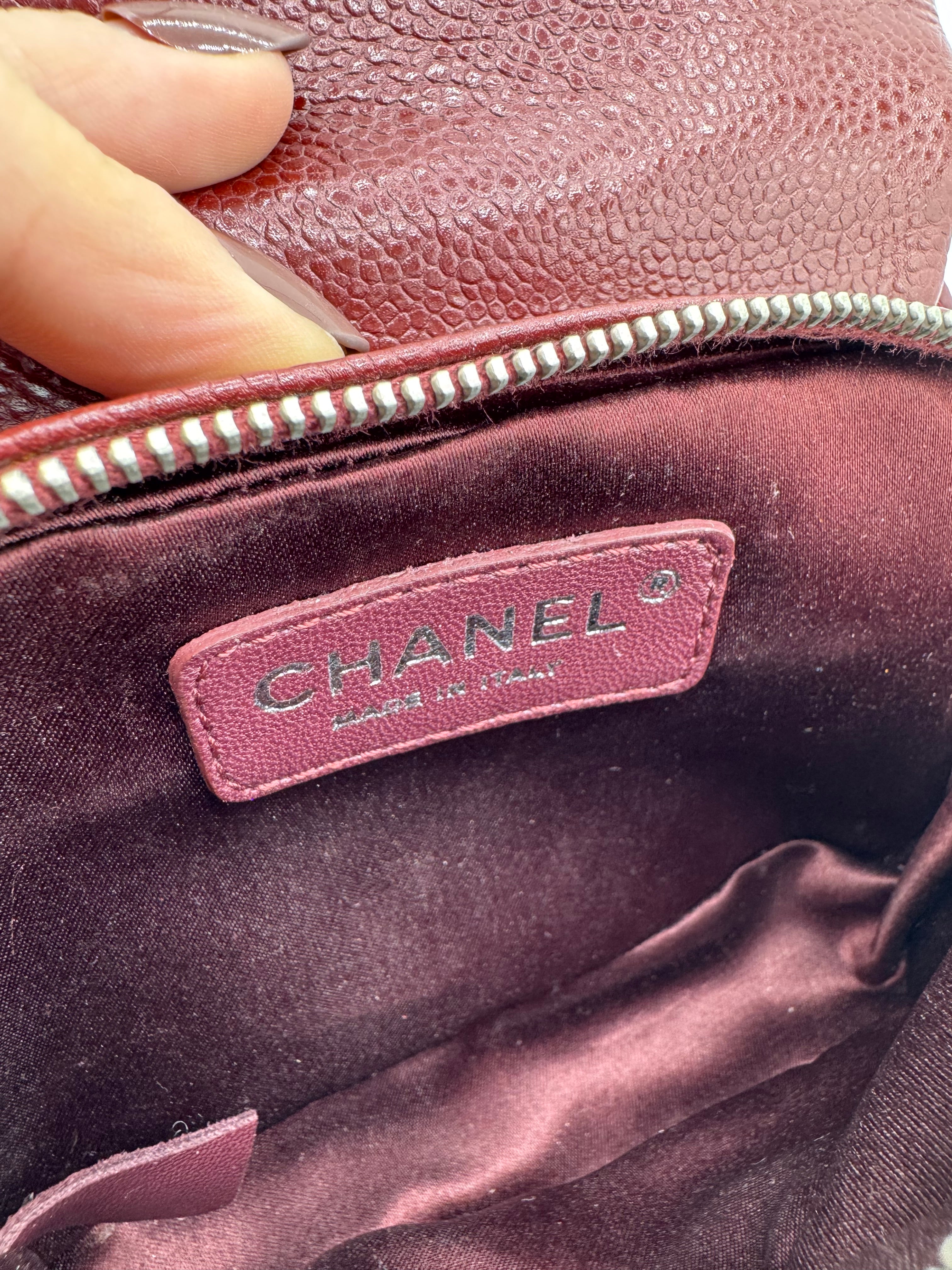 Sac chanel mini comportant deux côtés, un sur le devant qui s’ouvre par le fermoir Chanel classique et fermeture à glissière, l’autre par fermeture à glissière permettant d’y loger des cartes.