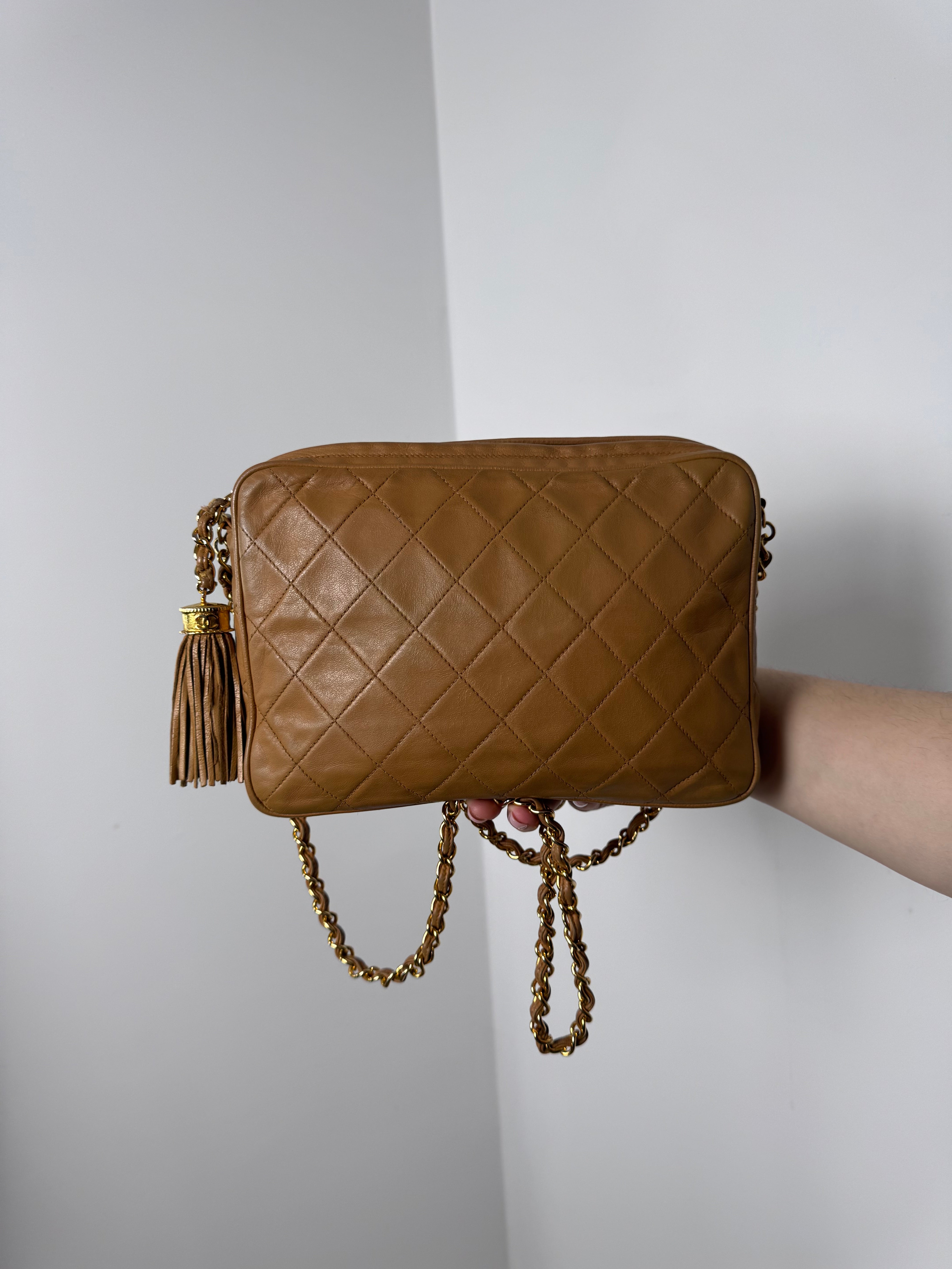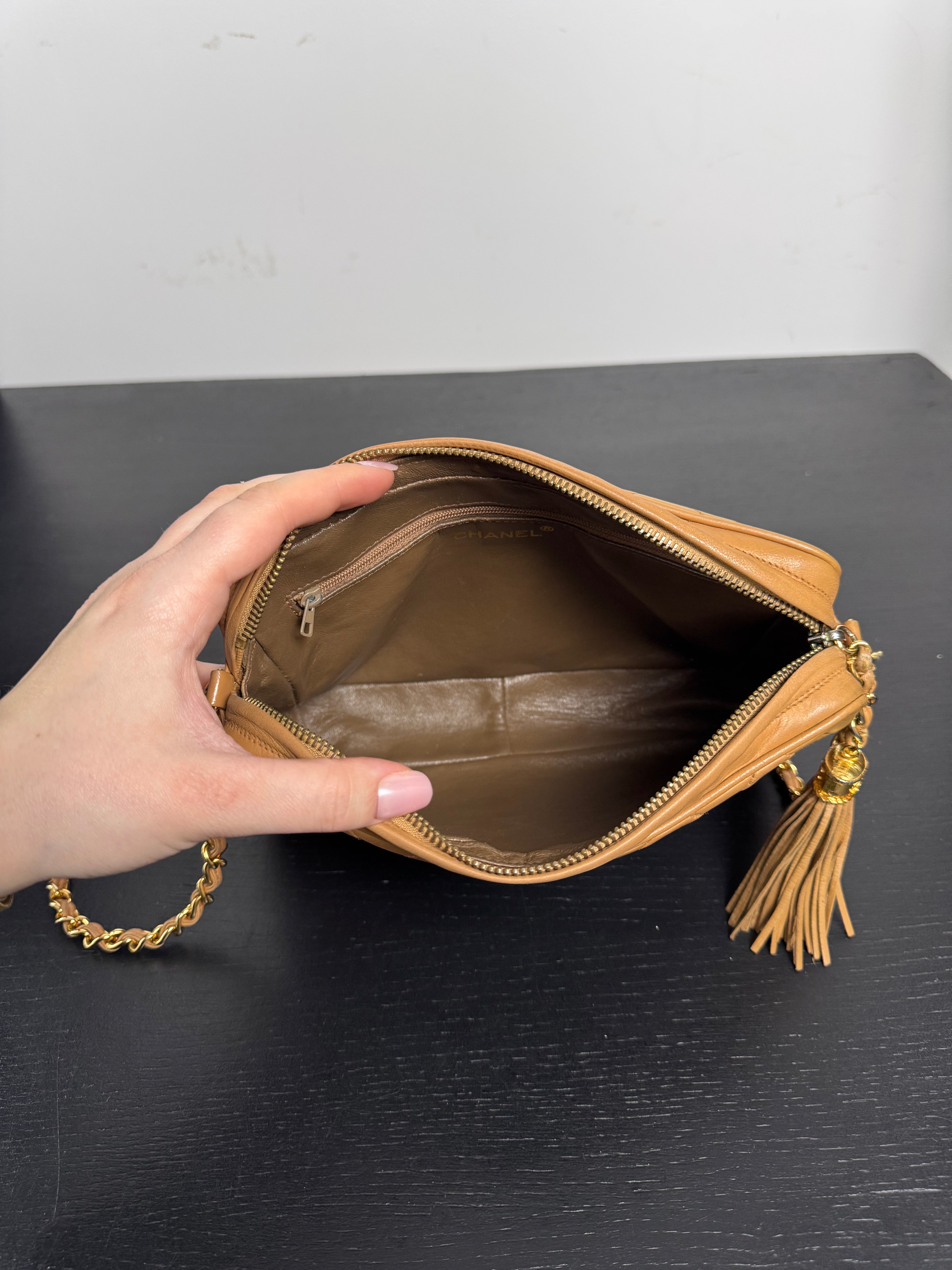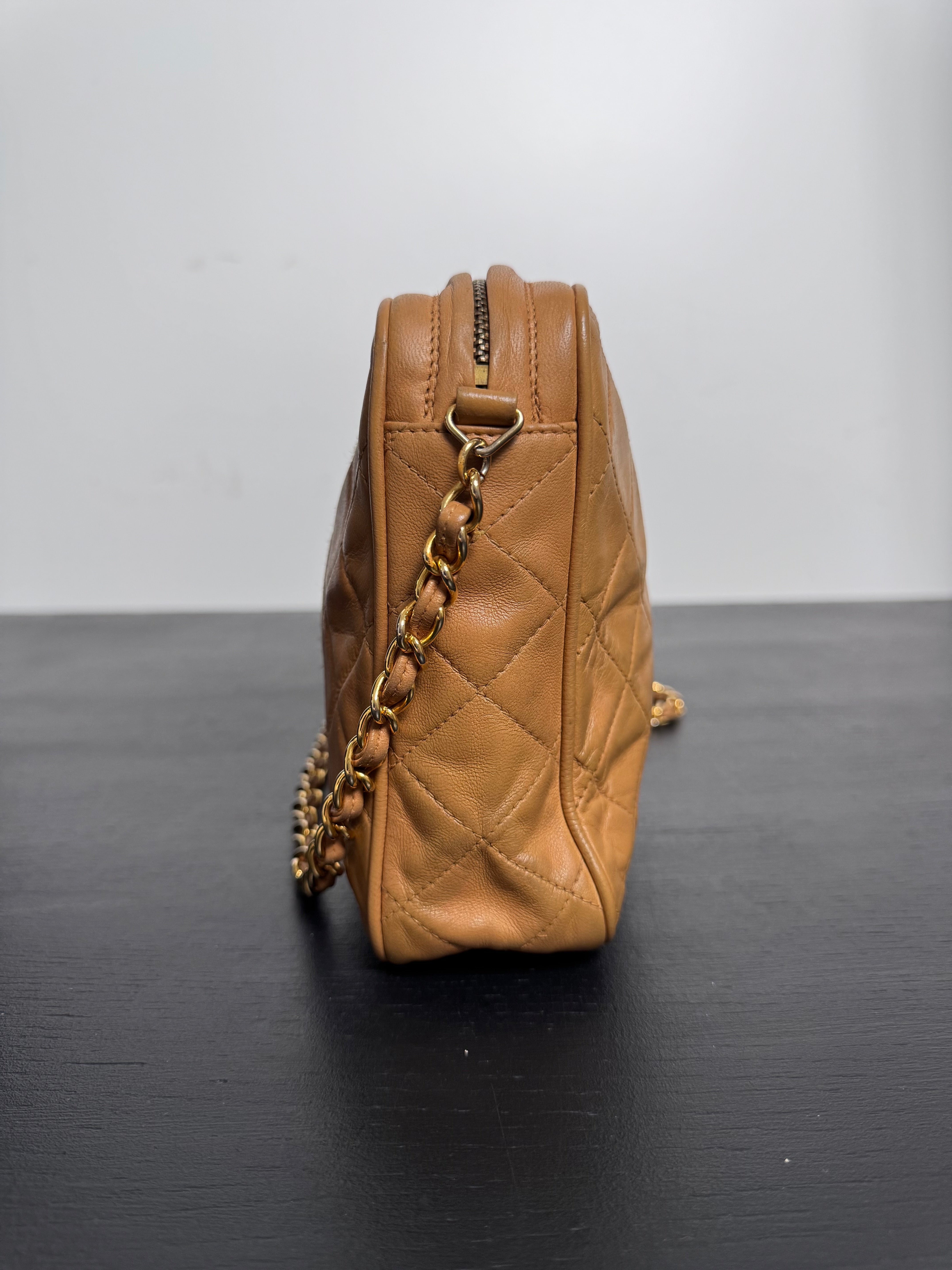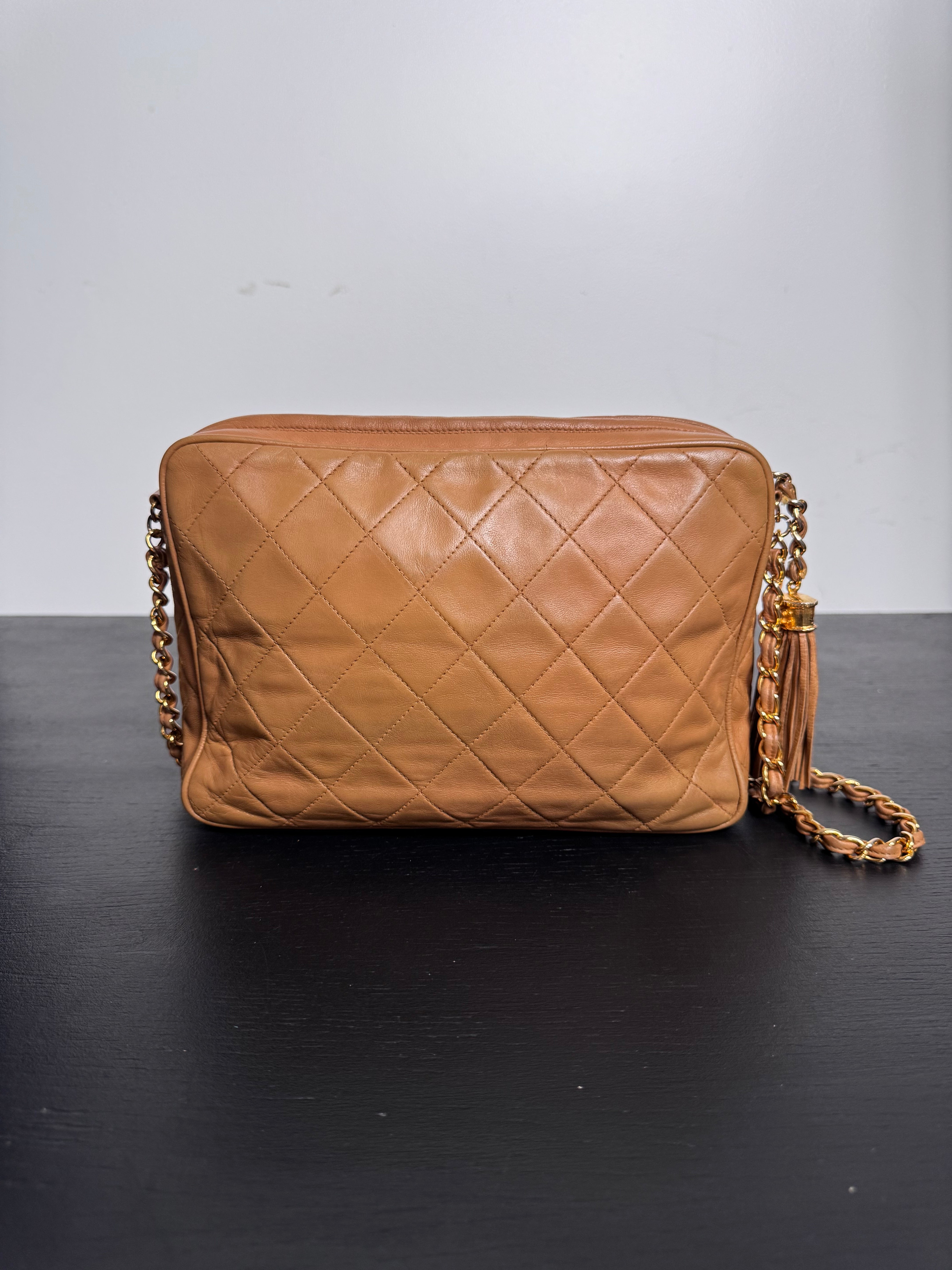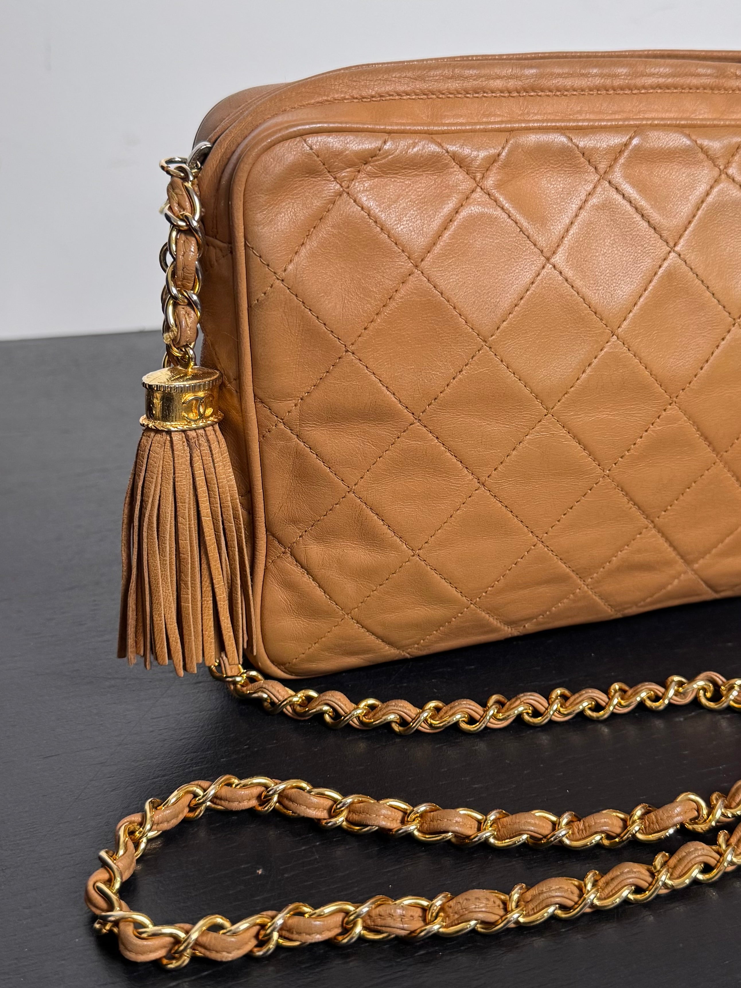 Sac caméra vintage caramel Chanel, en très bon état général. Présence du pompon Chanel.
