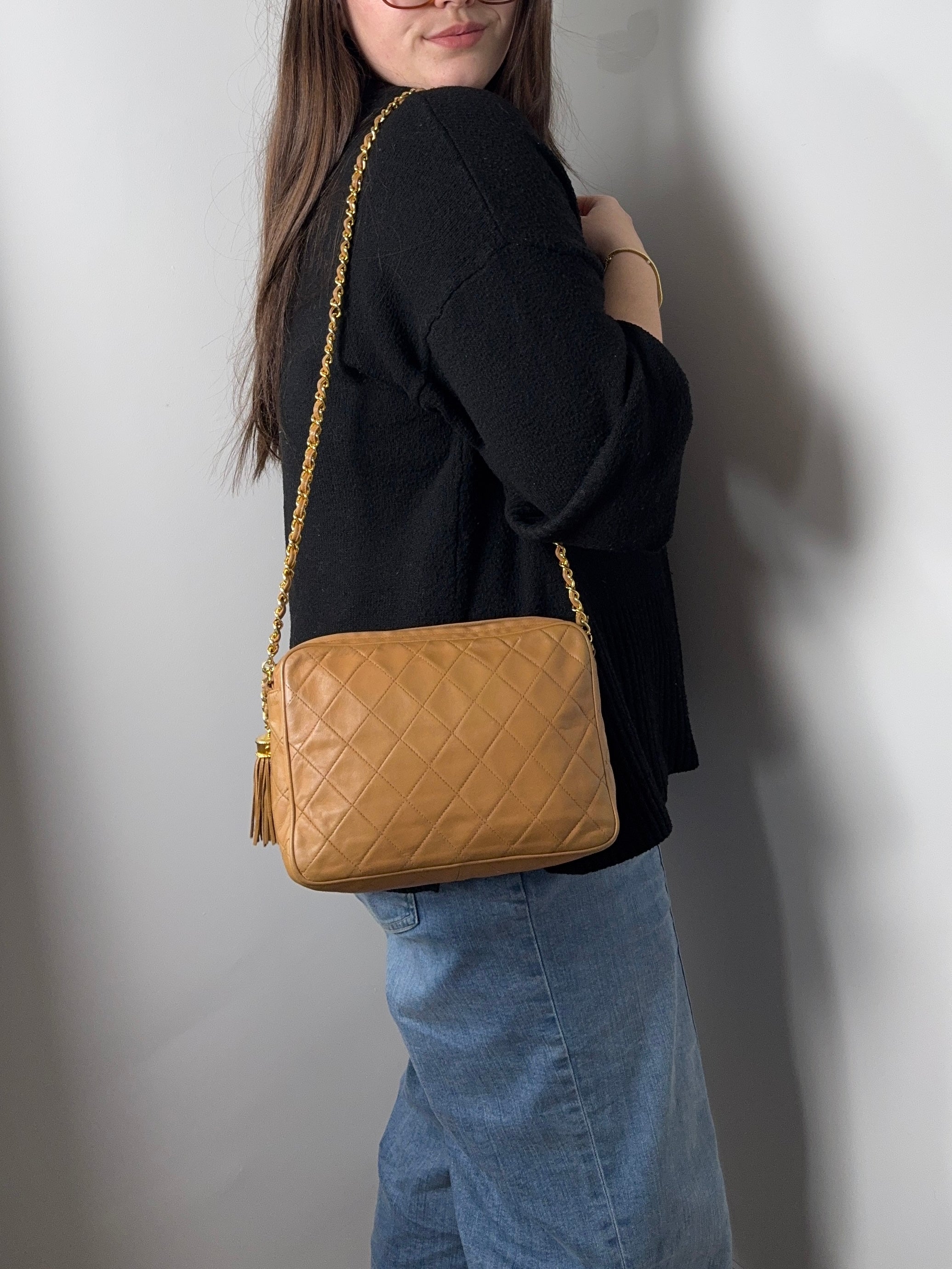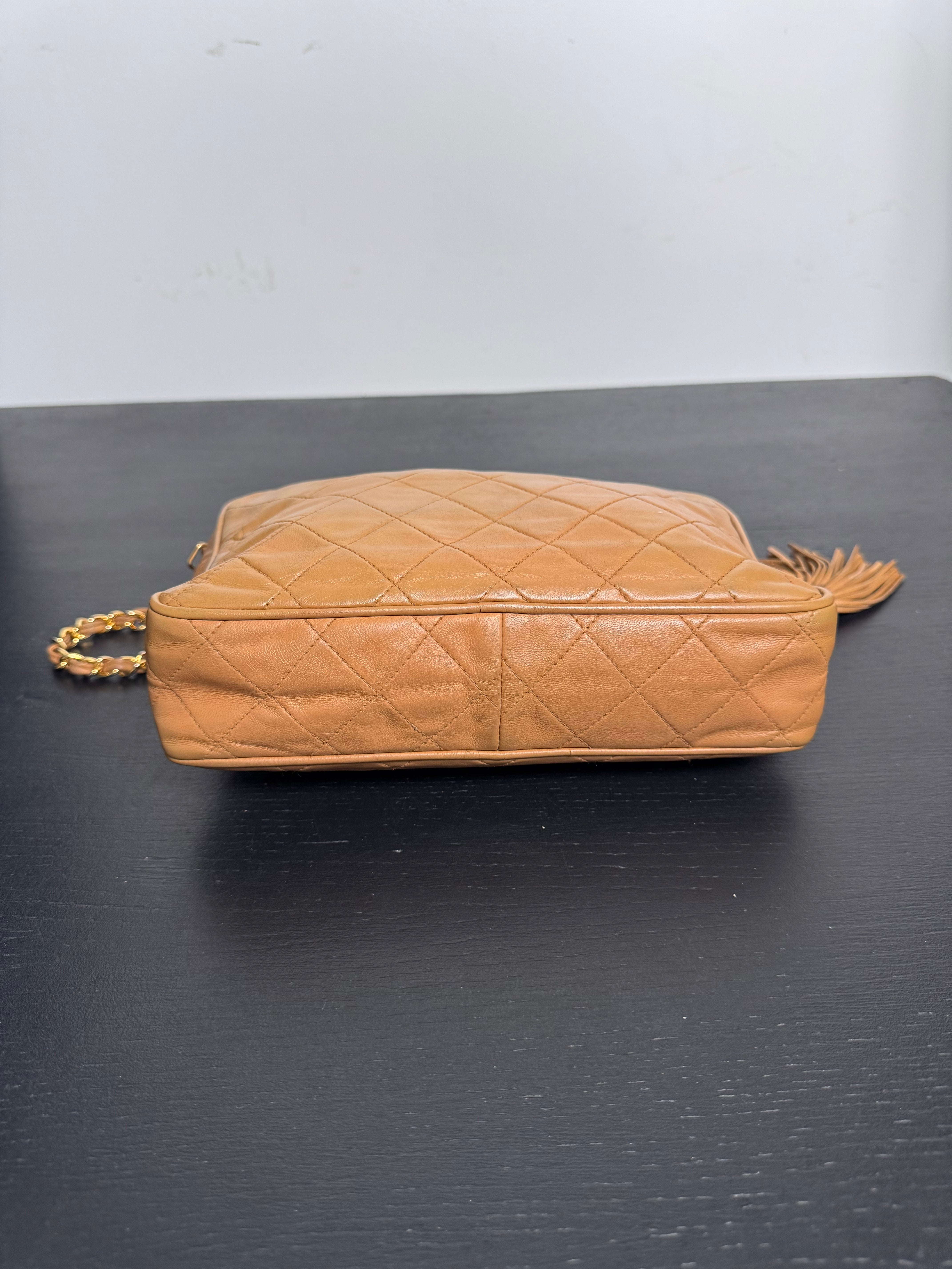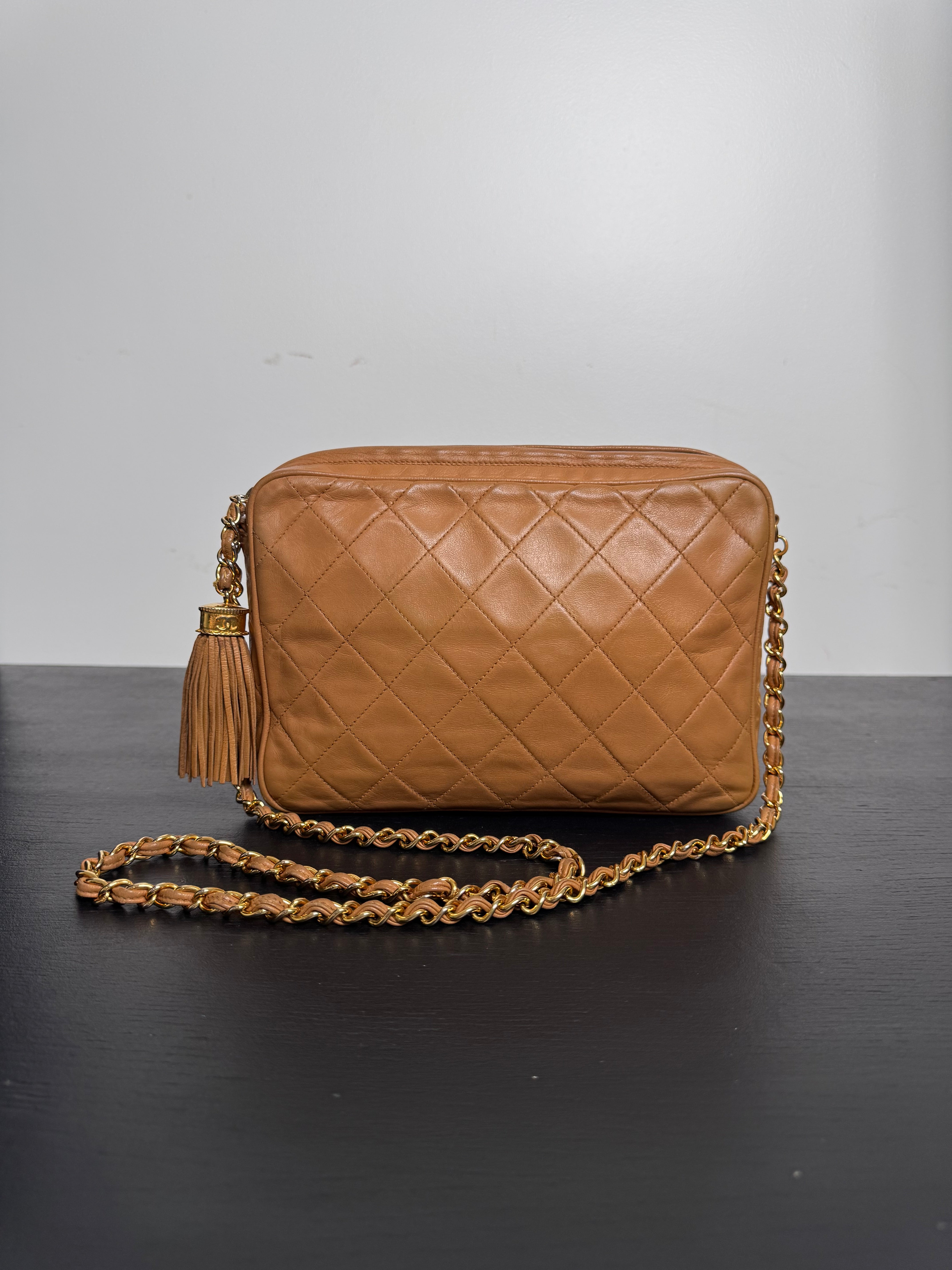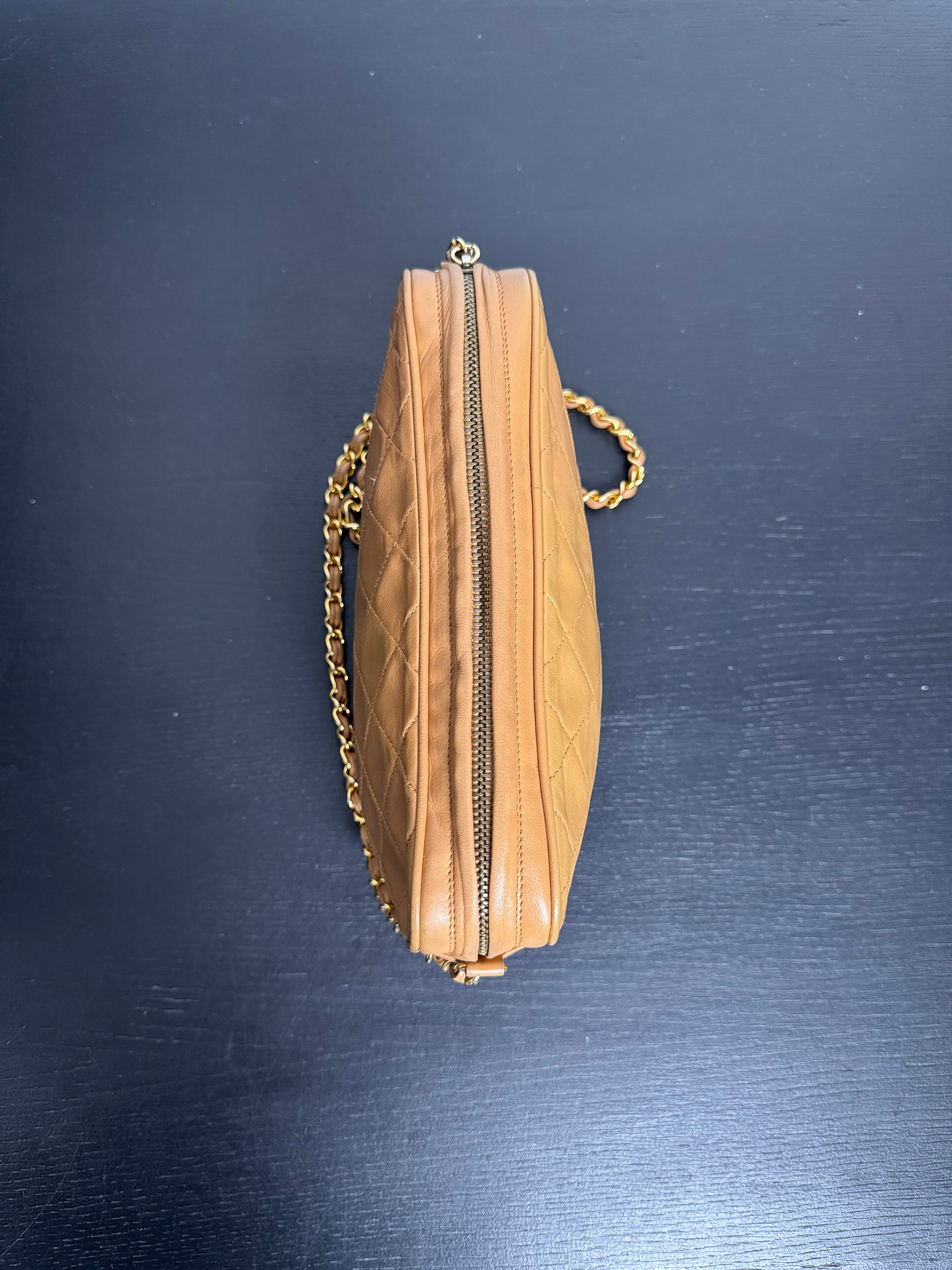 Sac caméra vintage caramel Chanel, en très bon état général. Présence du pompon Chanel.