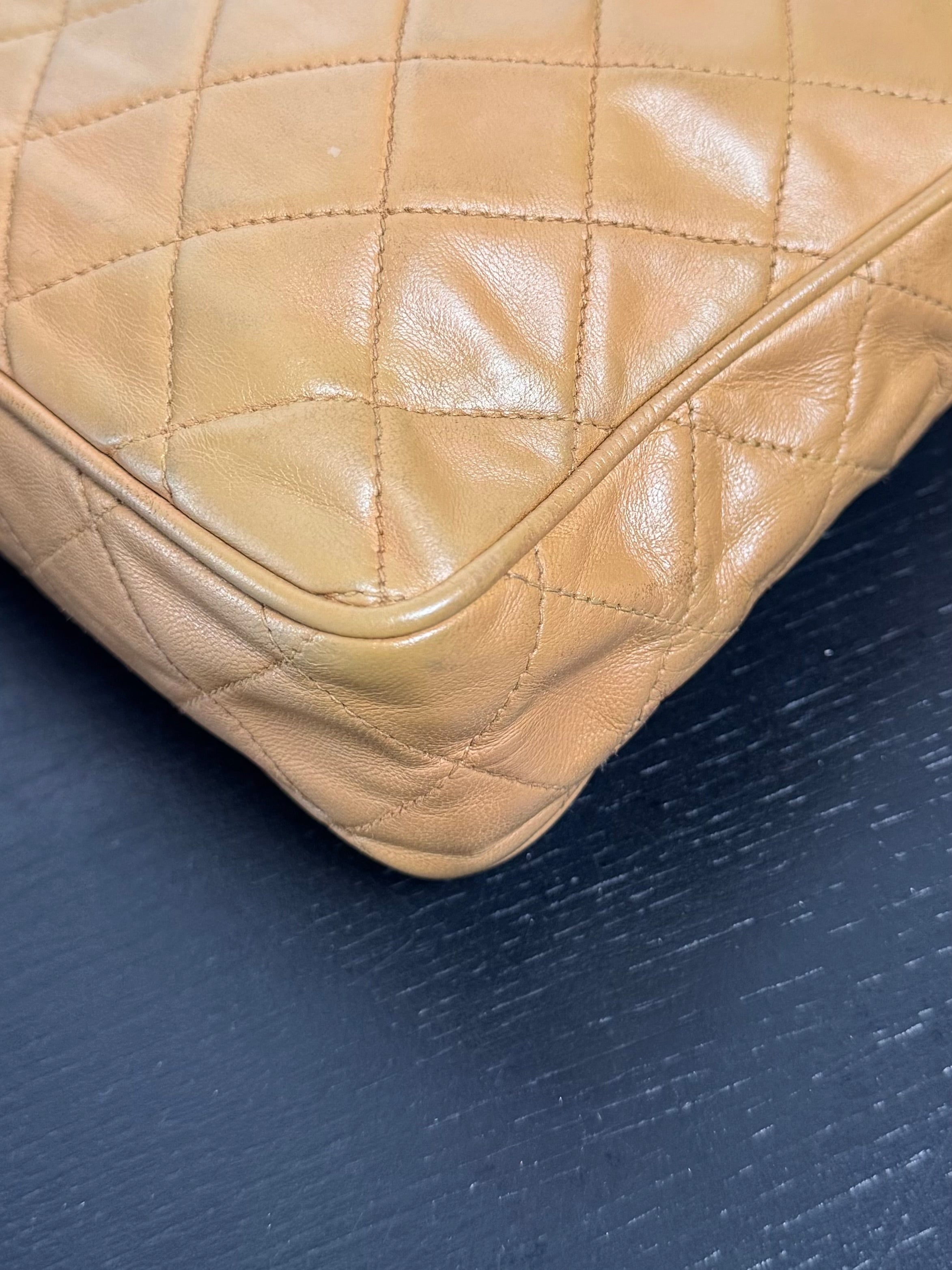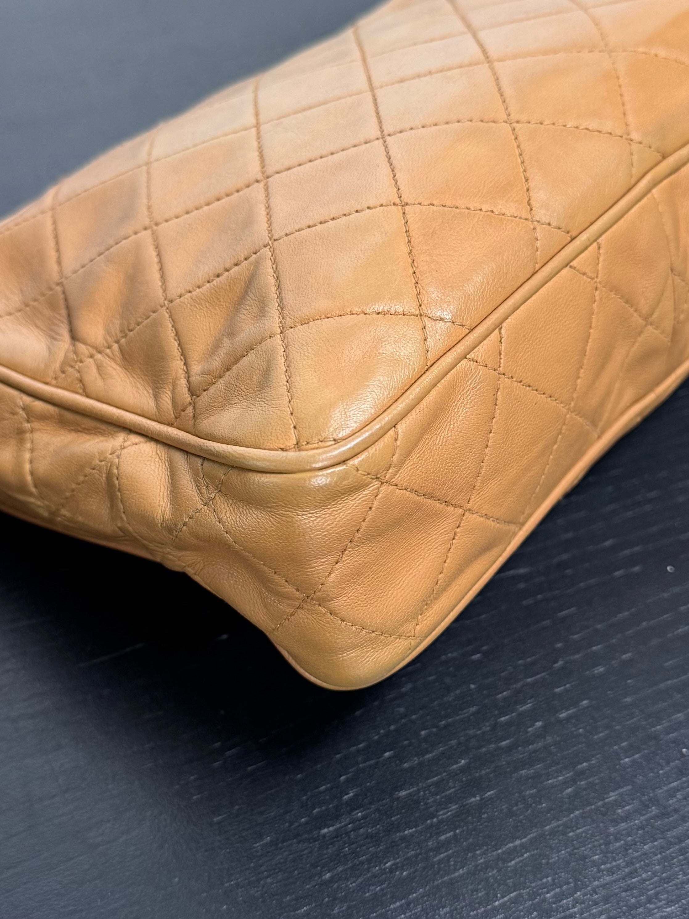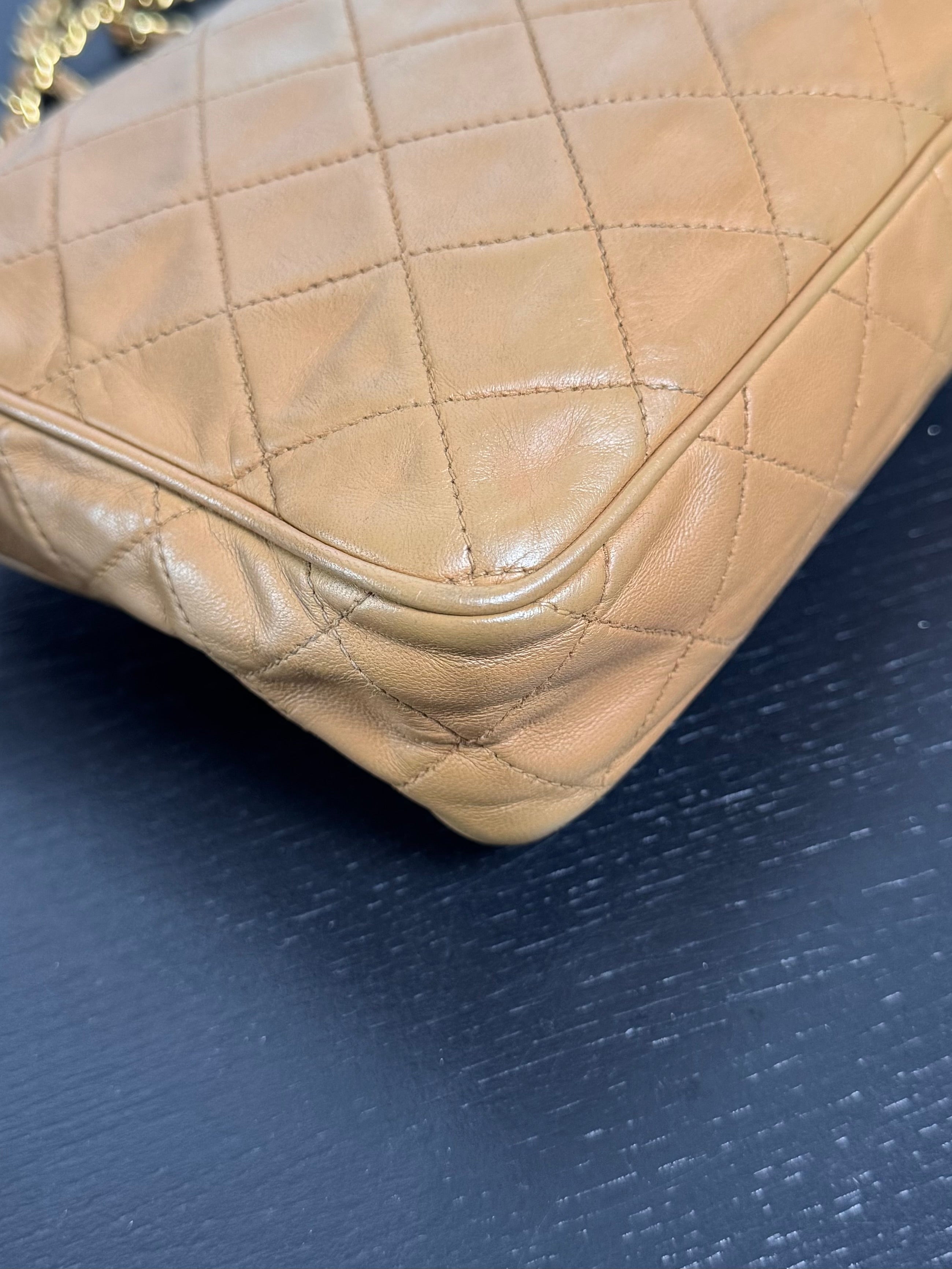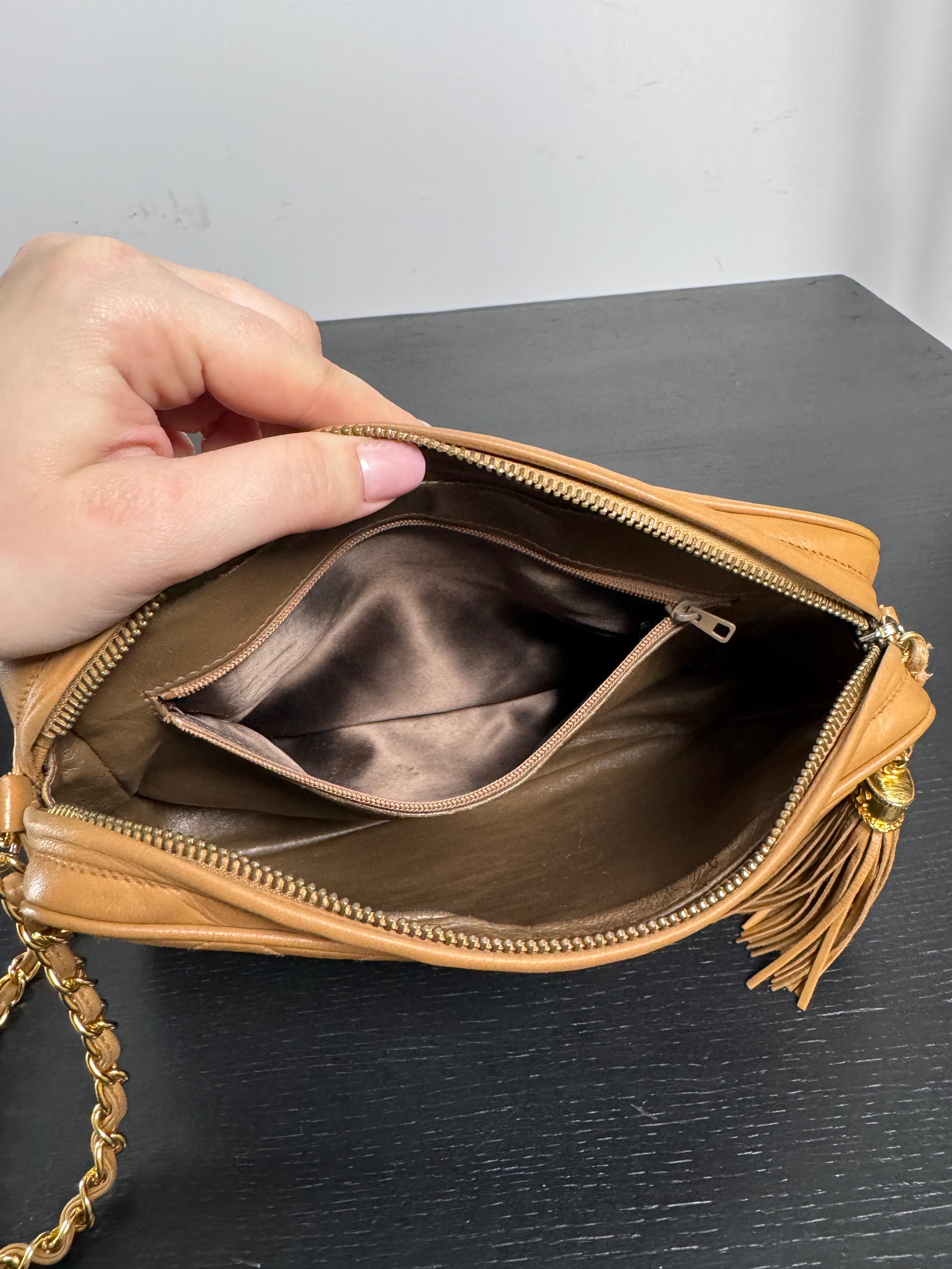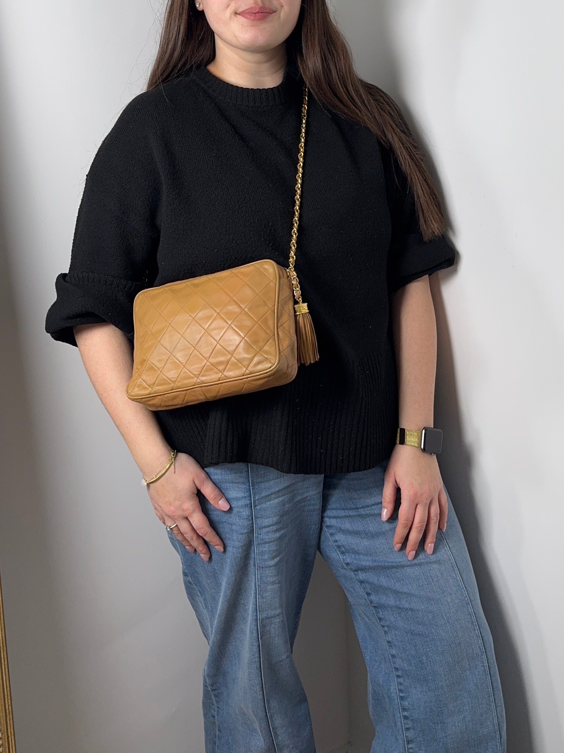 Sac caméra vintage caramel Chanel, en très bon état général. Présence du pompon Chanel.