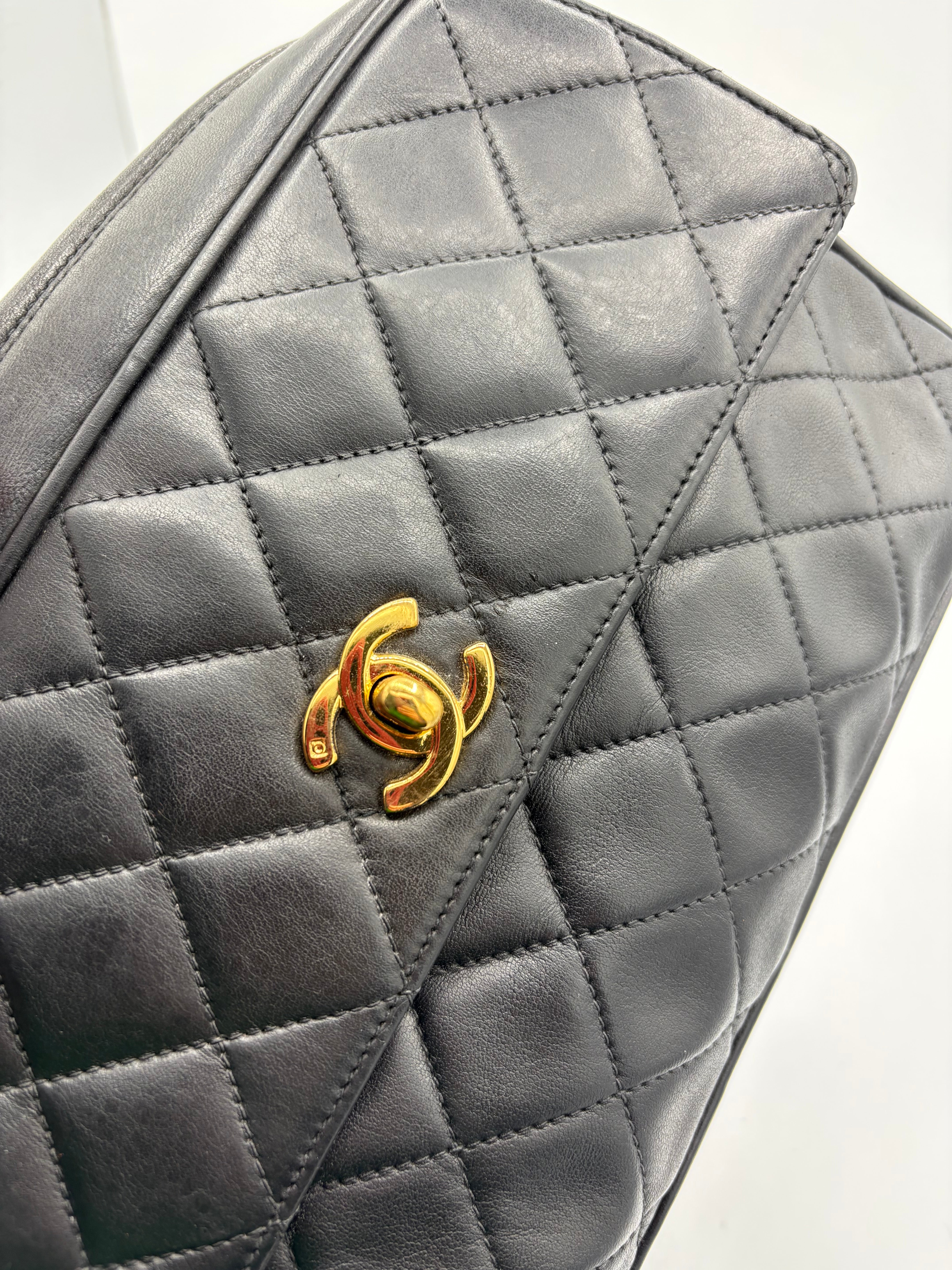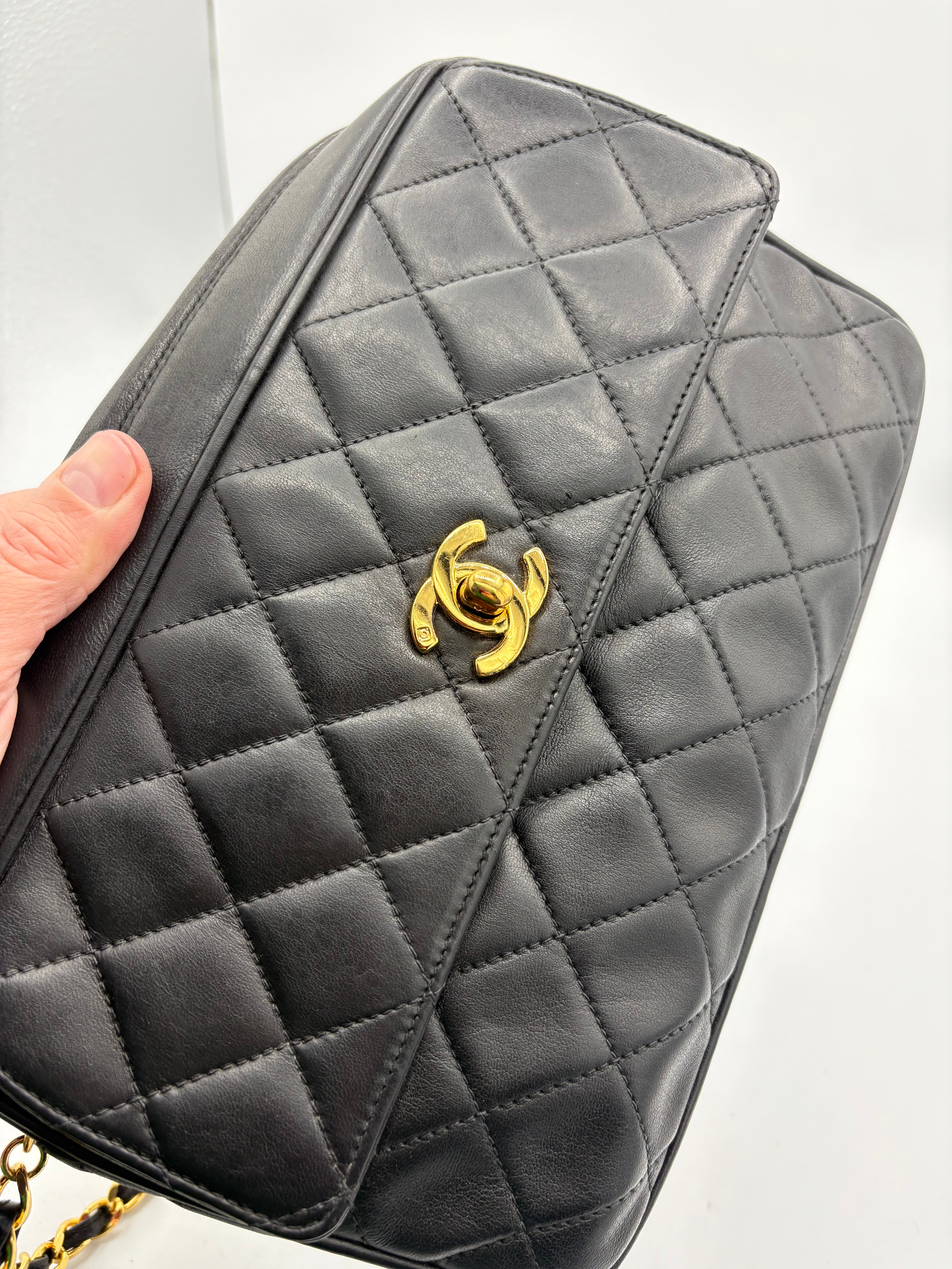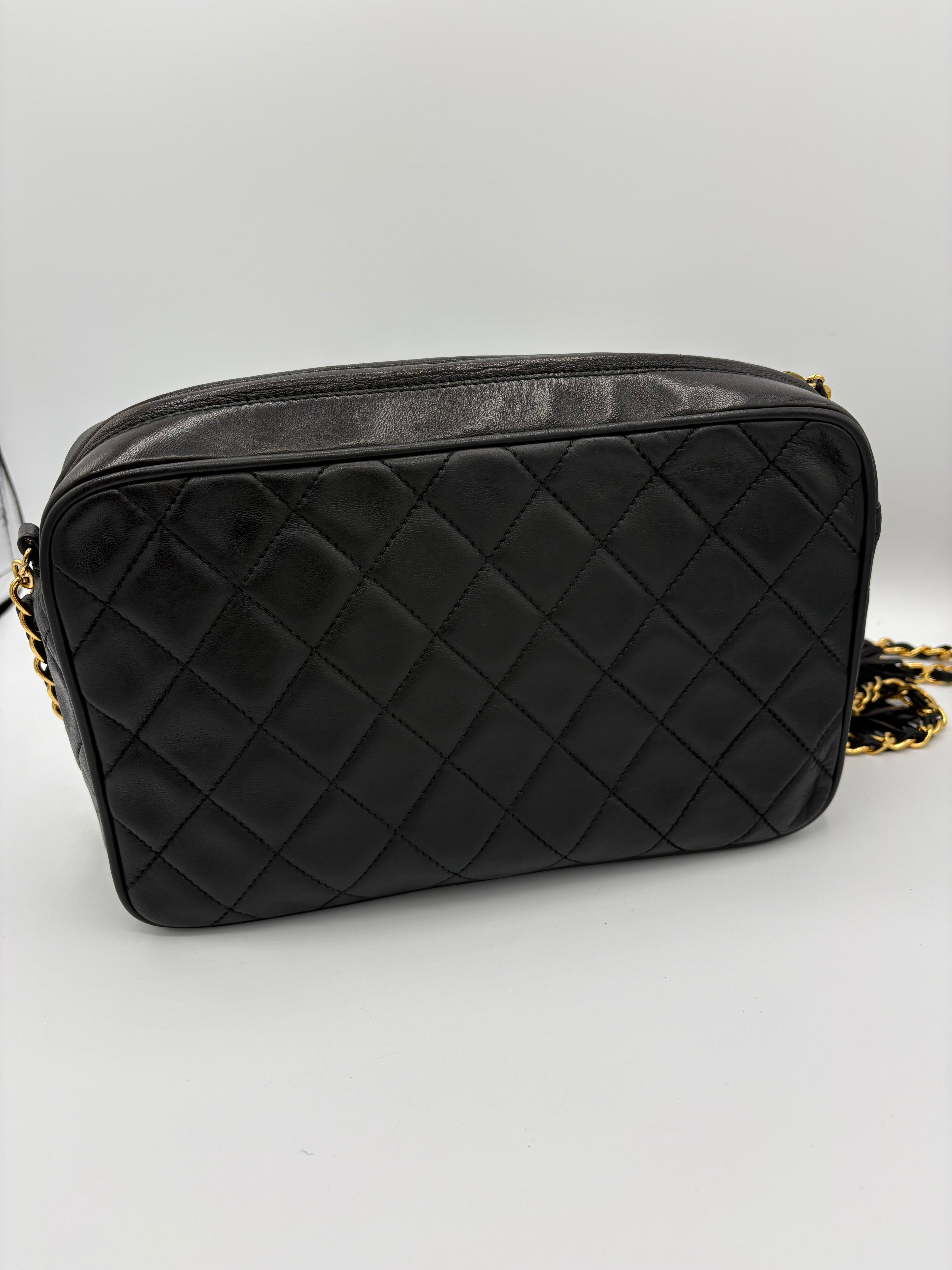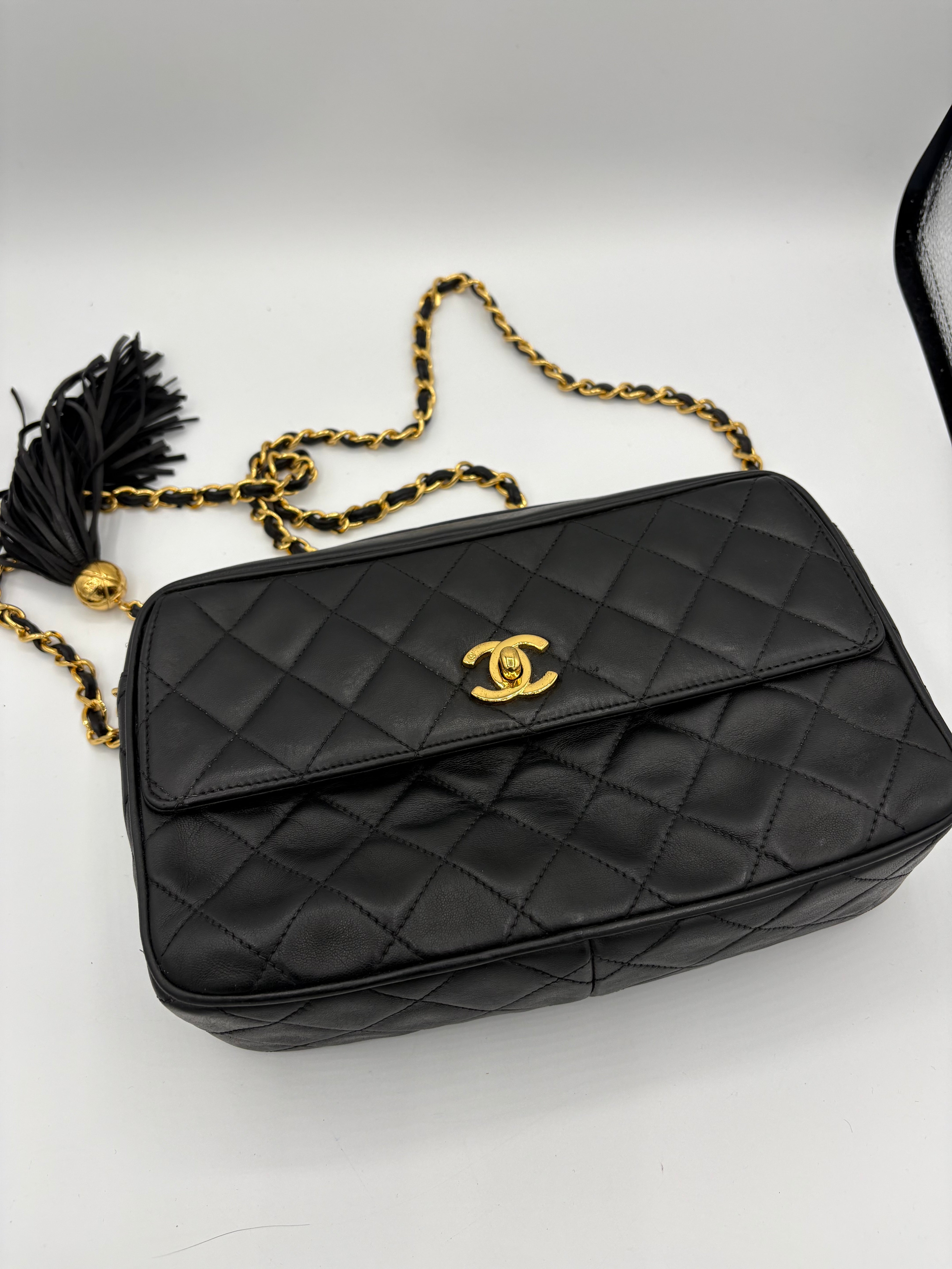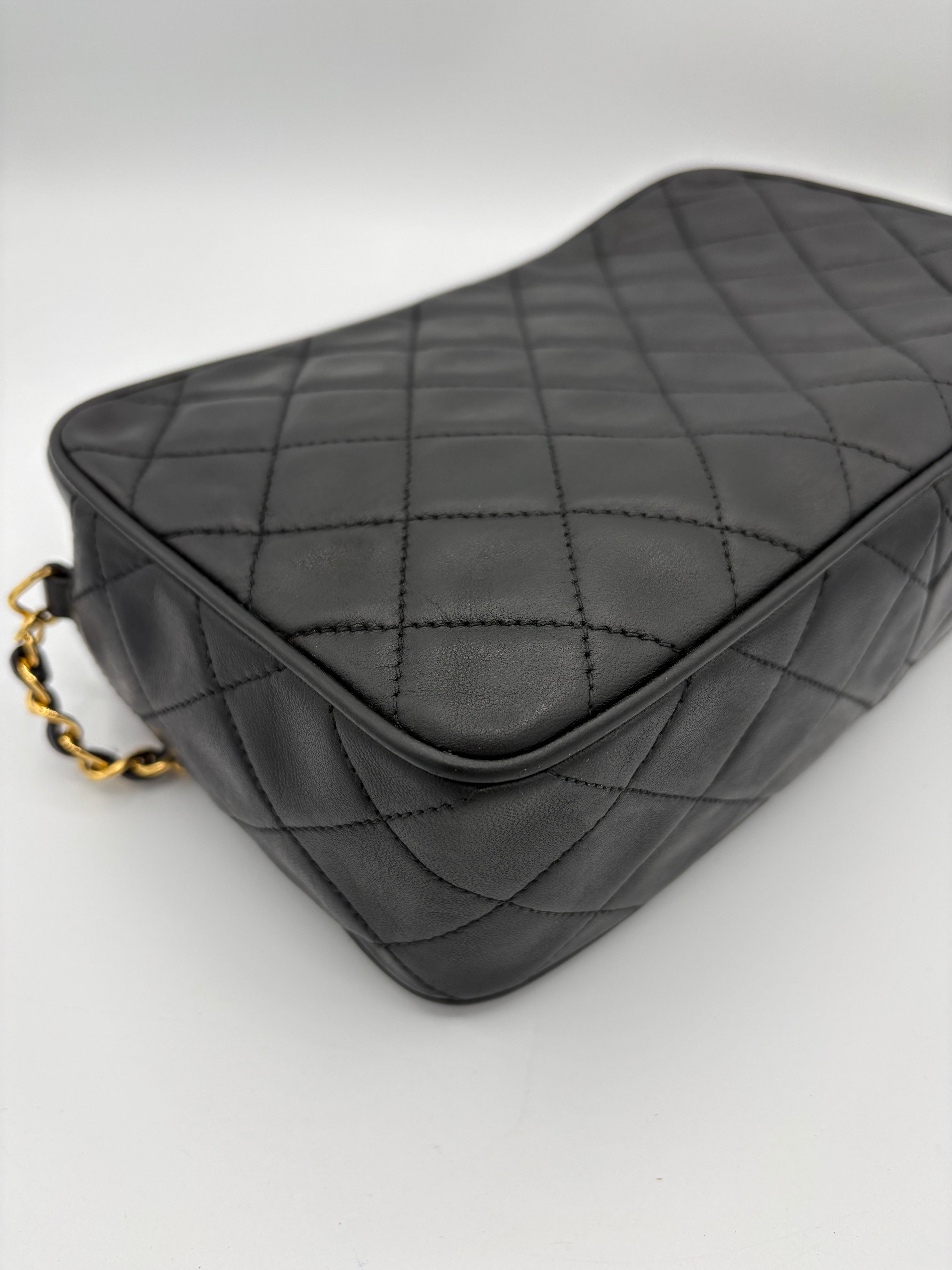 Sac Caméra chanel en cuir d'agneau en excellent état général. Une trace légérie sur le cuir à côté du fermoir visible en photo.