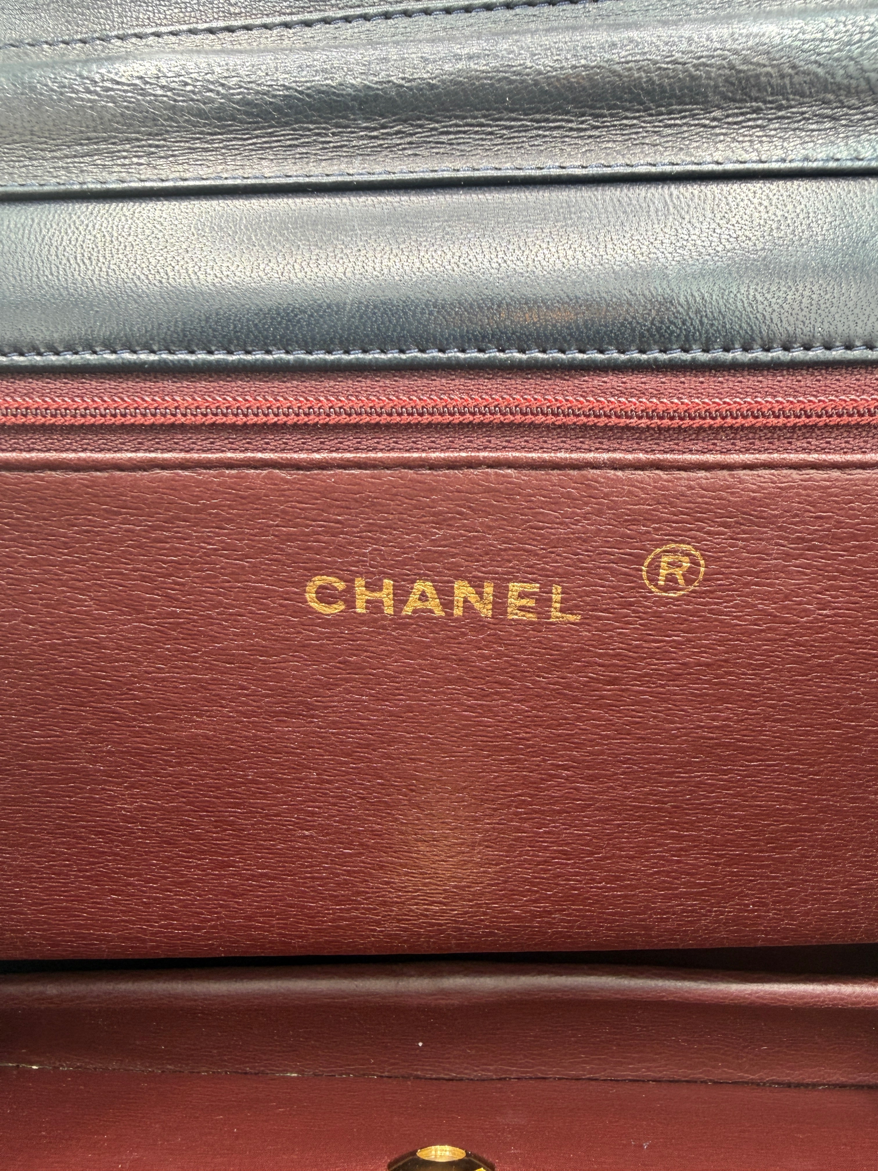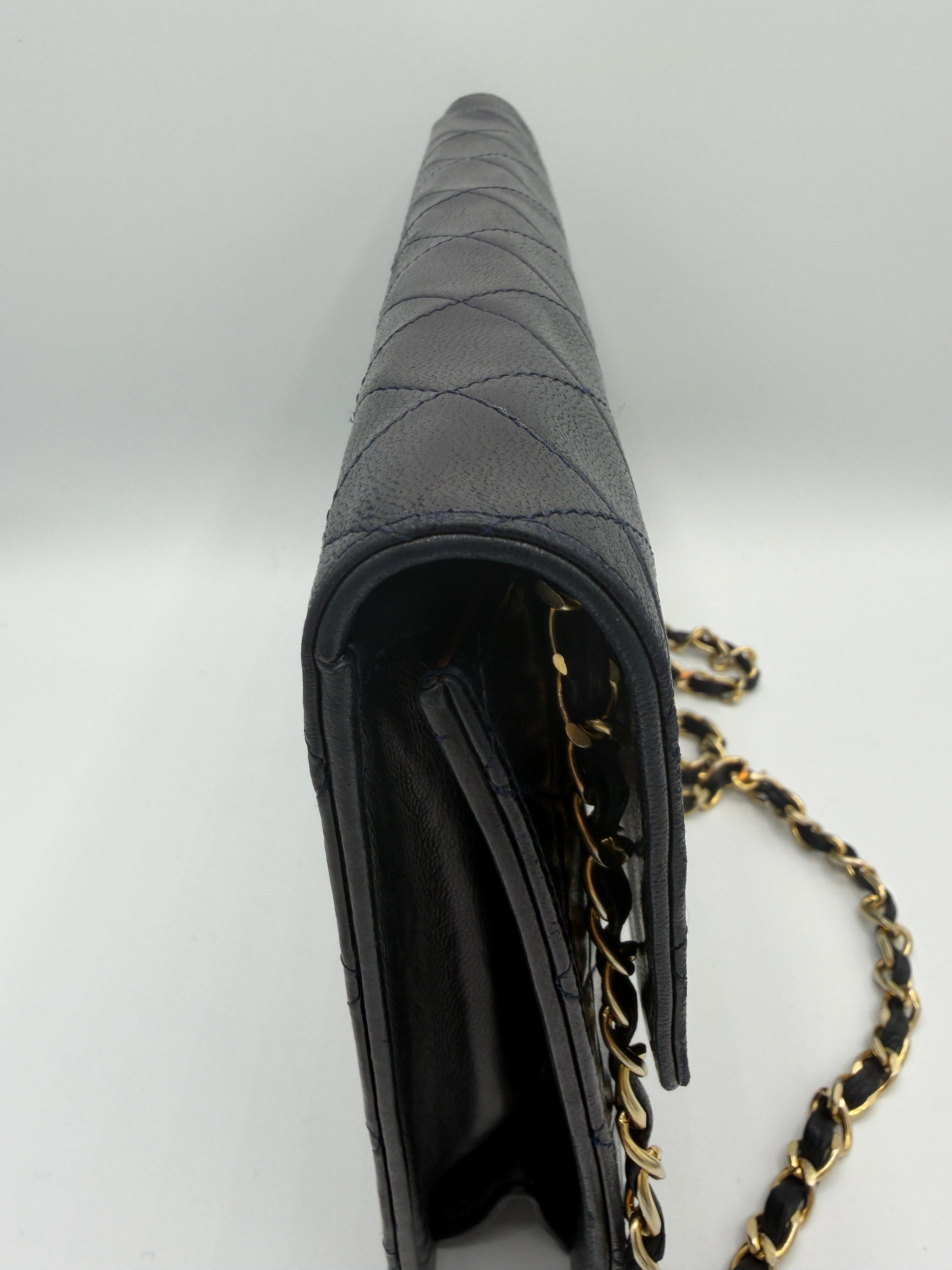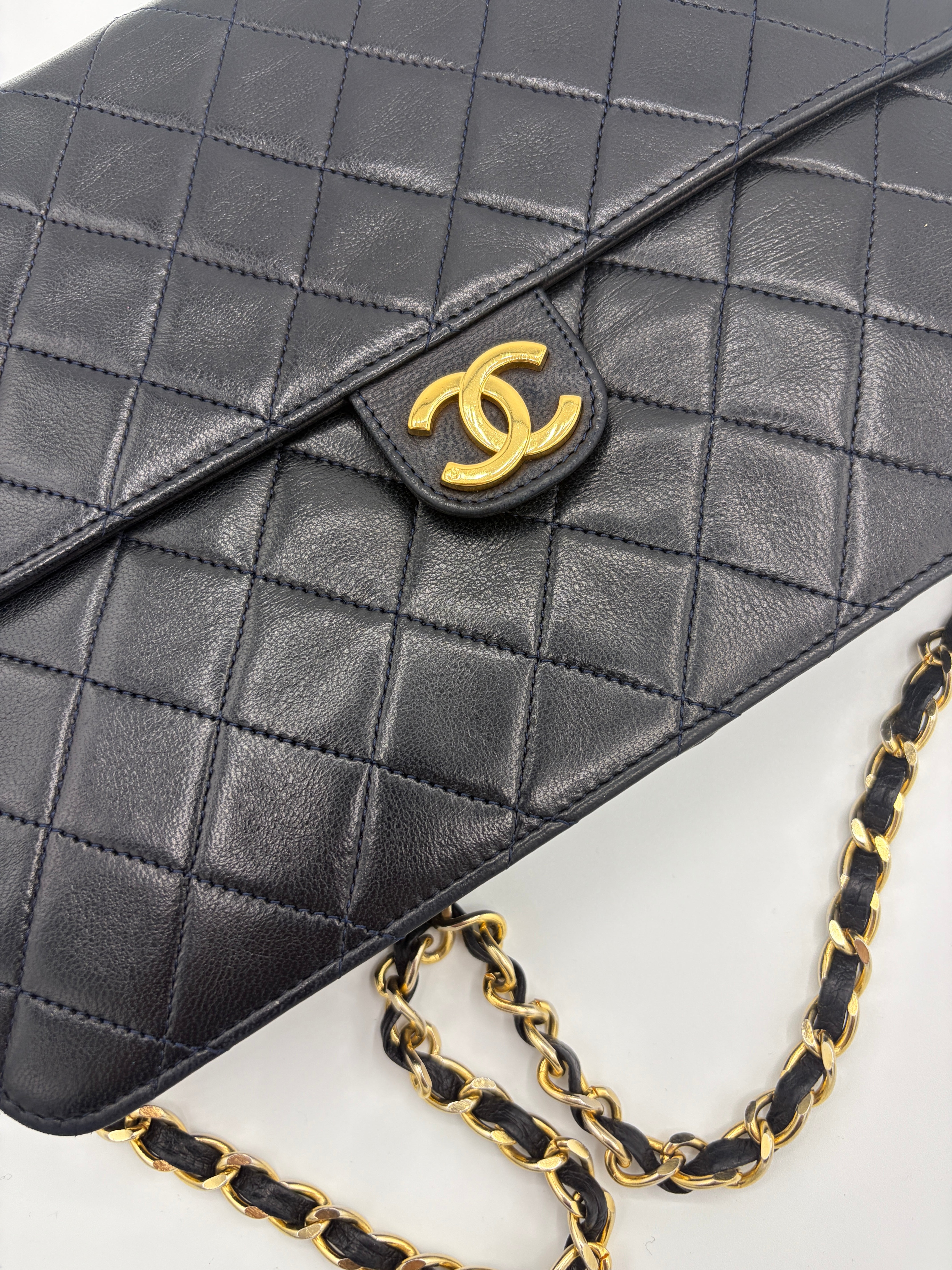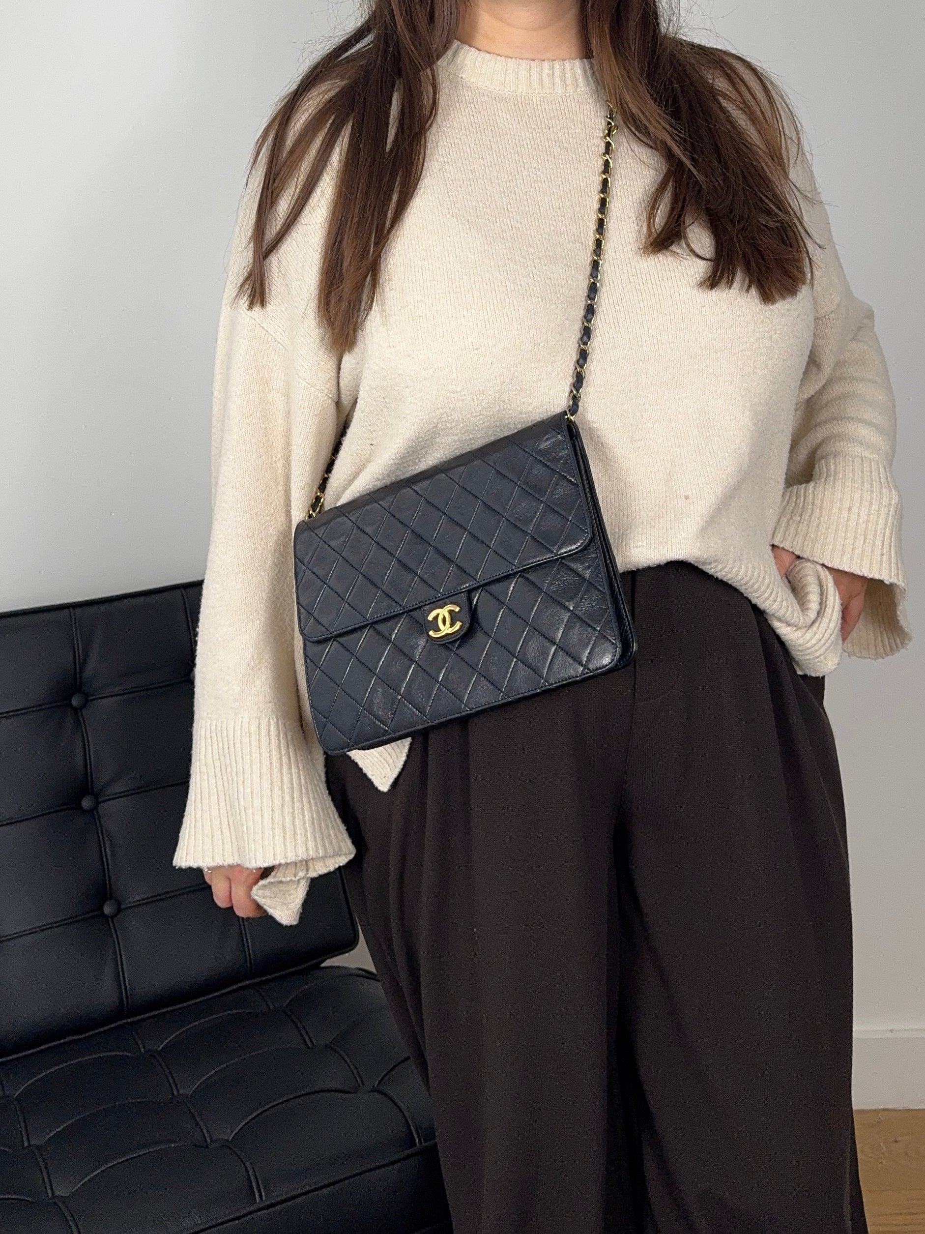 Cuir d’agneau bleu nuit très foncé tirant vers le noir parfait, ne présentant aucune trace.