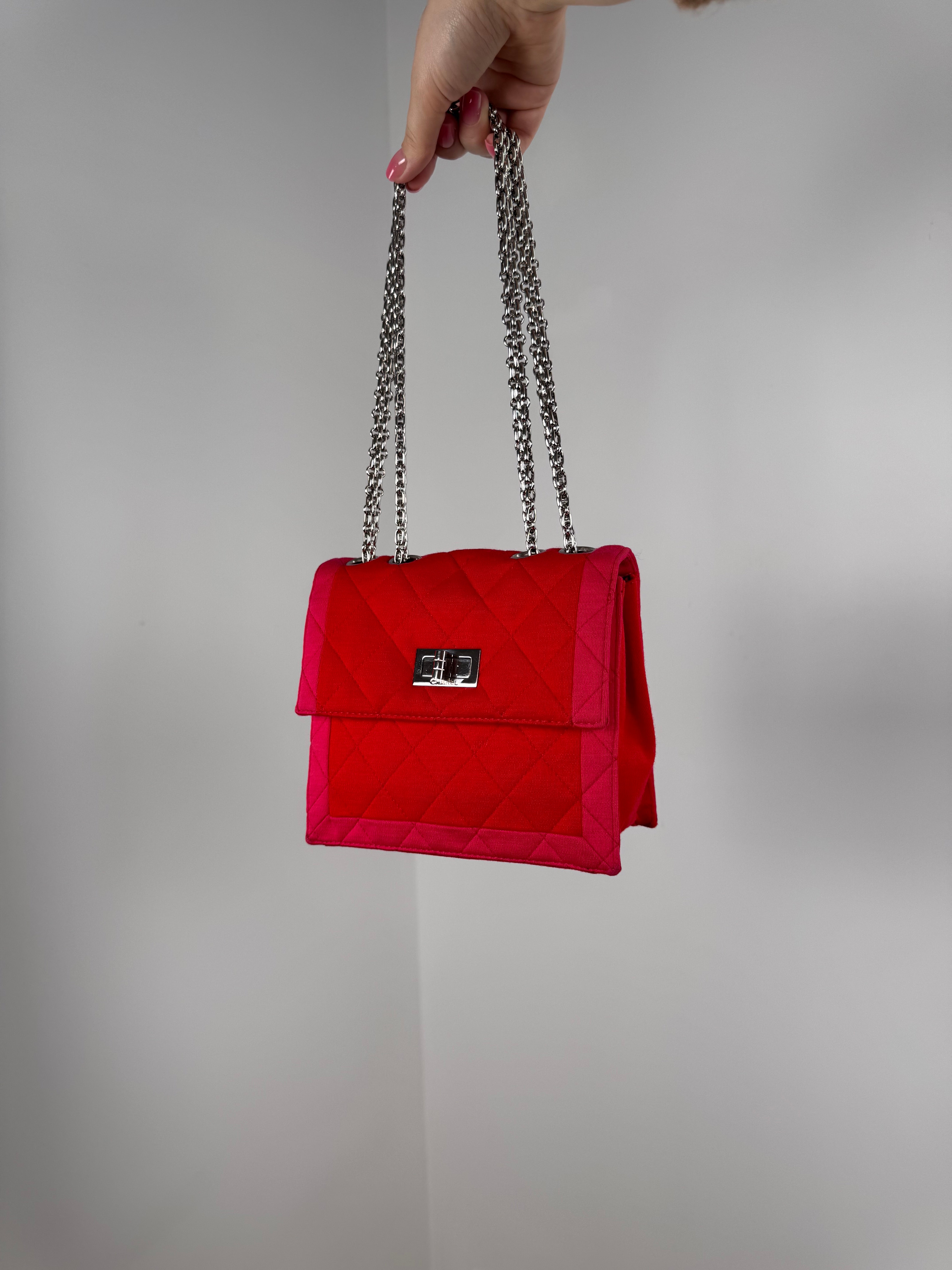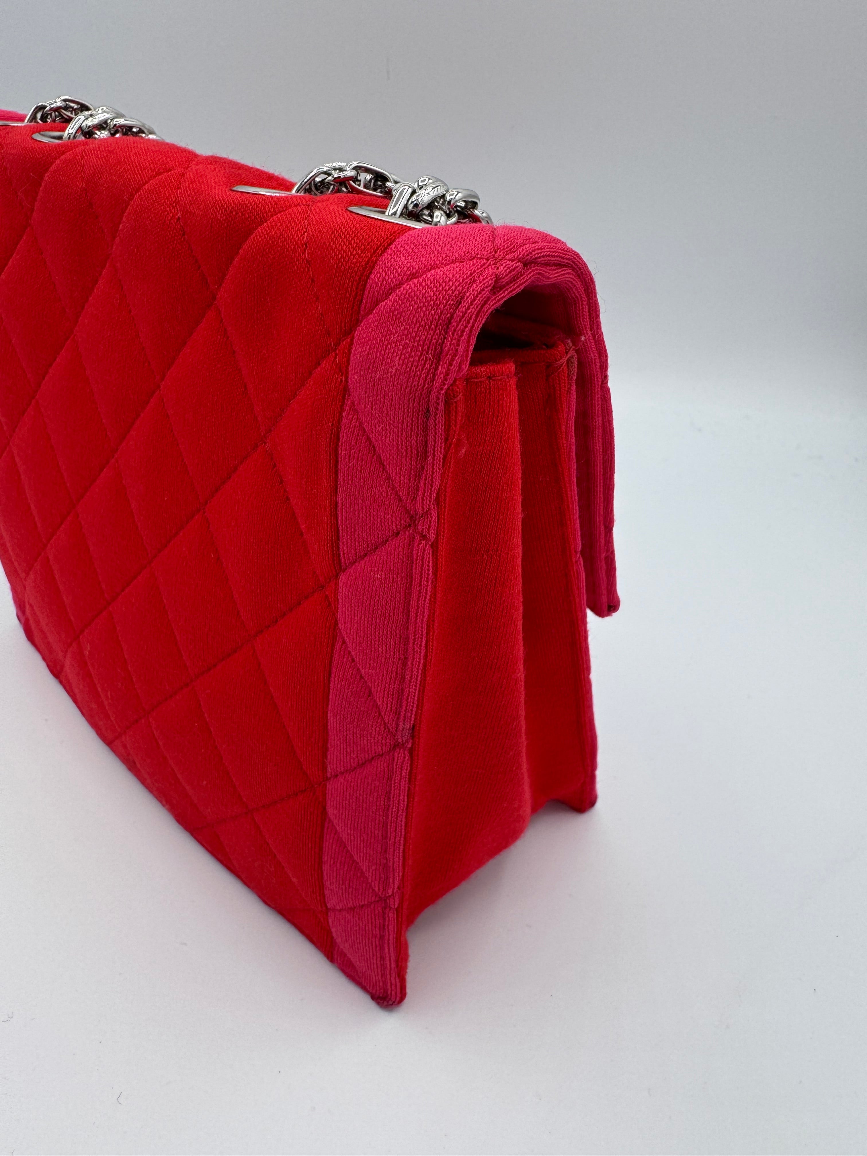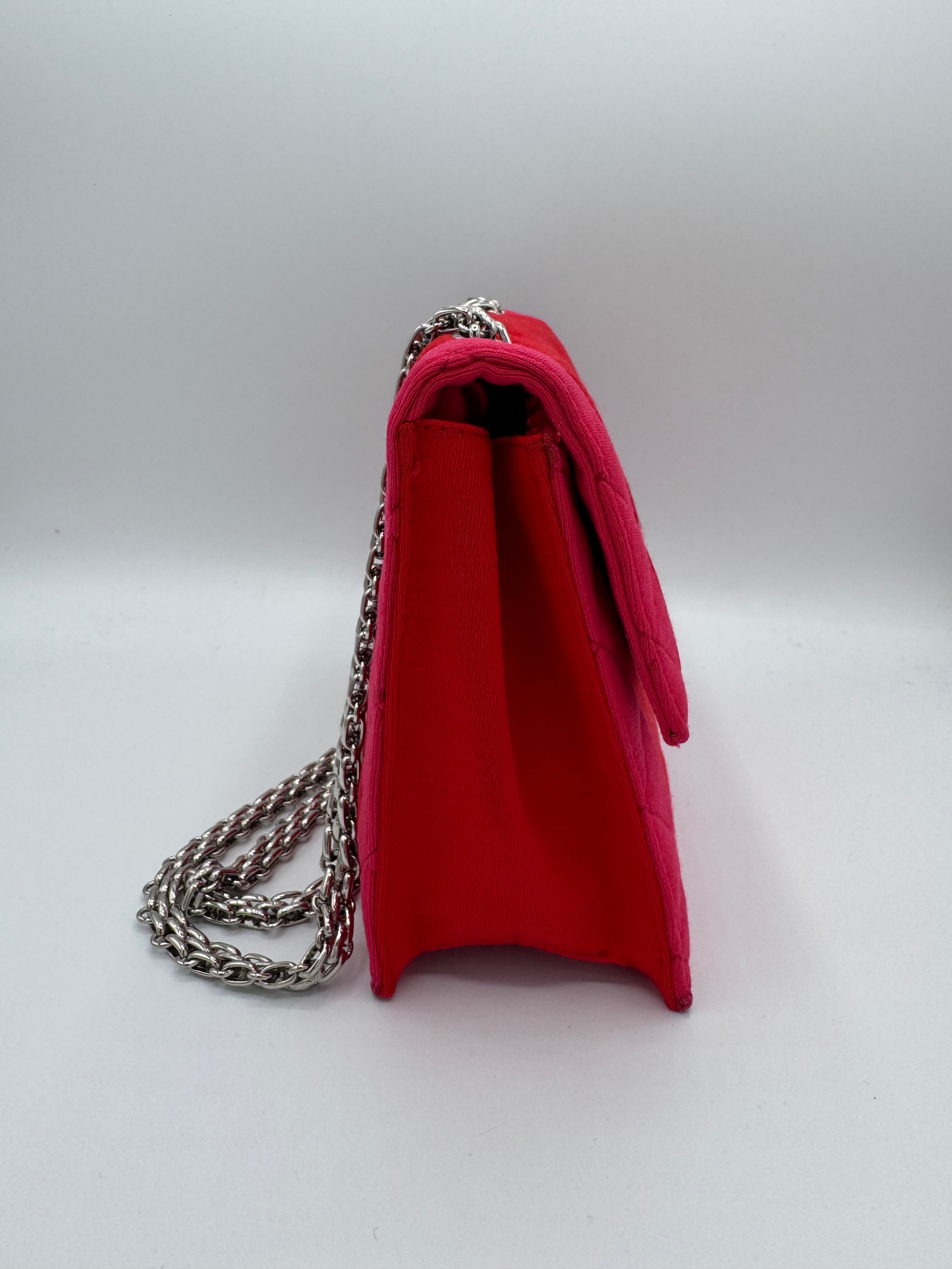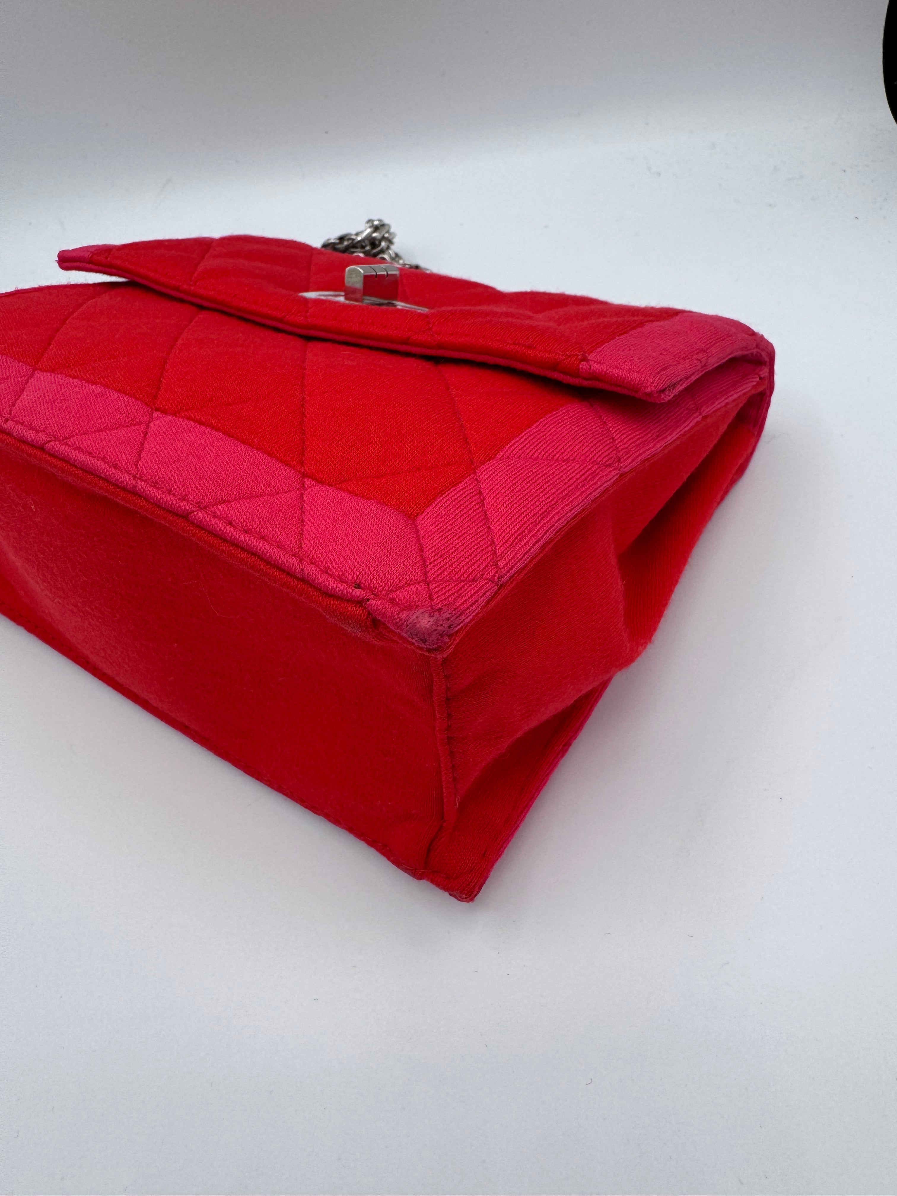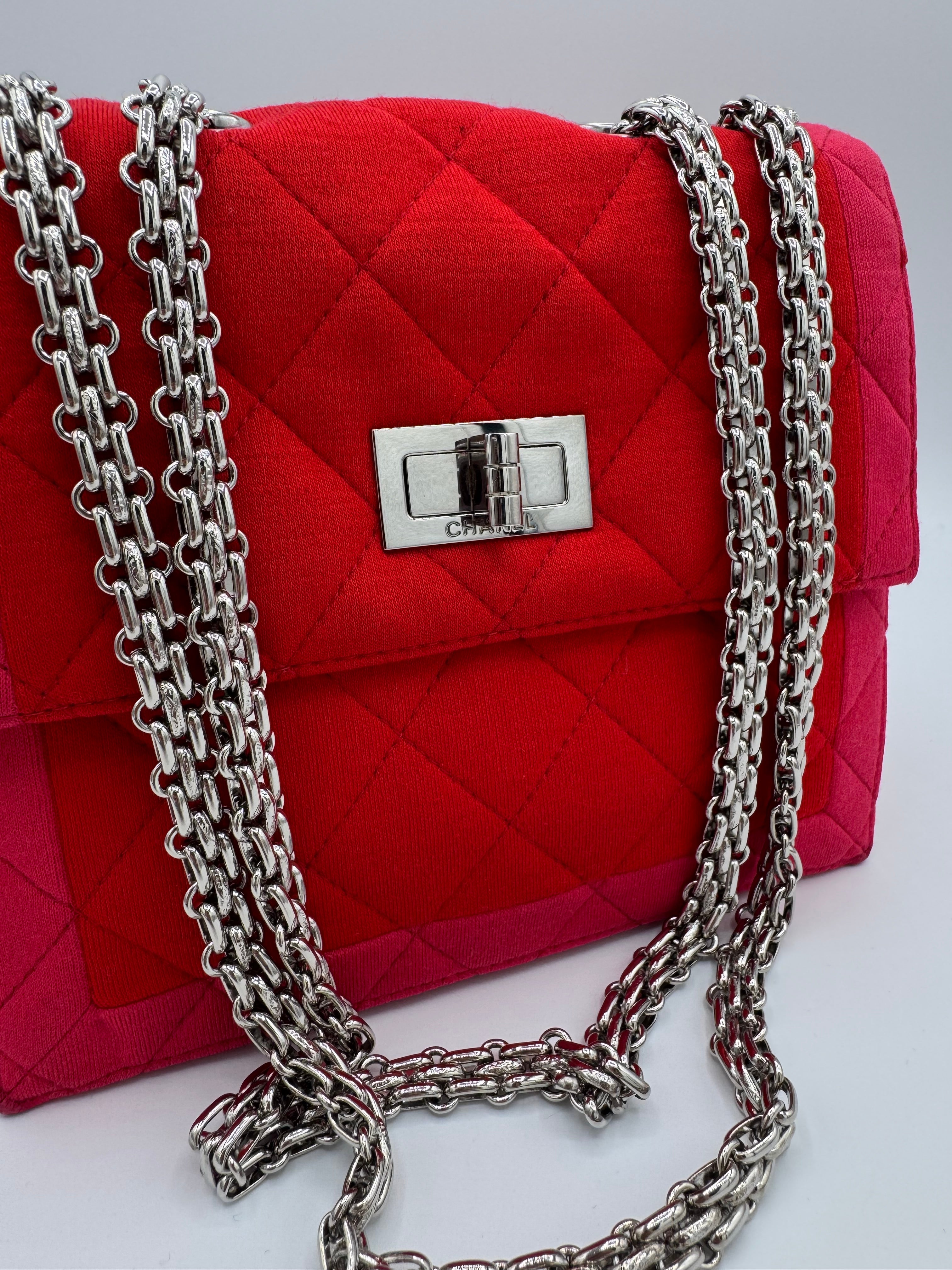 Sac Colelction Défilé 2.55 de chez Chanel, en jersey rouge et rose, bijouterie argent, en très bon état.