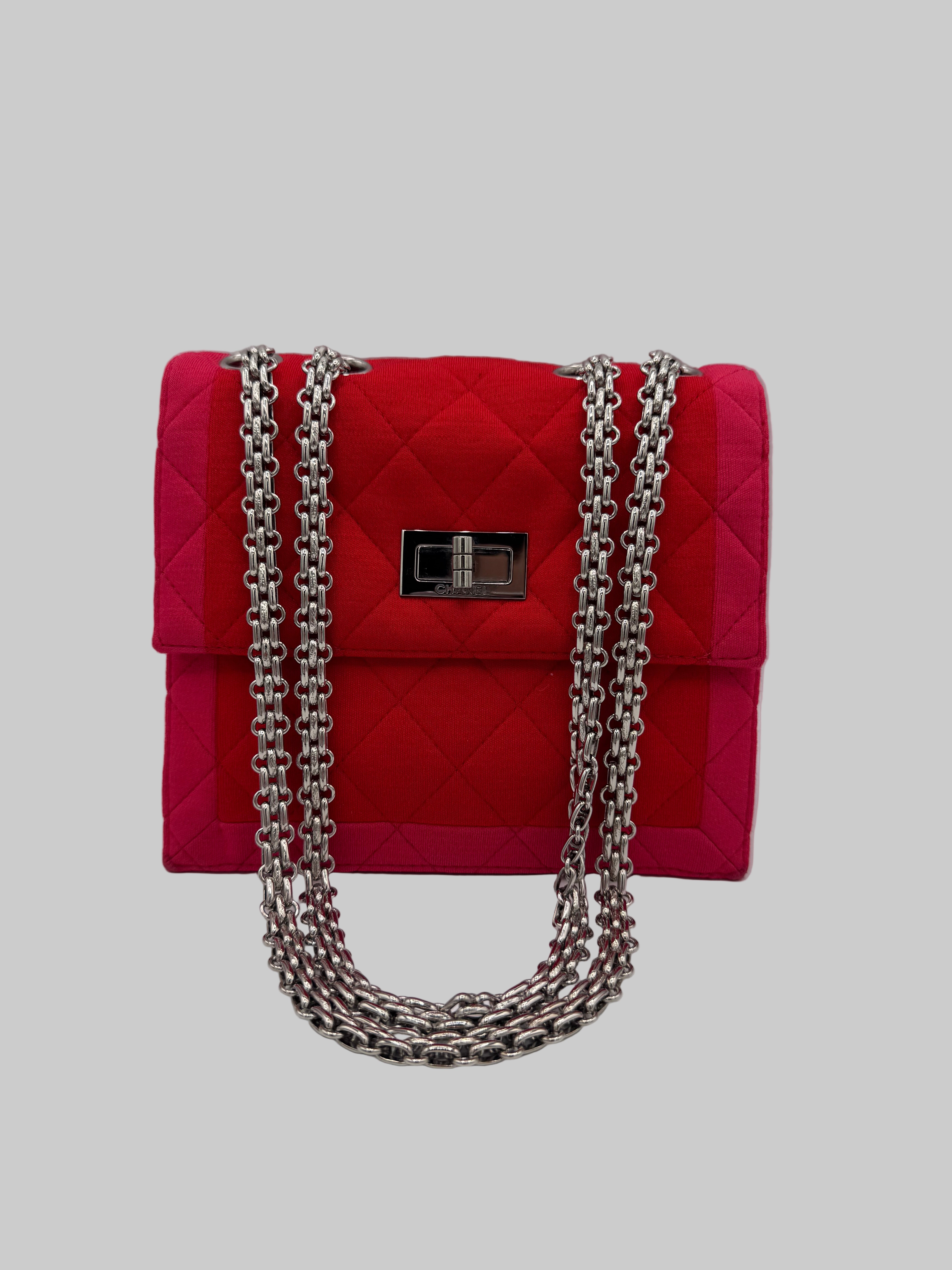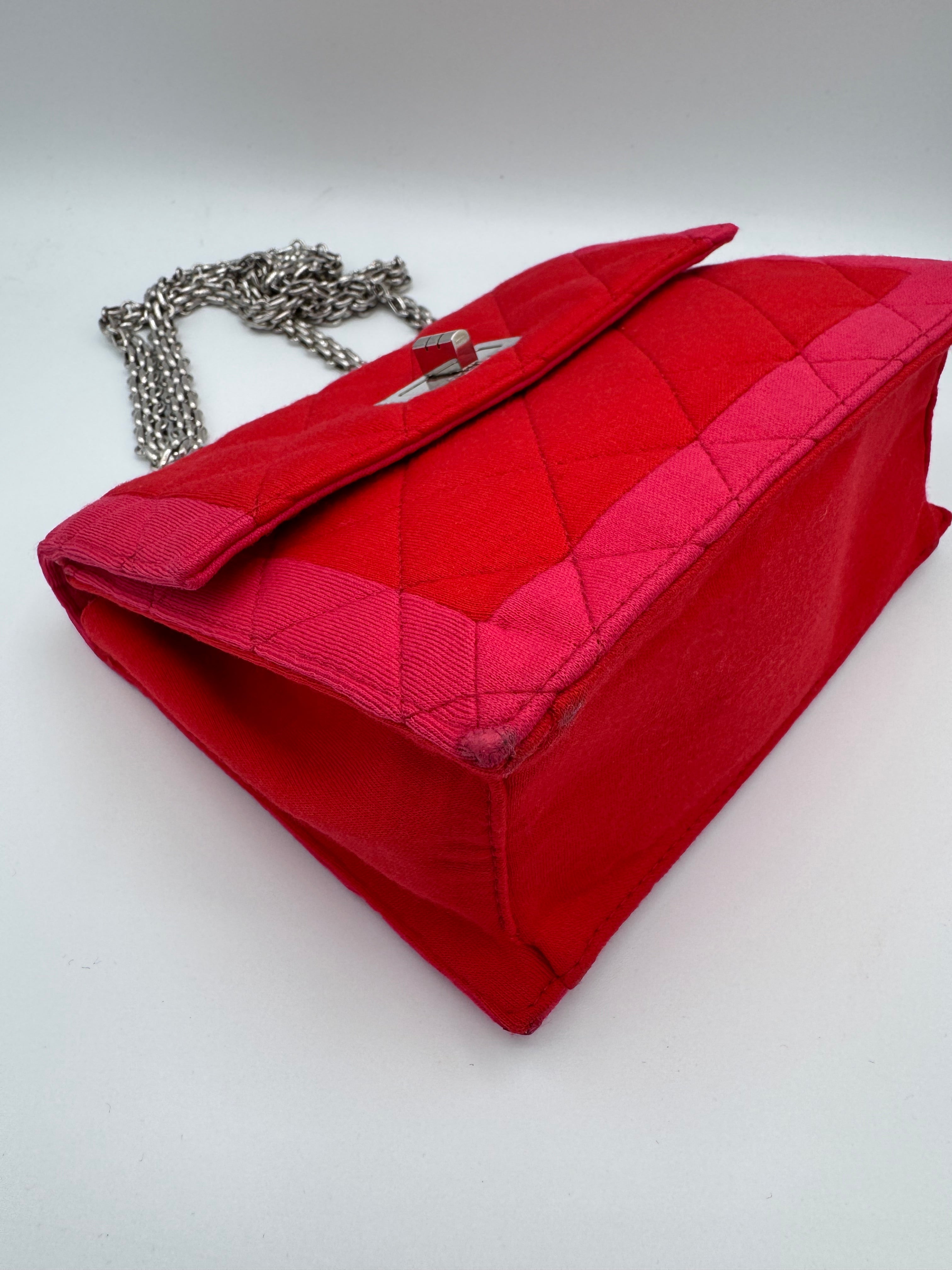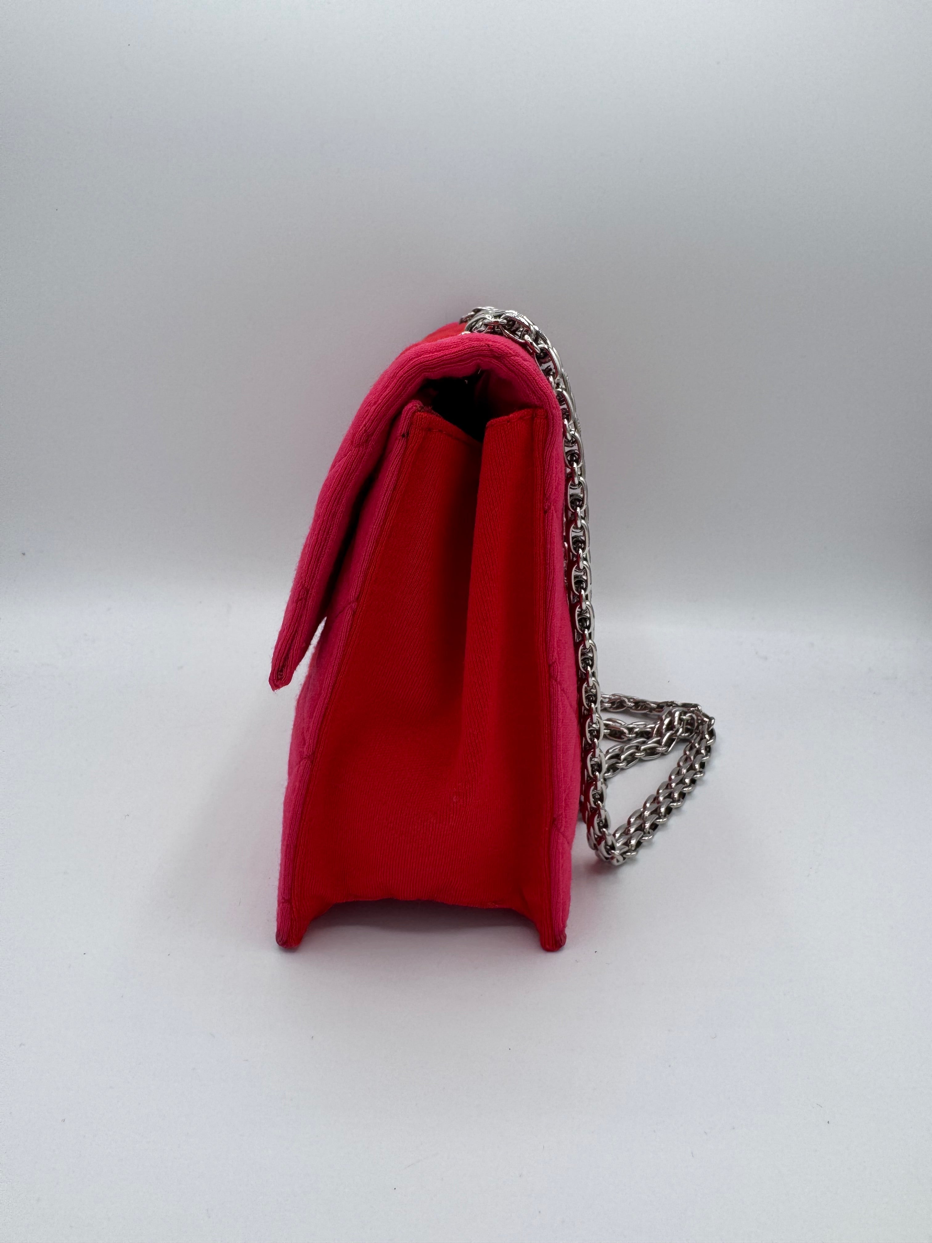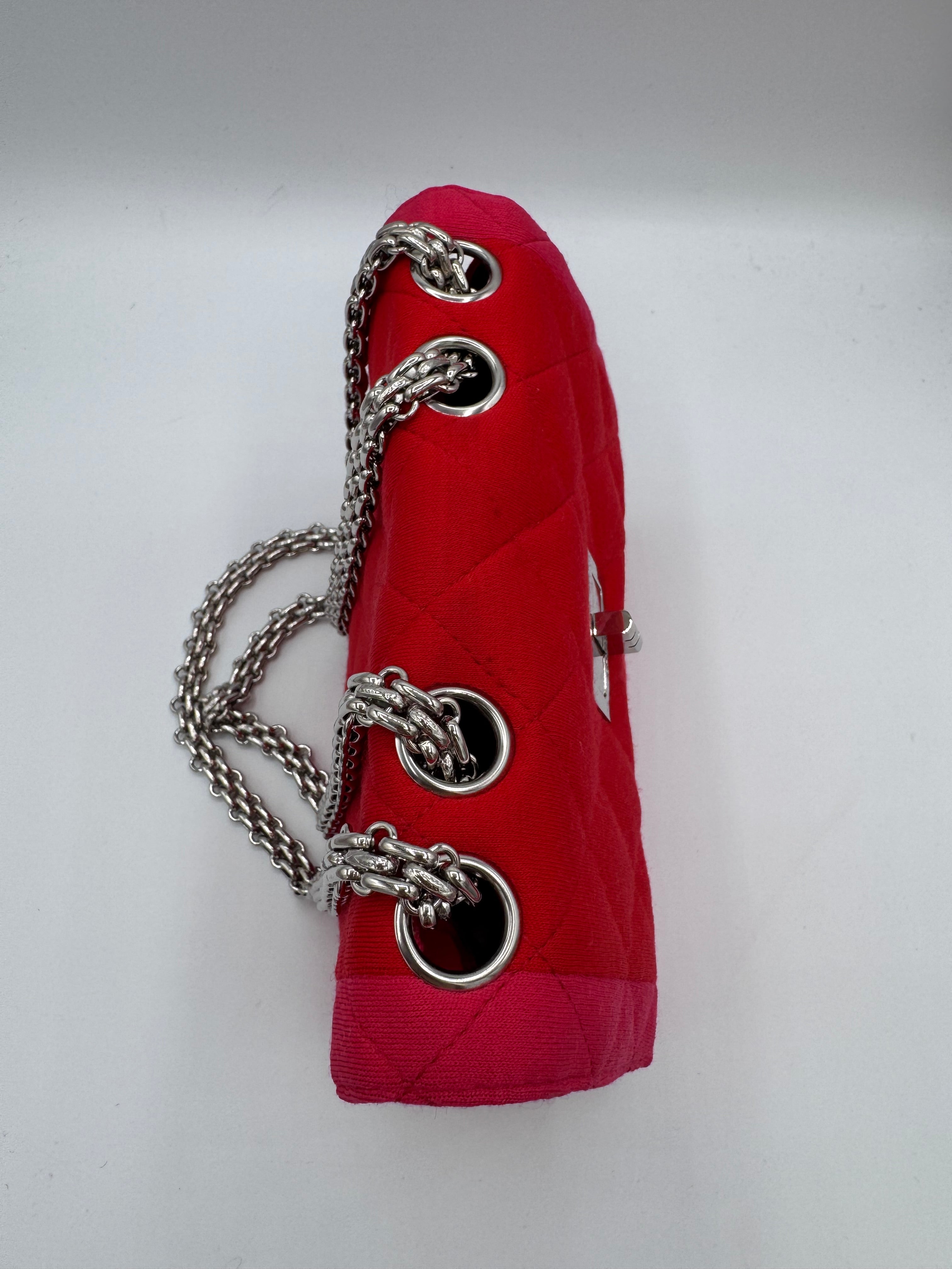 Sac Colelction Défilé 2.55 de chez Chanel, en jersey rouge et rose, bijouterie argent, en très bon état.