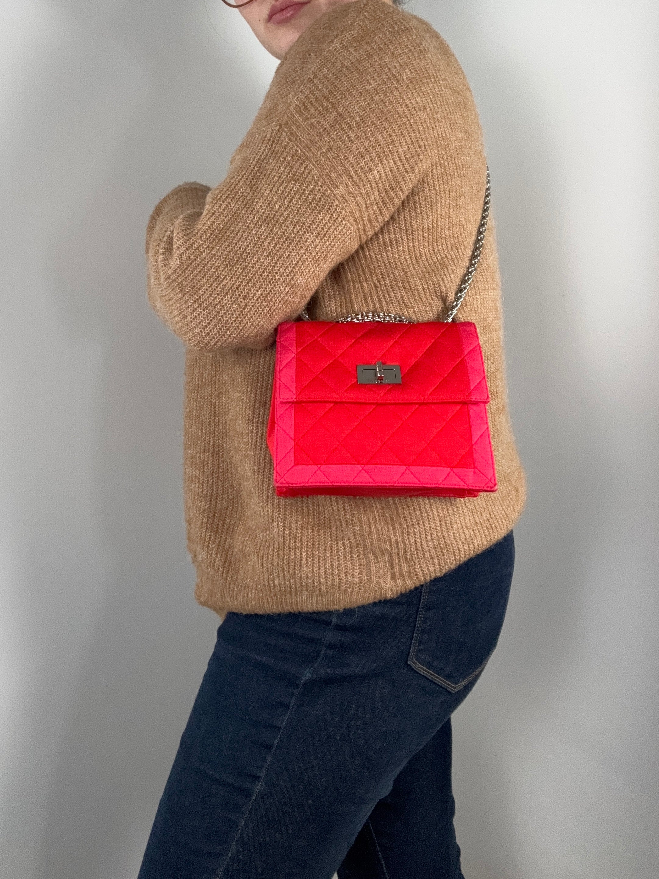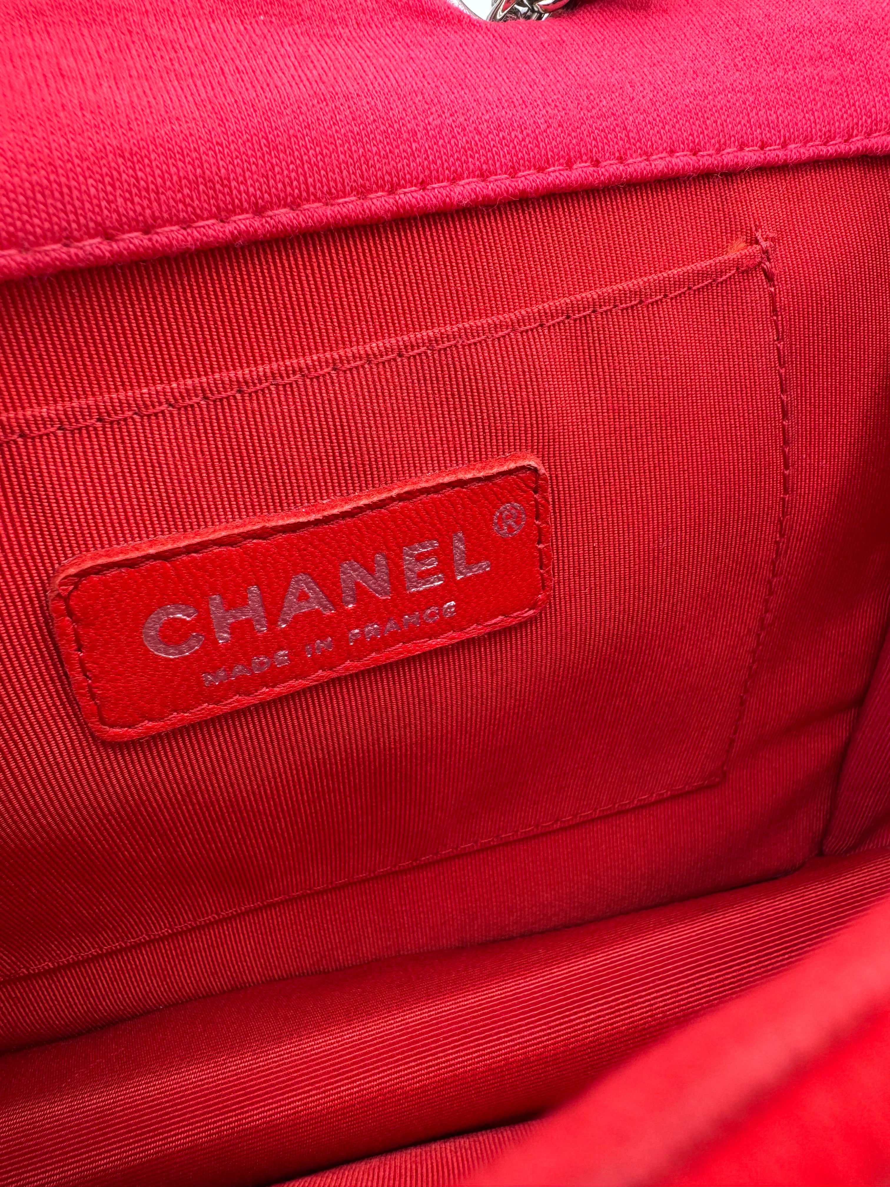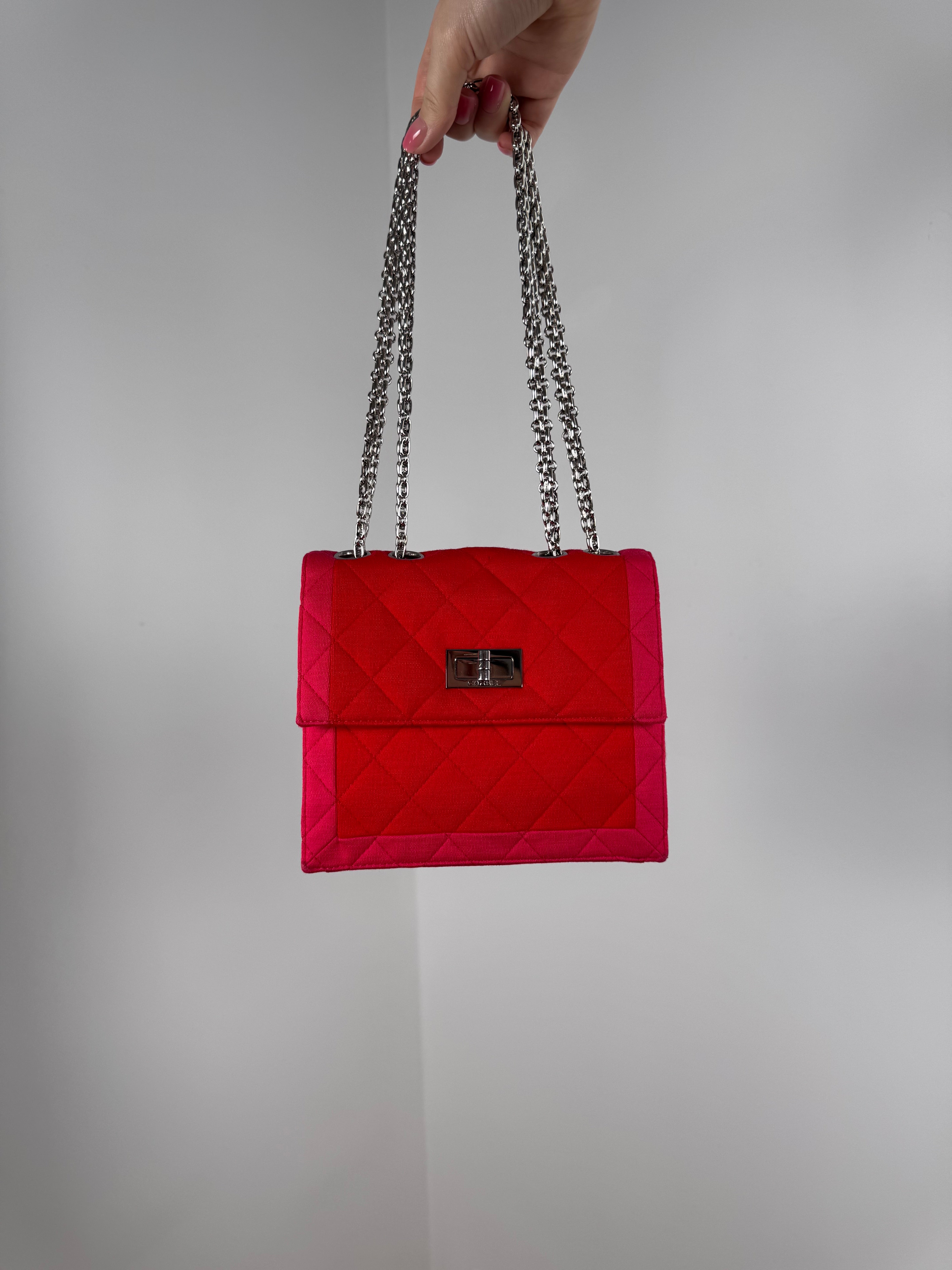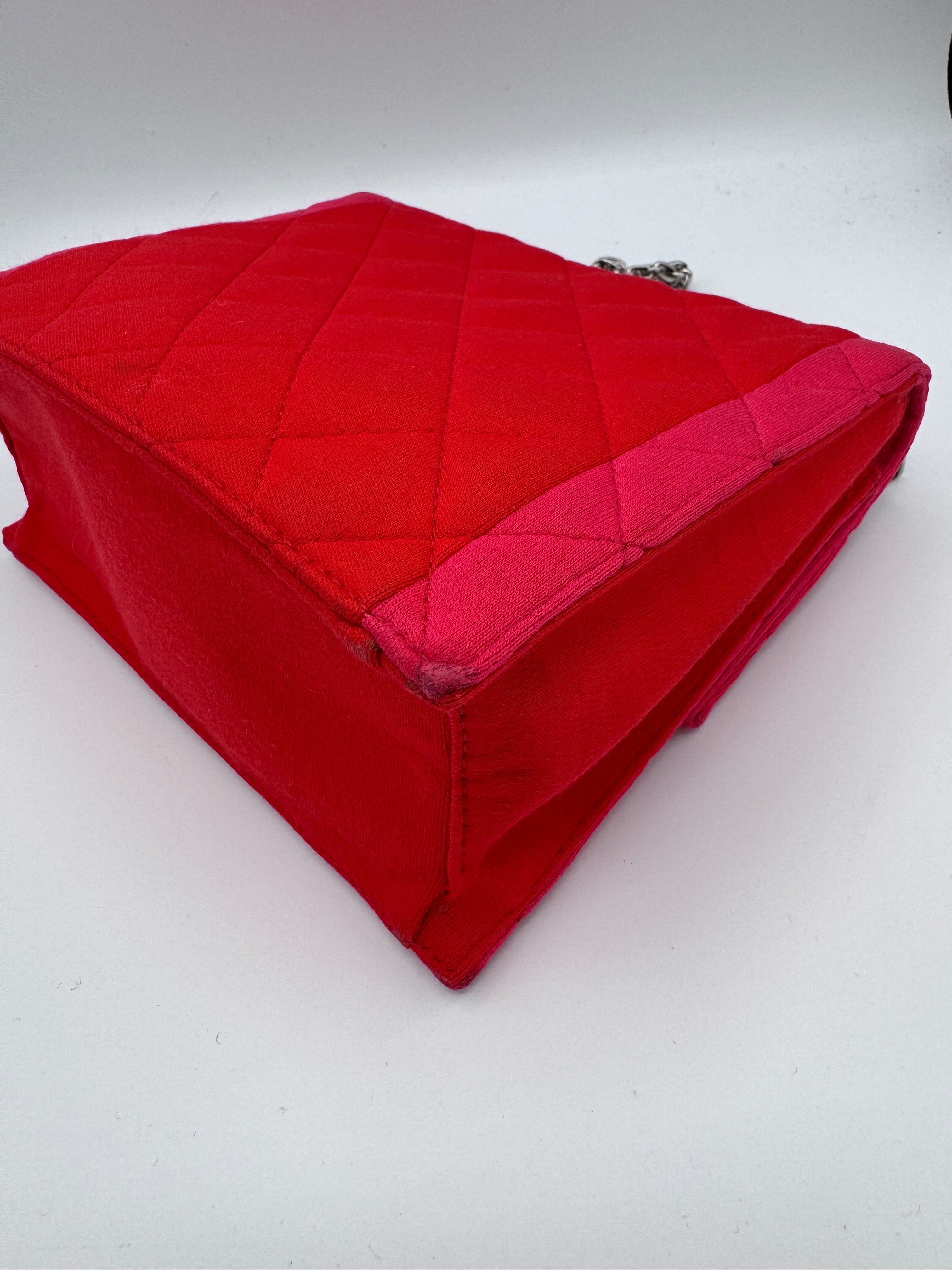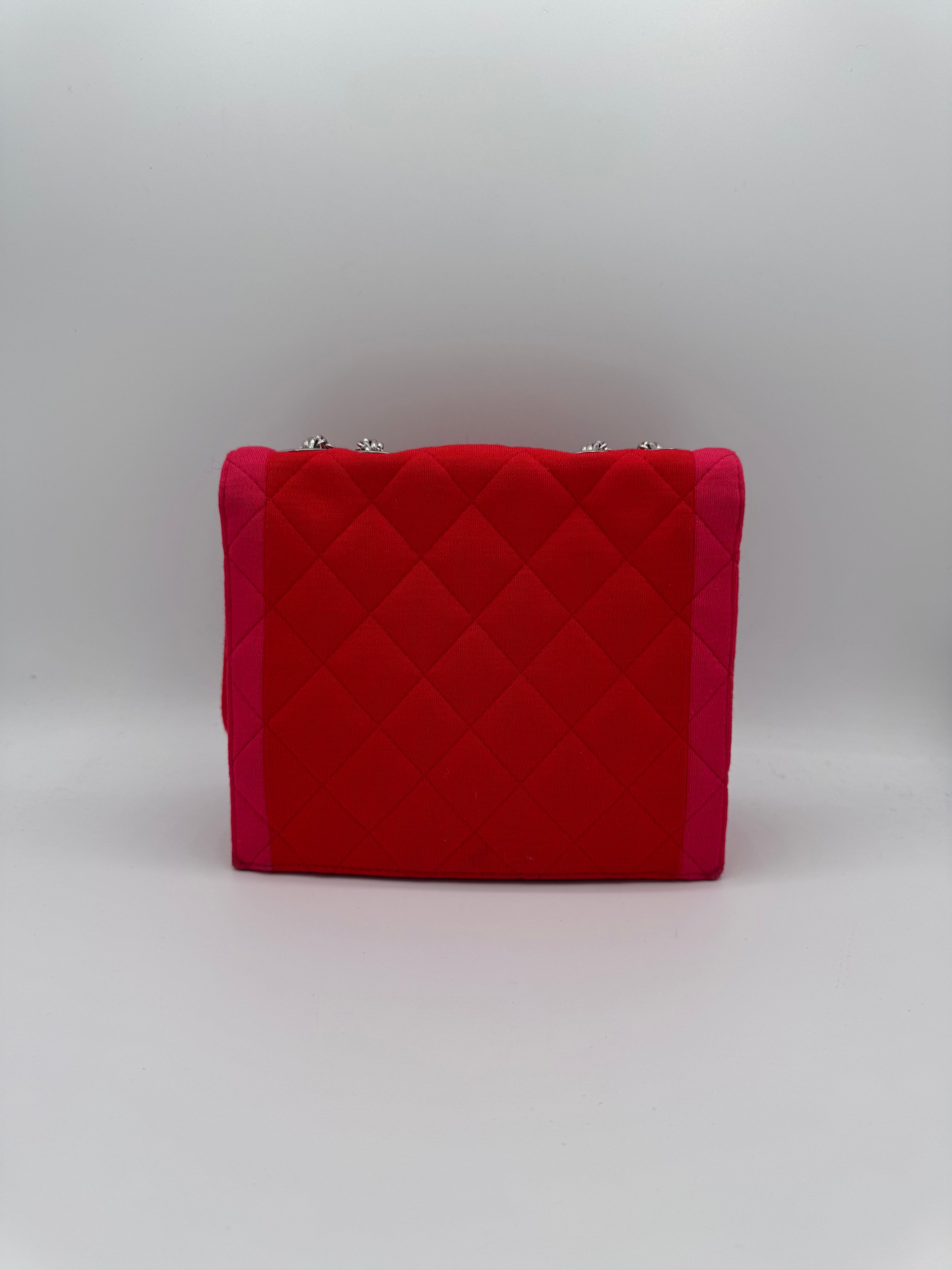 Sac Colelction Défilé 2.55 de chez Chanel, en jersey rouge et rose, bijouterie argent, en très bon état.