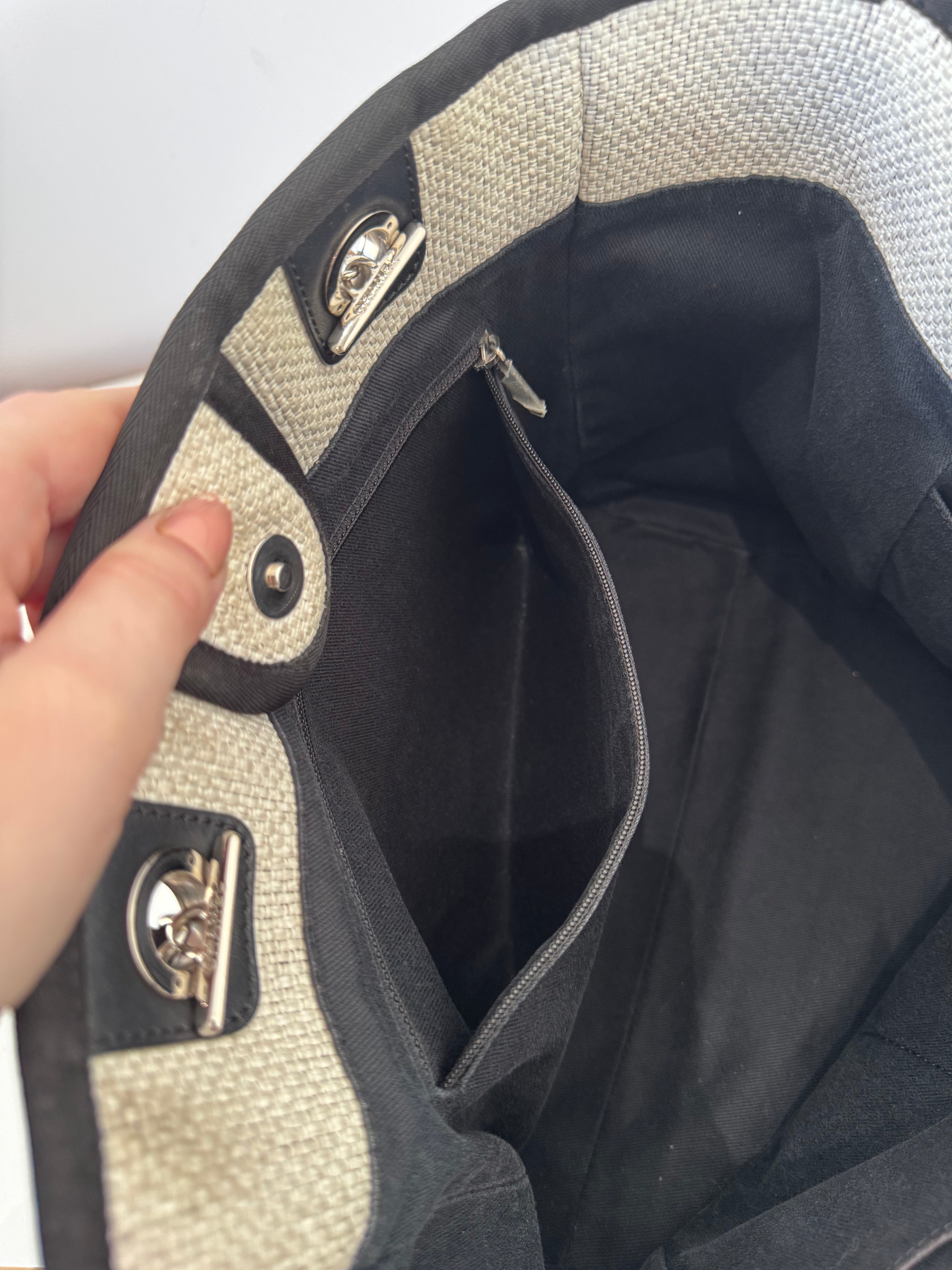Sac Deauville en tissu écru, cuir noir, et bijouterie argentée en très bon état général. C'est le moyen modèle.
