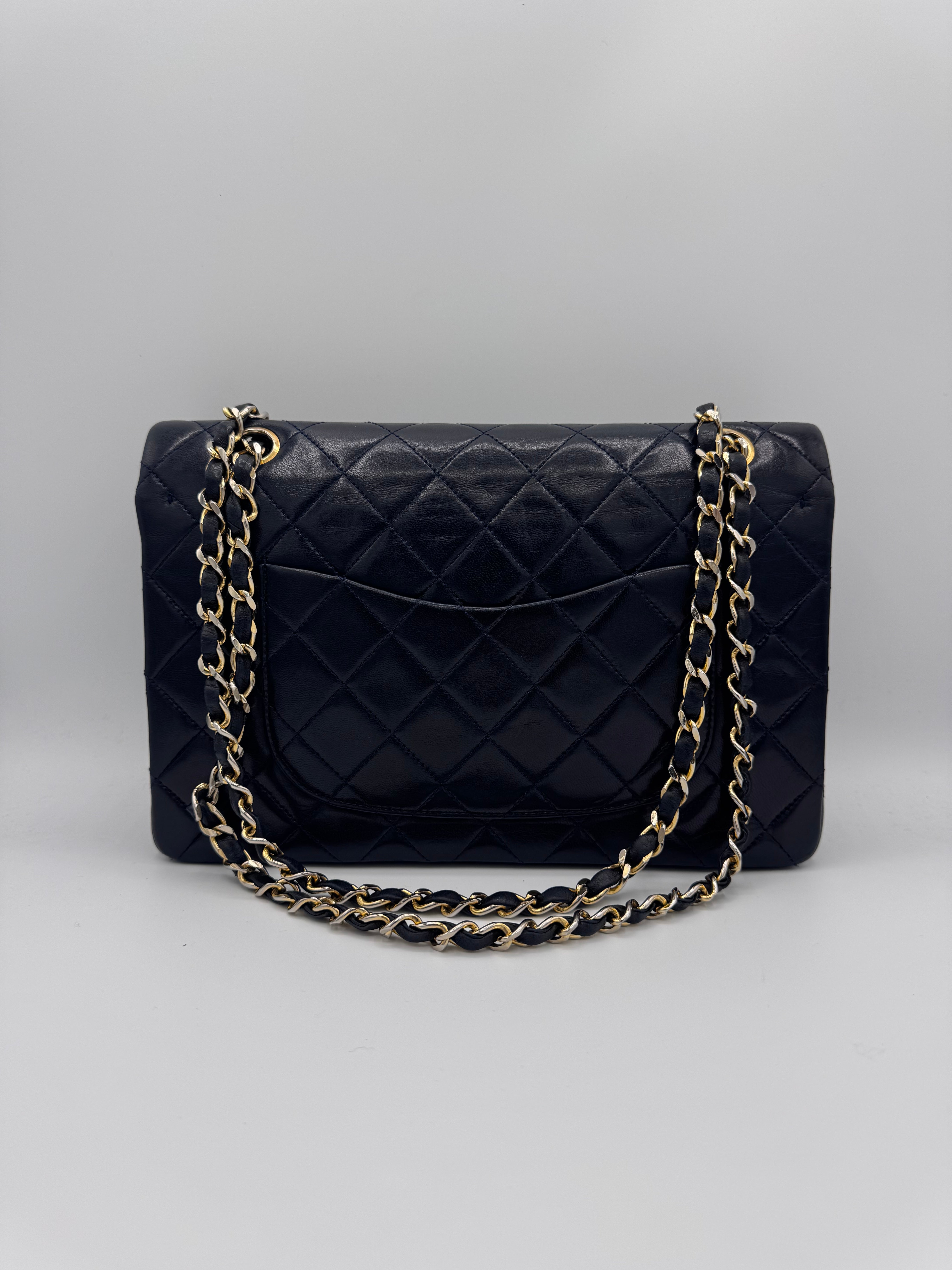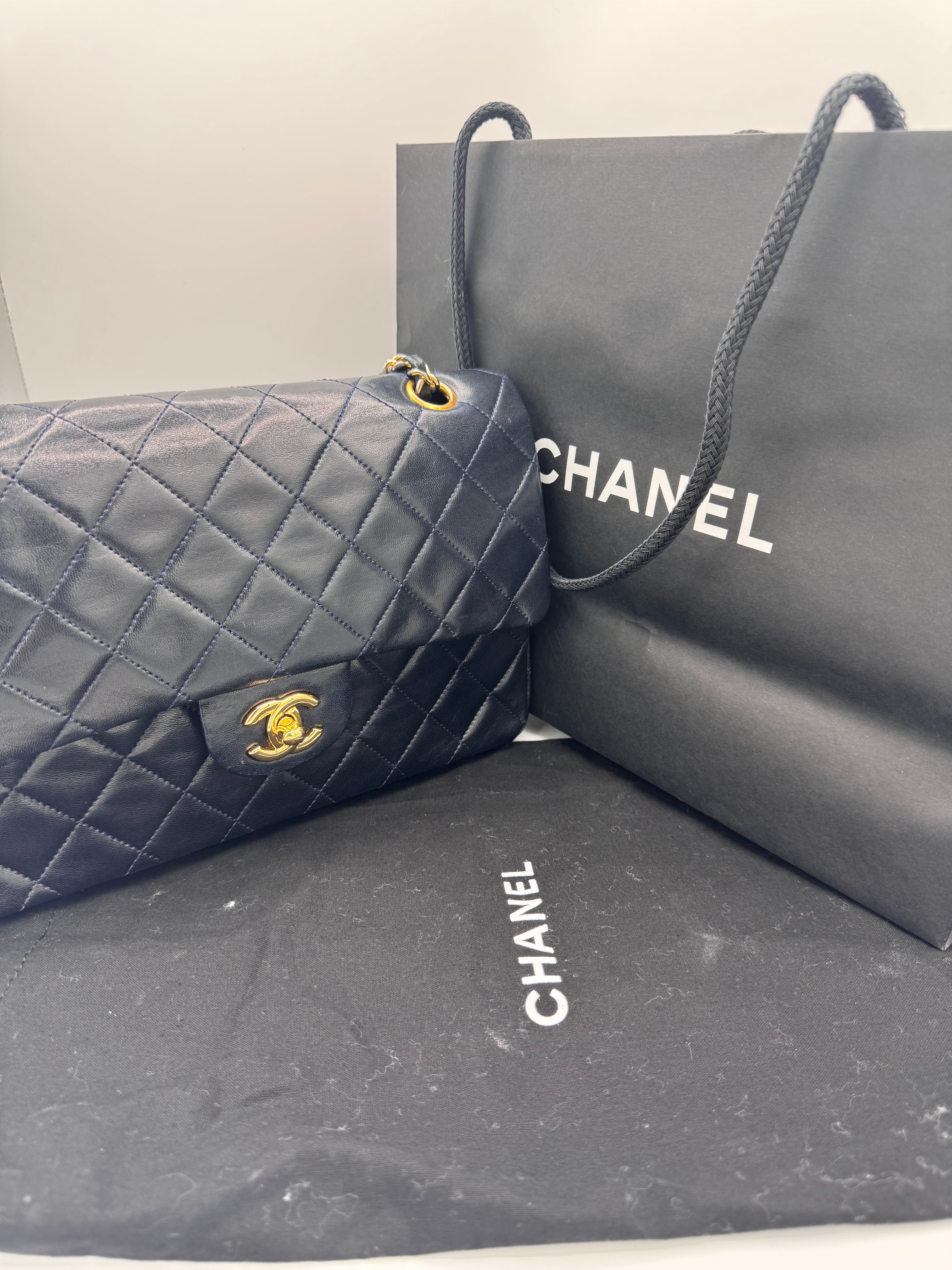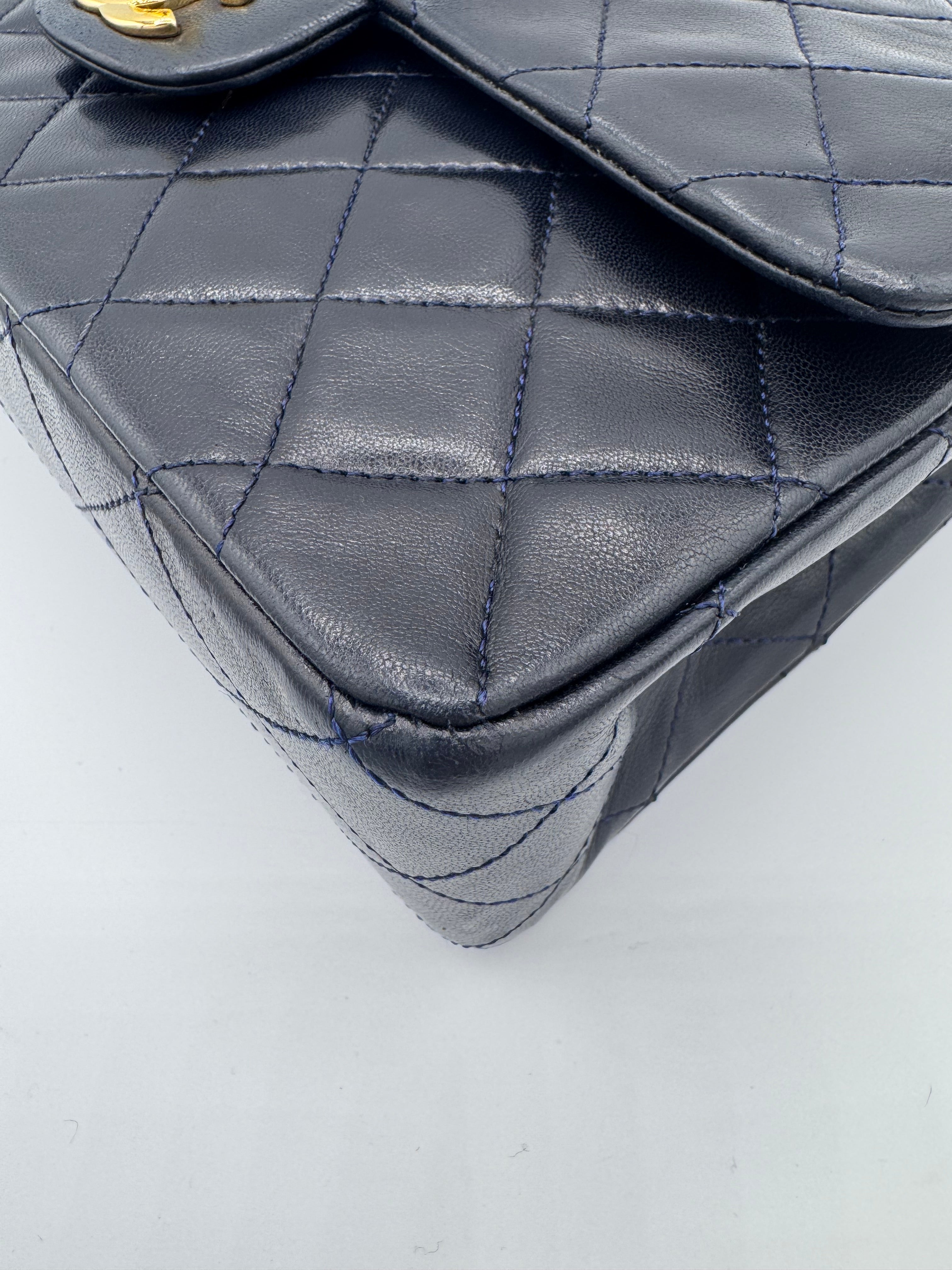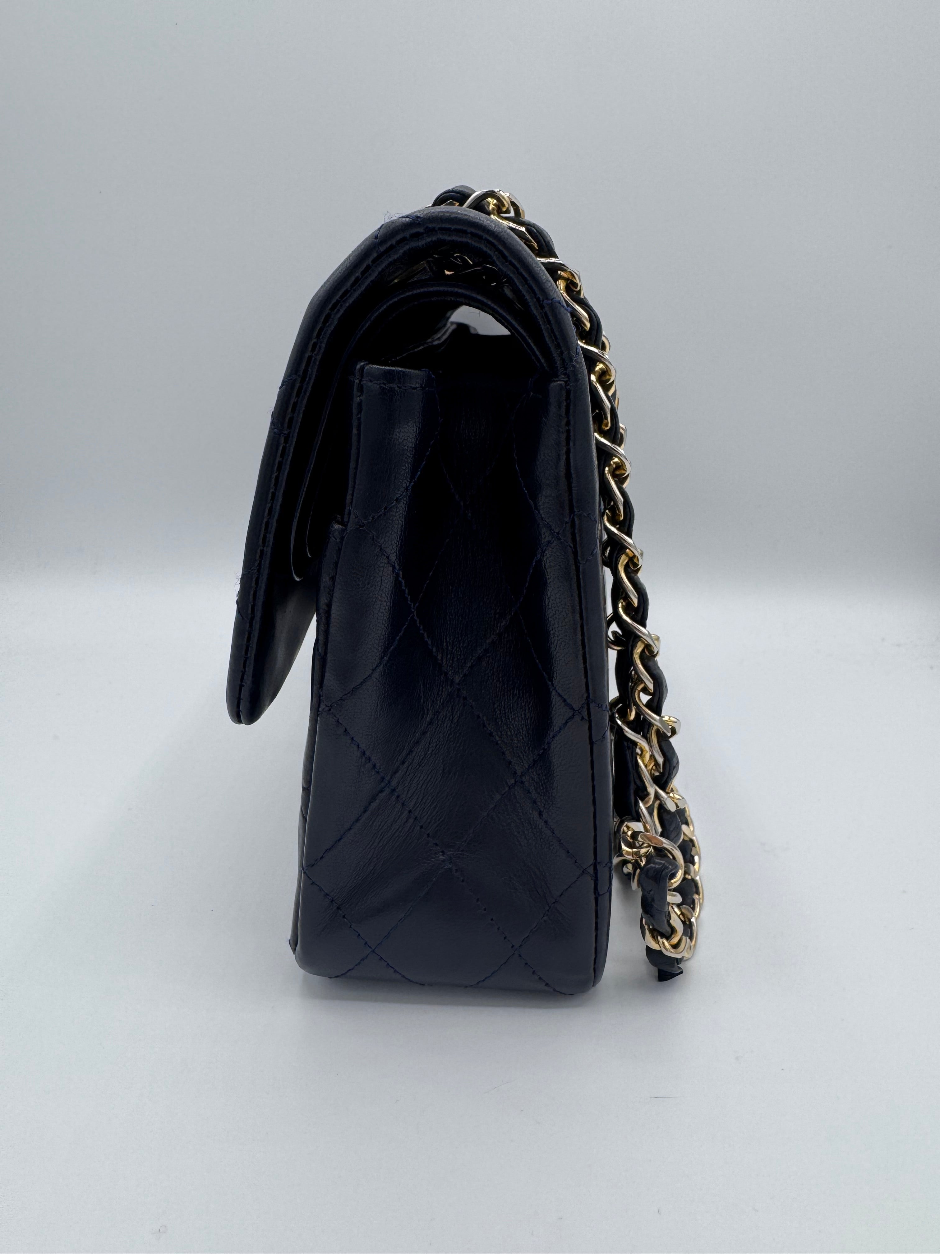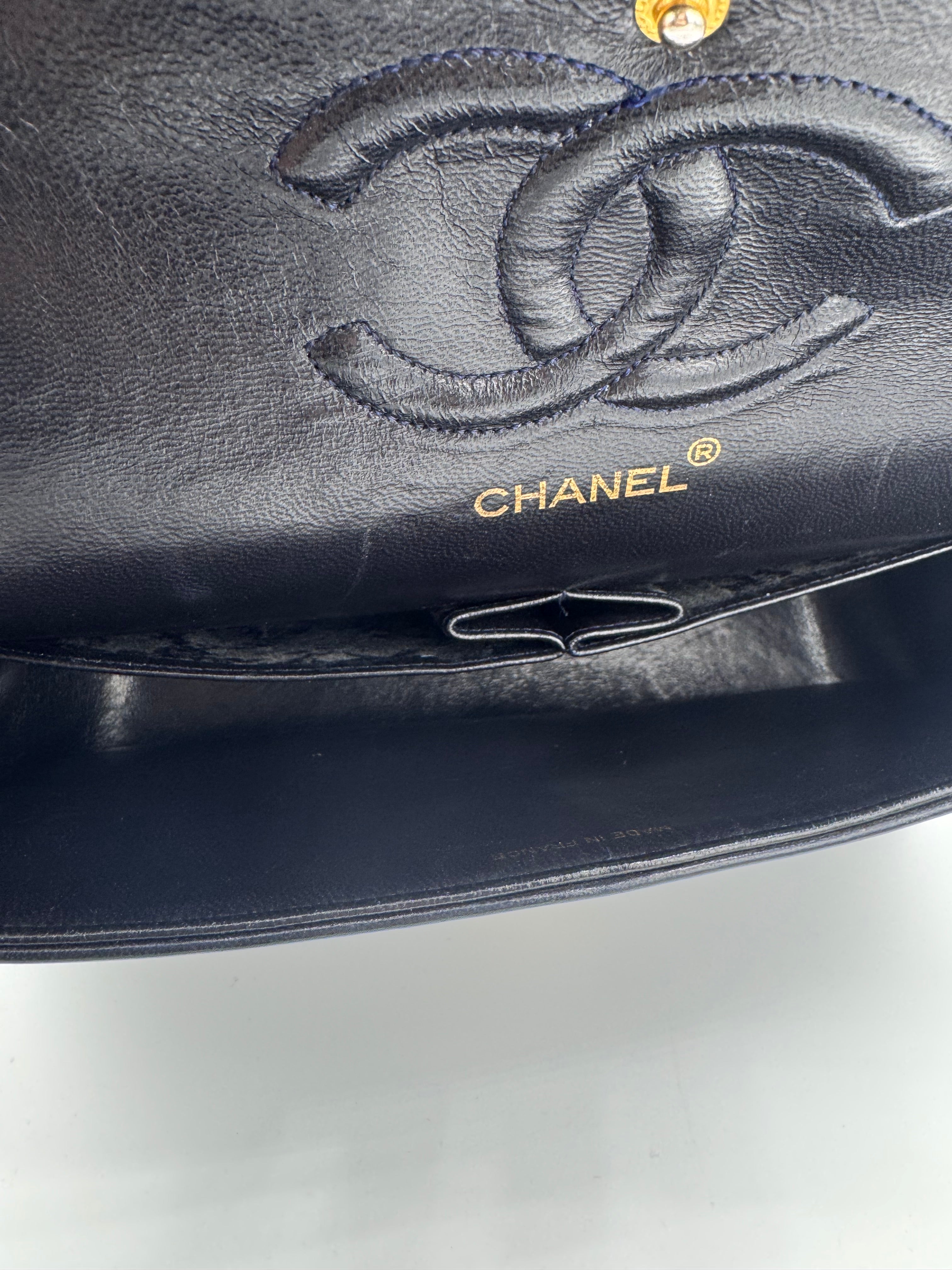 Sac Timeless Classique de chez Chanel, en cuir d'agneau bleu marine et bijouterie dorée, en très bon état.