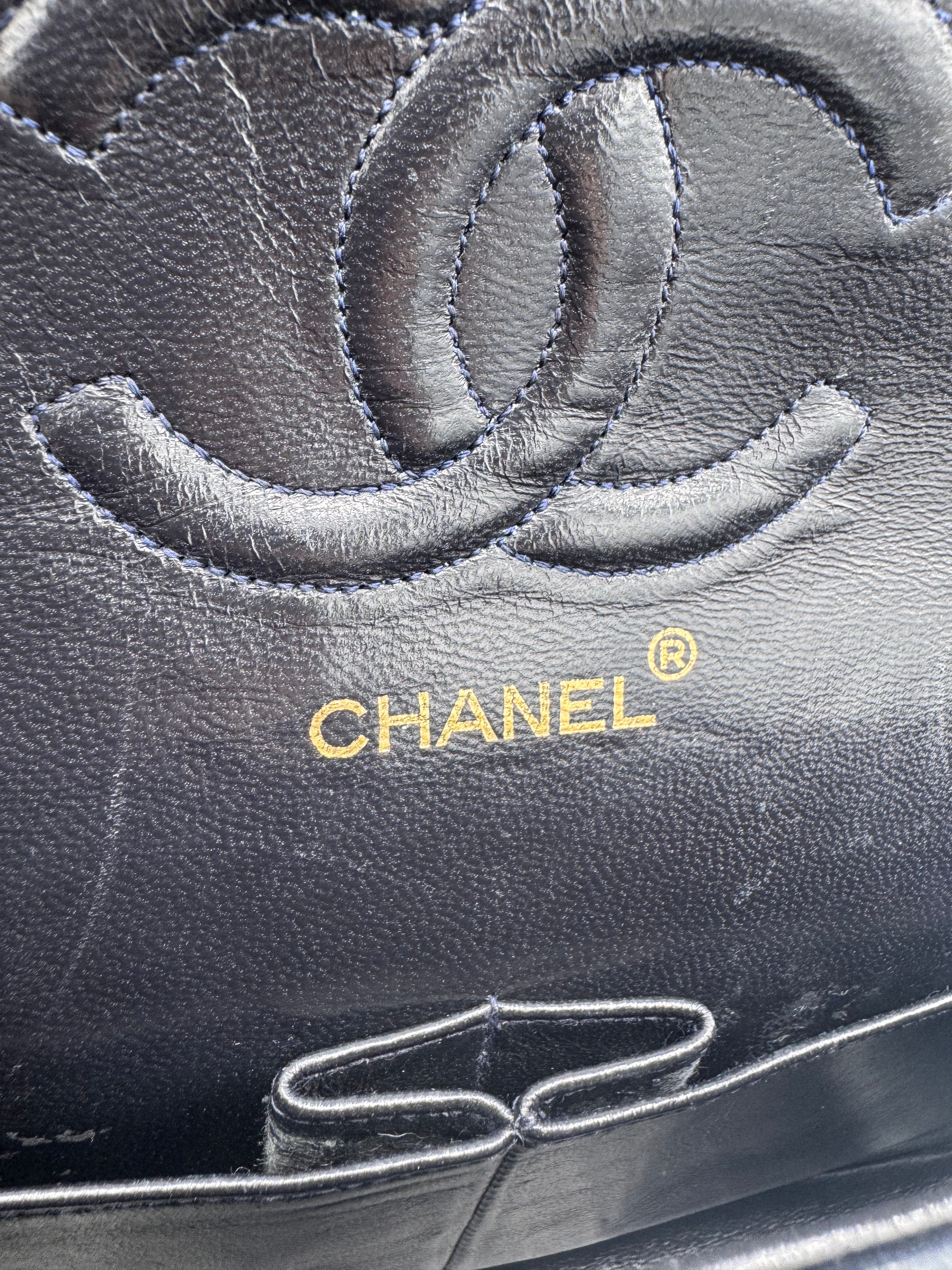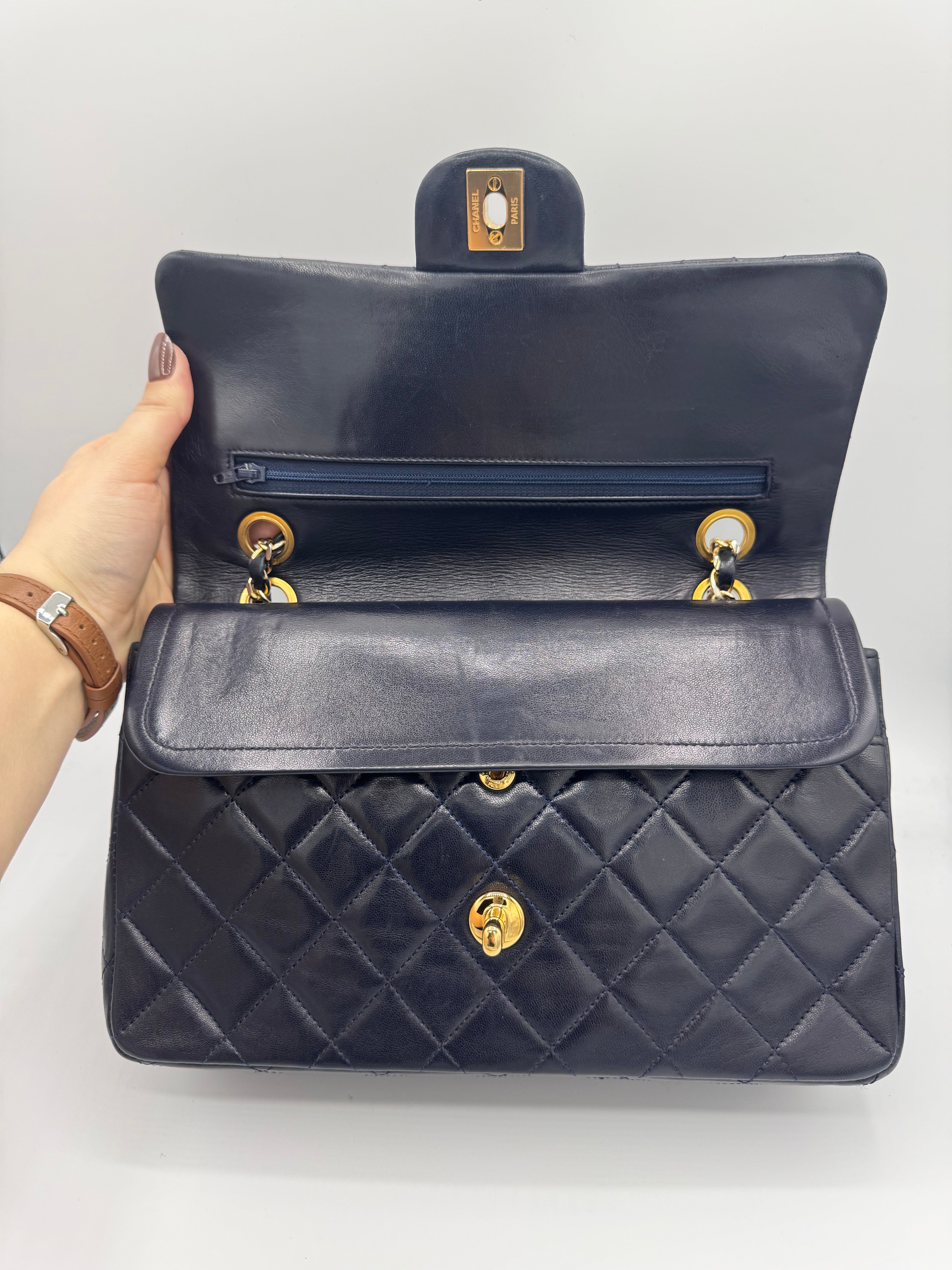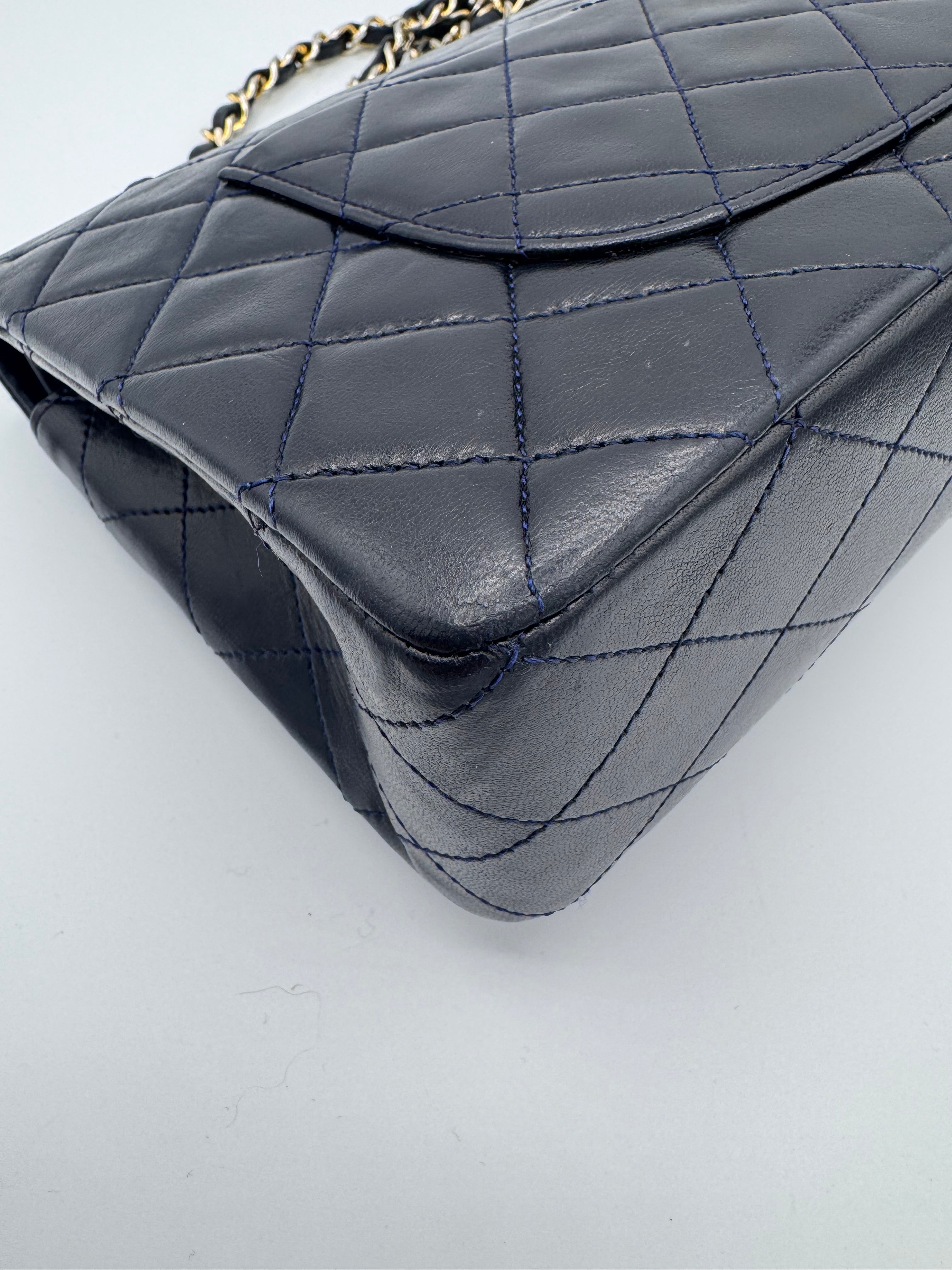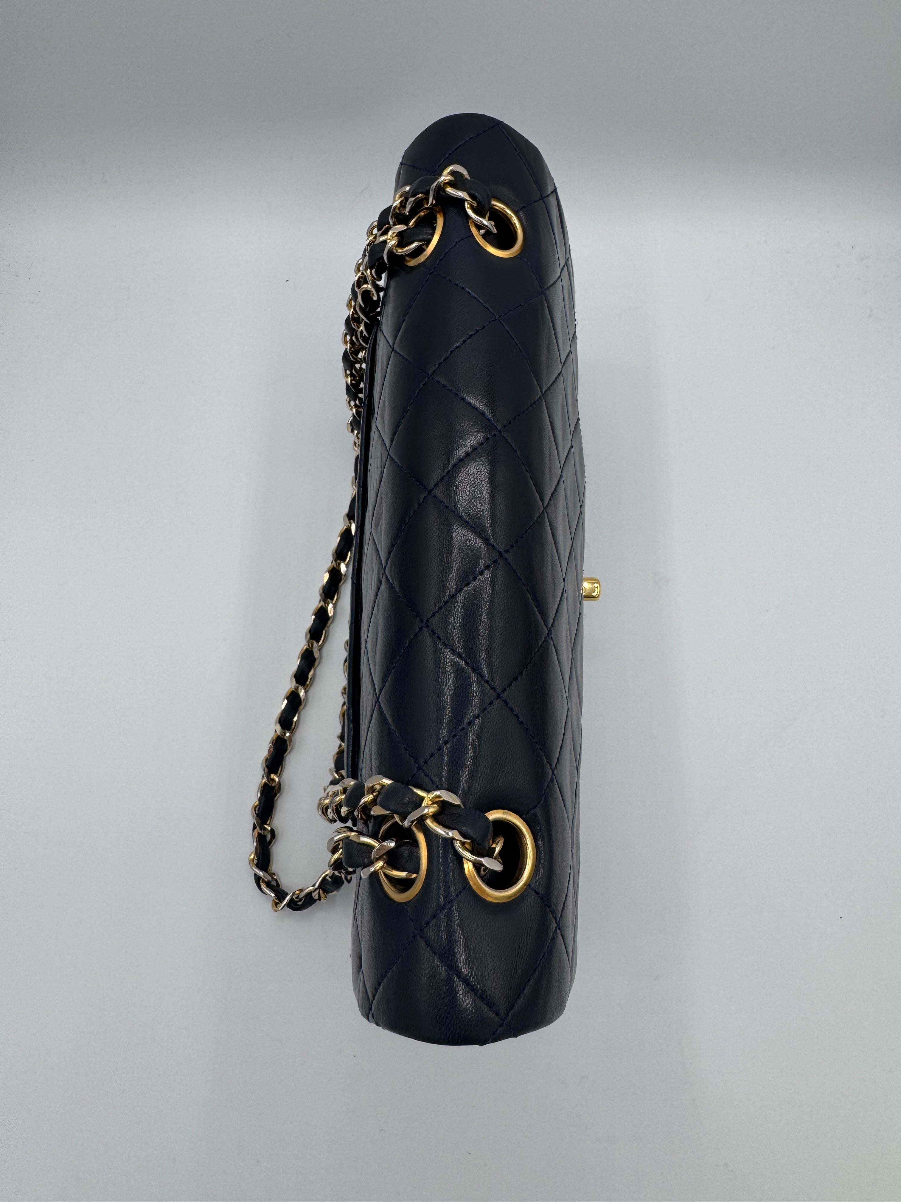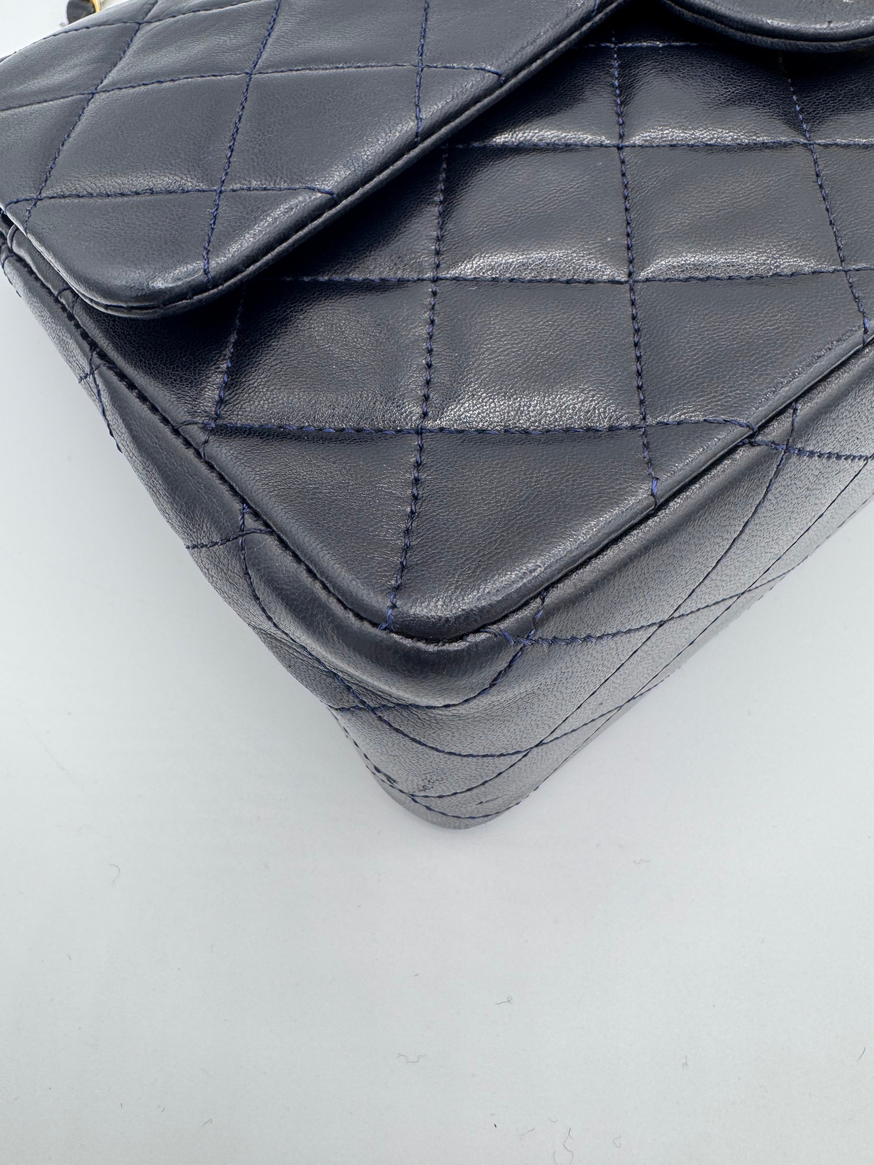 Sac Timeless Classique de chez Chanel, en cuir d'agneau bleu marine et bijouterie dorée, en très bon état.