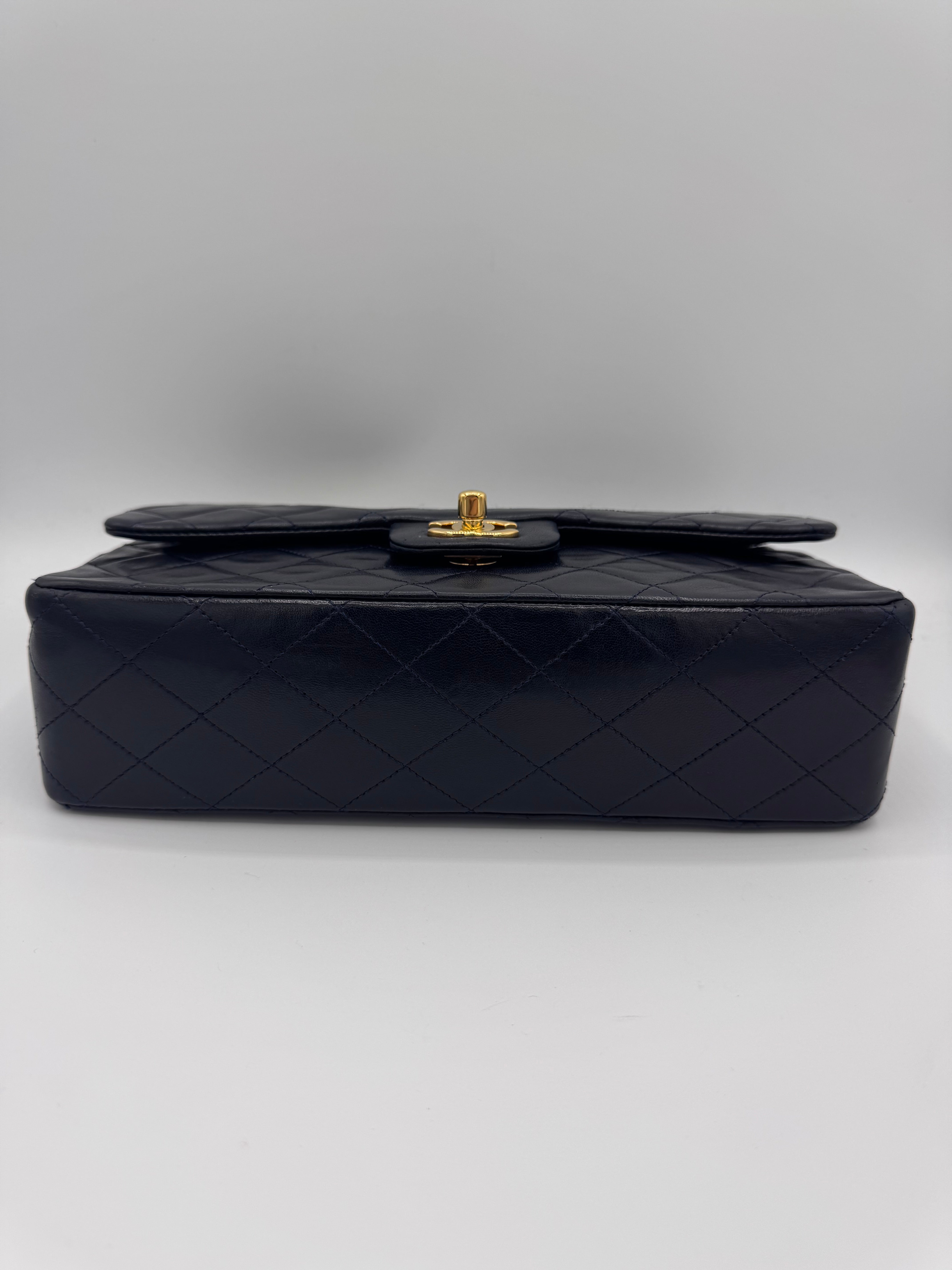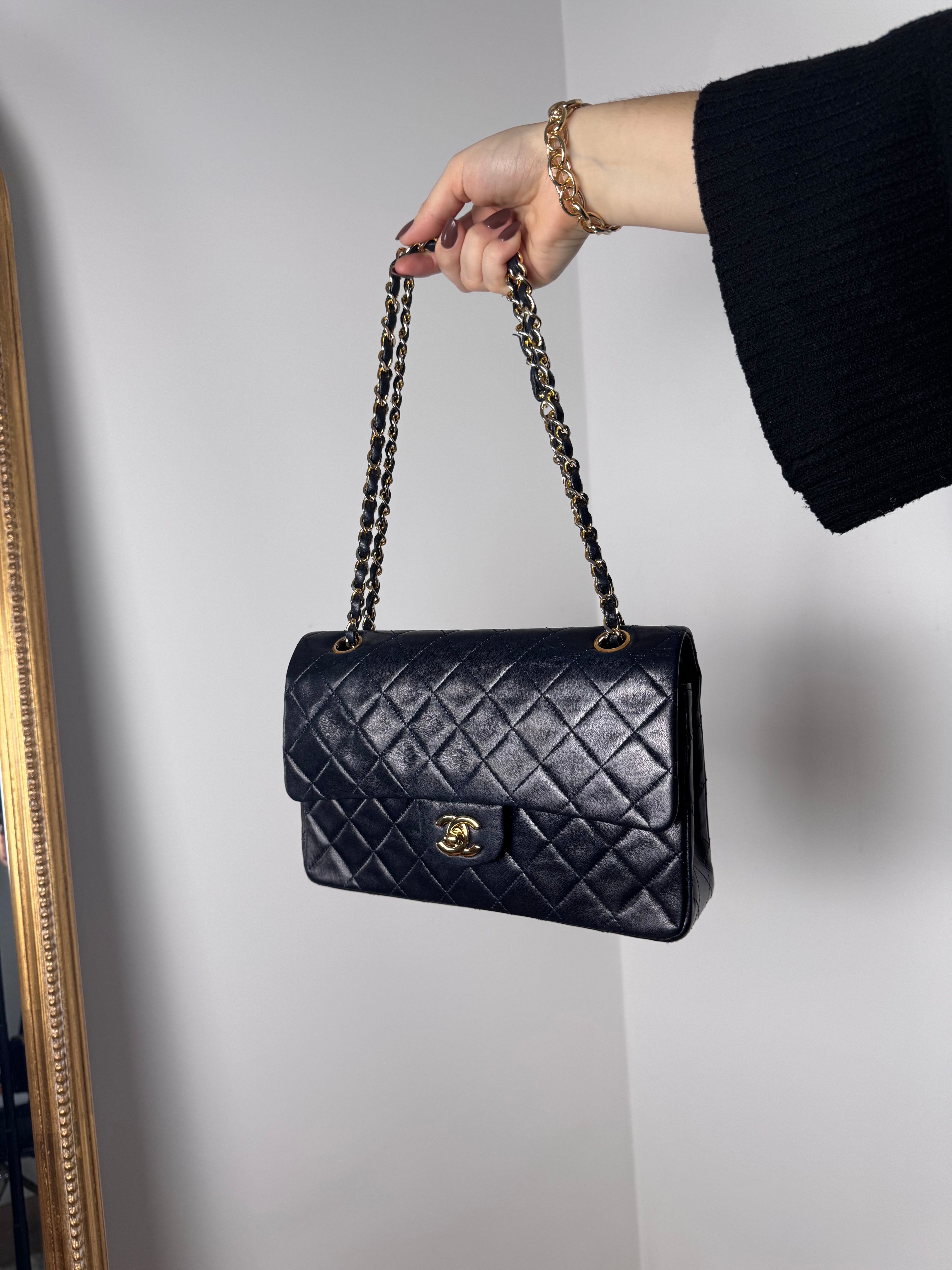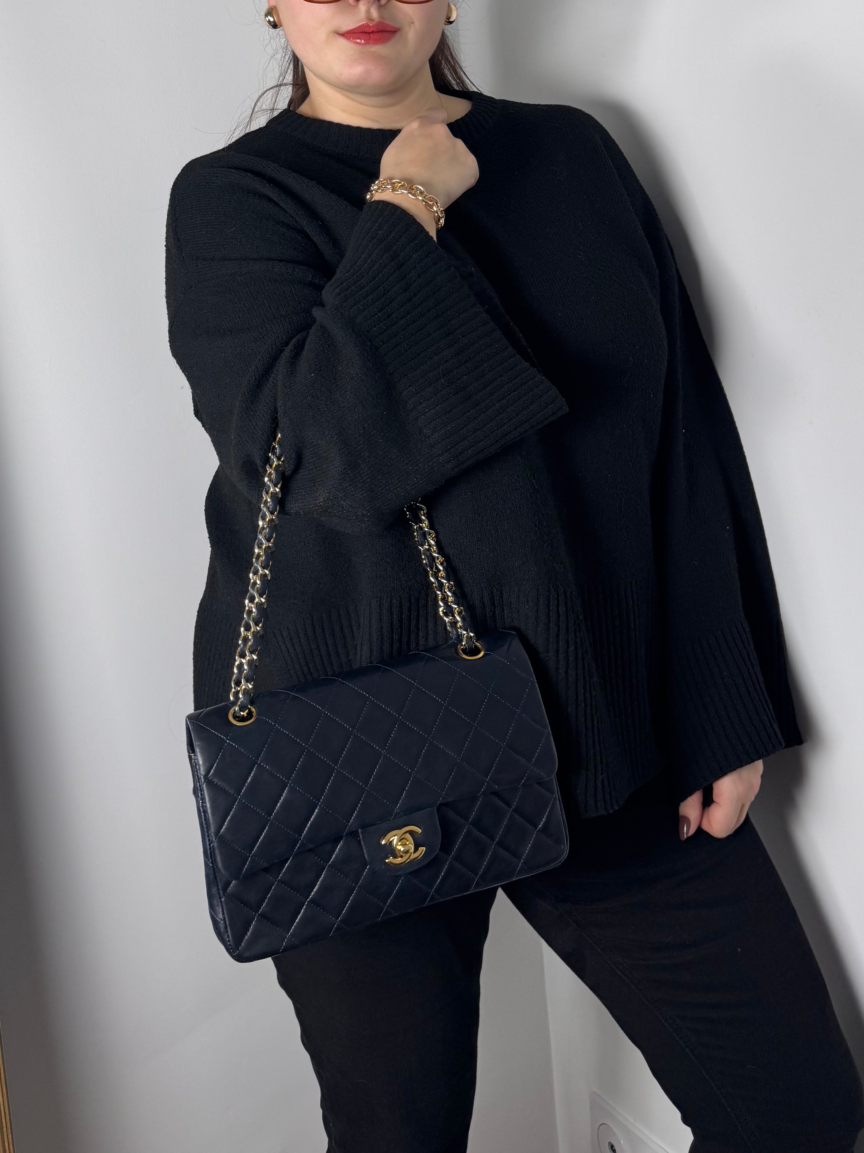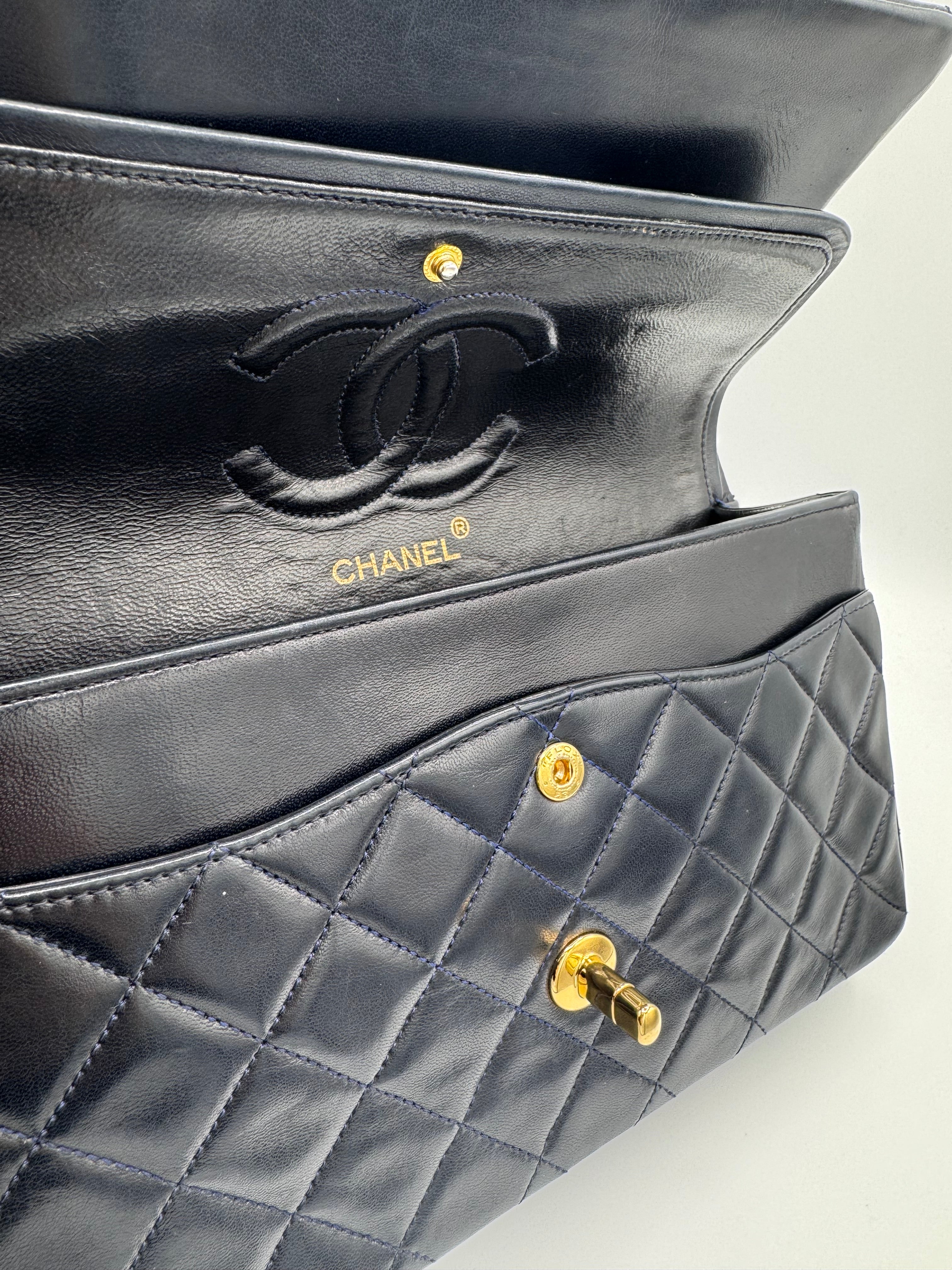 Sac Timeless Classique de chez Chanel, en cuir d'agneau bleu marine et bijouterie dorée, en très bon état.