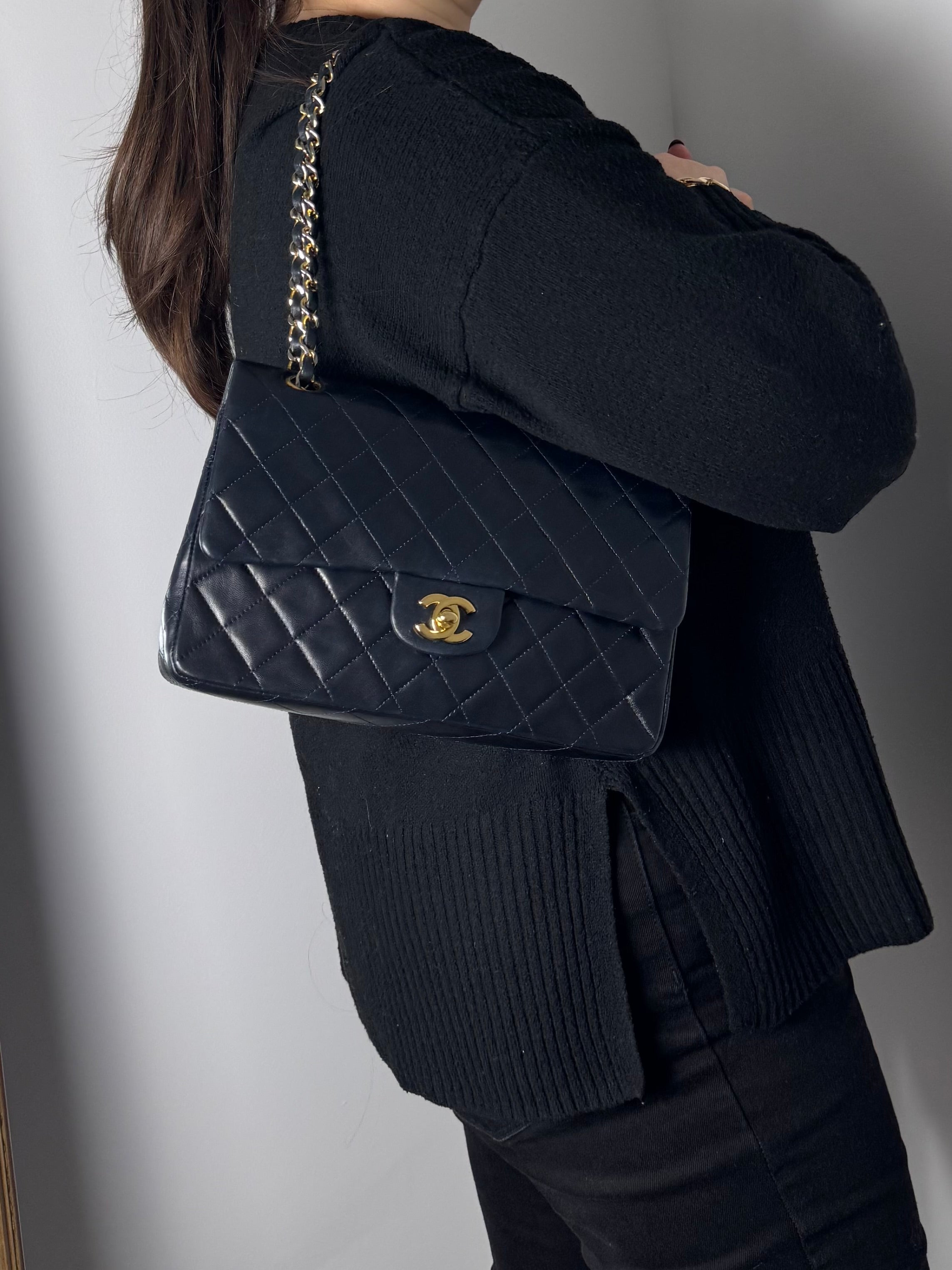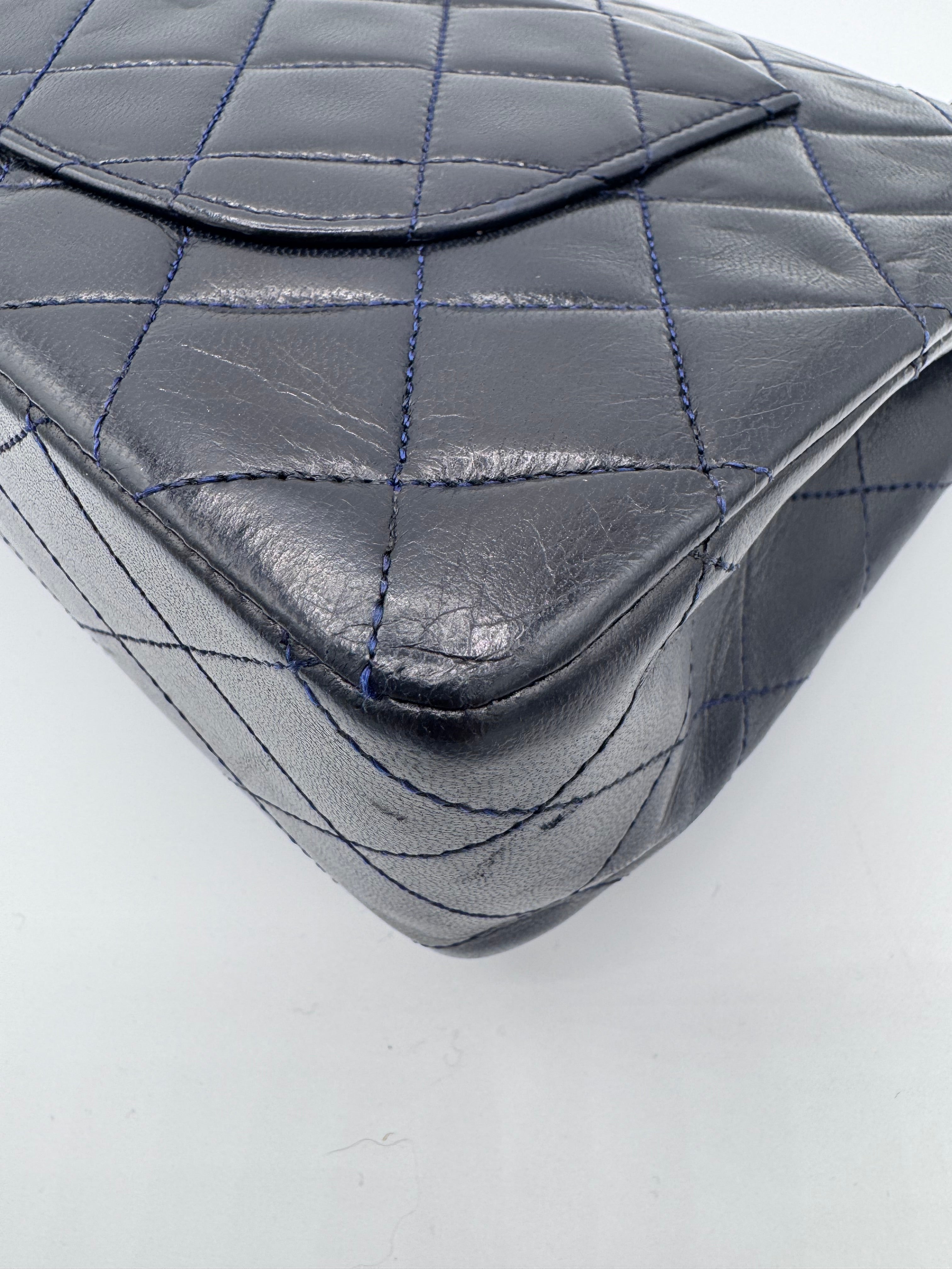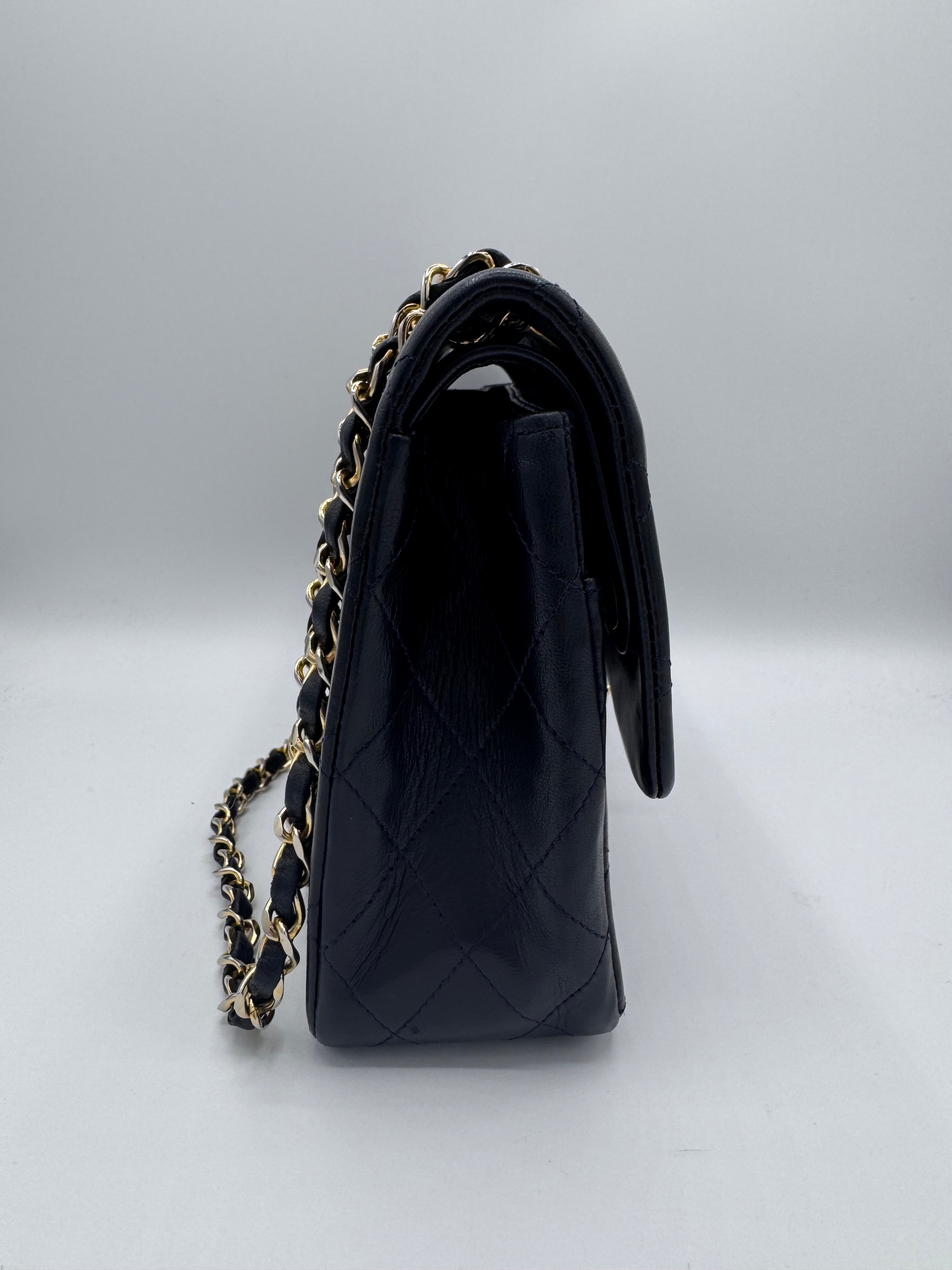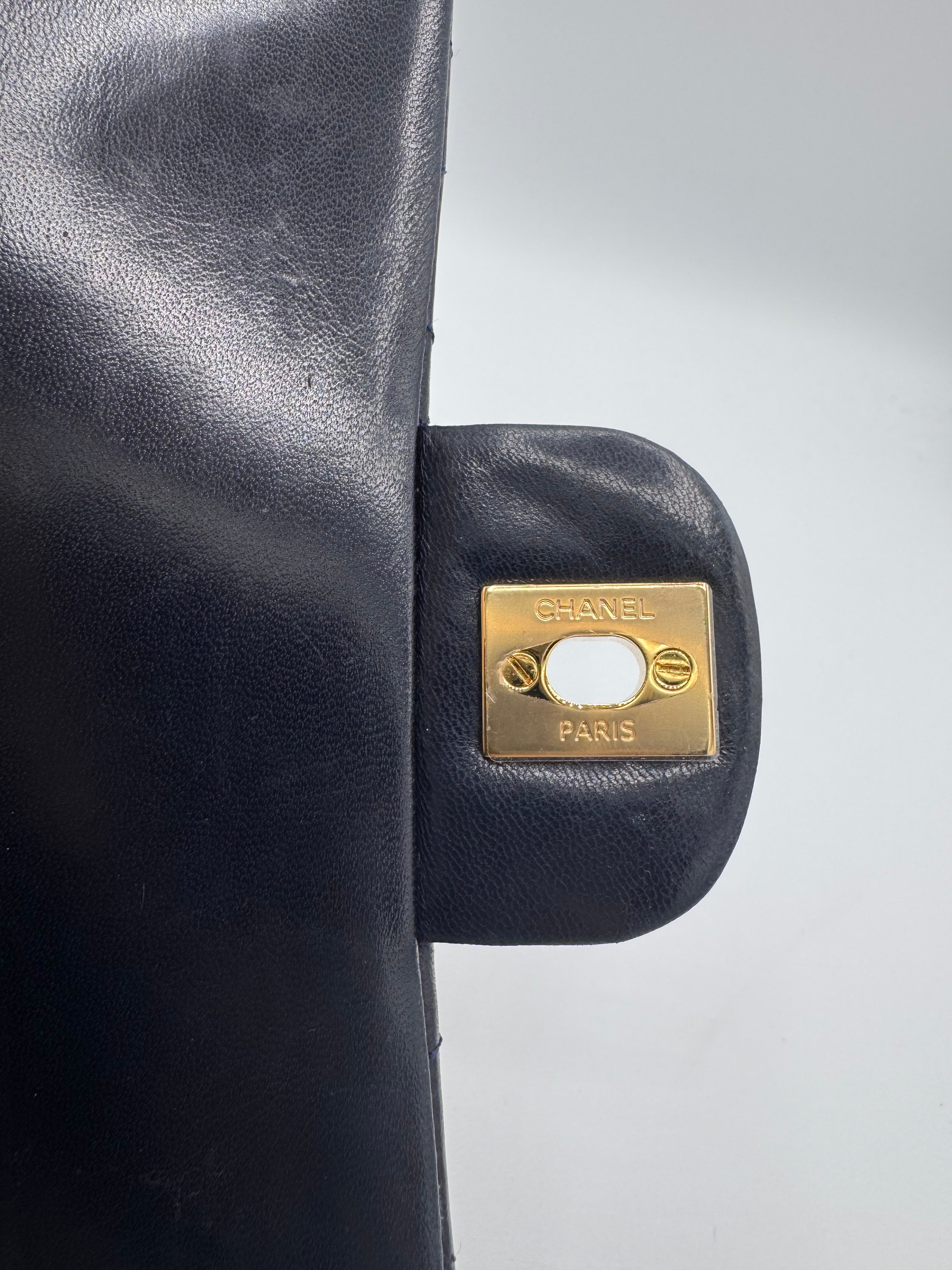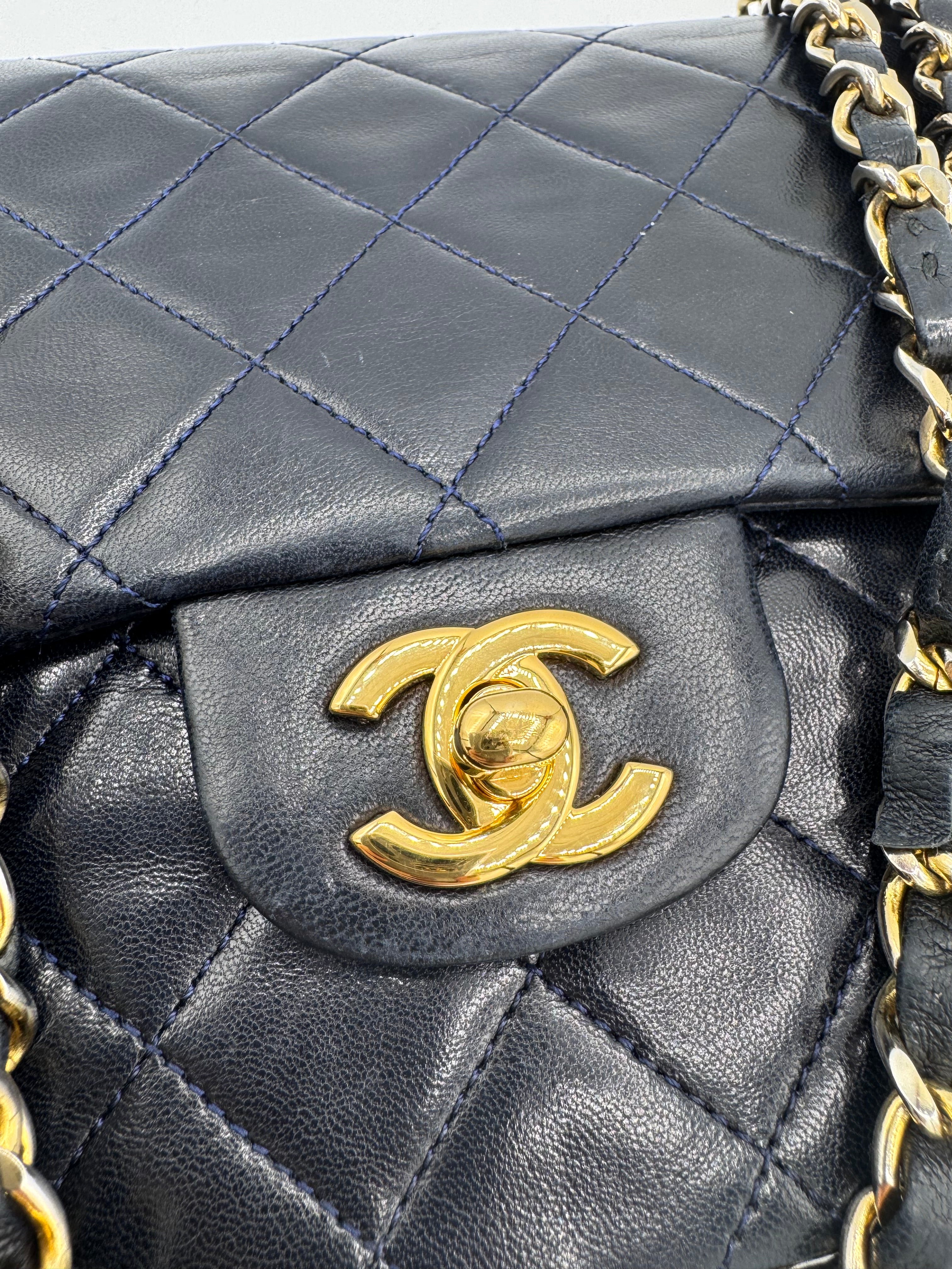 Sac Timeless Classique de chez Chanel, en cuir d'agneau bleu marine et bijouterie dorée, en très bon état.