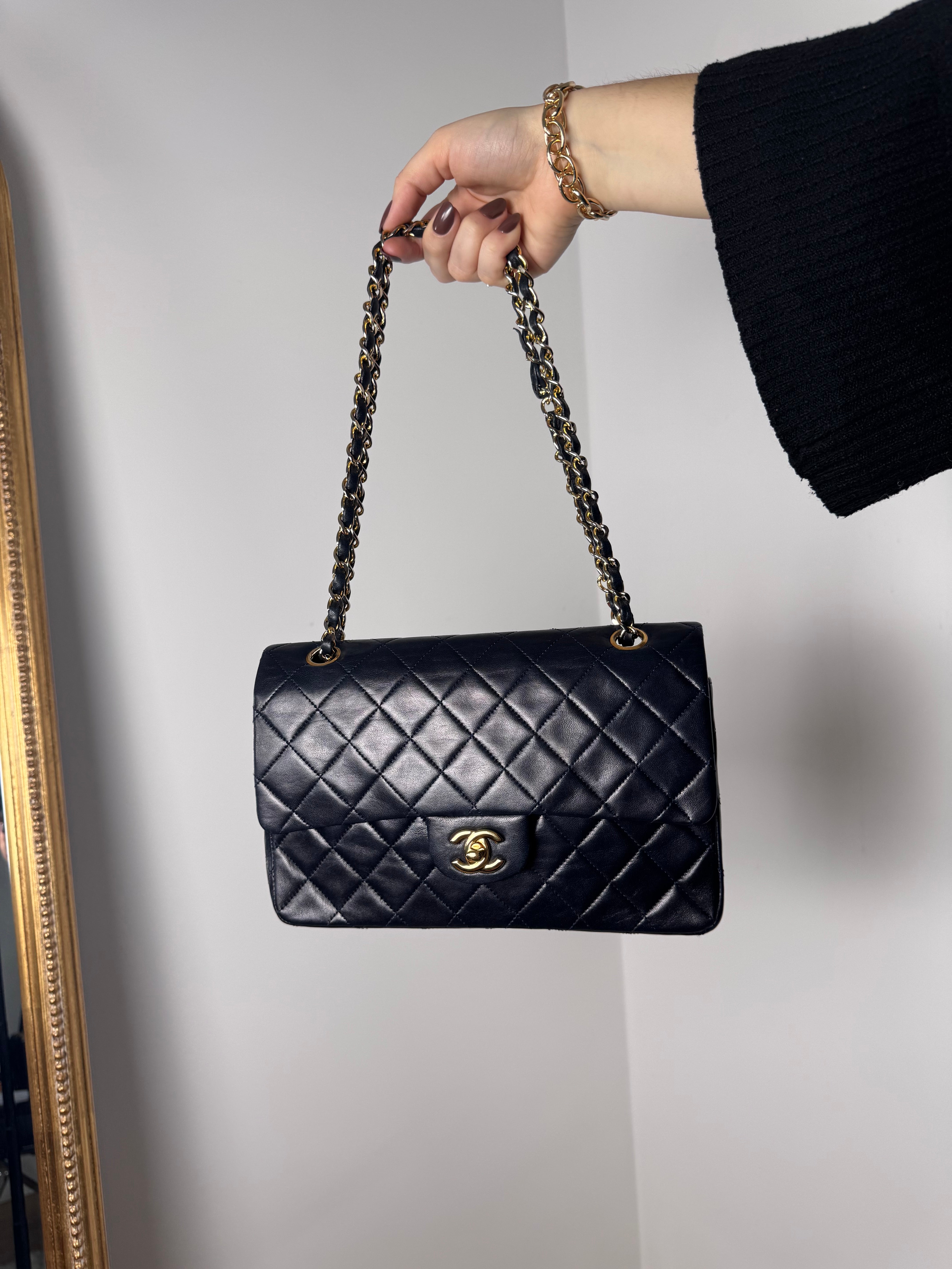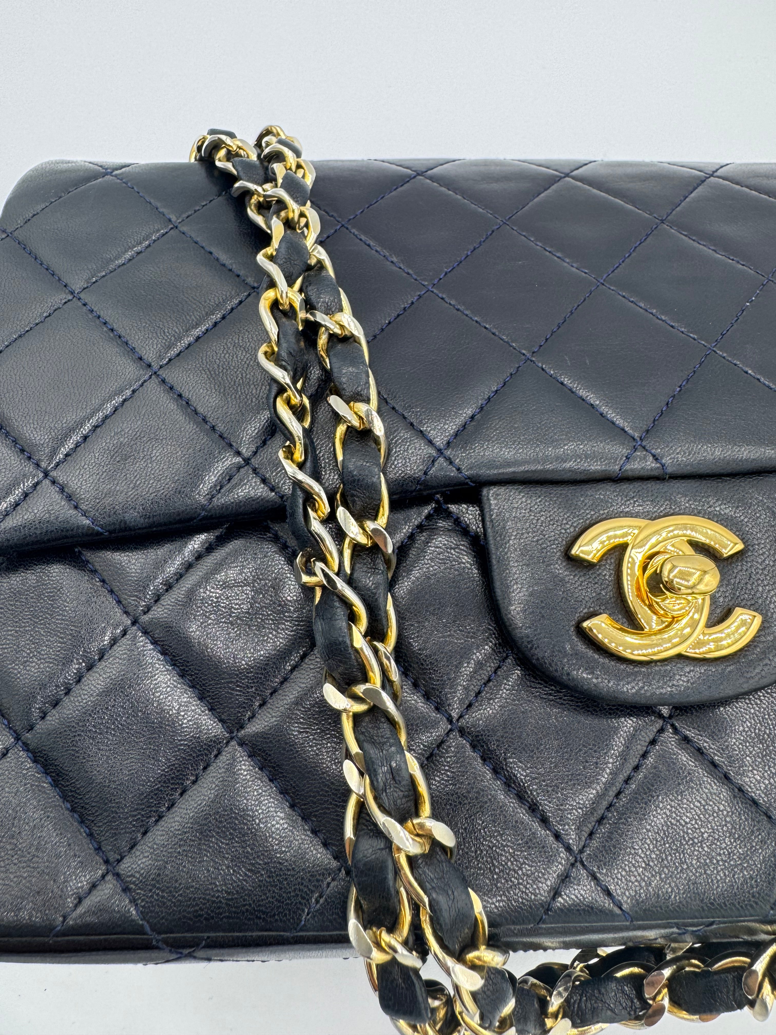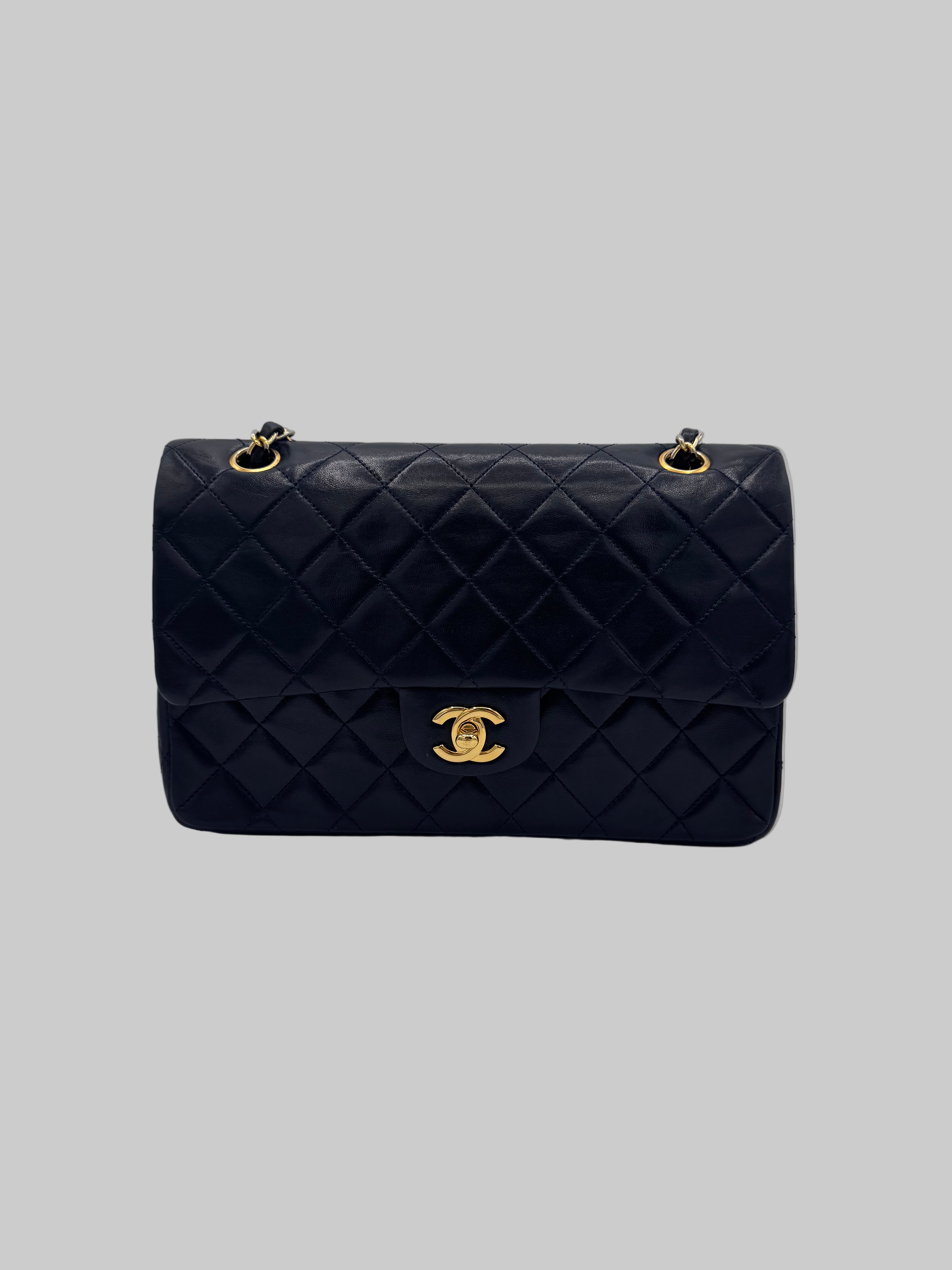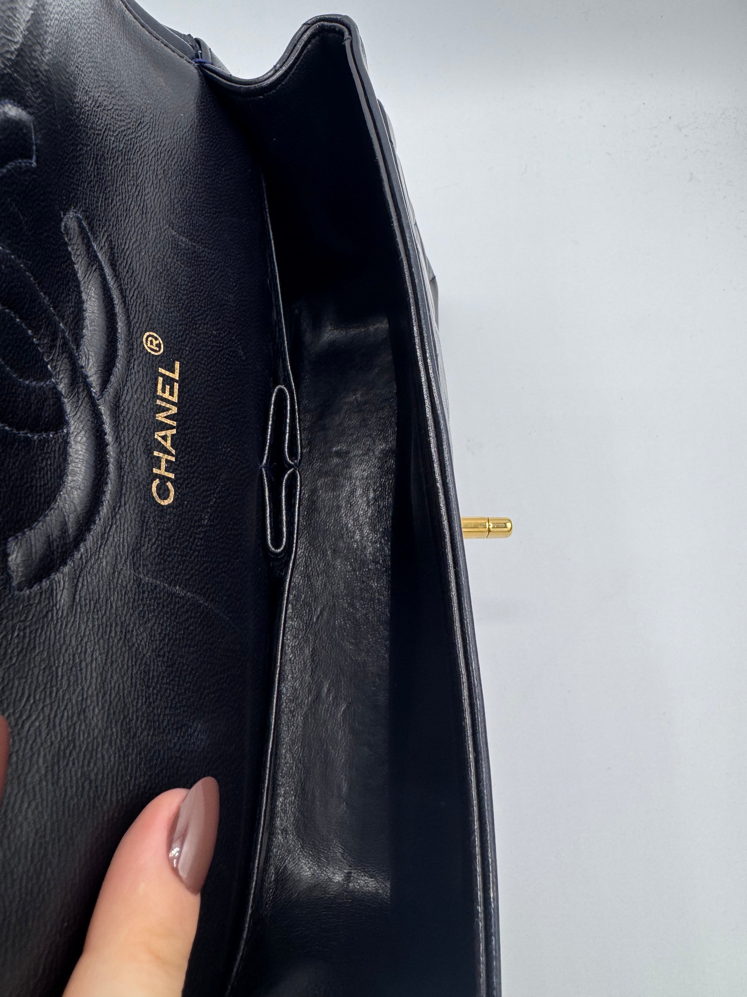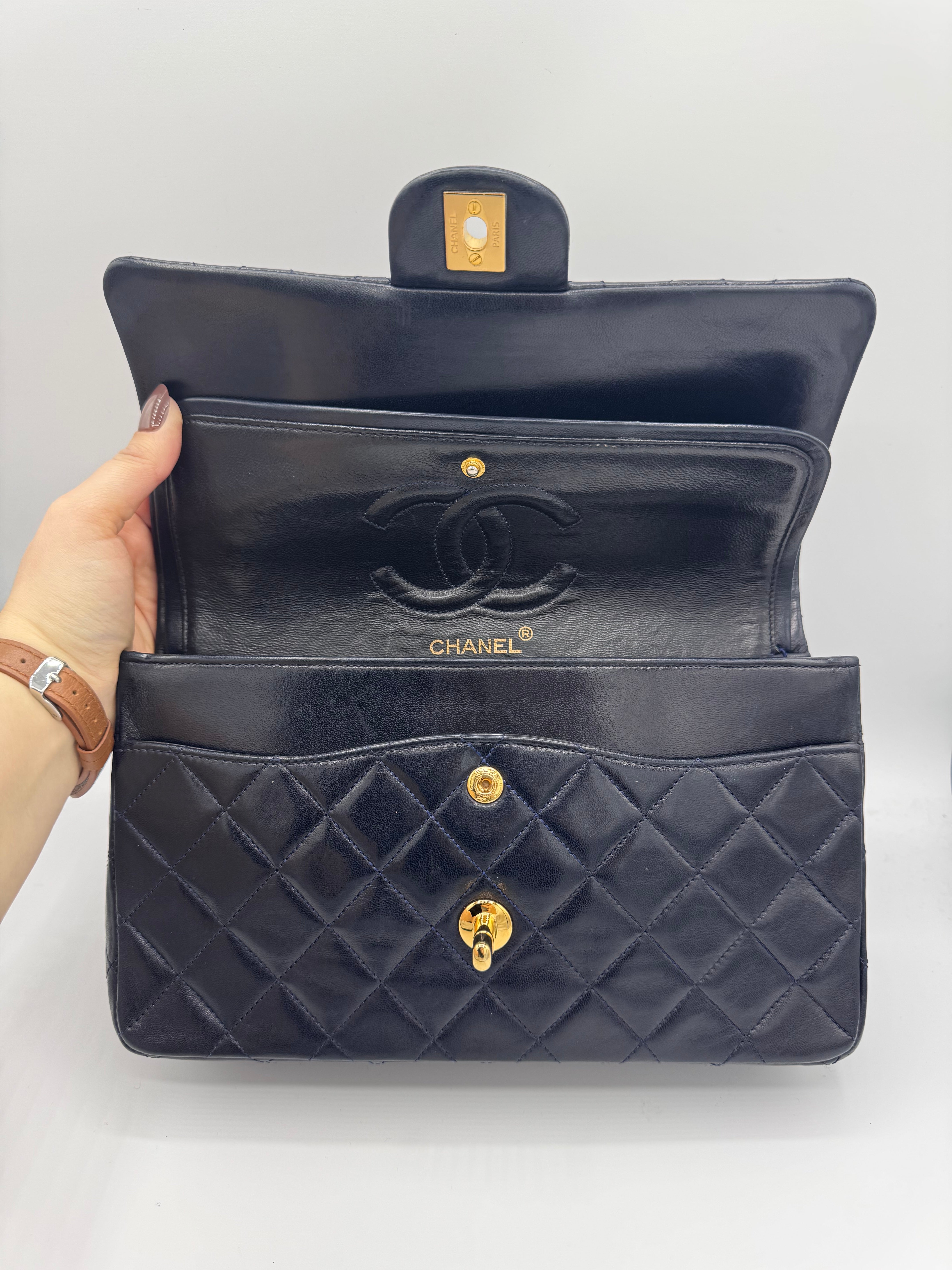 Sac Timeless Classique de chez Chanel, en cuir d'agneau bleu marine et bijouterie dorée, en très bon état.
