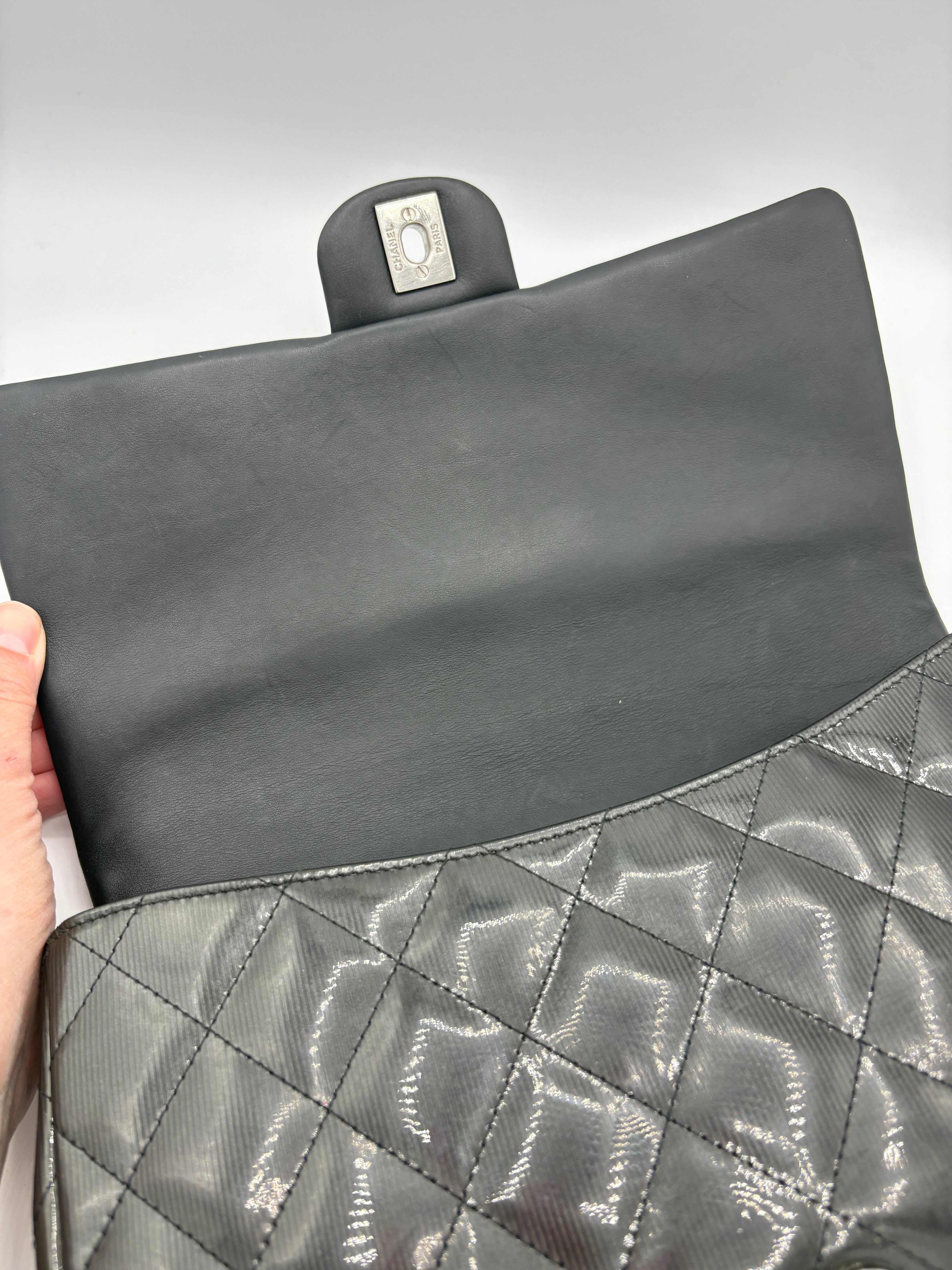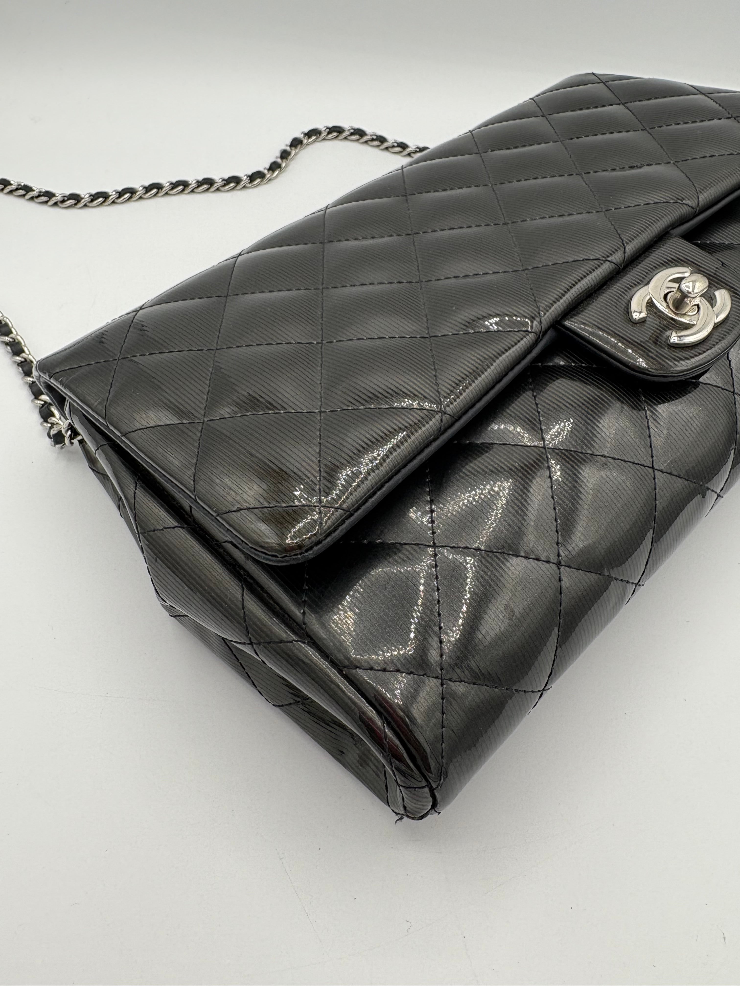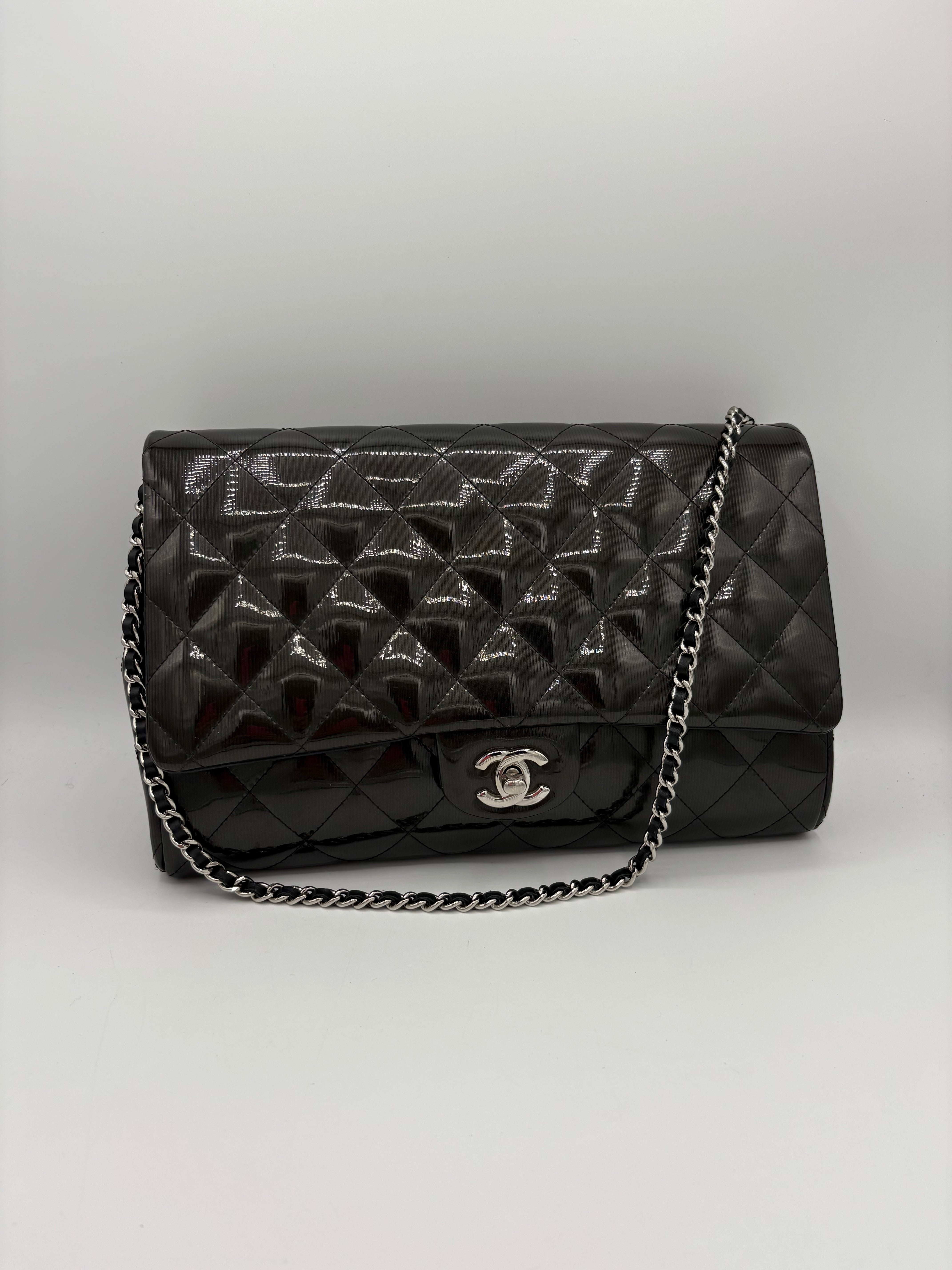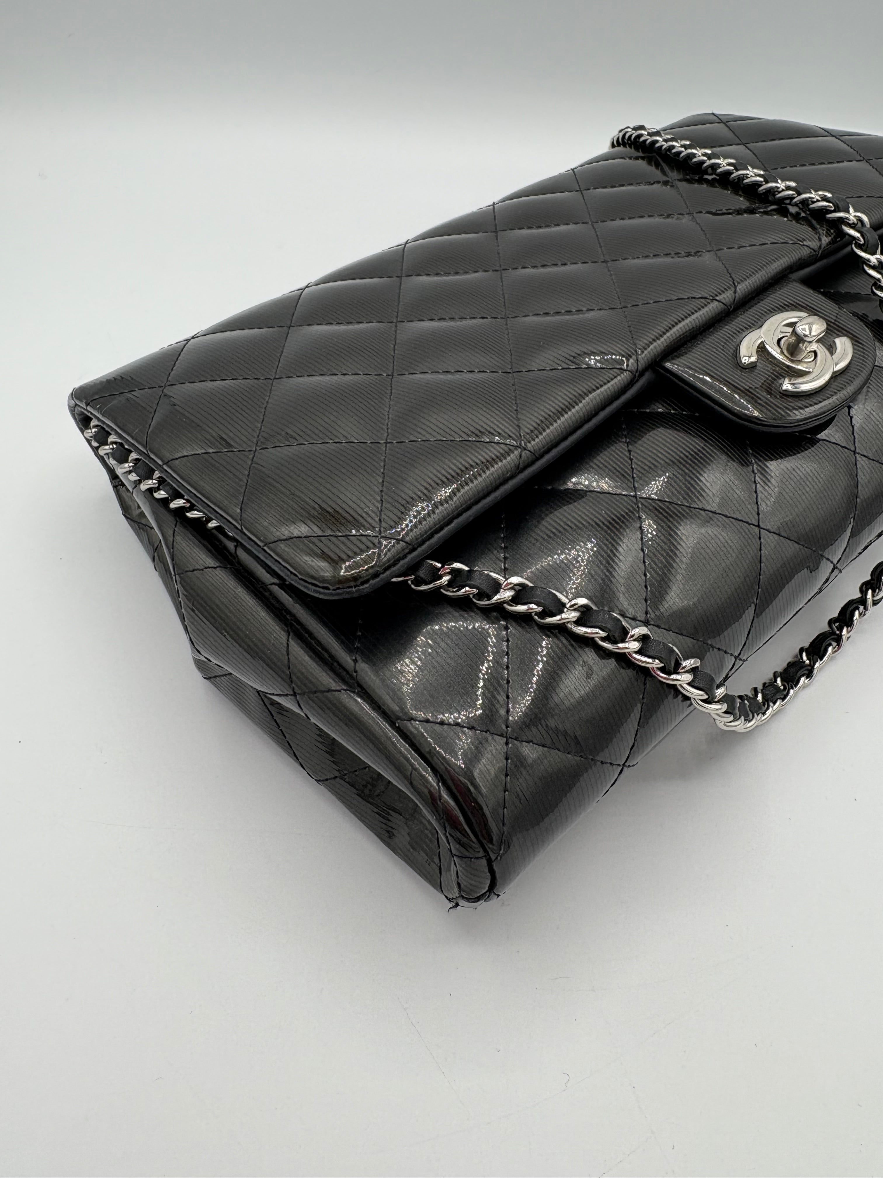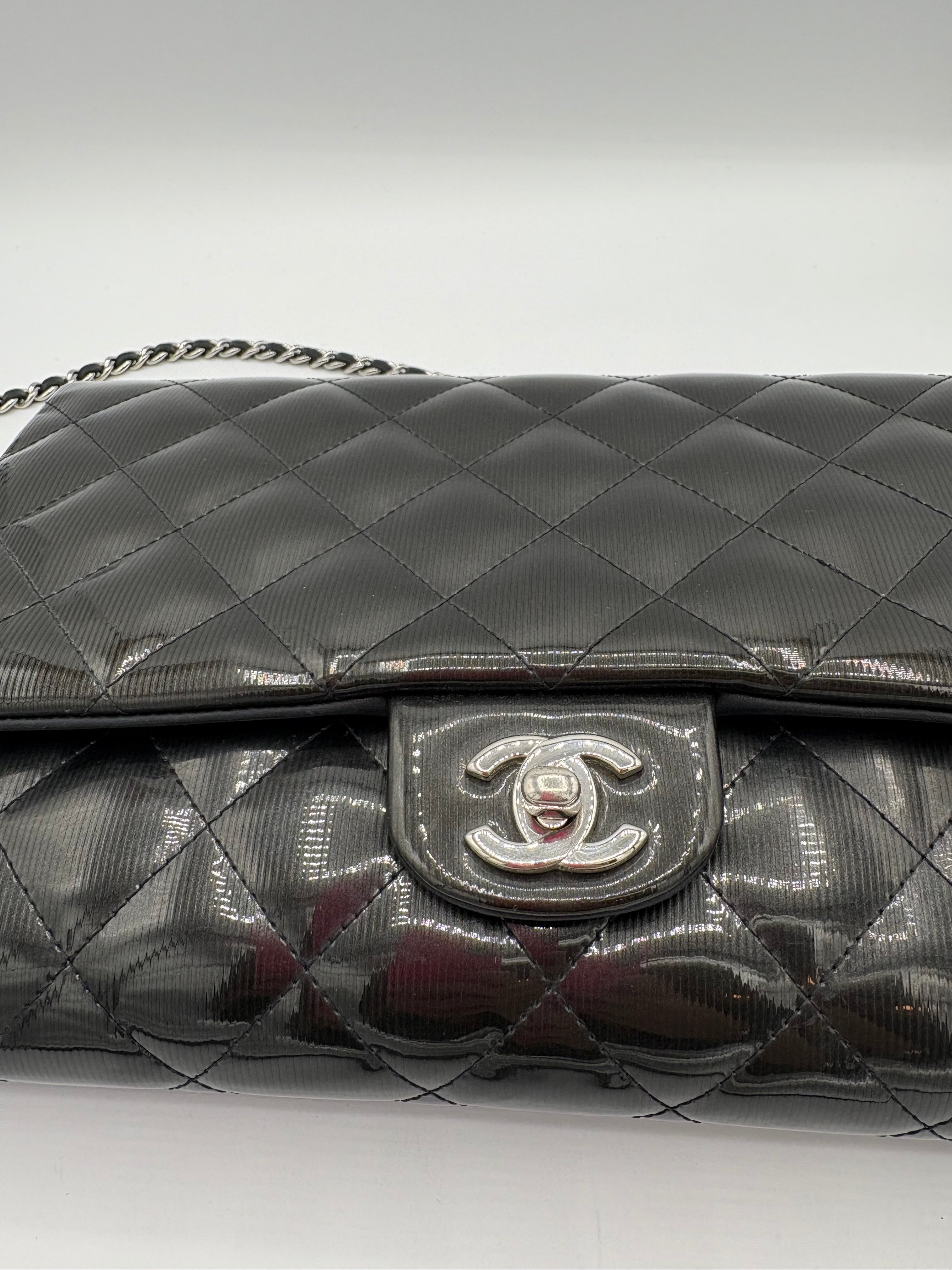 Sac Chanel en cuir vernis coloris gris métallisé en excellent état.