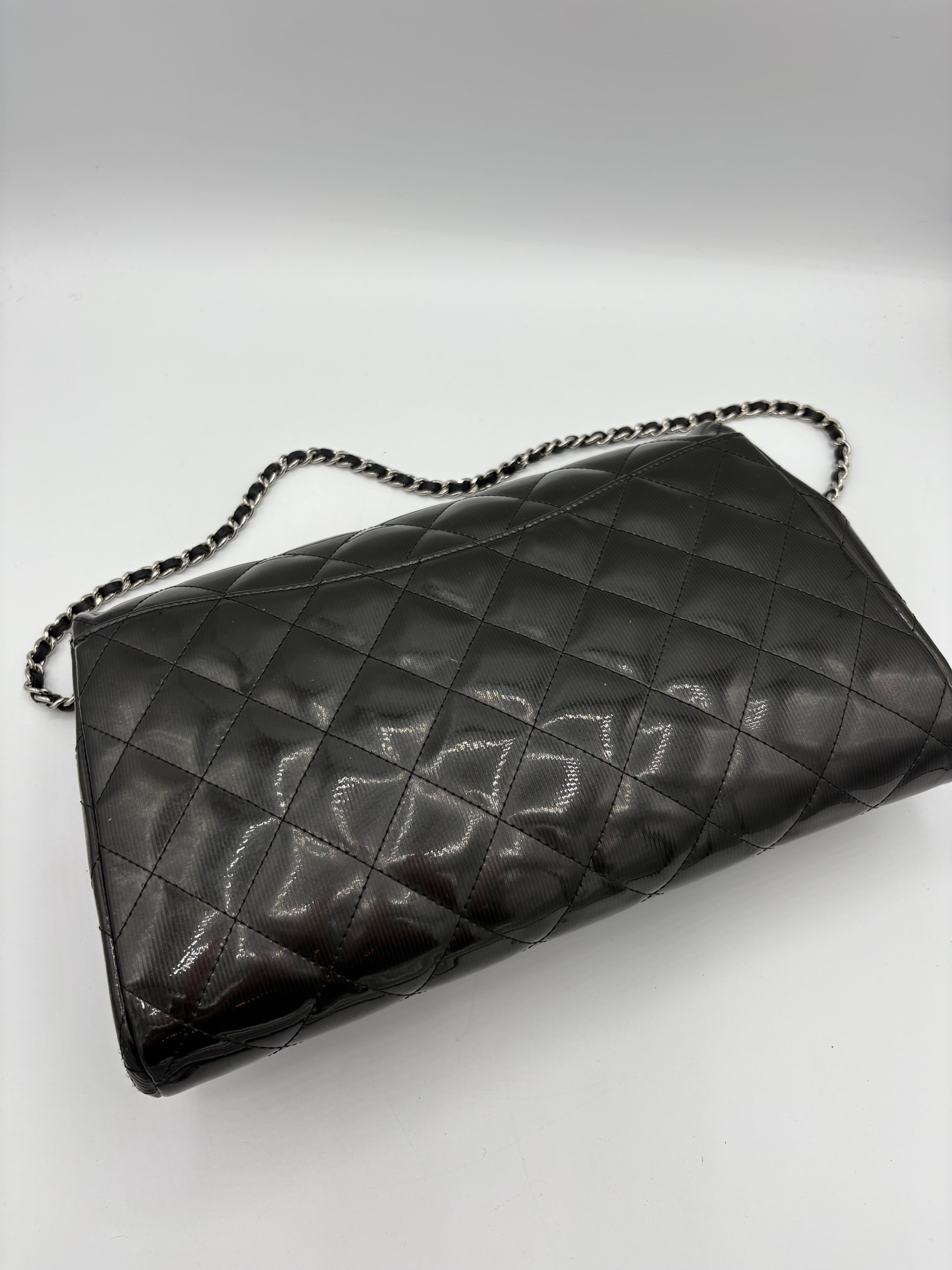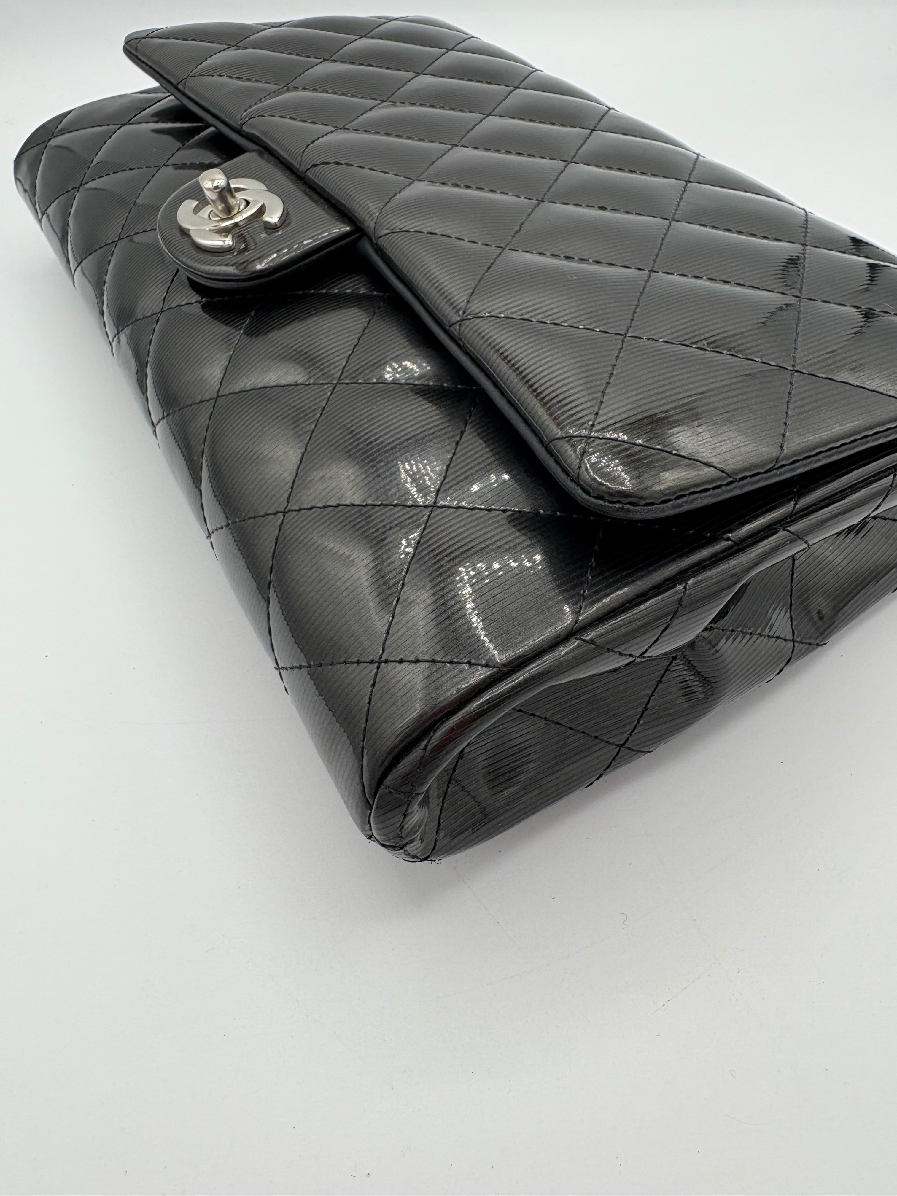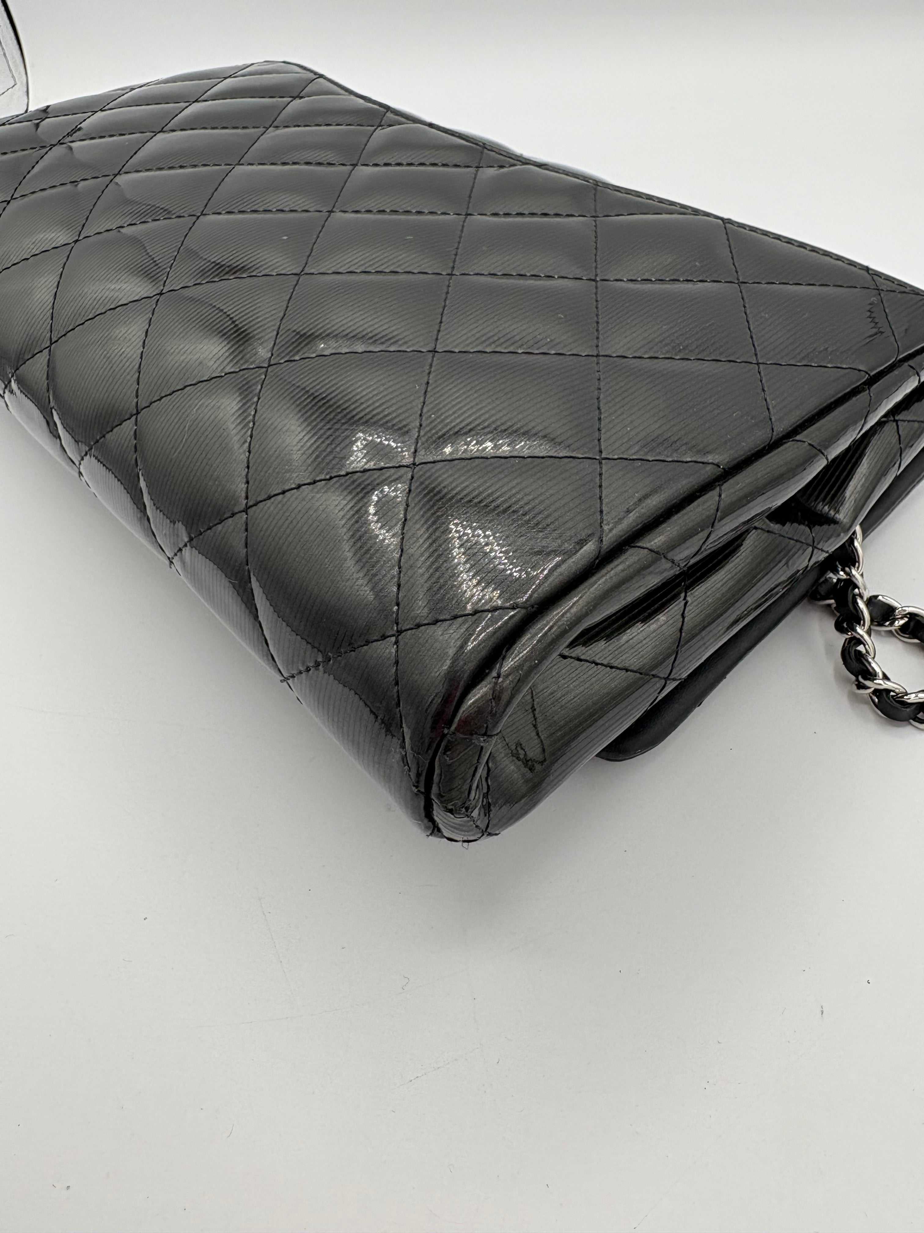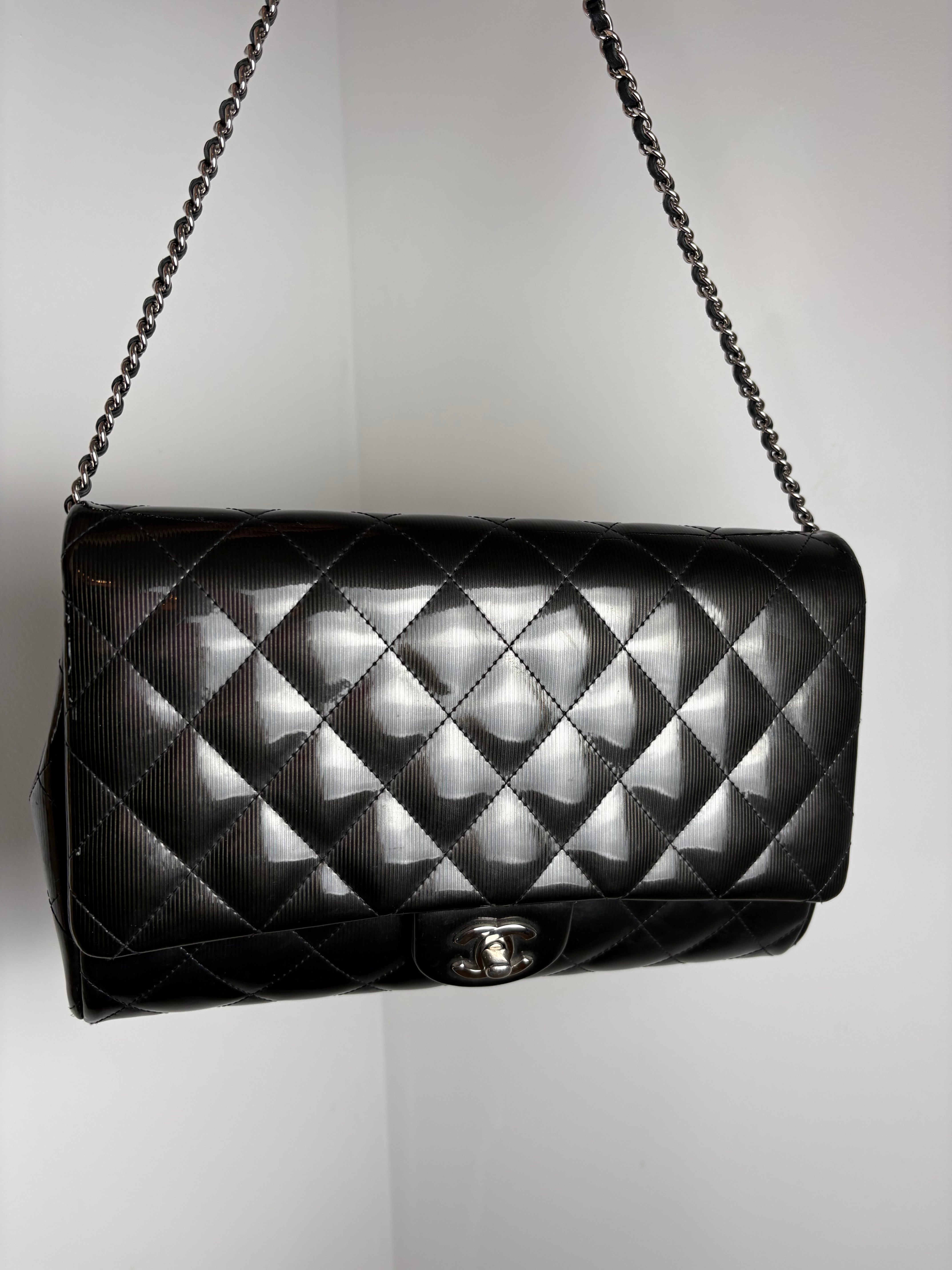 Sac Chanel en cuir vernis coloris gris métallisé en excellent état.