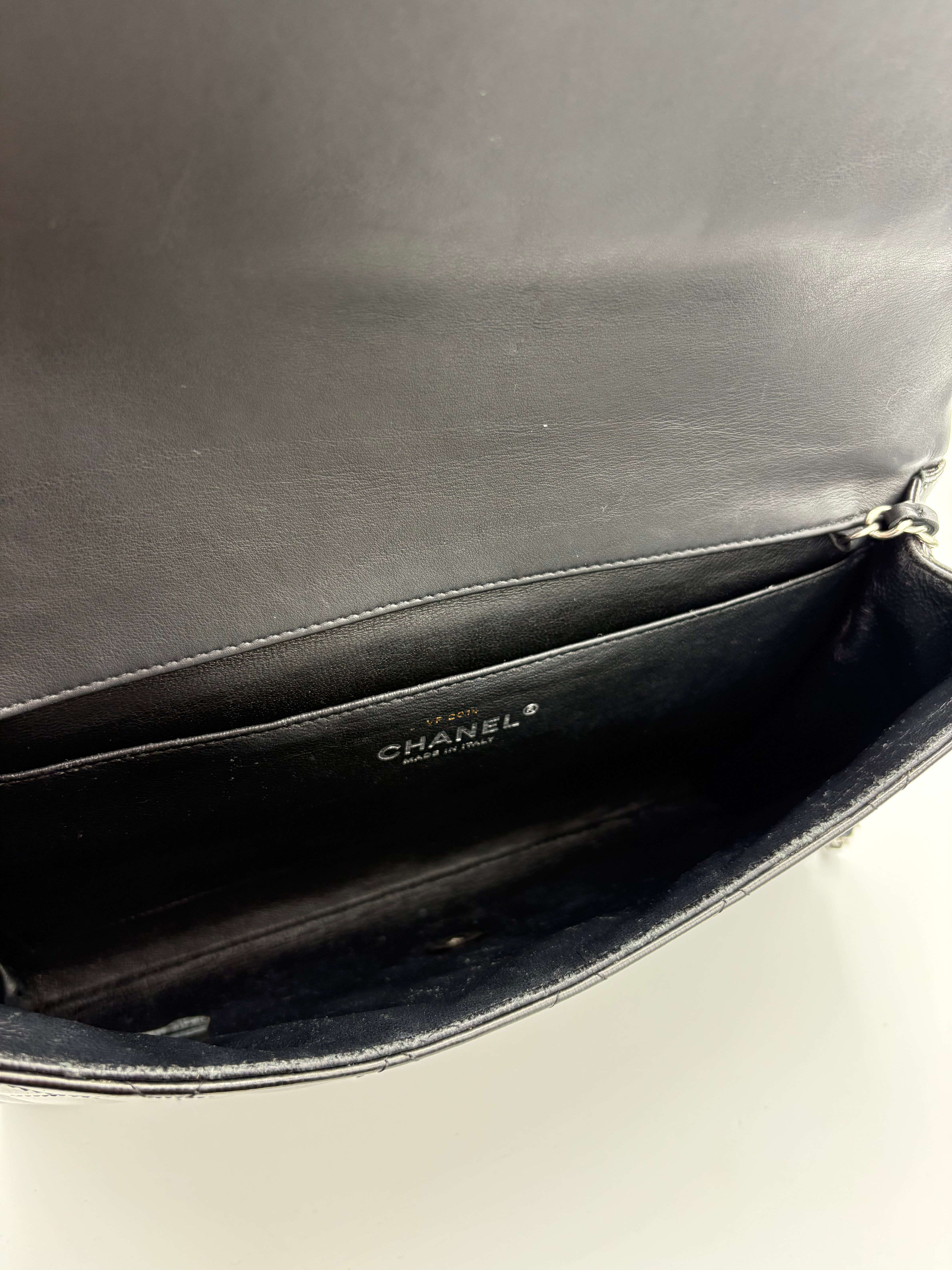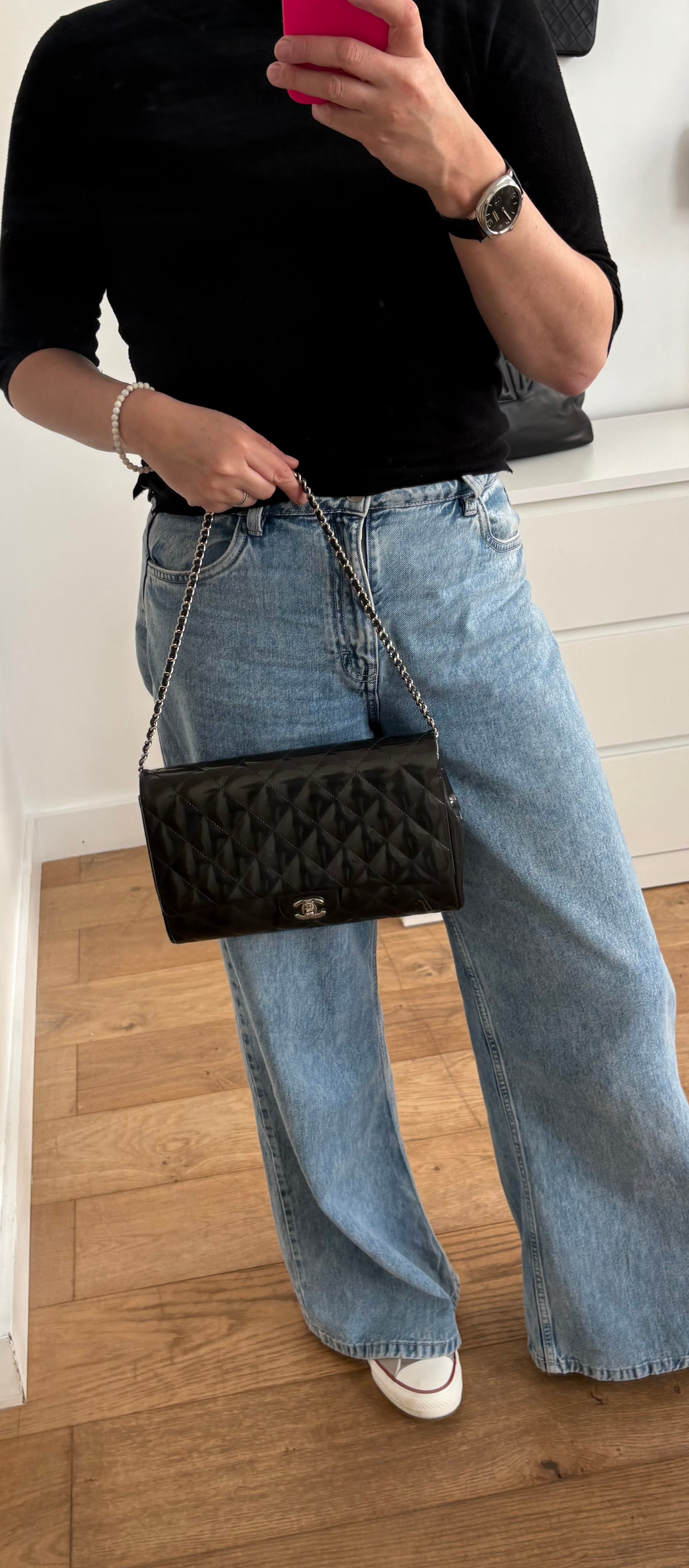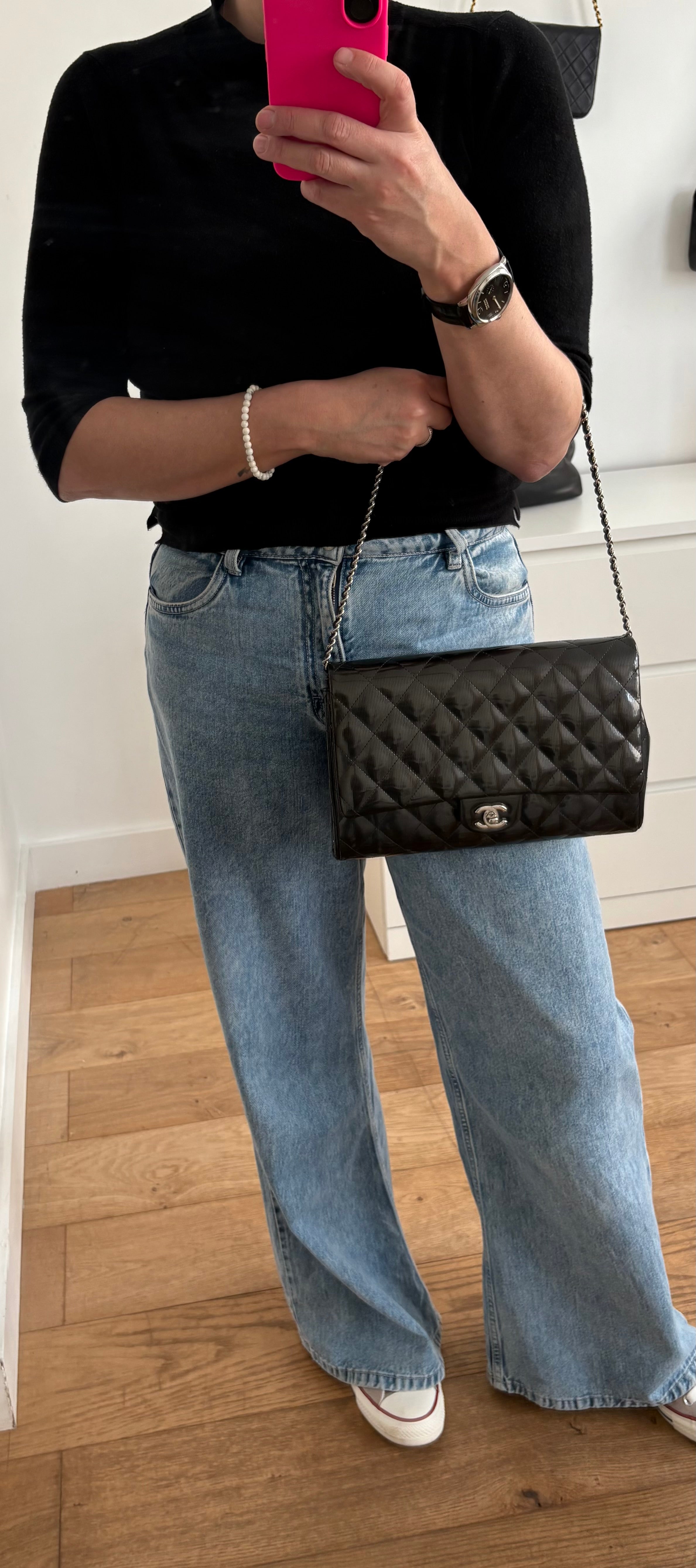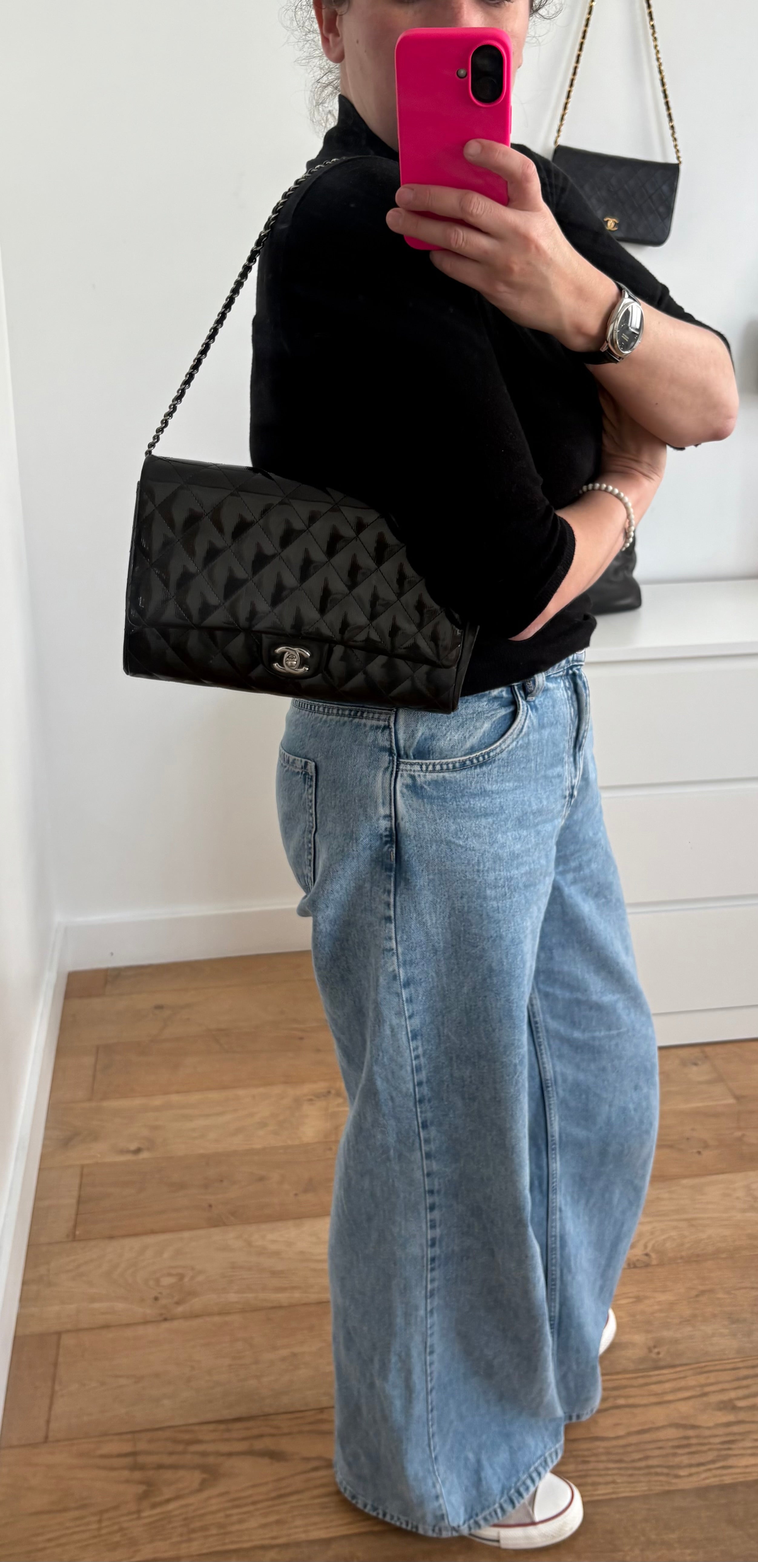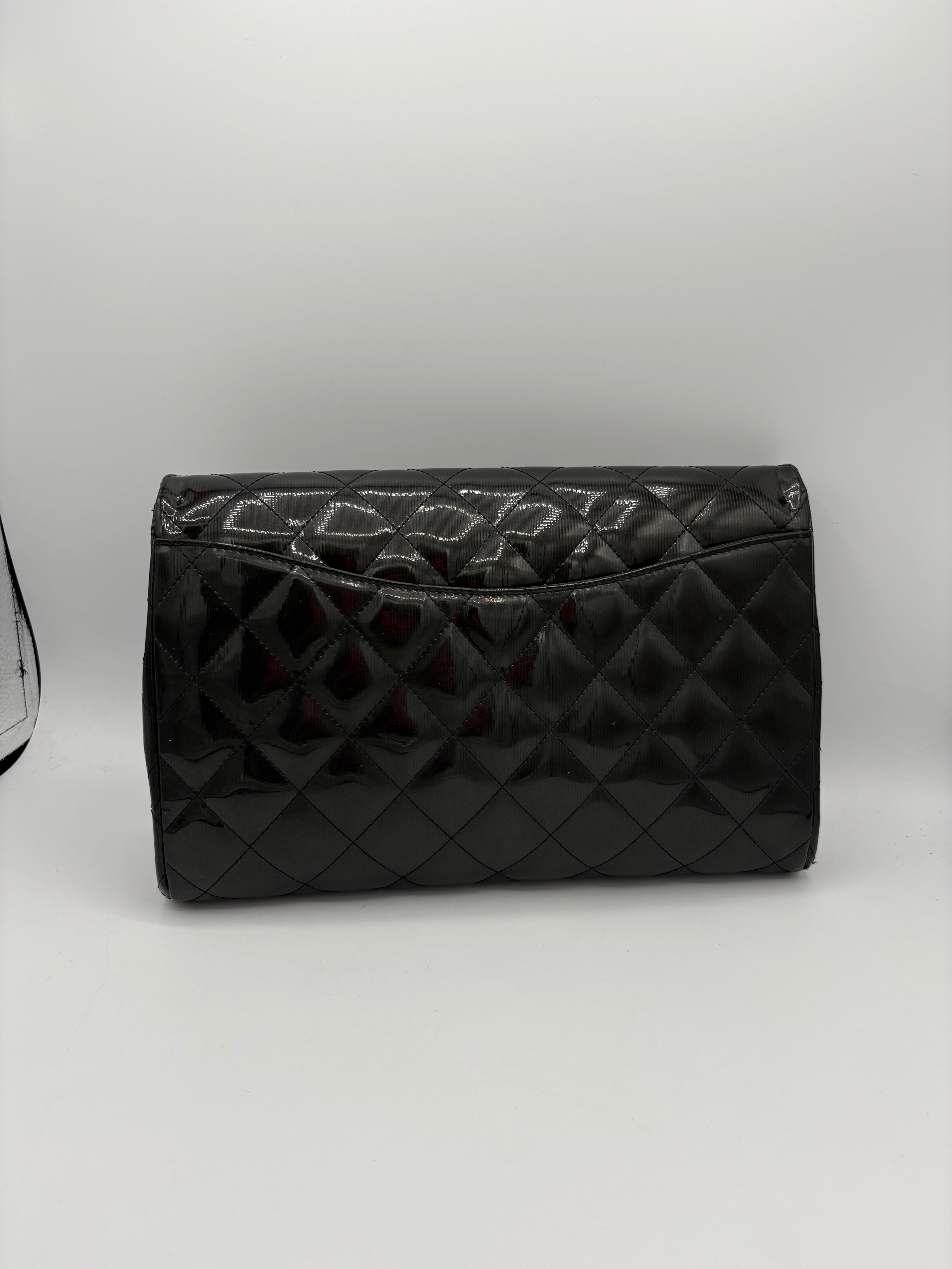 Sac Chanel en cuir vernis coloris gris métallisé en excellent état.