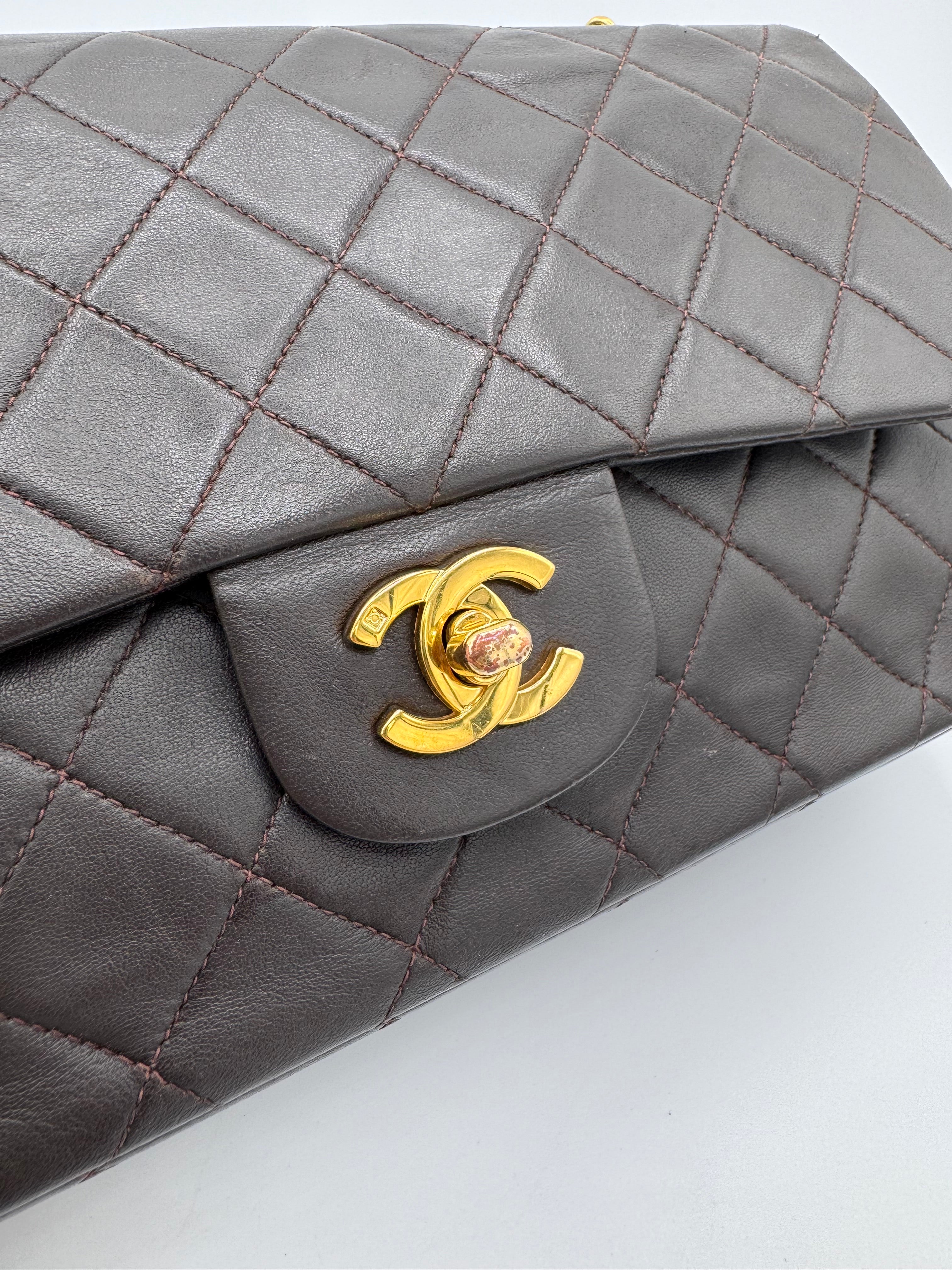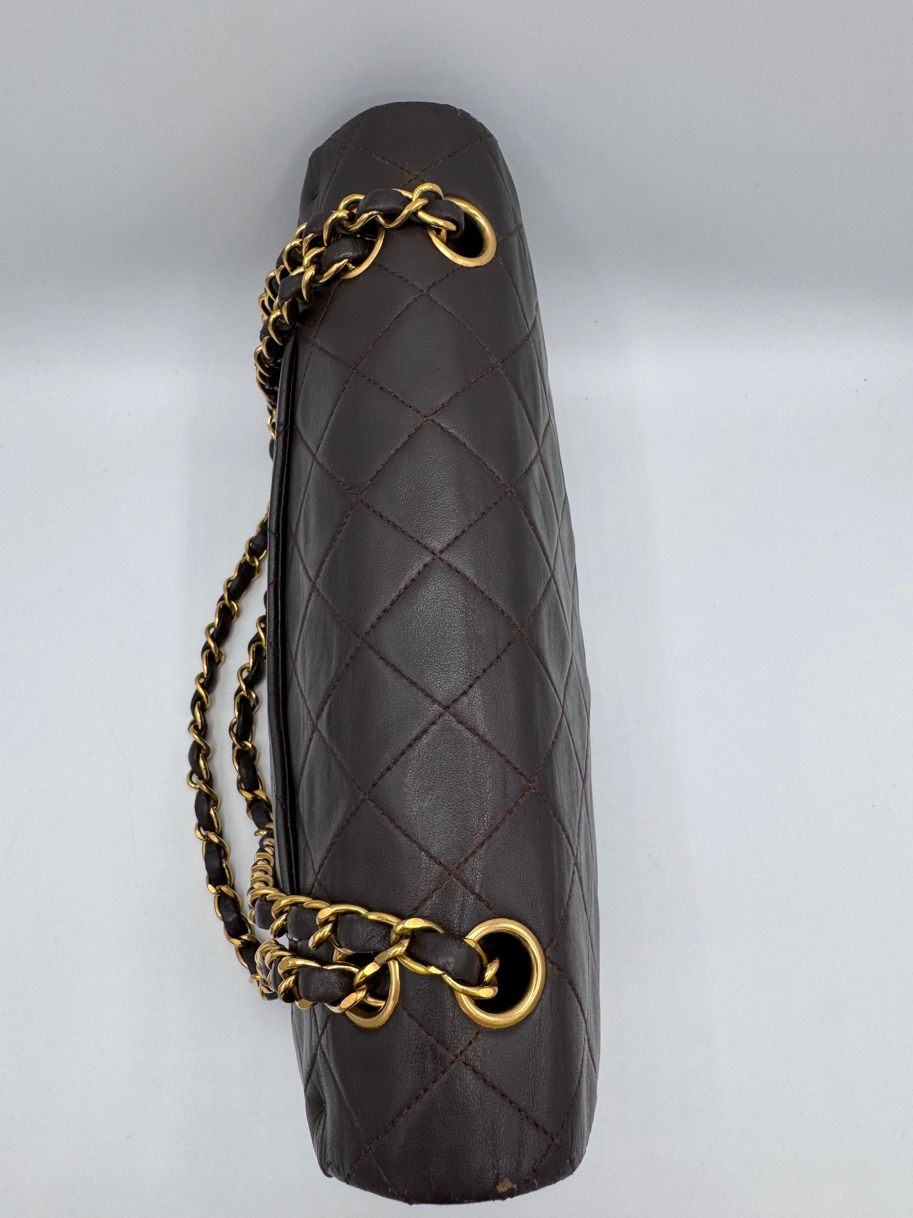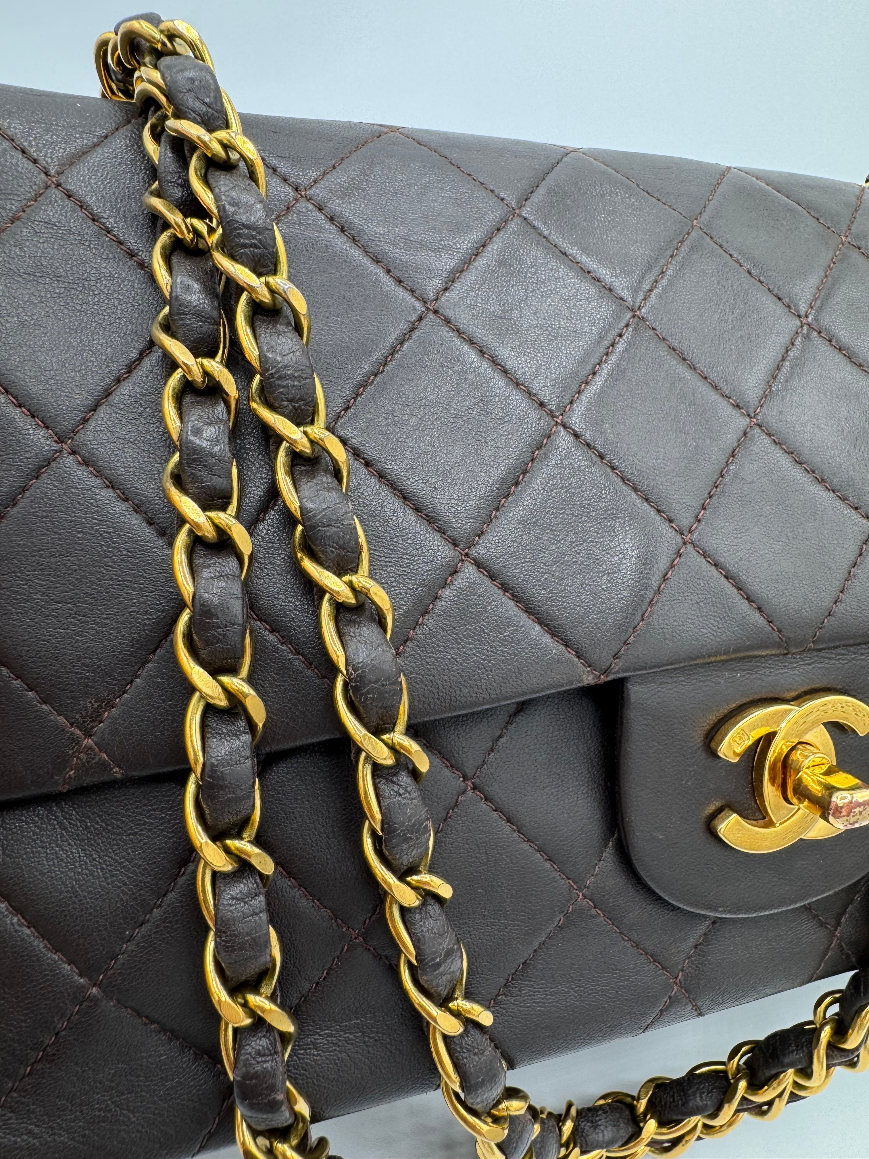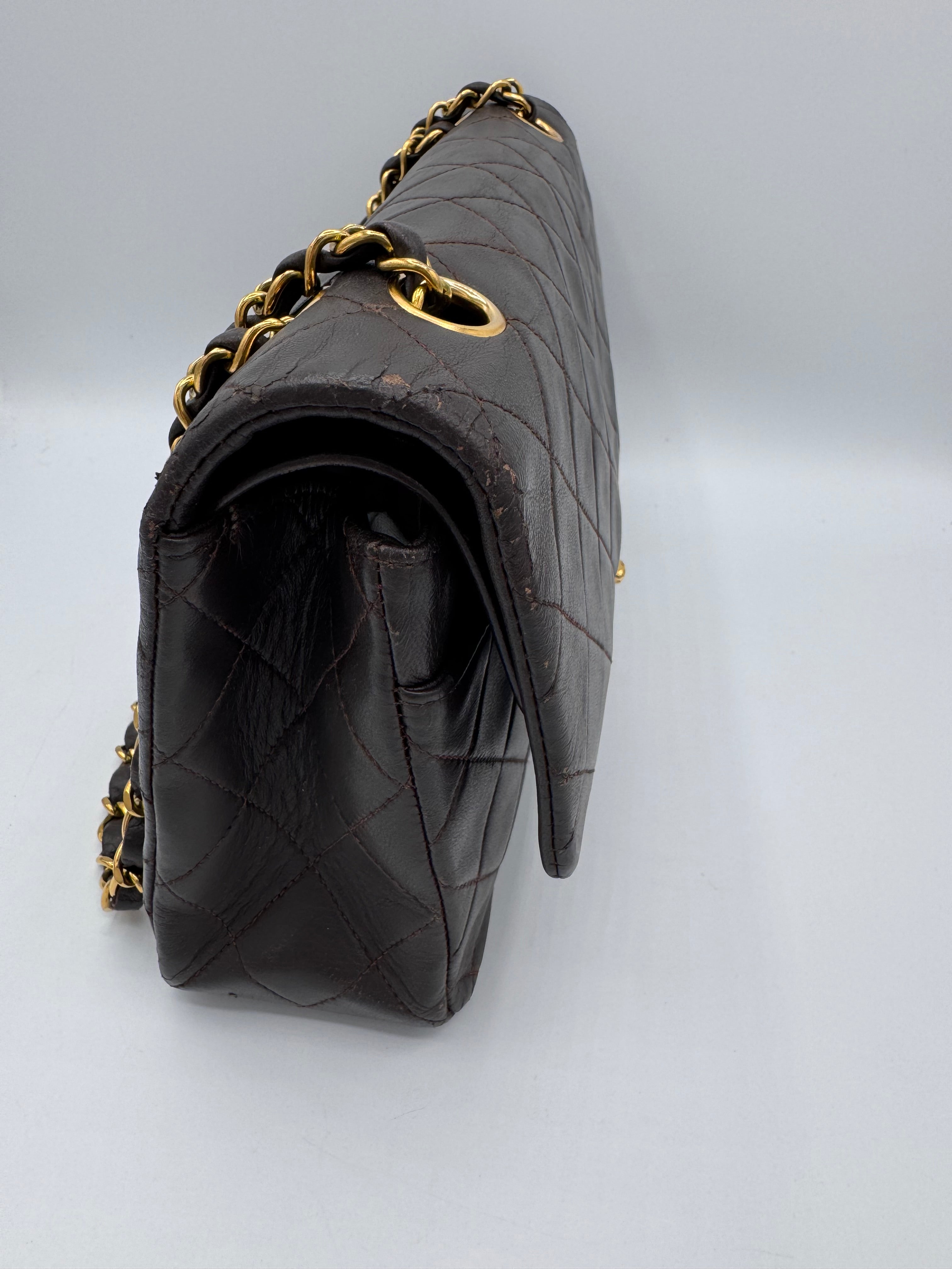 Sac Chanel Timeless vintage double rabat coloris chocolat, en très bon état.