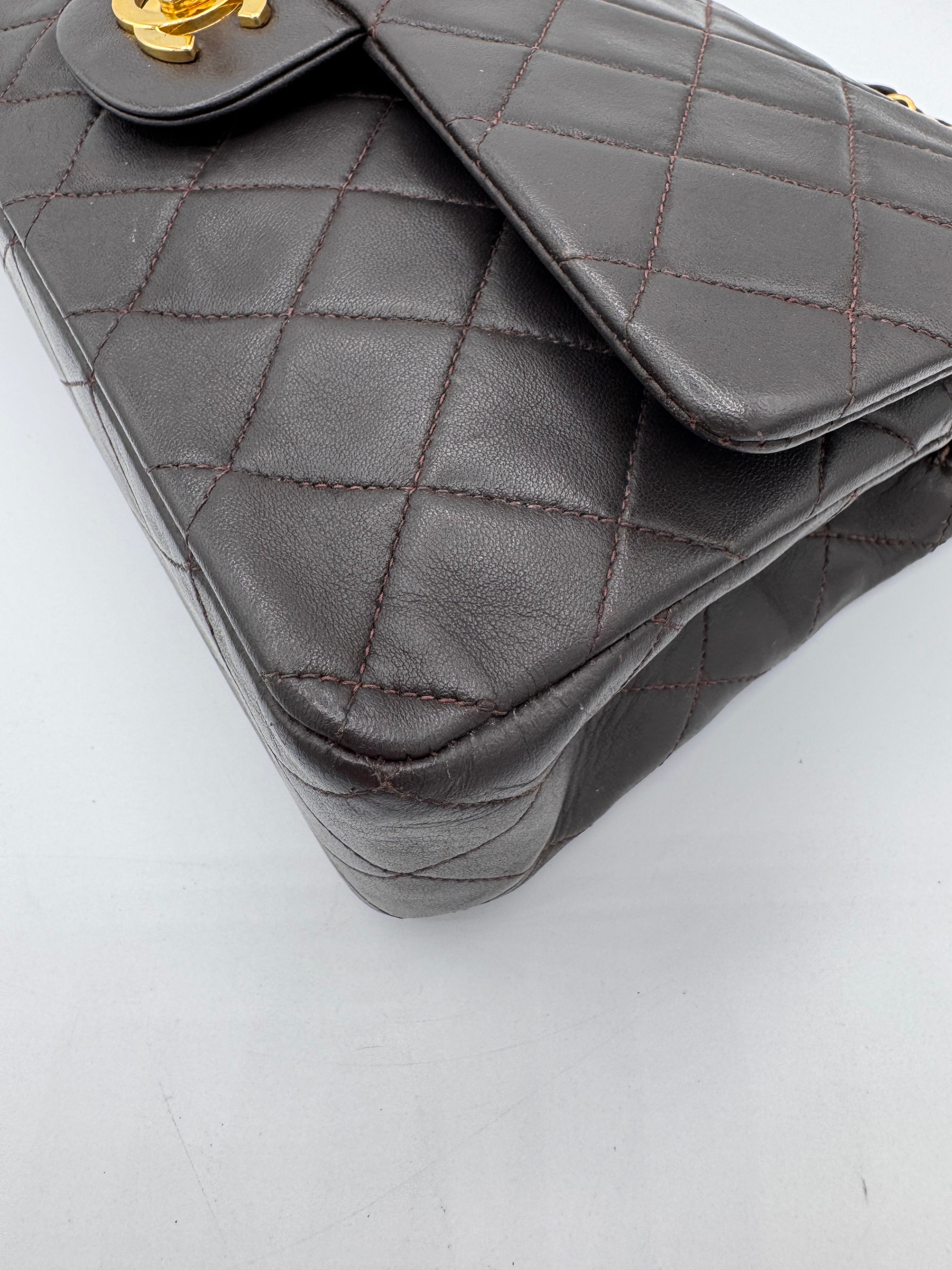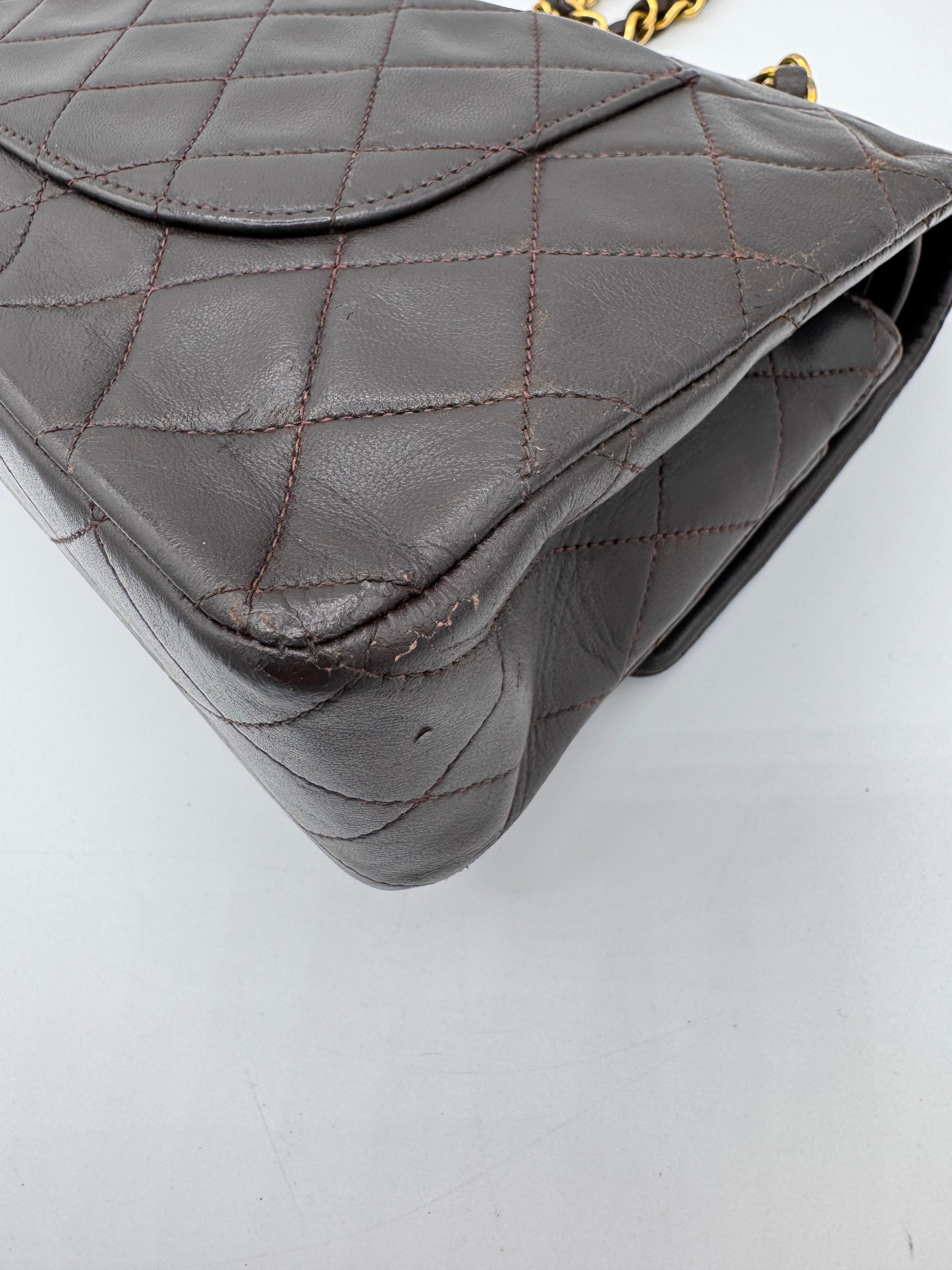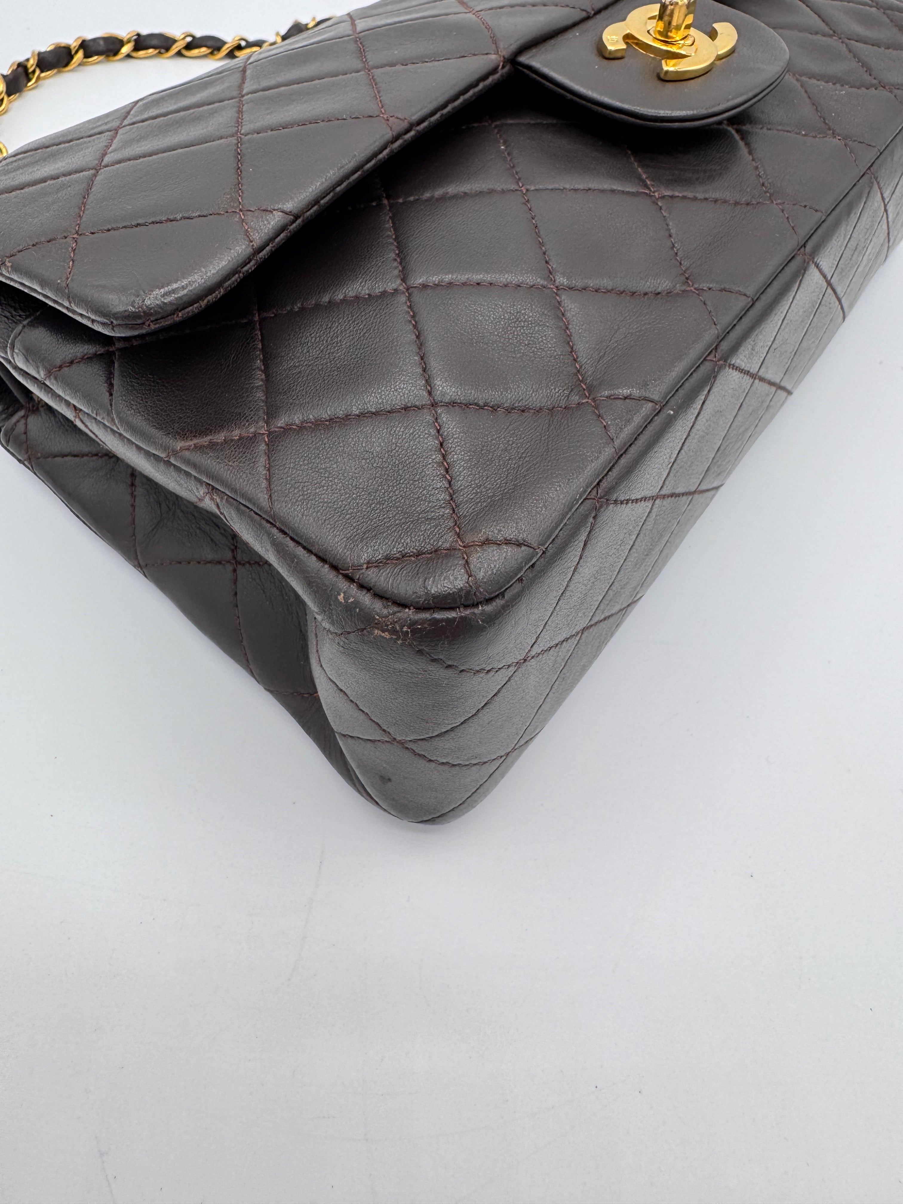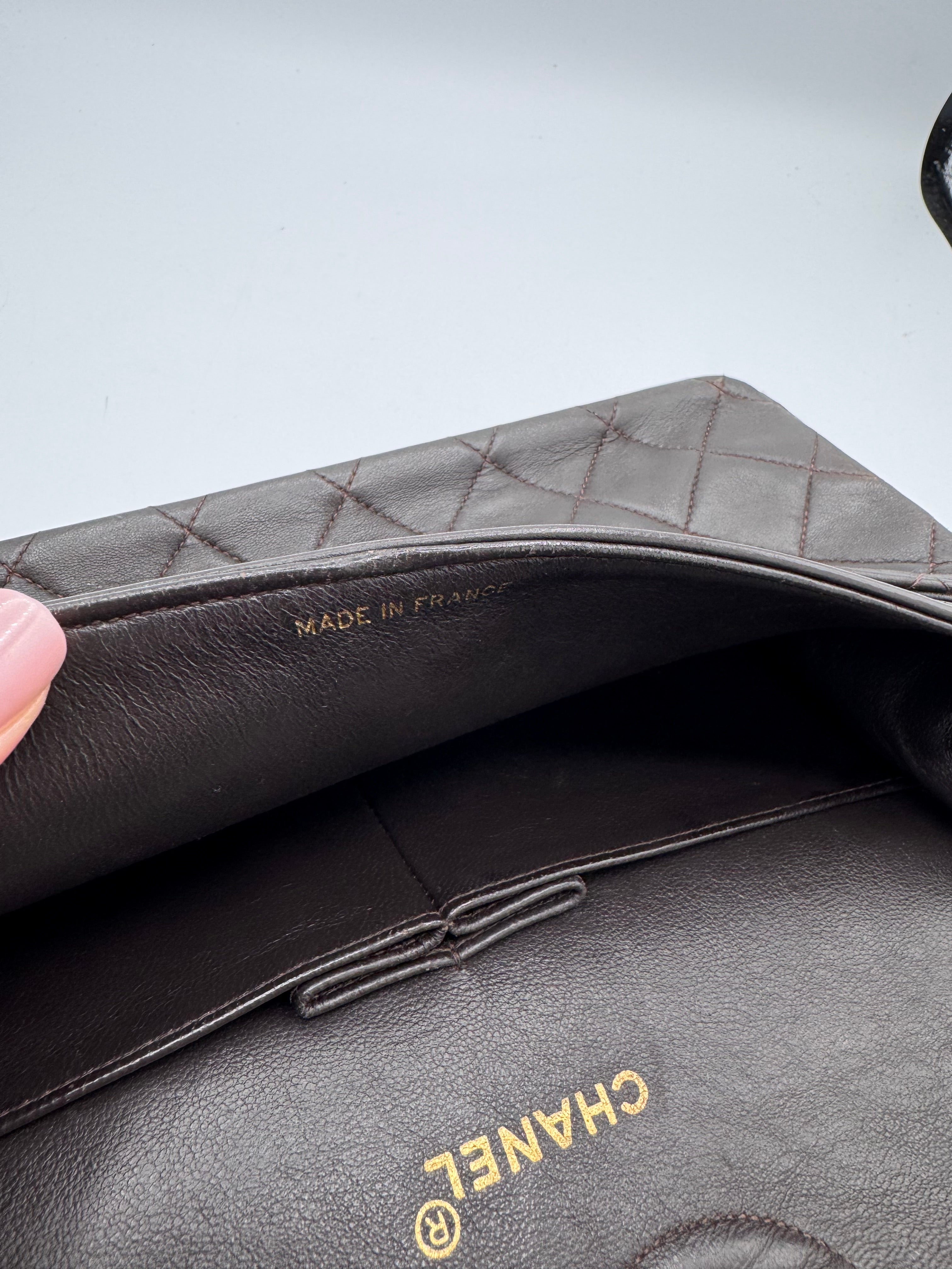 Sac Chanel Timeless vintage double rabat coloris chocolat, en très bon état.