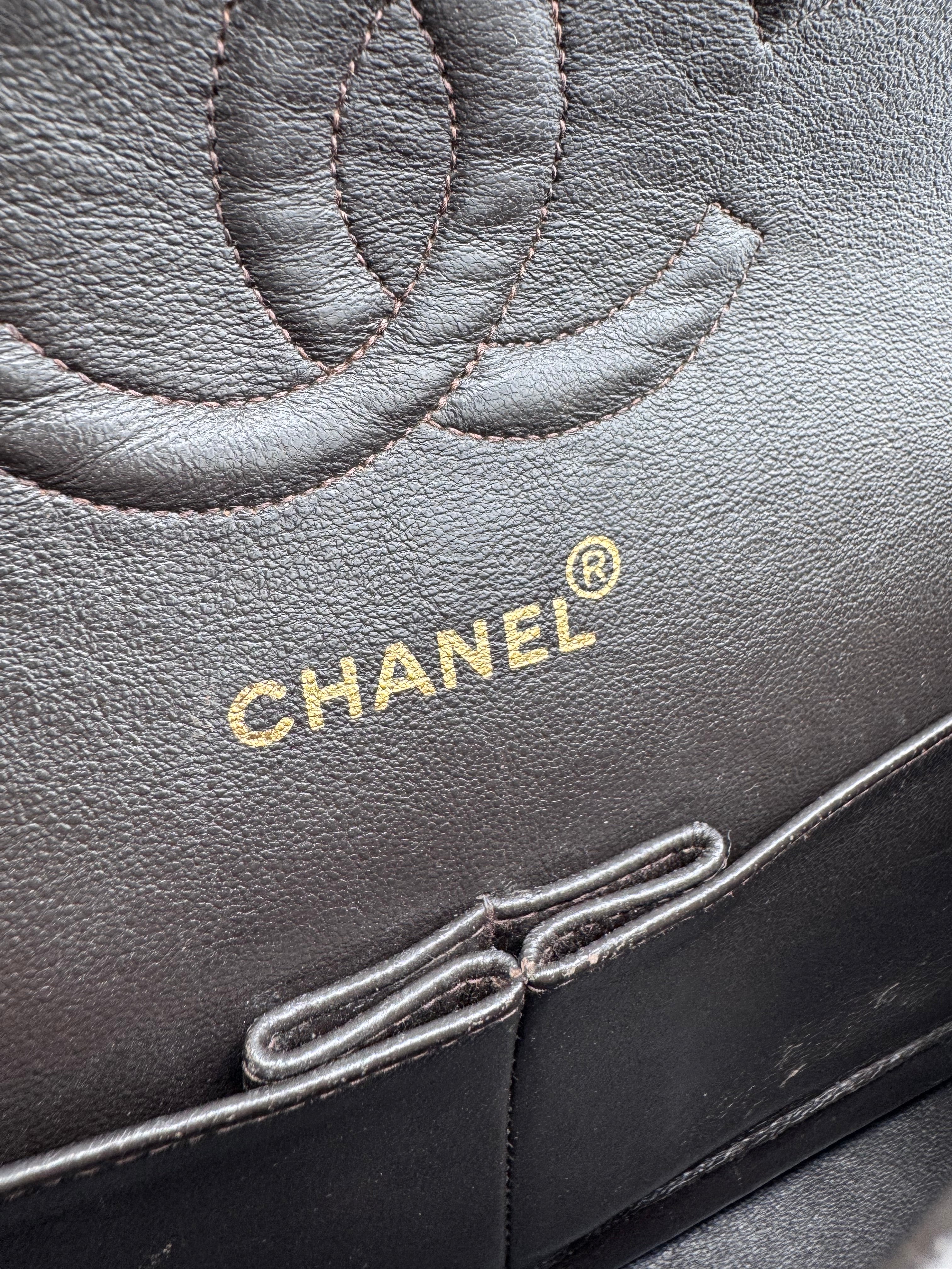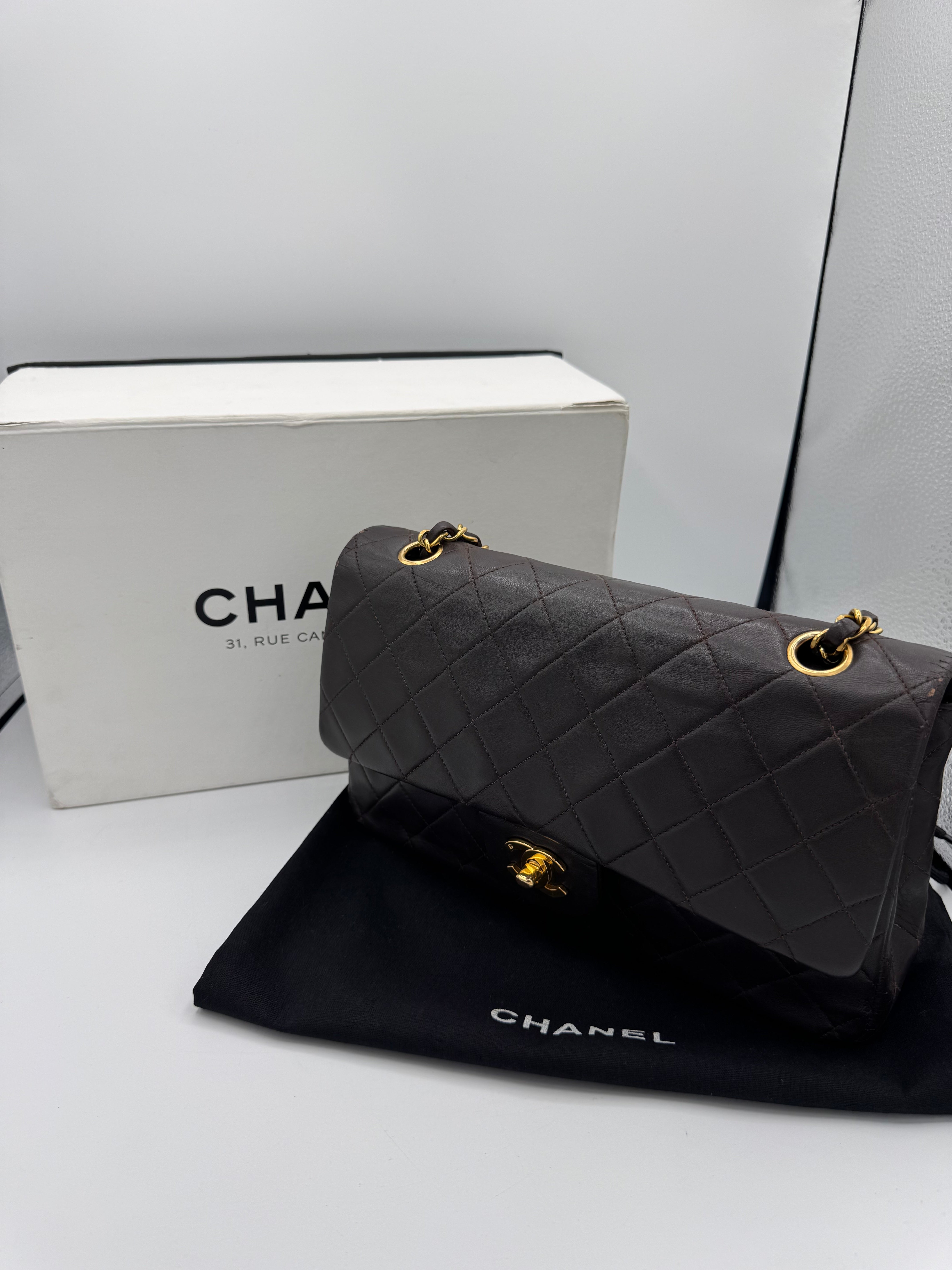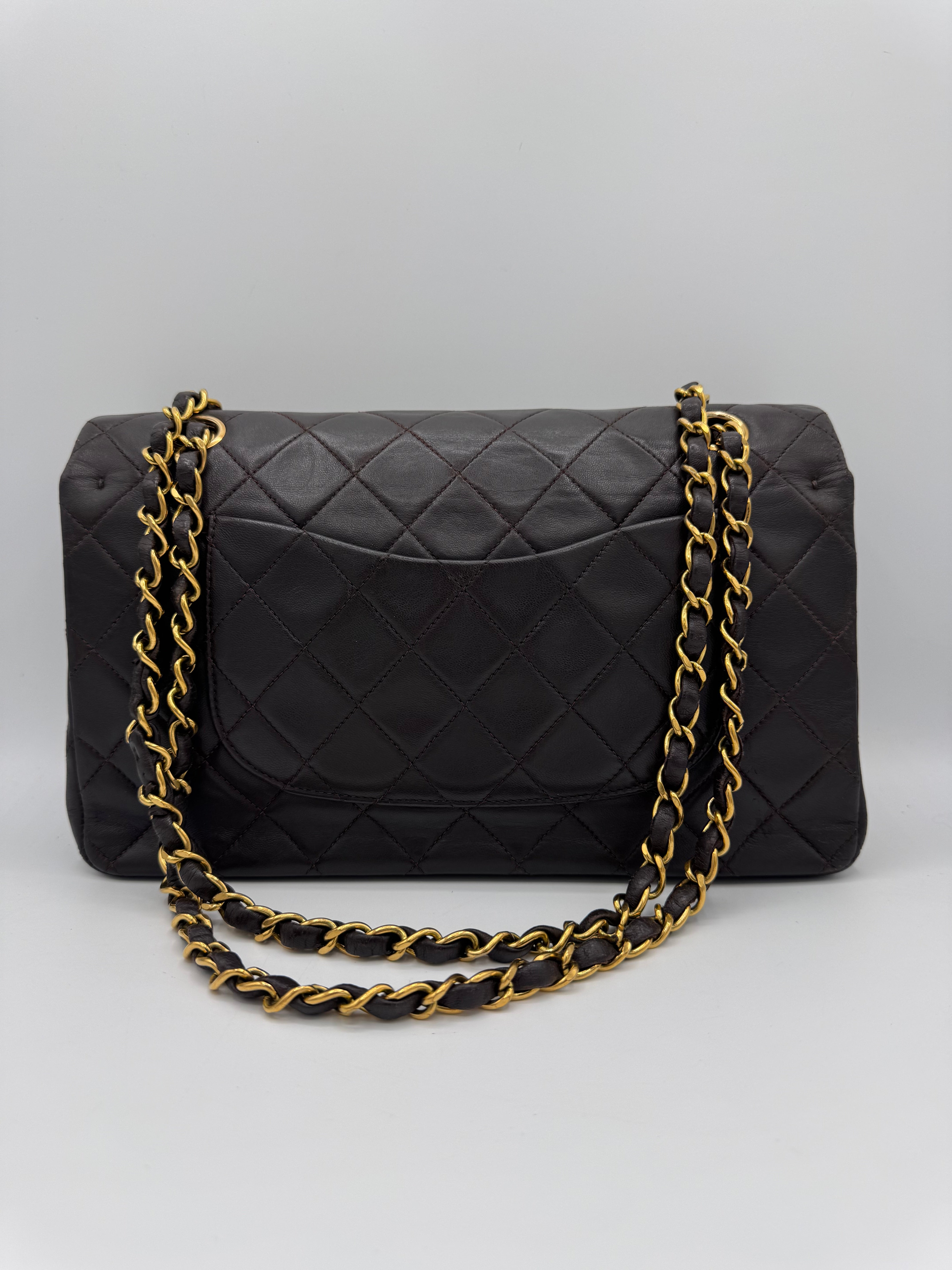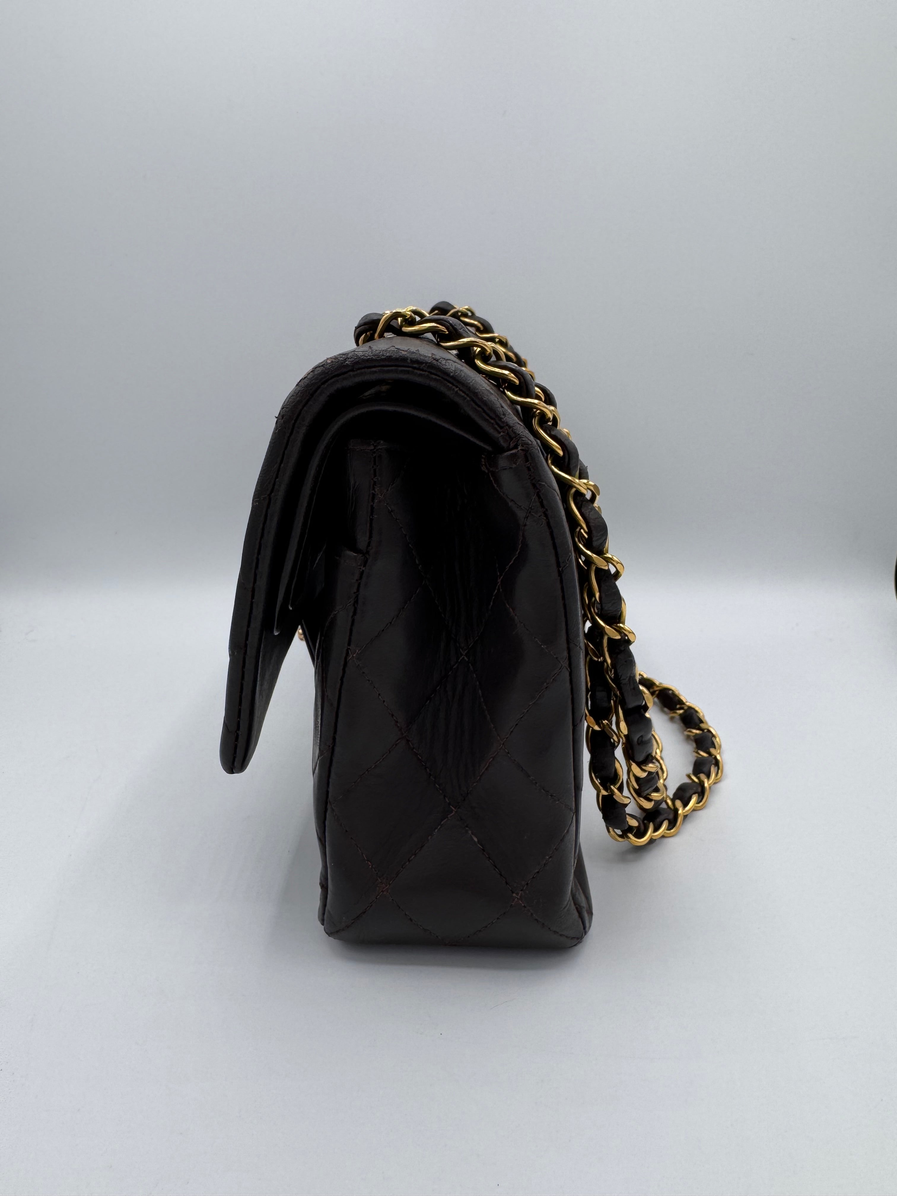 Sac Chanel Timeless vintage double rabat coloris chocolat, en très bon état.